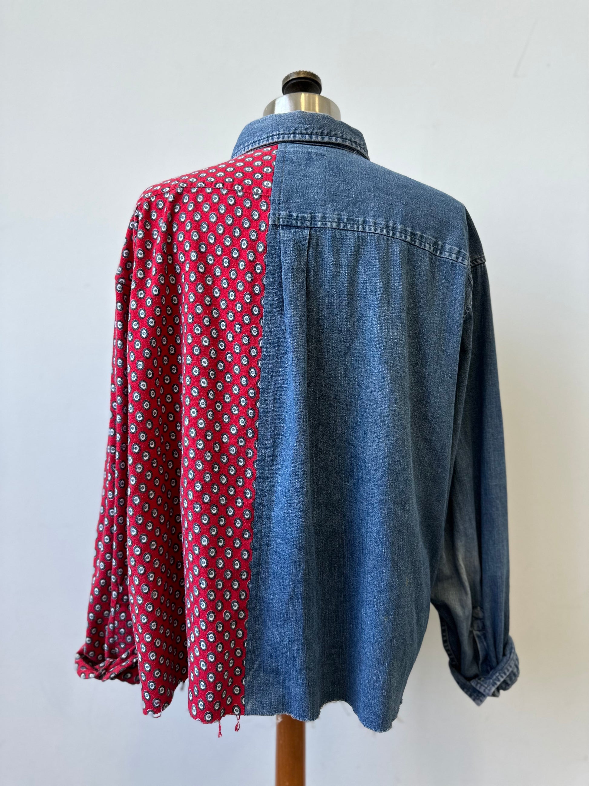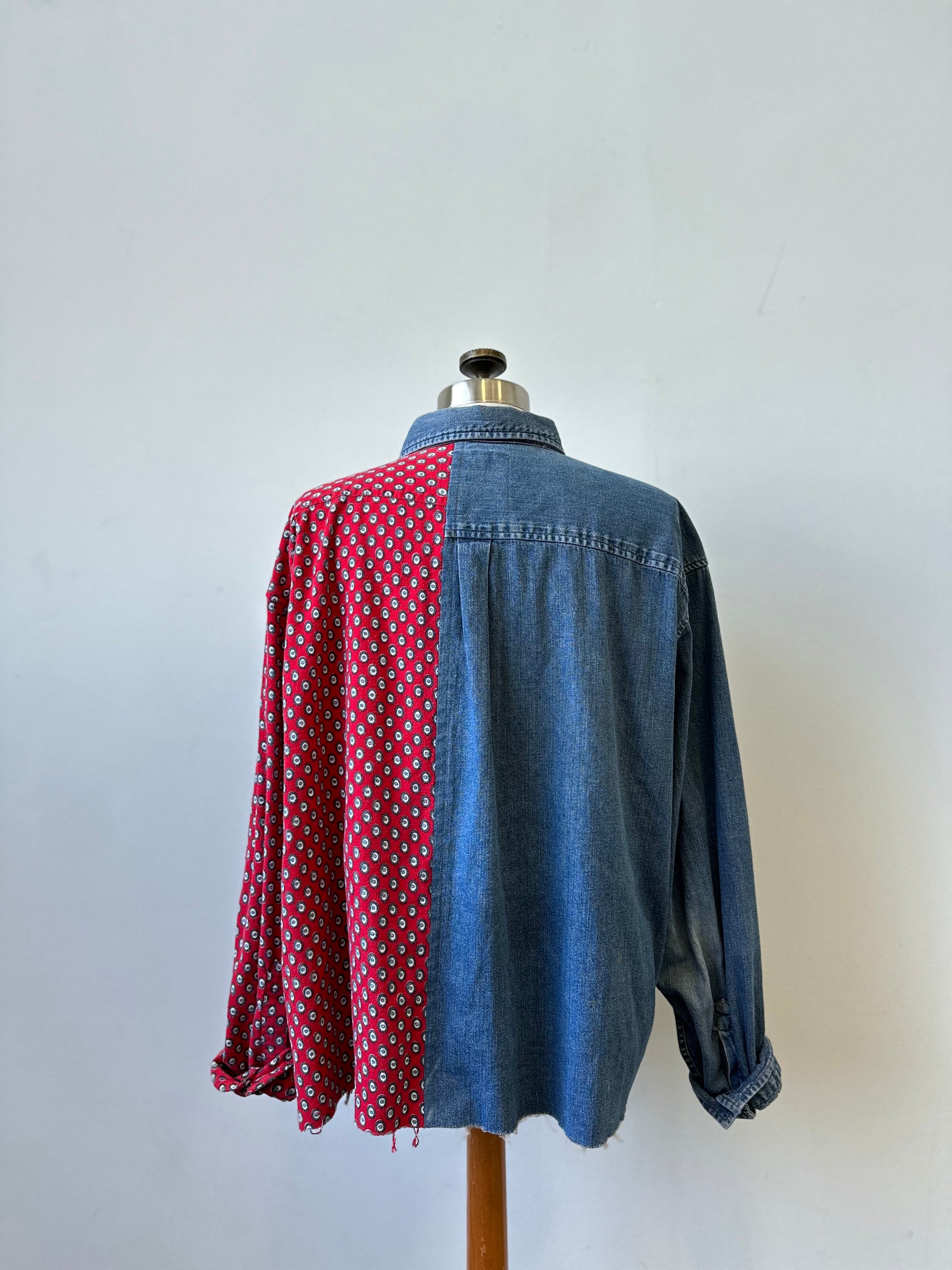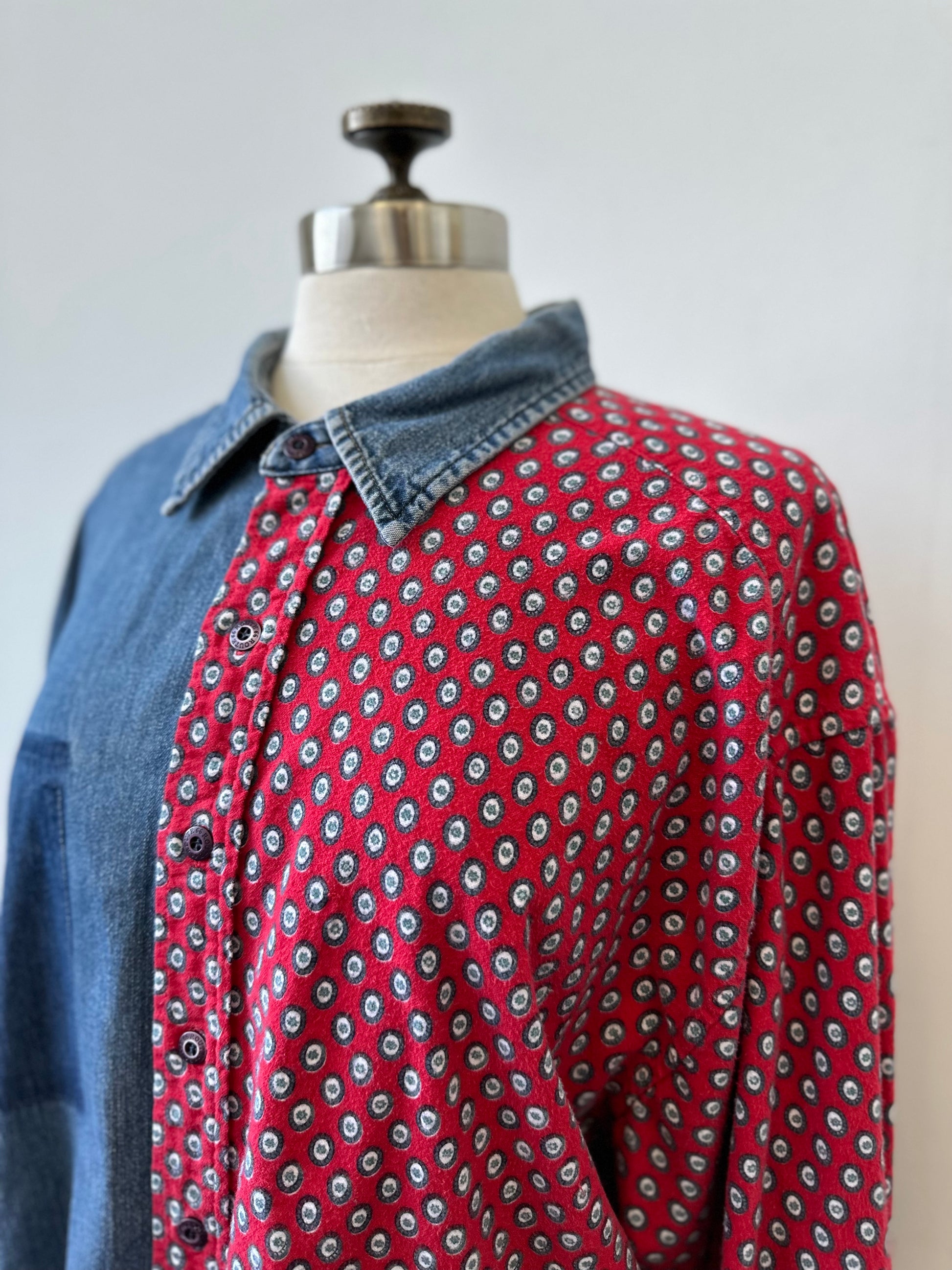 Stay looking sharp with this one-of-a-kind upcycled shirt! Combining two classic fabrics, denim and flannel, this 1/2 + 1/2 shirt will make you stand out with its denim and red pattern. Super soft and oversized, this will be your Saturday go to!