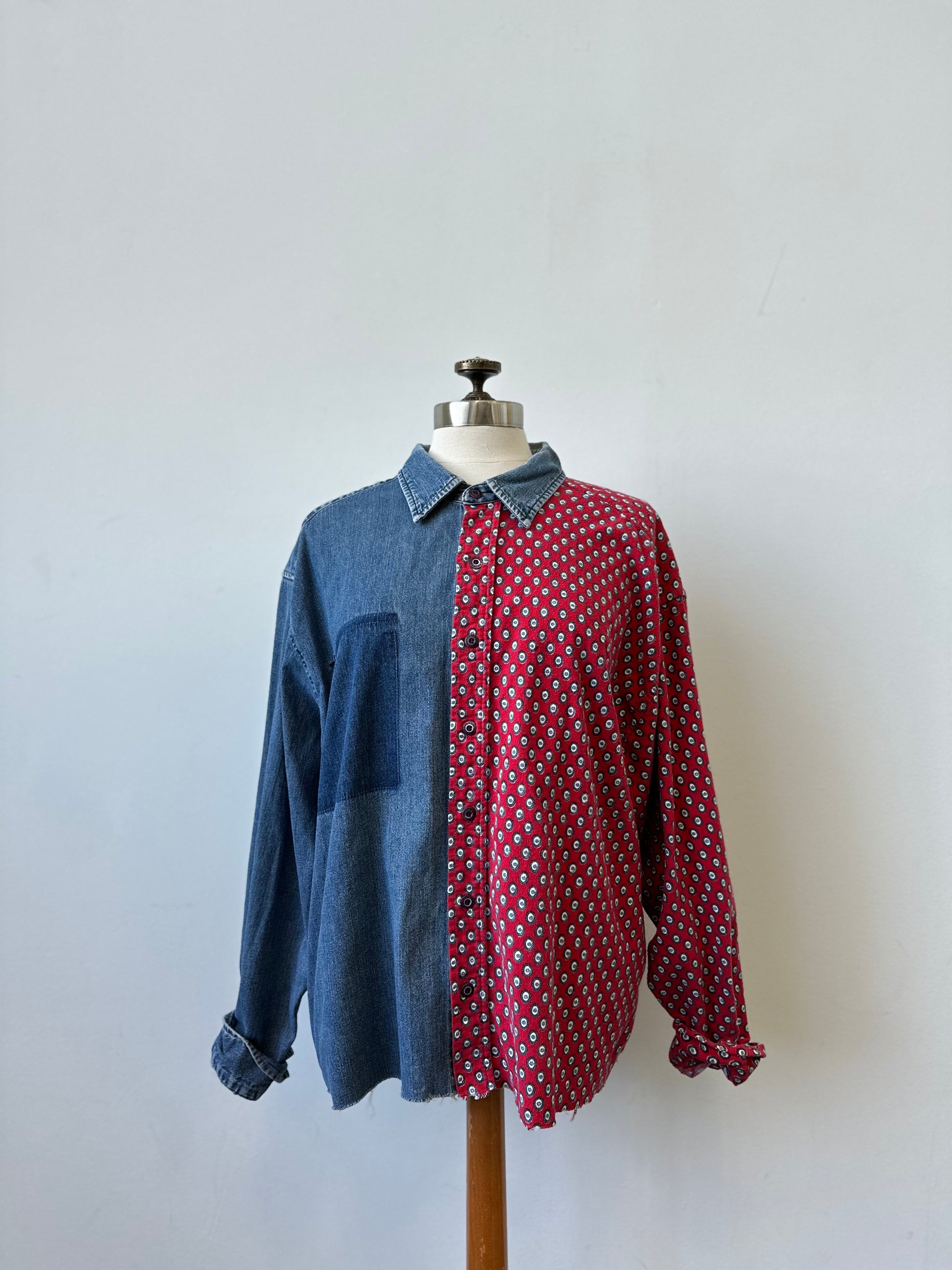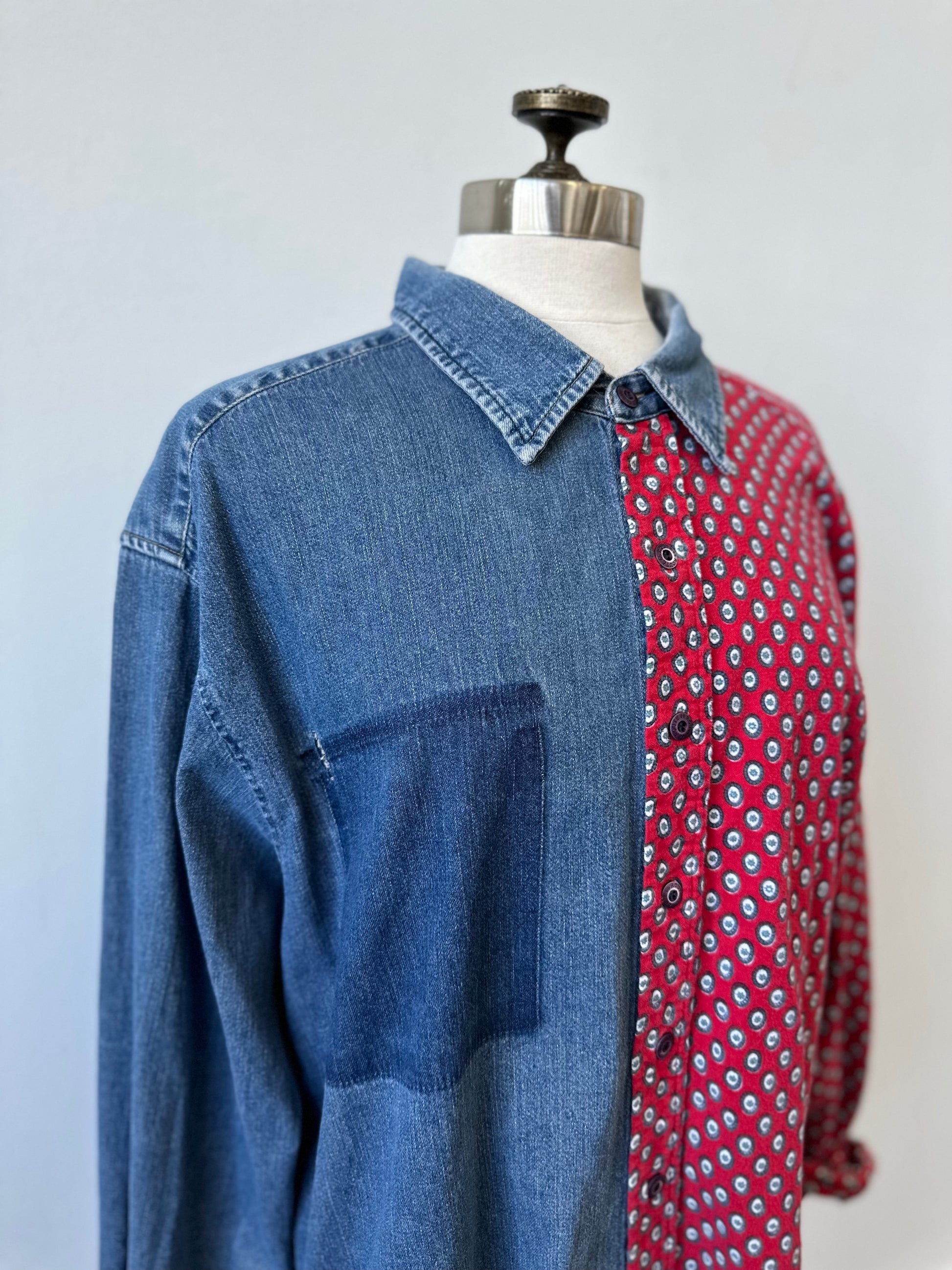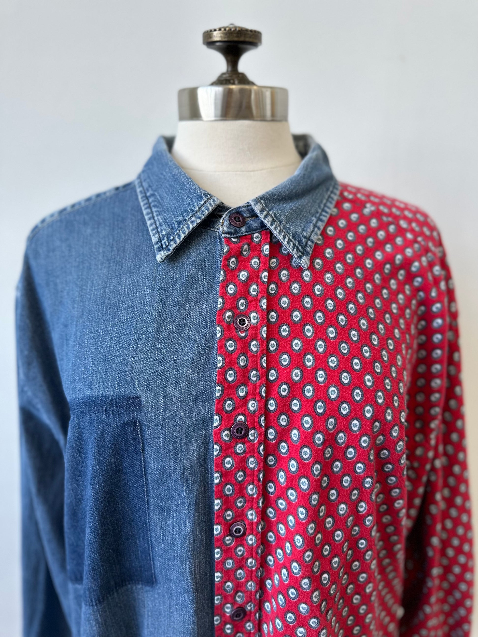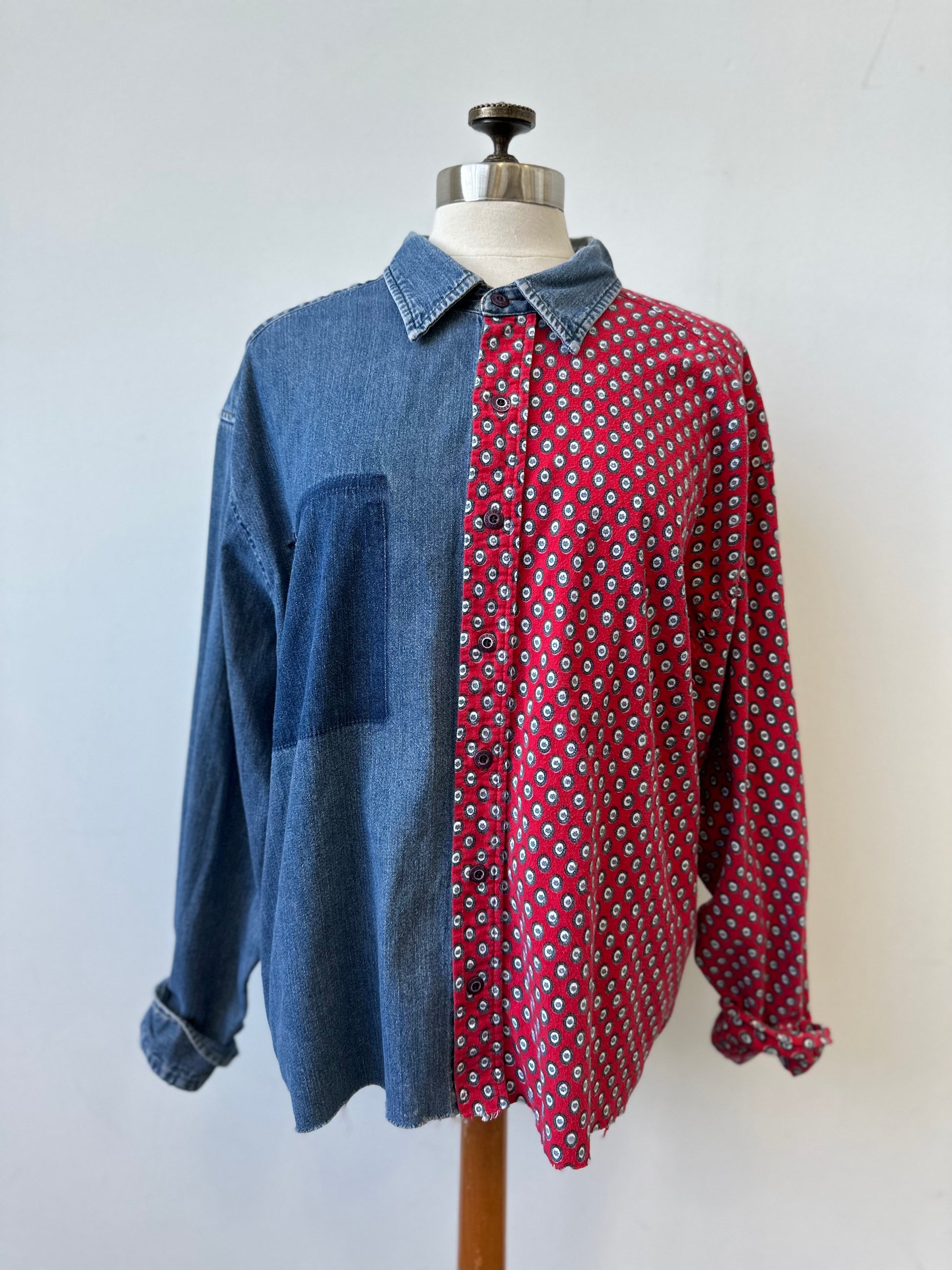 Stay looking sharp with this one-of-a-kind upcycled shirt! Combining two classic fabrics, denim and flannel, this 1/2 + 1/2 shirt will make you stand out with its denim and red pattern. Super soft and oversized, this will be your Saturday go to!