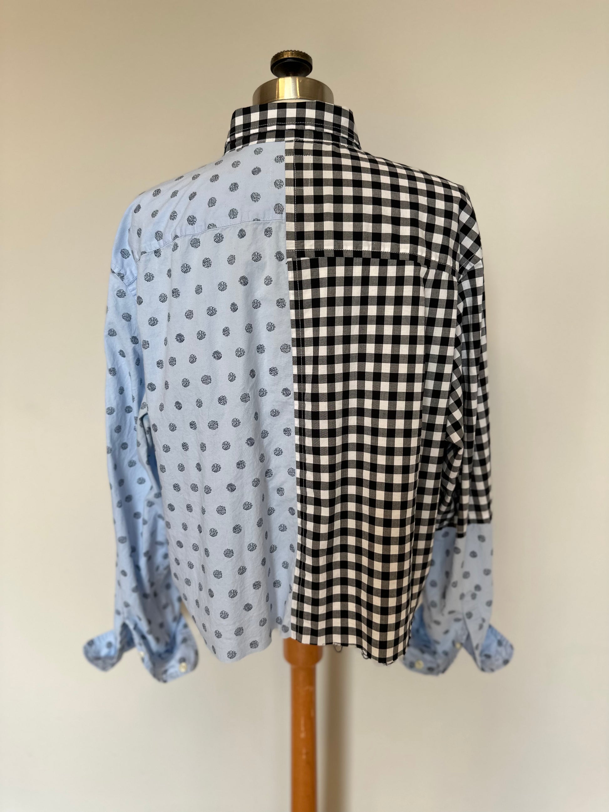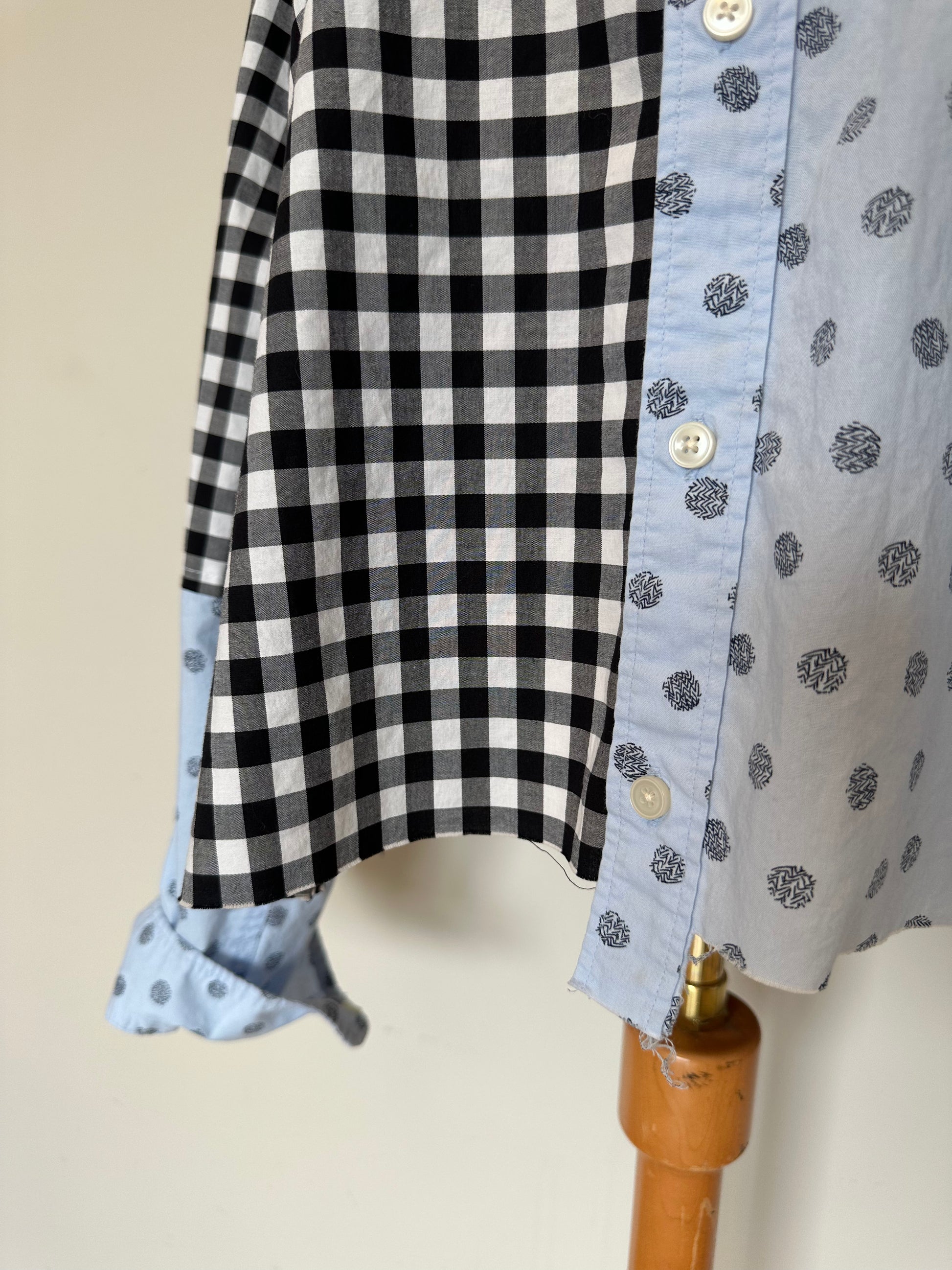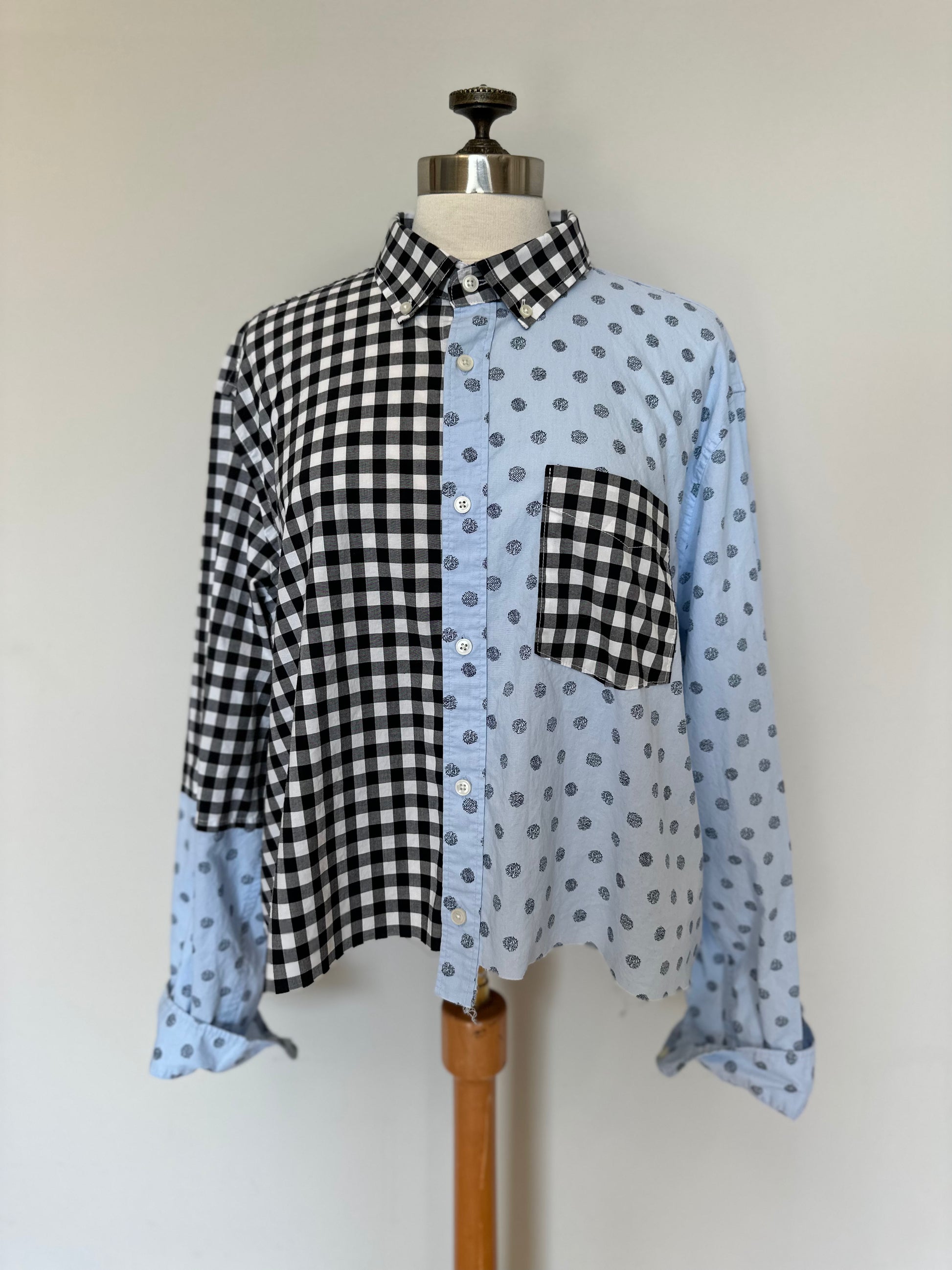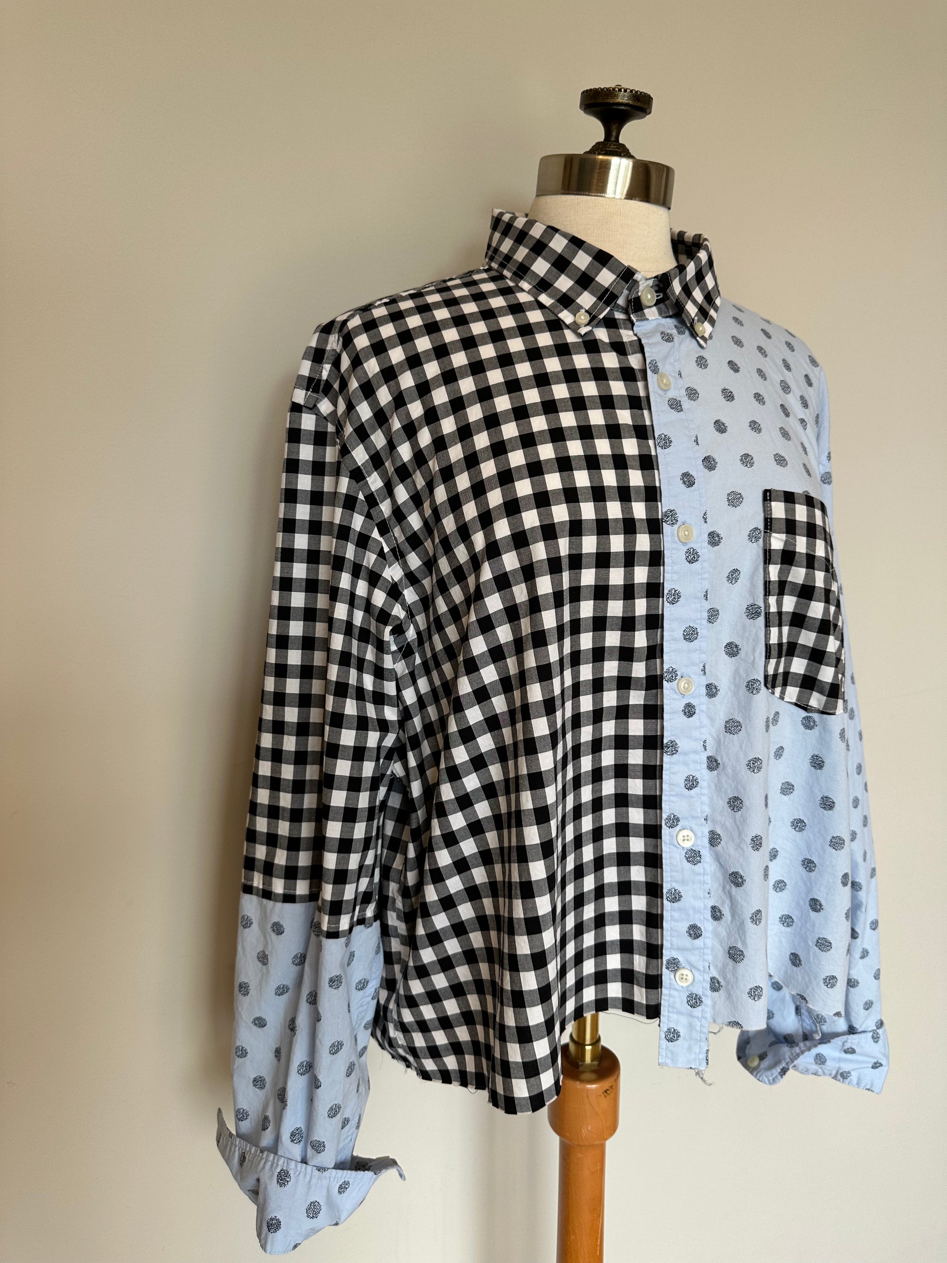 Oversized button down shirt featuring 2 contrasting fabrics and a raw edge finish. Checkers on one side and spots on the other help make this fun to style. Super soft hand feel, this will quickly become a favorite!