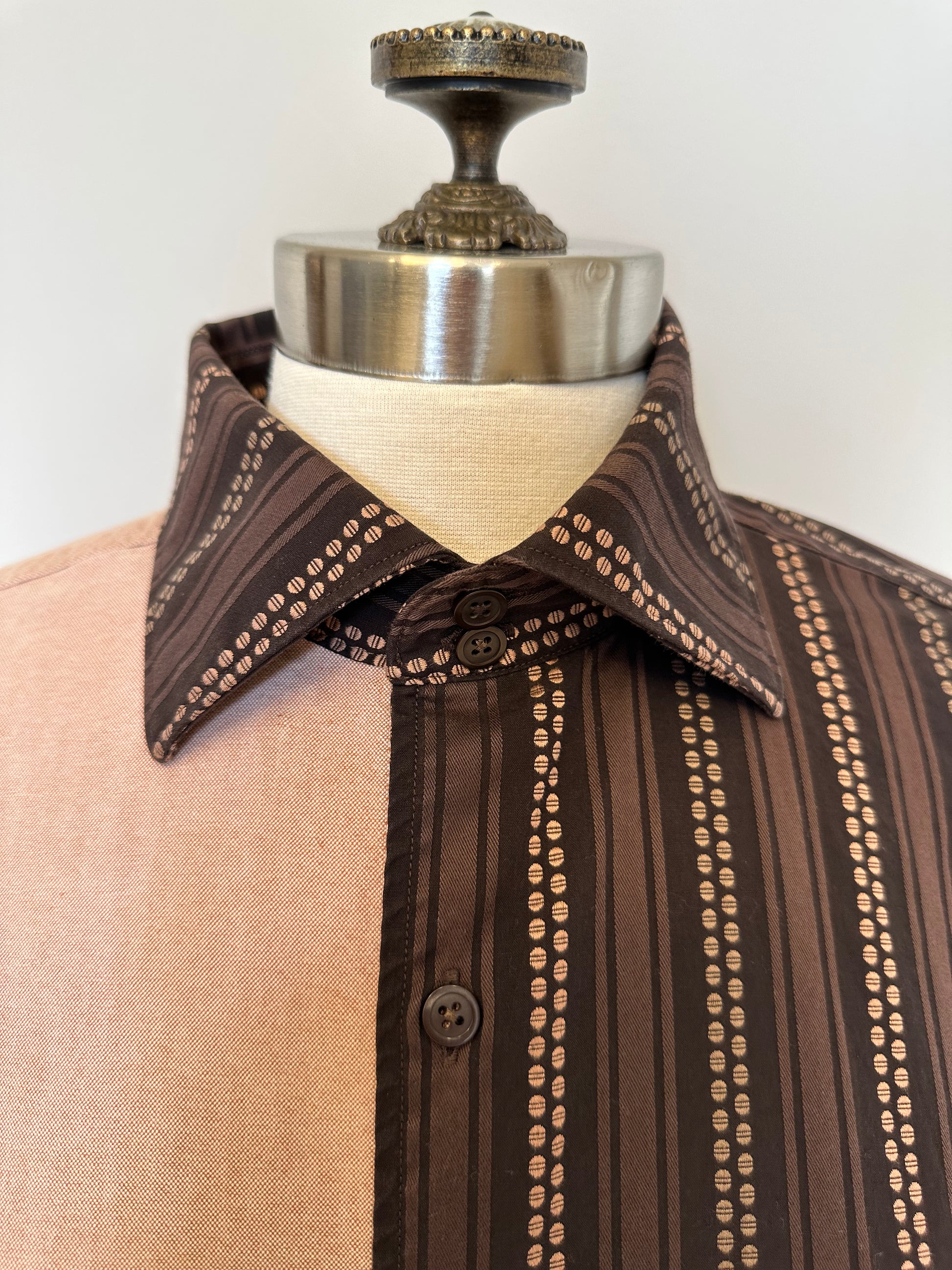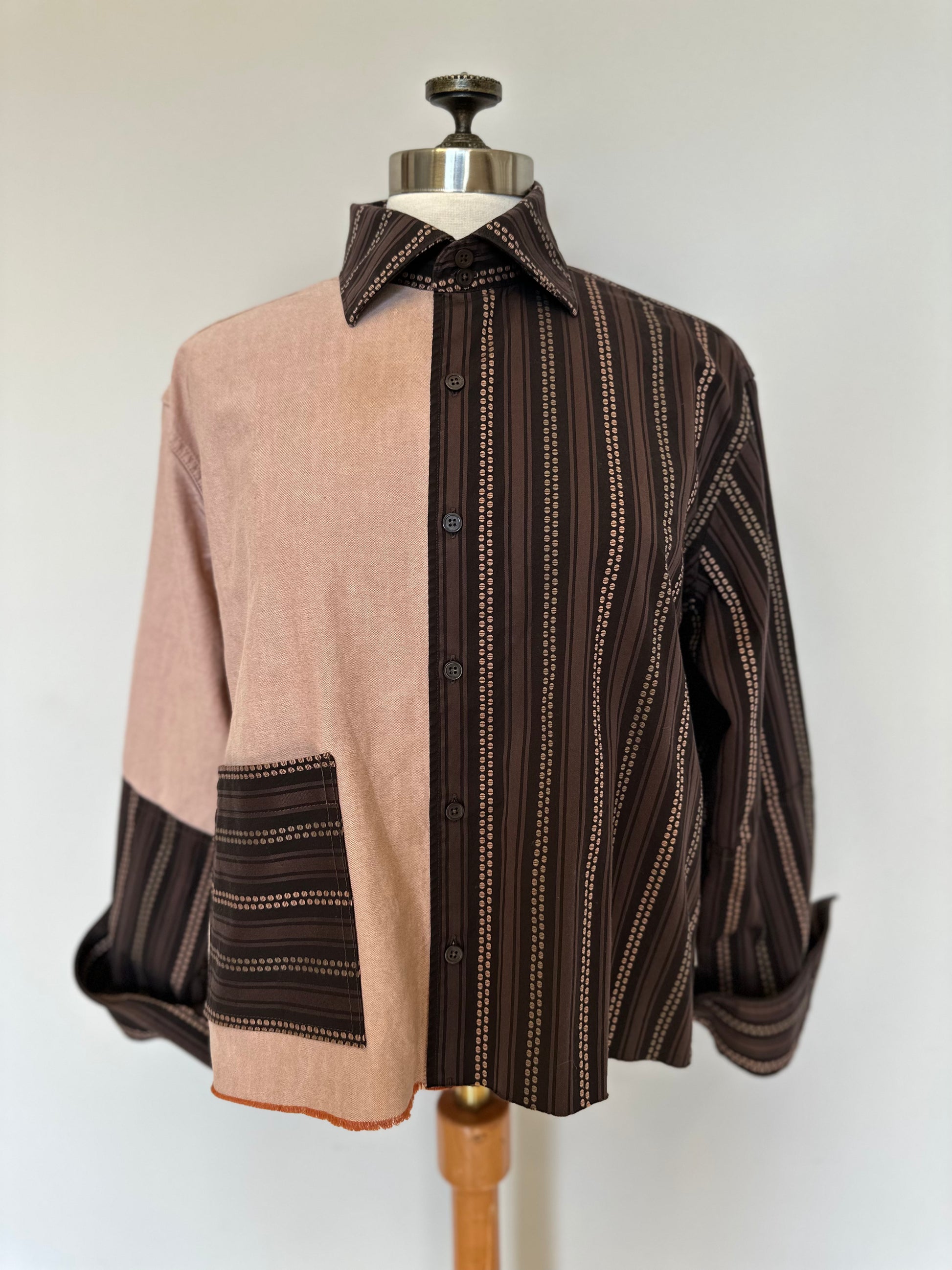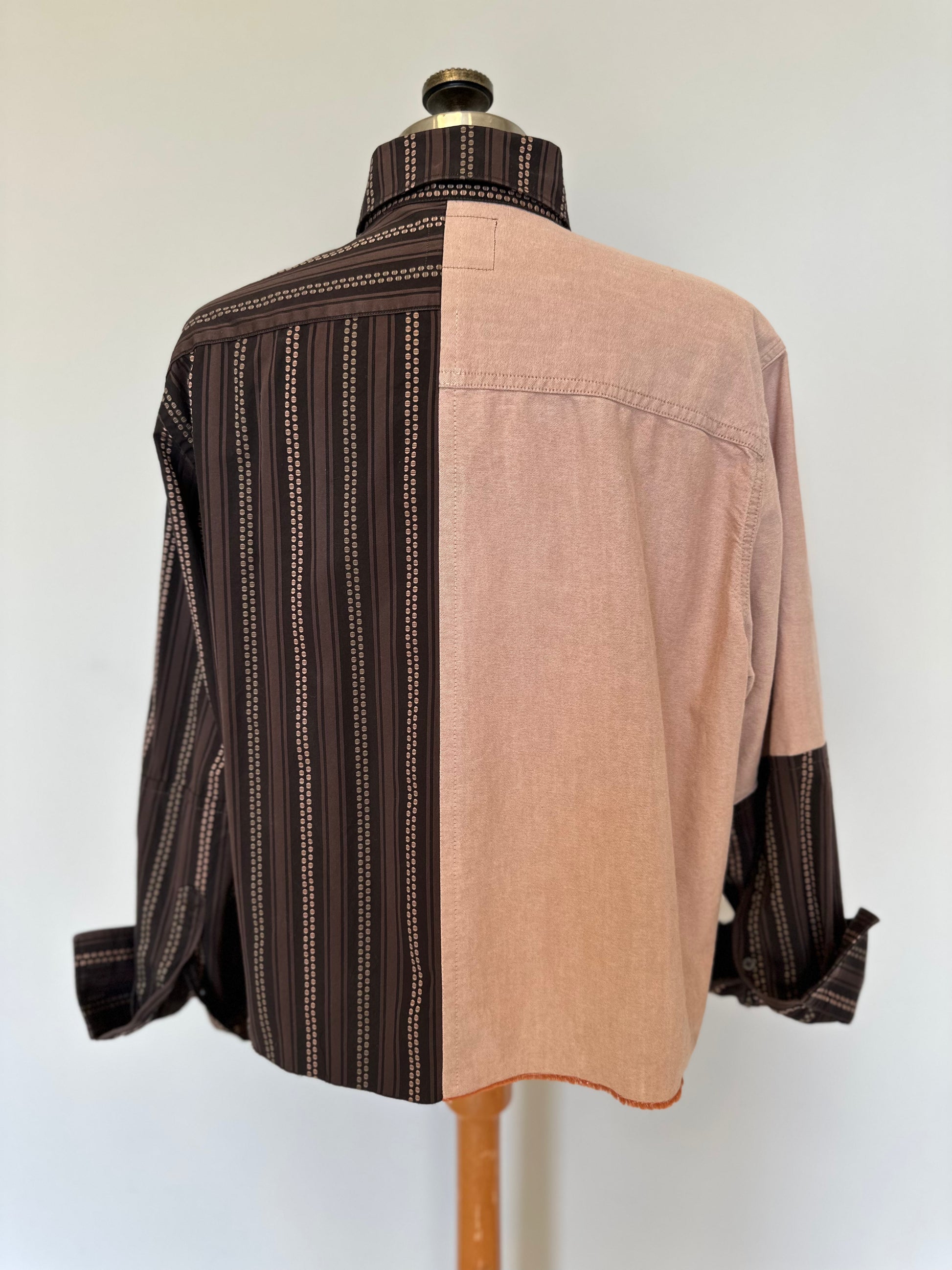 Oversized button down shirt featuring 2 contrasting fabrics and a raw edge finish. Medium weight fabrics with a solid oxford cloth and a brown woven stripe - both the perfect shade of rose gold. Large patch pocket perfect for holding a cell phone or wallet.