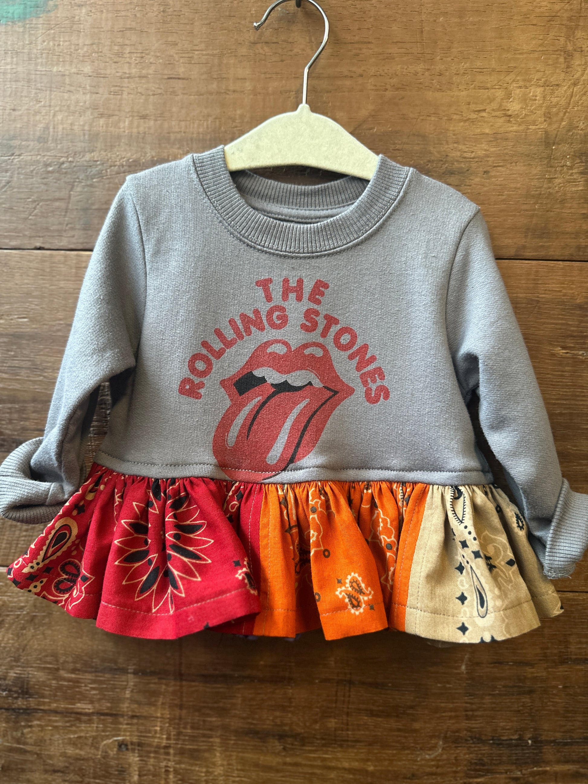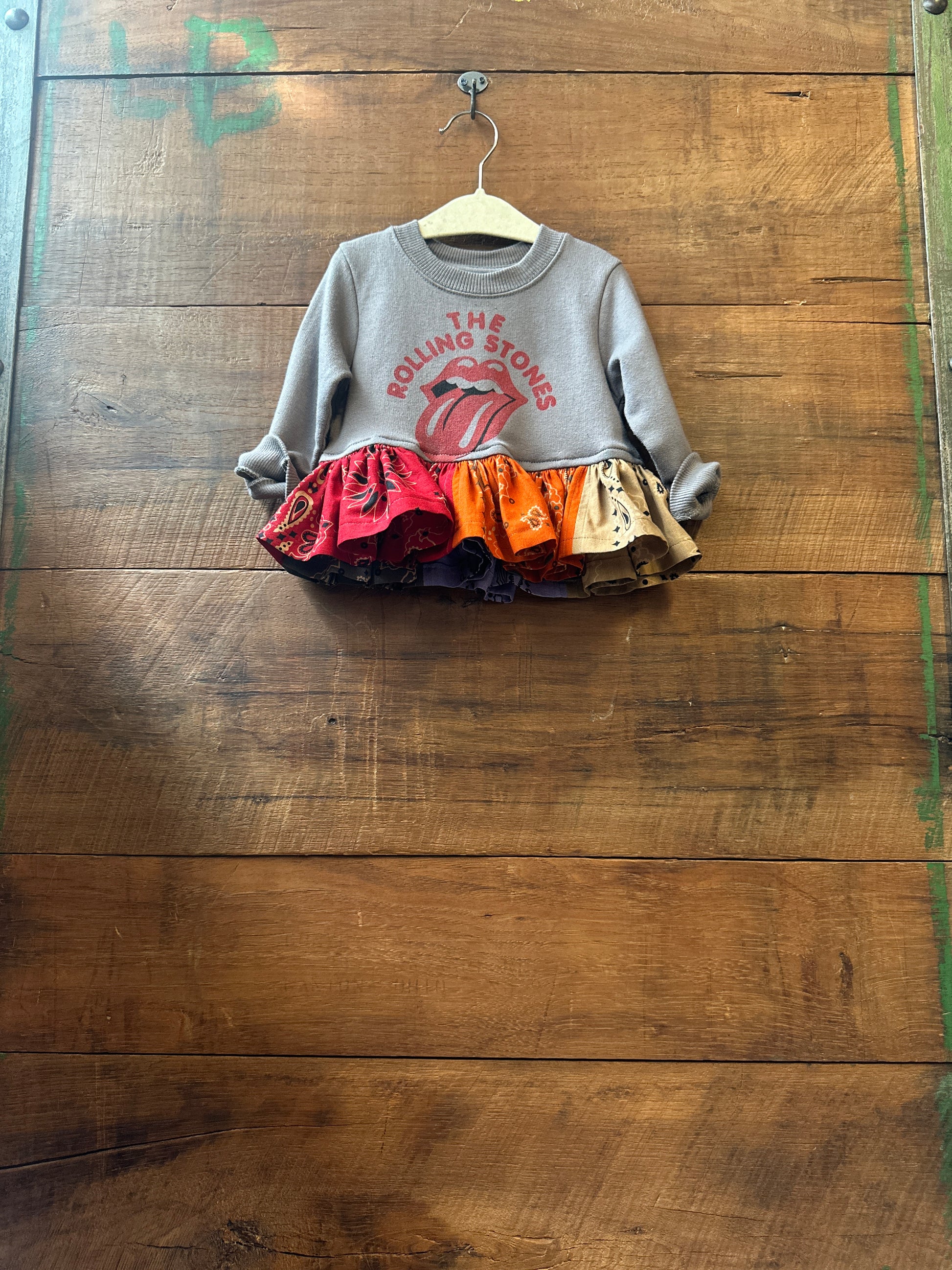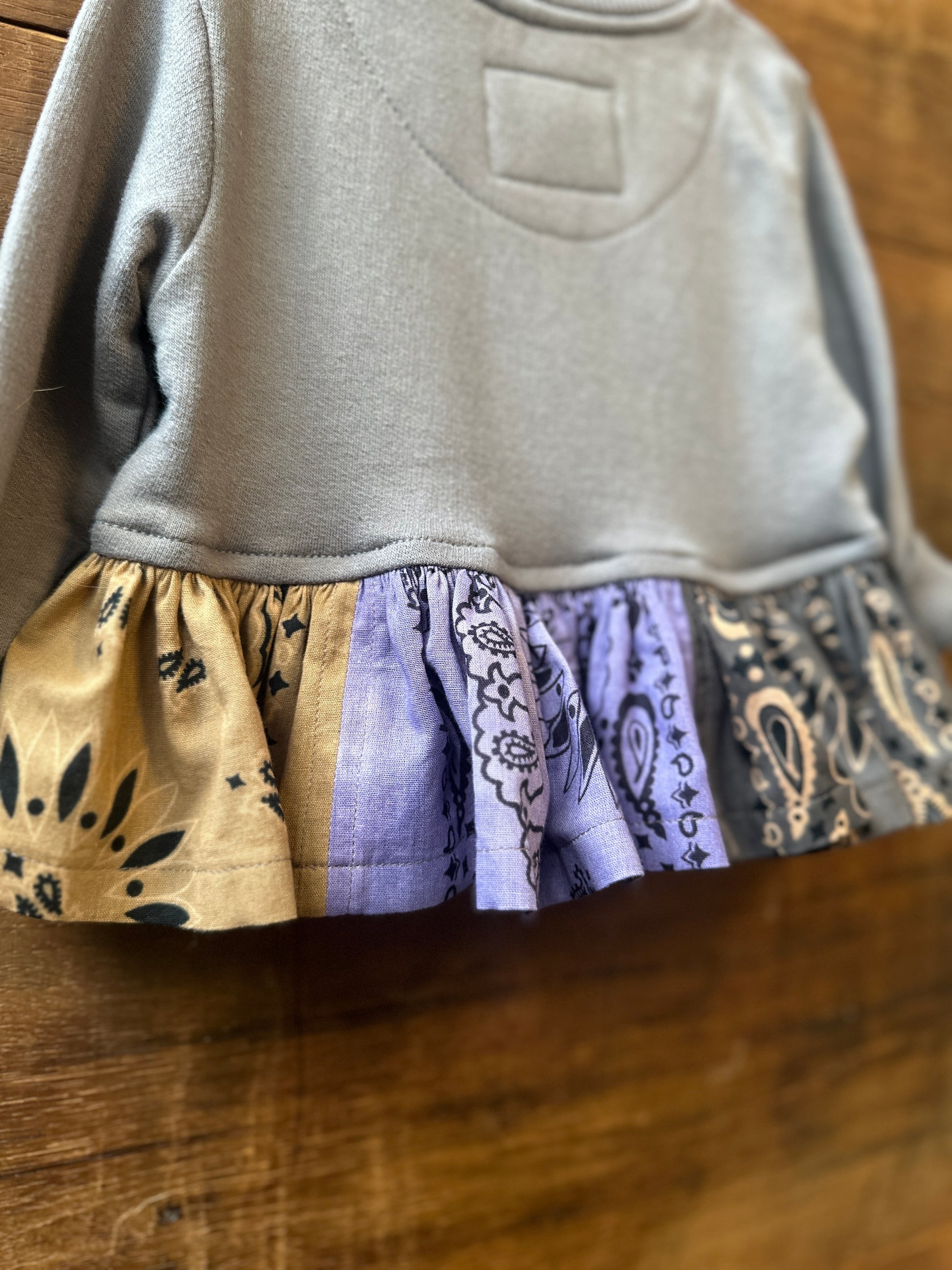 Brighten your little one's day with the Baby Stones Tunic—a playful mix of a cozy upcycled sweatshirt and a charming gathered skirt made from colorful bandanas. Soft, sustainable, and full of character, this unique piece adds a splash of fun and comfort to every adventure. Perfect for toddlers who love to move and explore in style!