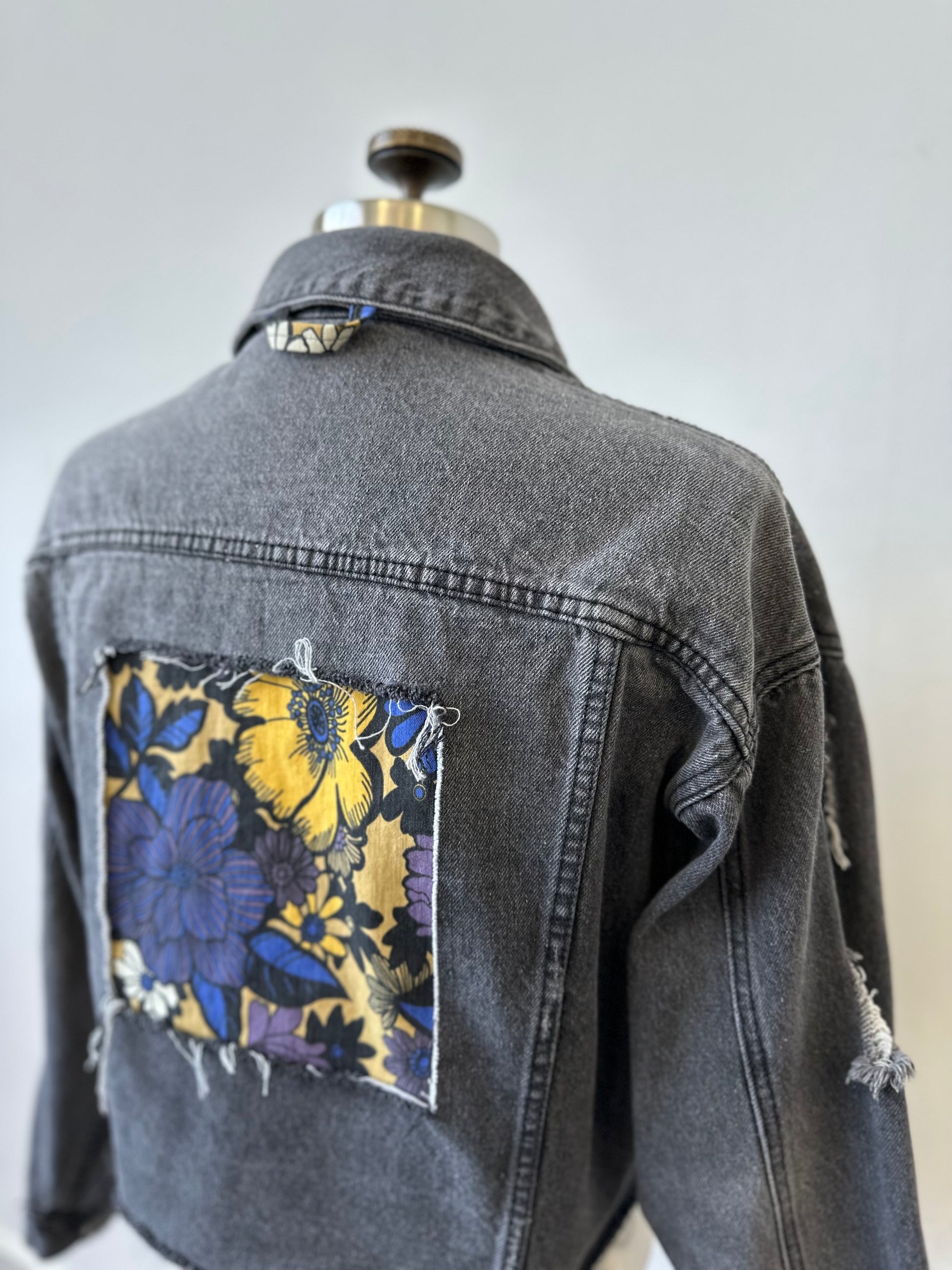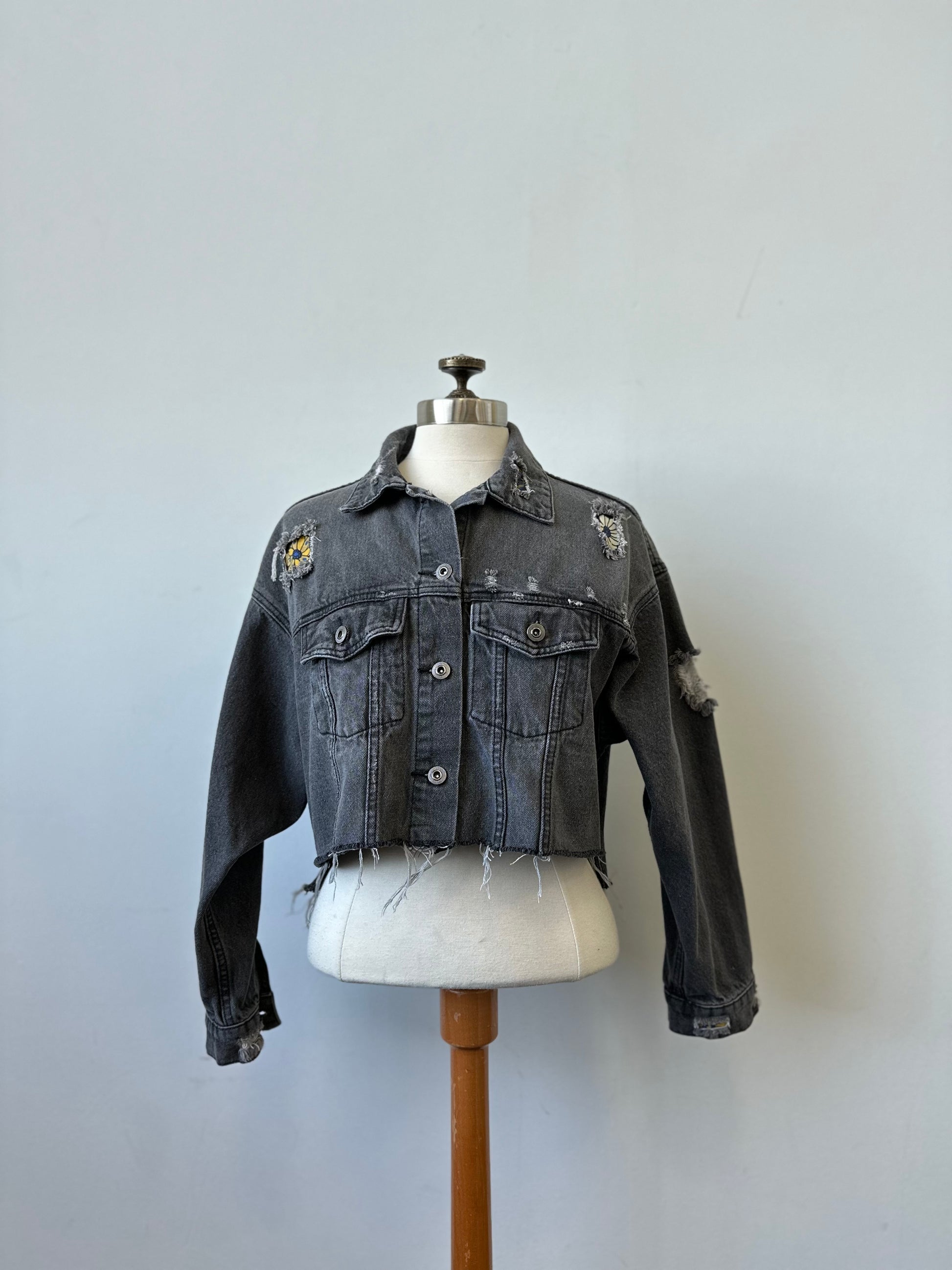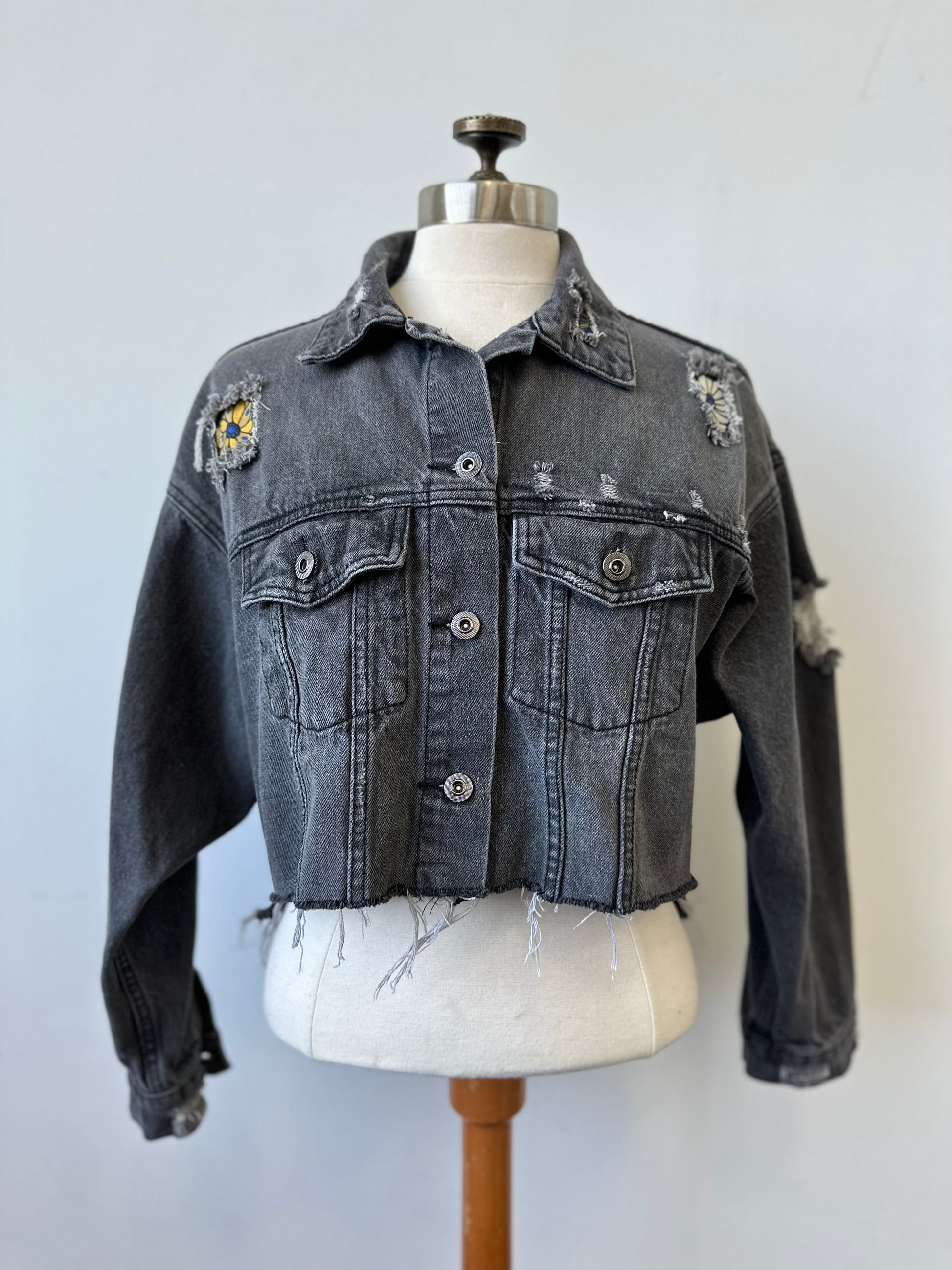 Look like a total flower child in this upcycled black denim jacket featuring distressed floral detailing. Show off your unique style with this edgy look--it'll give your wardrobe the perfect cropped touch!