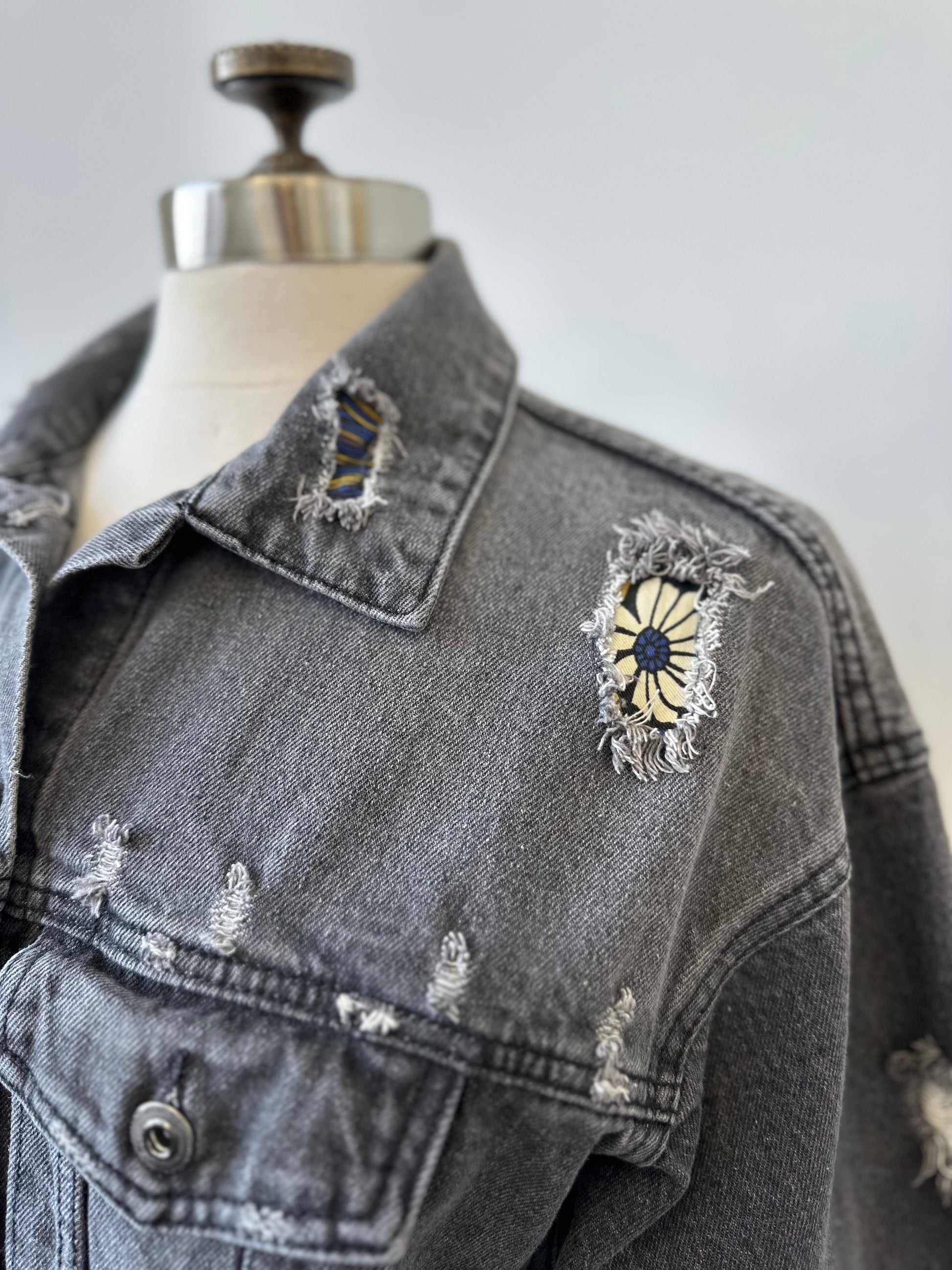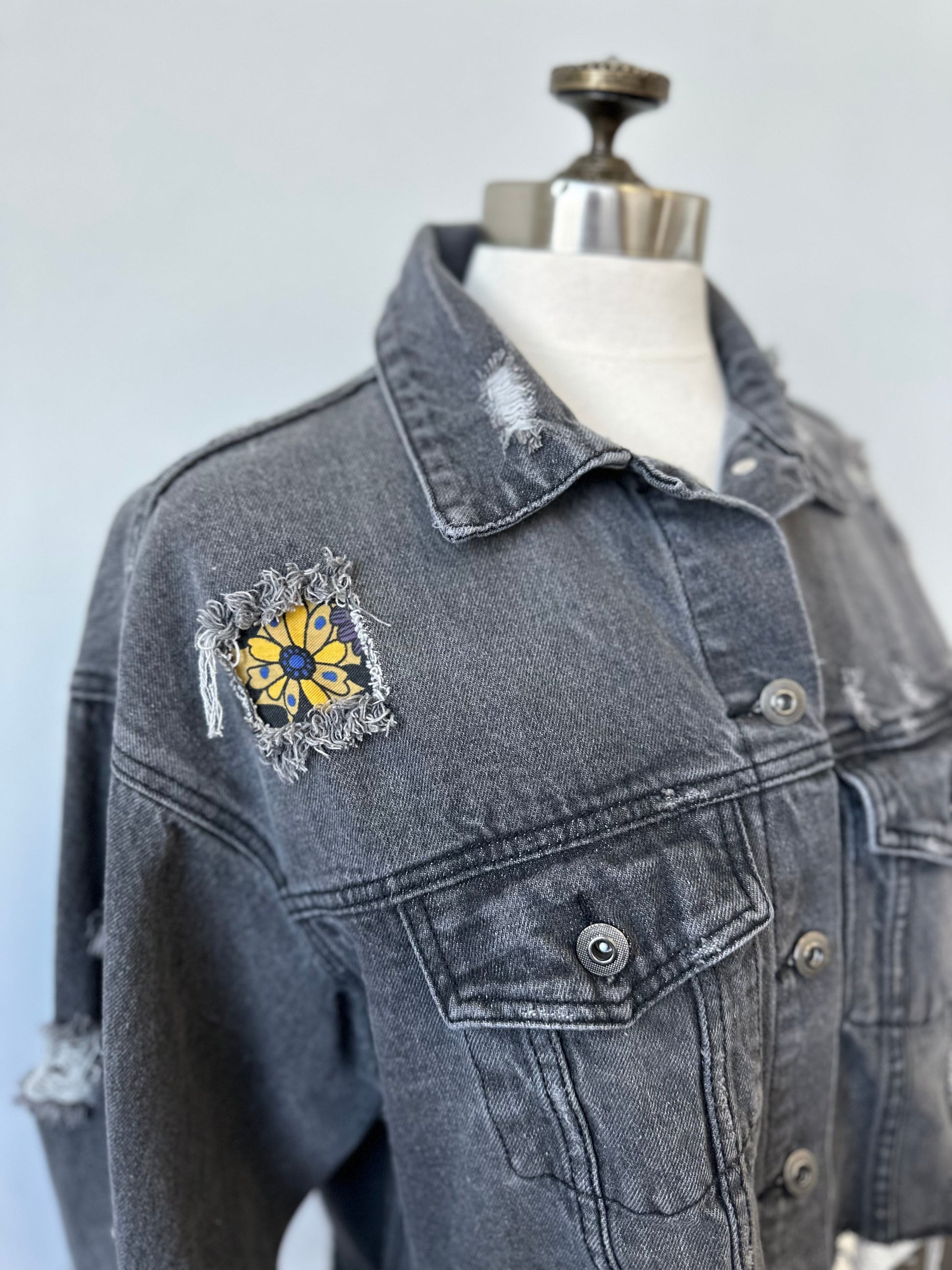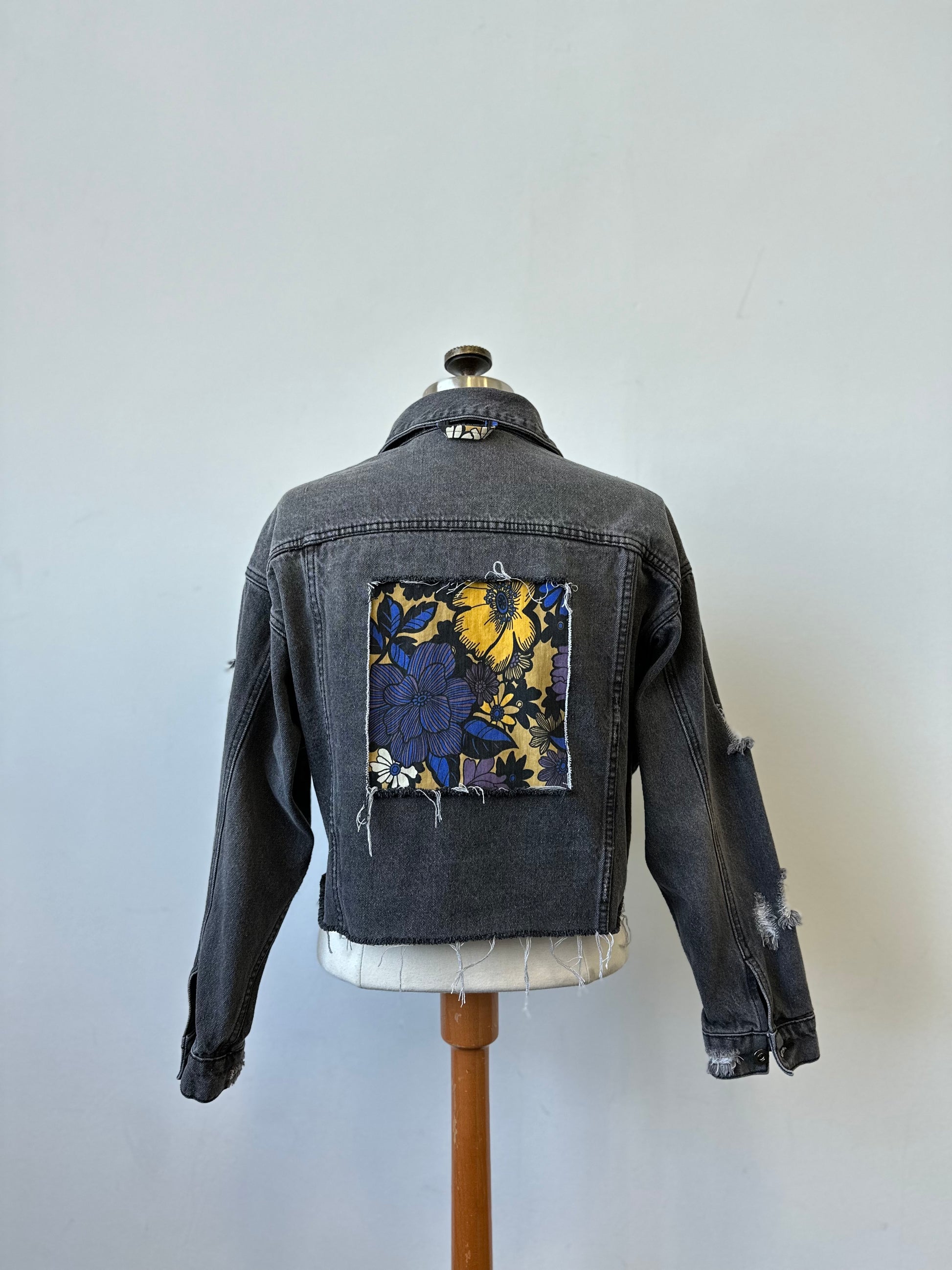 Look like a total flower child in this upcycled black denim jacket featuring distressed floral detailing. Show off your unique style with this edgy look--it'll give your wardrobe the perfect cropped touch!