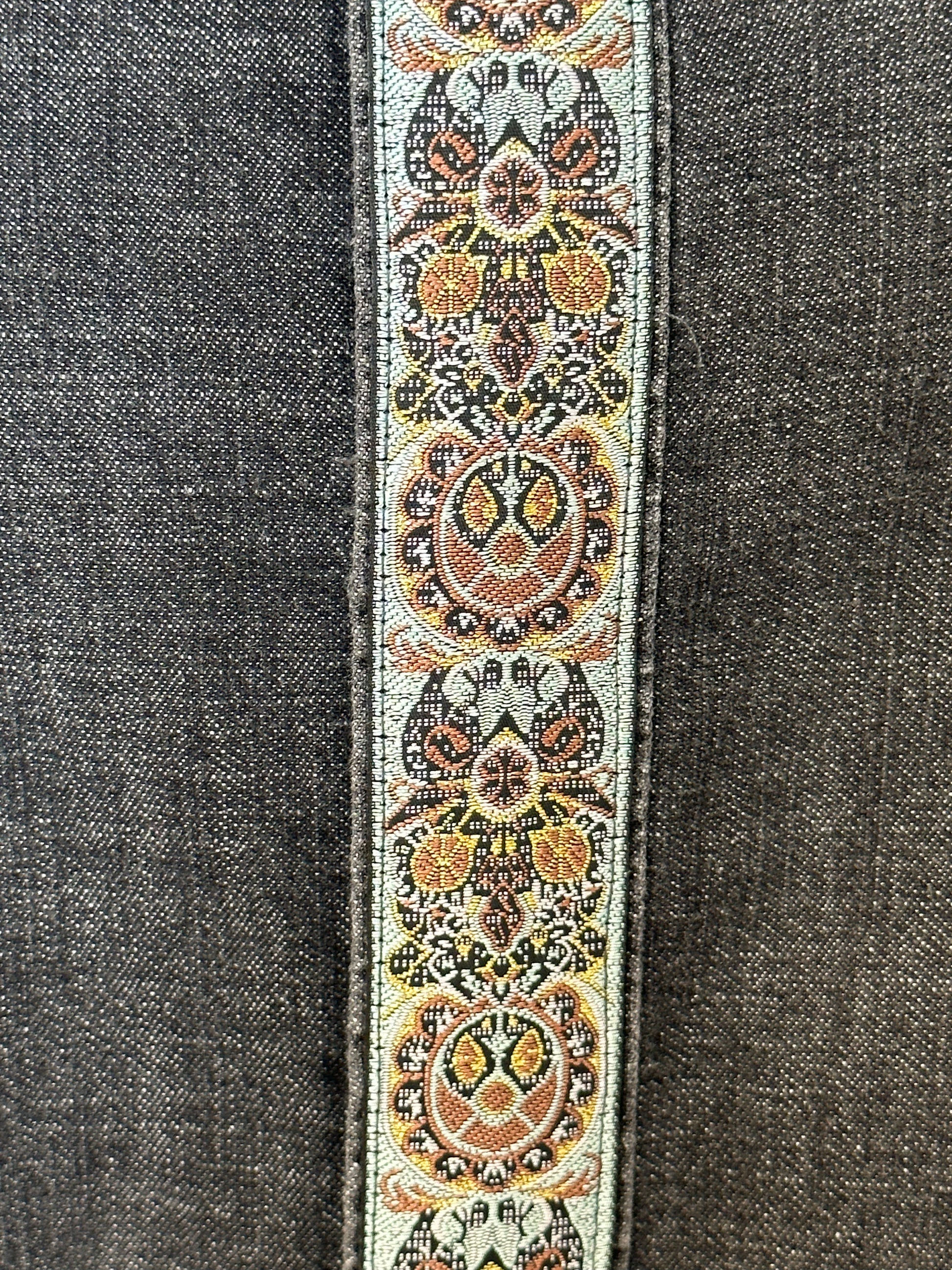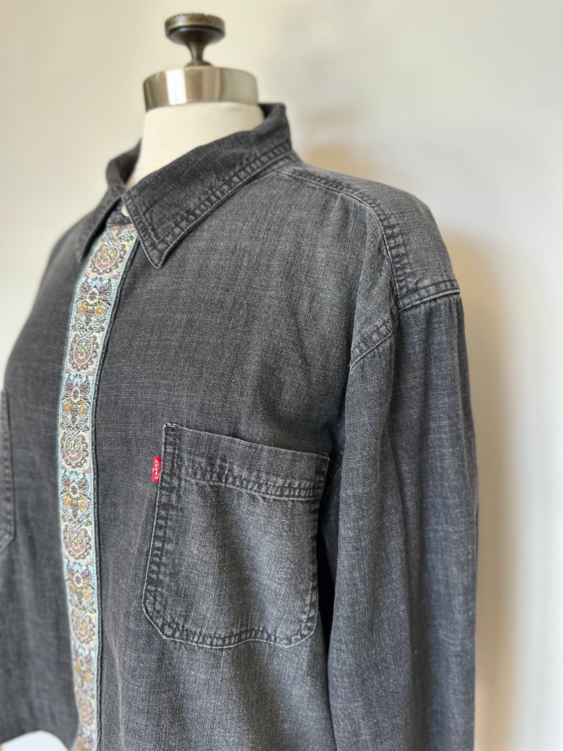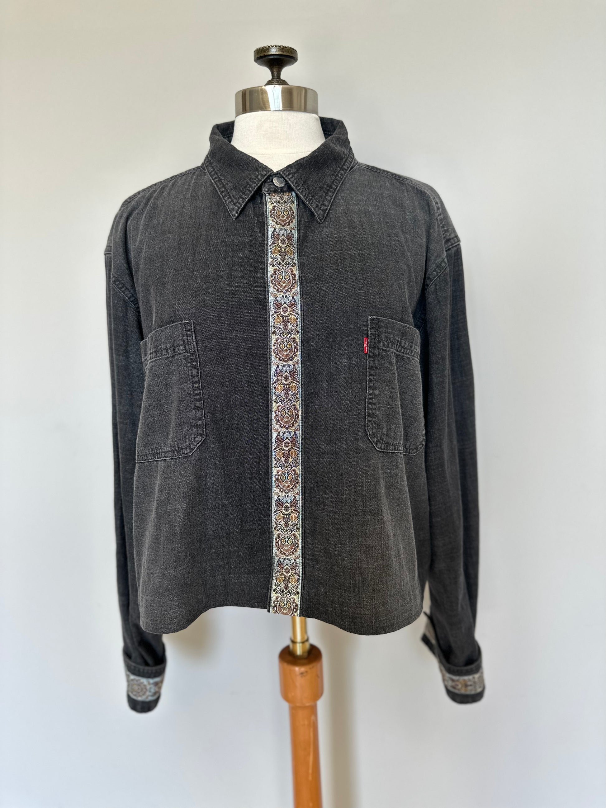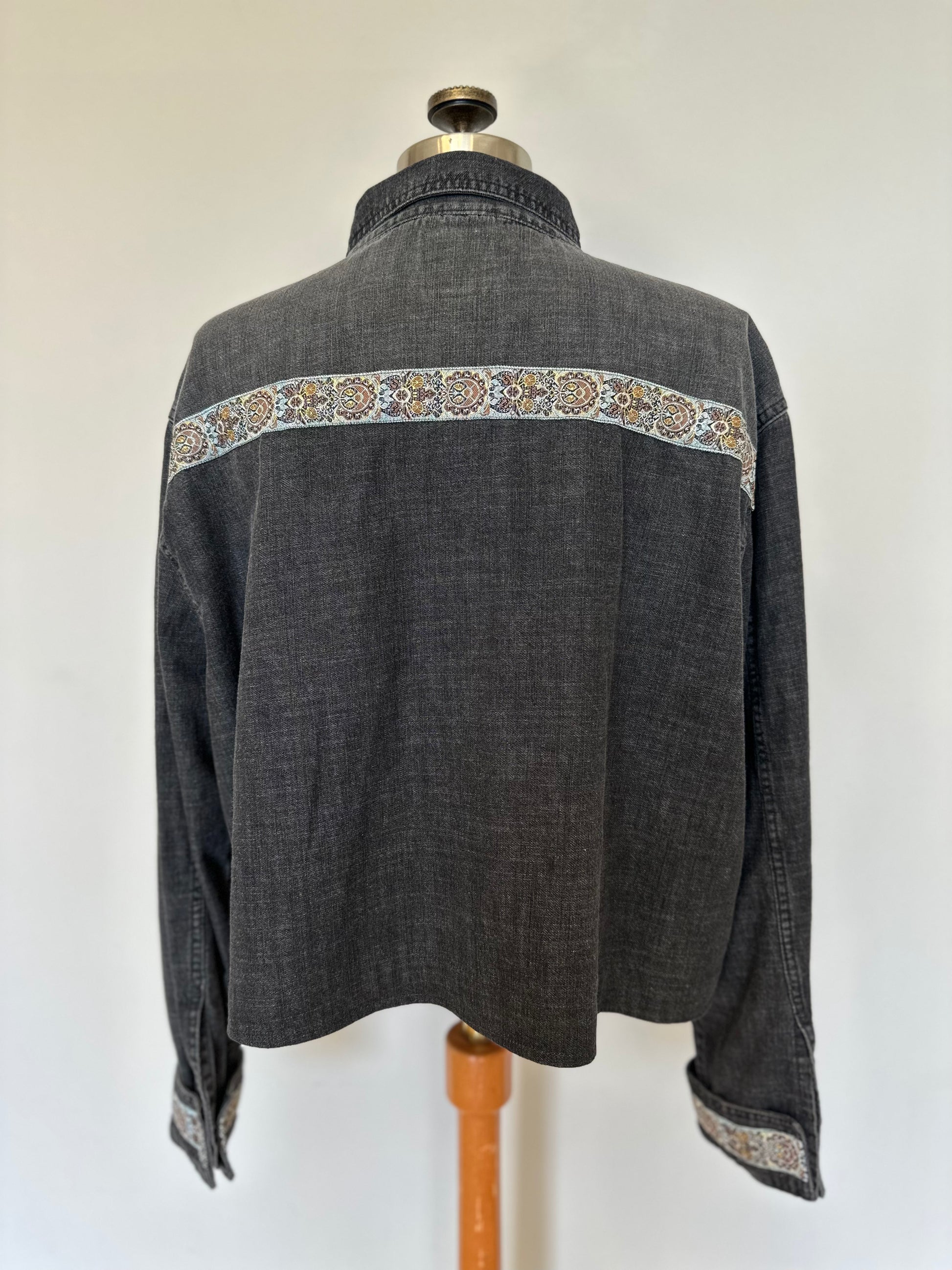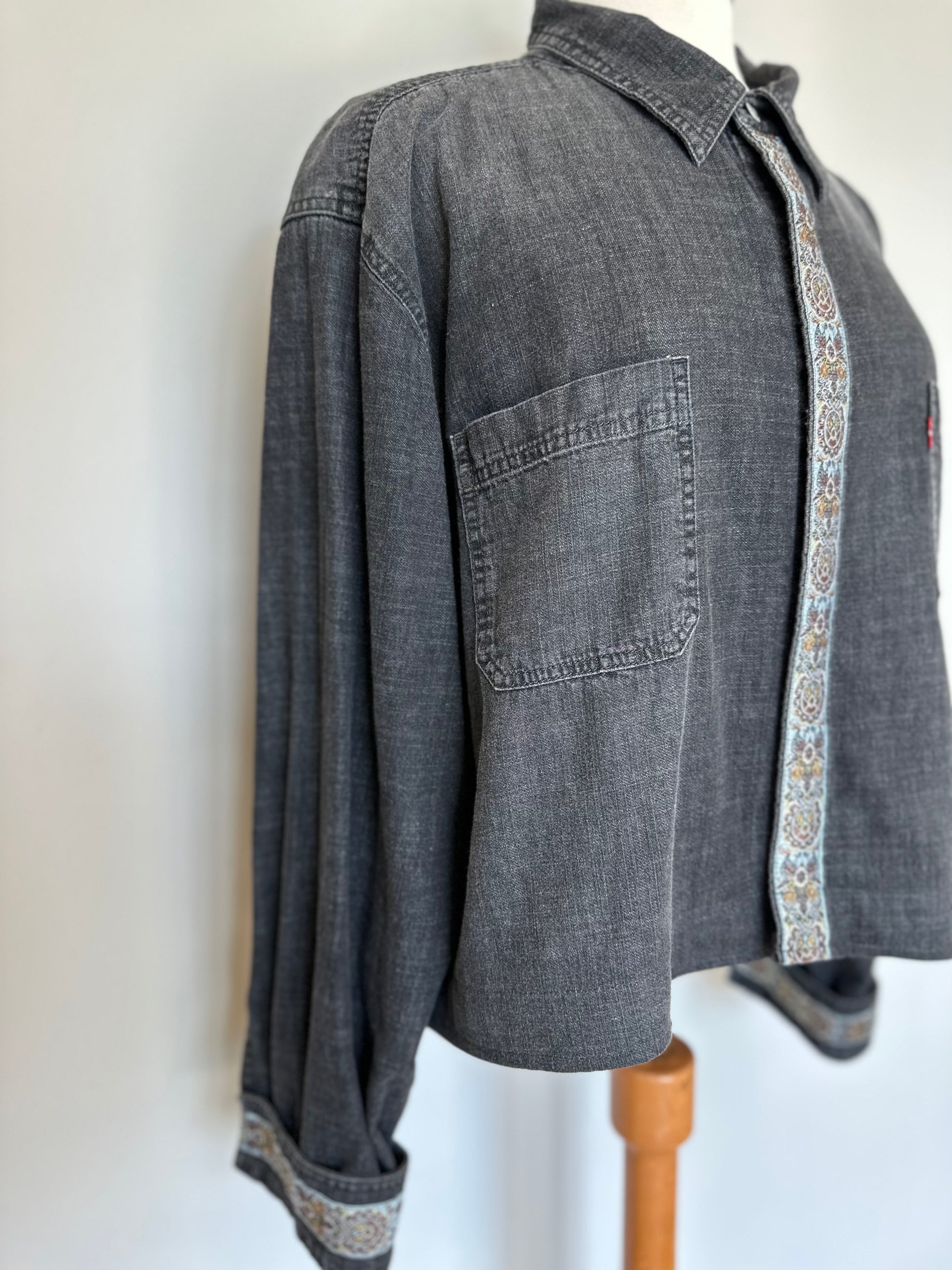 Oversized button down shirt in a medium weight charcoal black denim. Features a cool silver/gold/bronze patterned trim along the front, wrist and back. Slightly shorter than the average denim shirt, will sit below the waist.