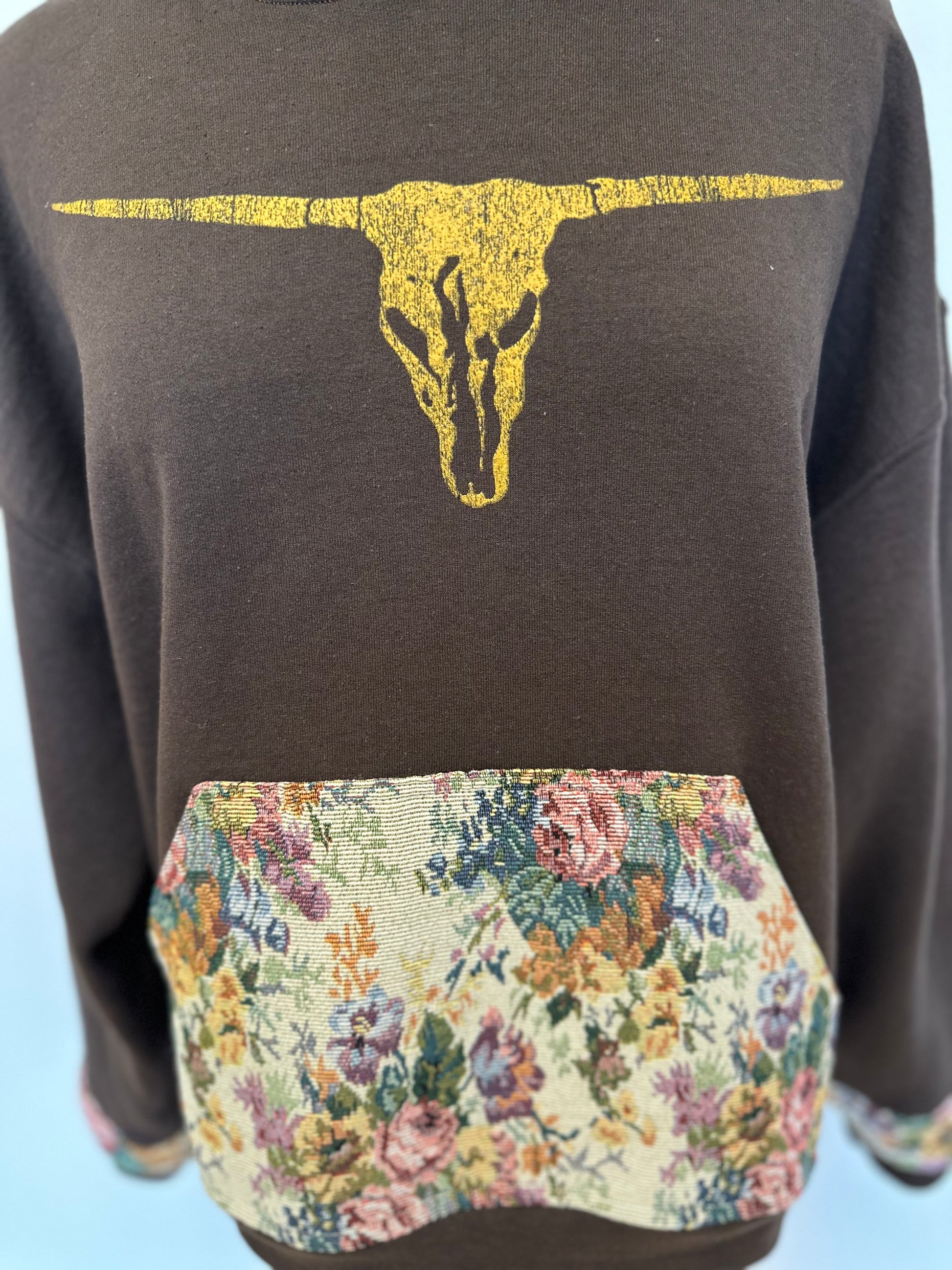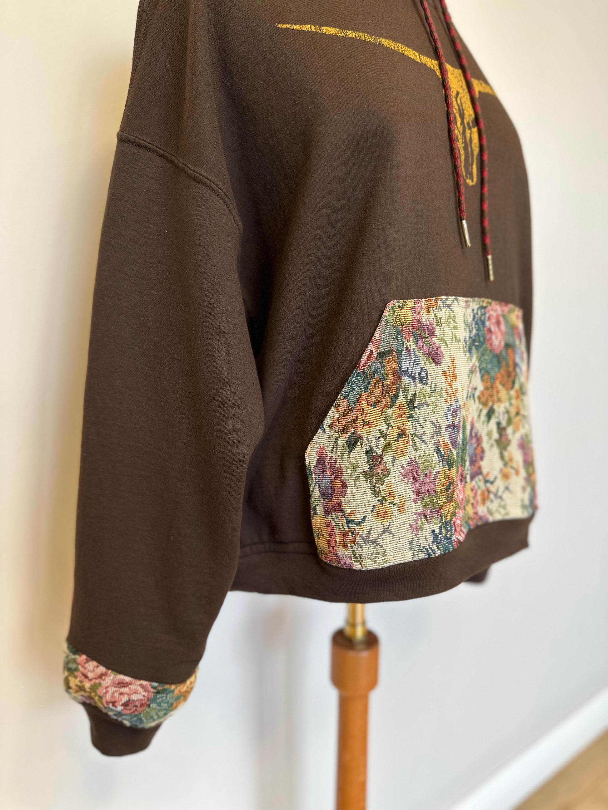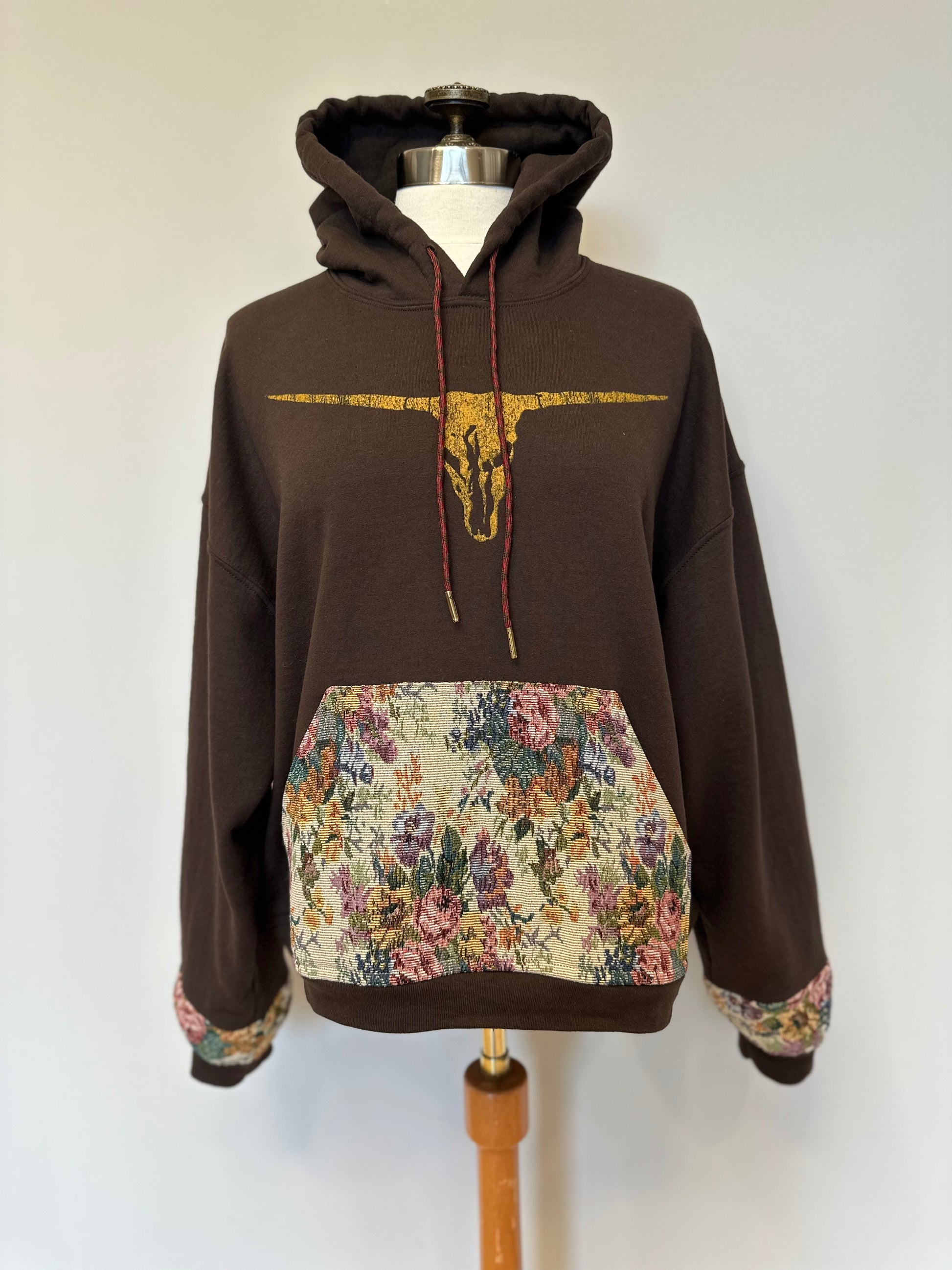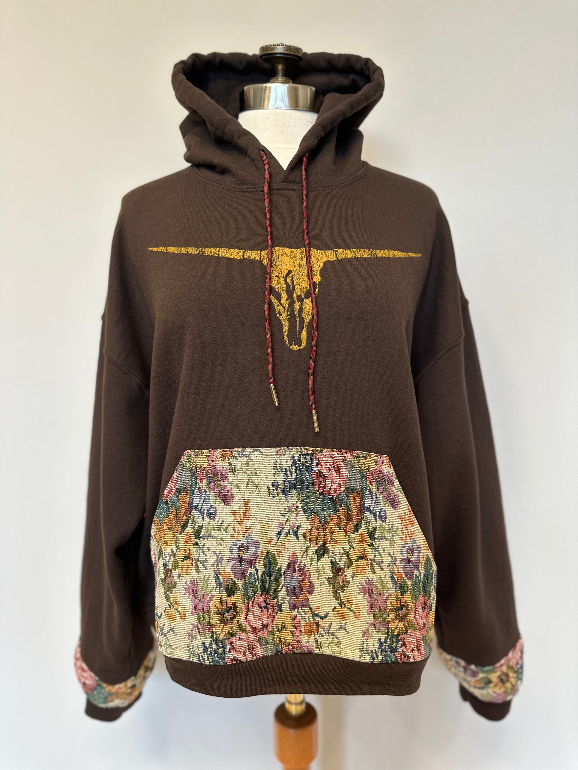 The only piece in The Aster Collection to feature tapestry fabric! Oversized sweatshirt with a double fabric hoodie in a medium weight. This one has the most perfect fall colors weaved into the tapestry on the pocket and sleeve detail. Contrasting tie. Brooks & Dunn graphic on the back...we had fun with this one, listened to a little Boot Scootin Boogie!