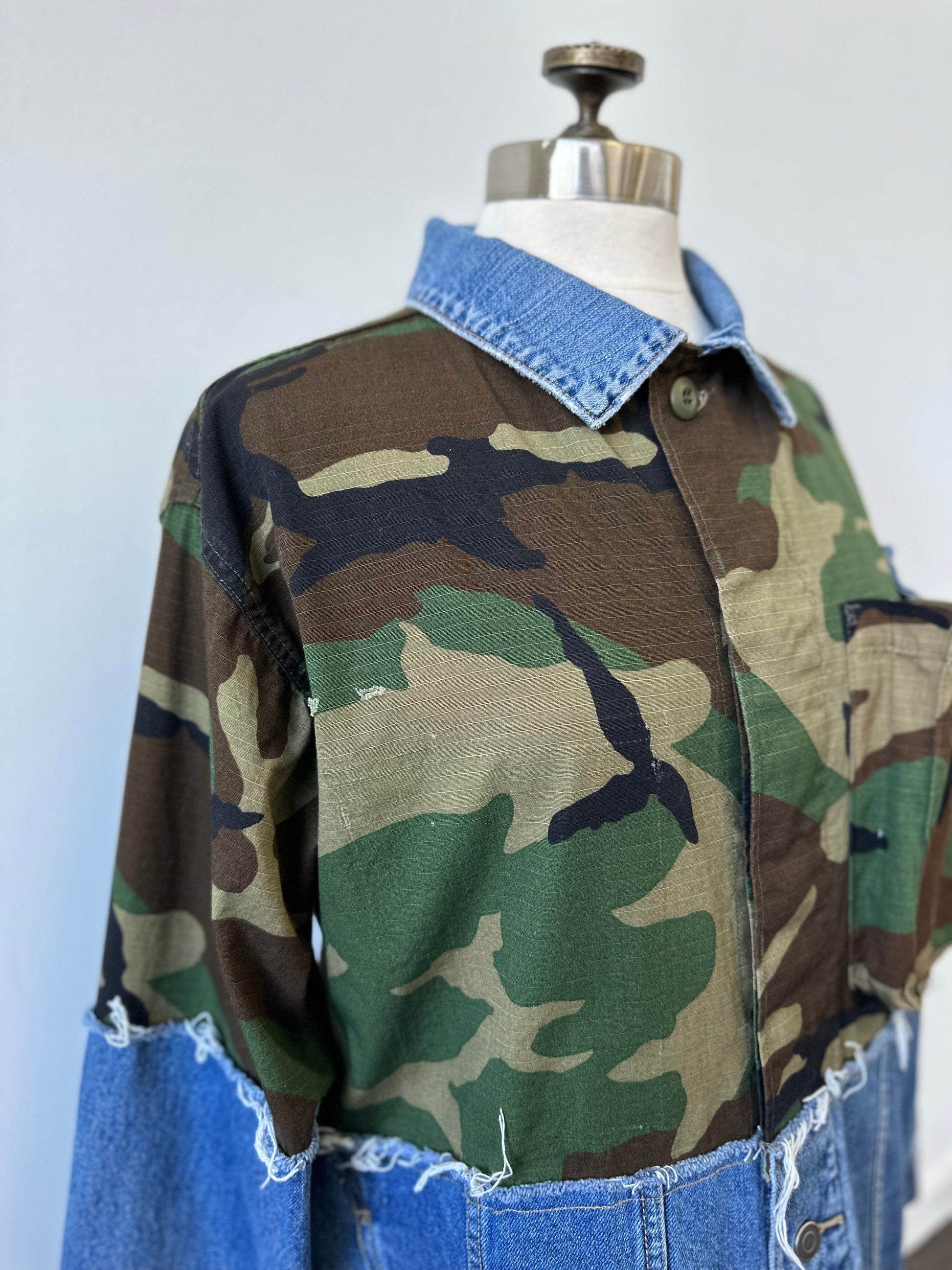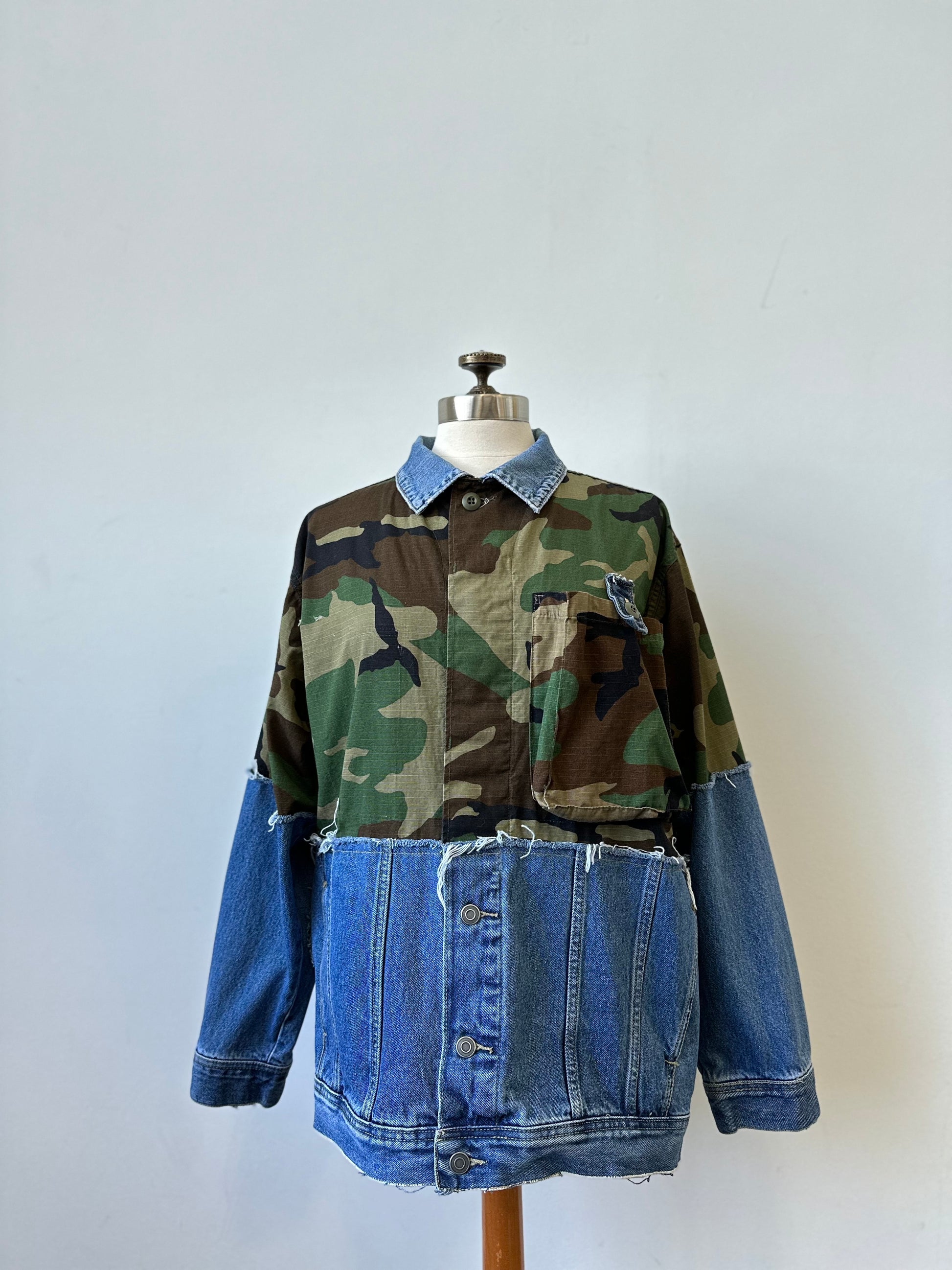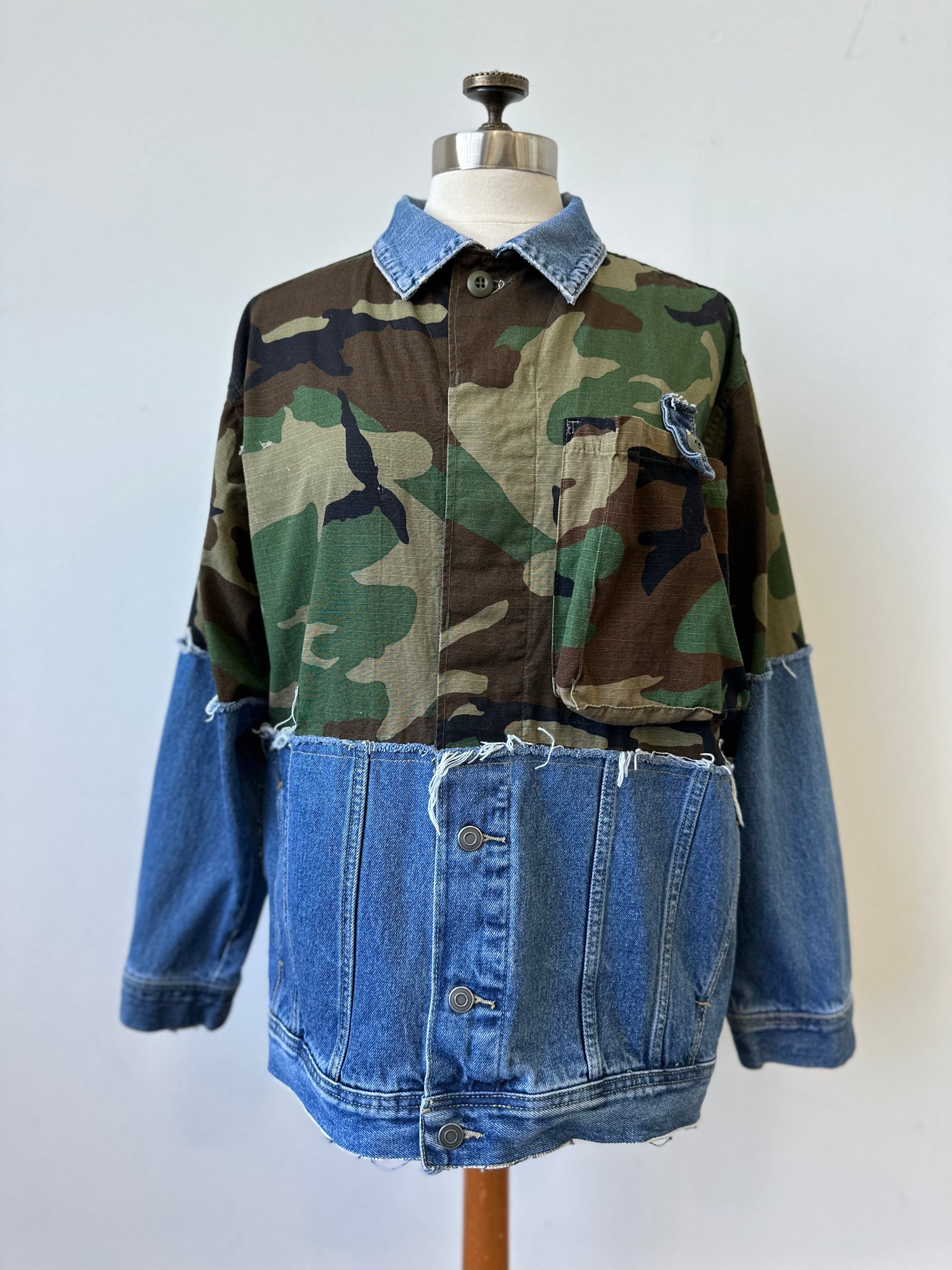 Elevate your style with The Camden - a unique, upcycled piece combining a vintage camo jacket with a distressed denim jacket. Show off your trendsetting style with this one-of-a-kind find!