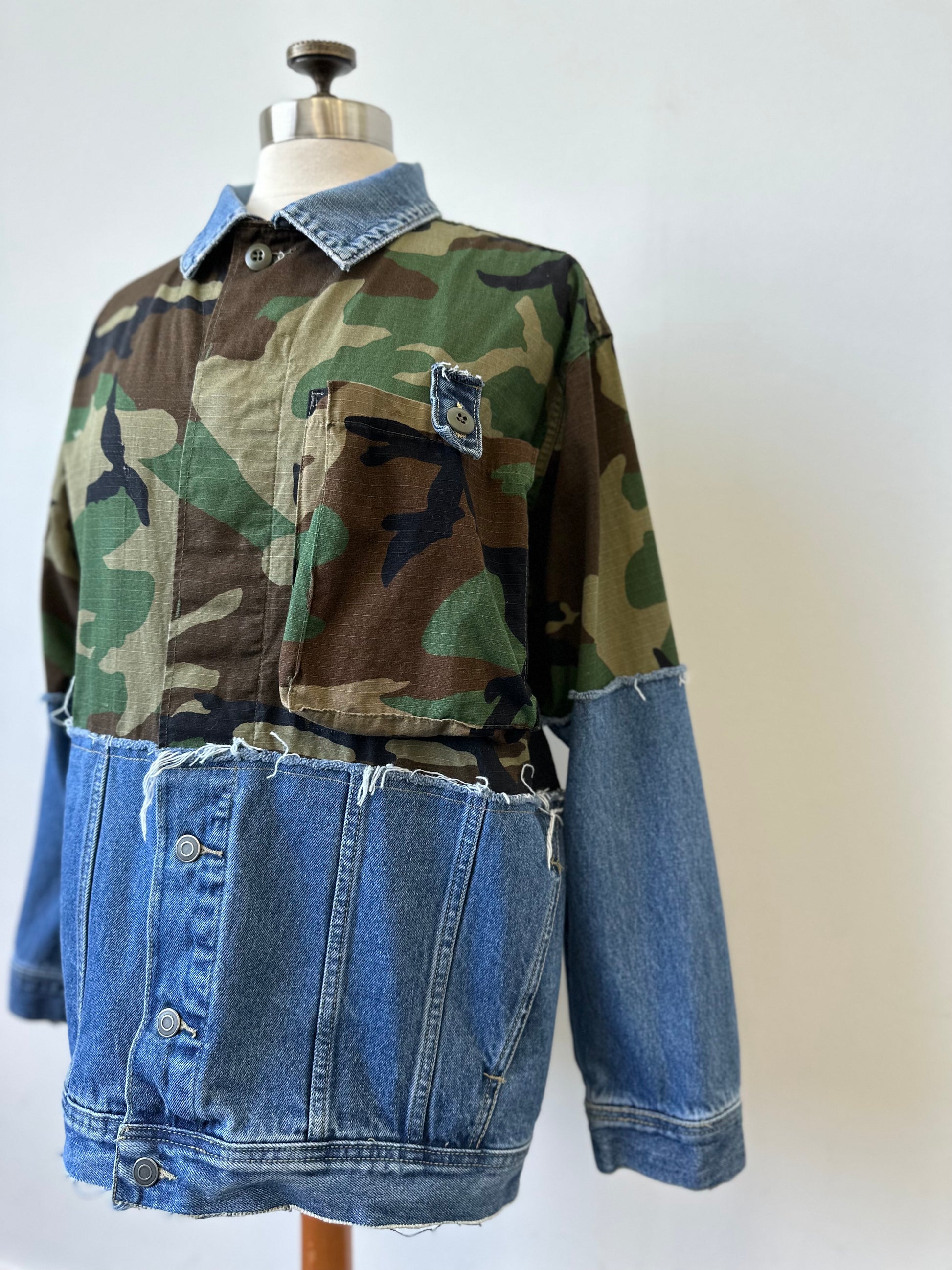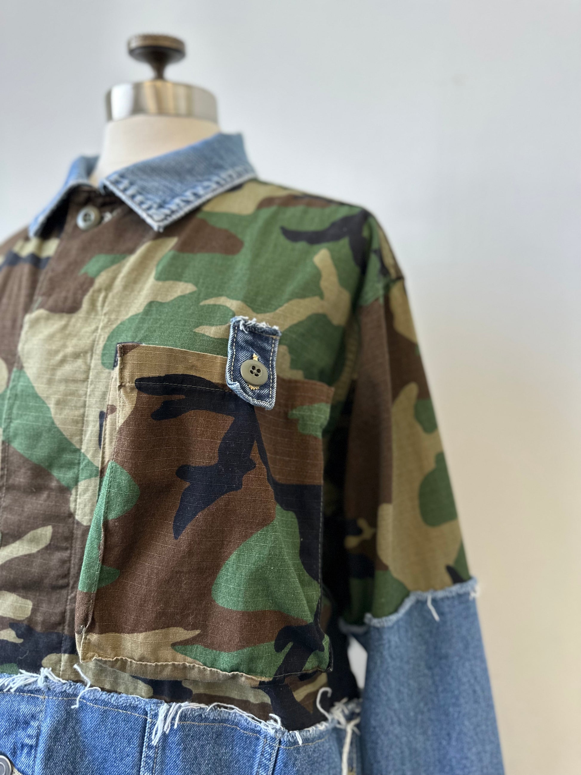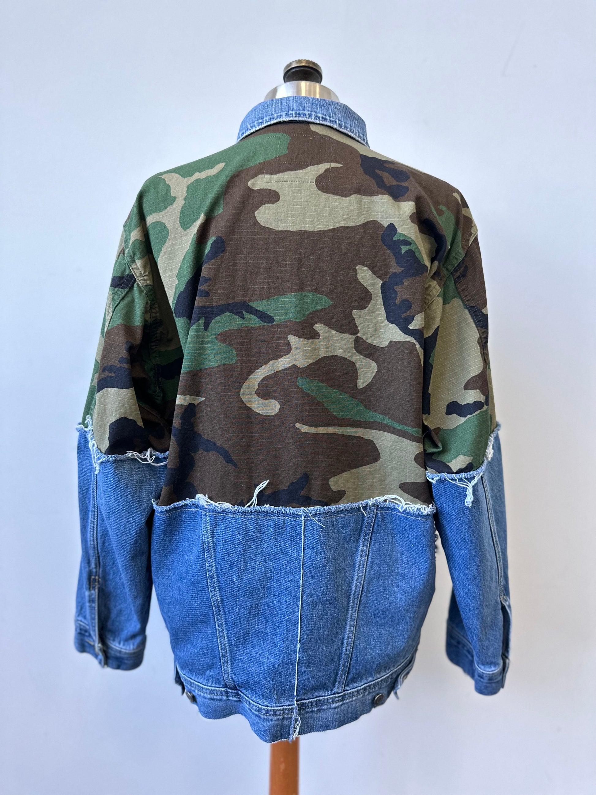 Elevate your style with The Camden - a unique, upcycled piece combining a vintage camo jacket with a distressed denim jacket. Show off your trendsetting style with this one-of-a-kind find!