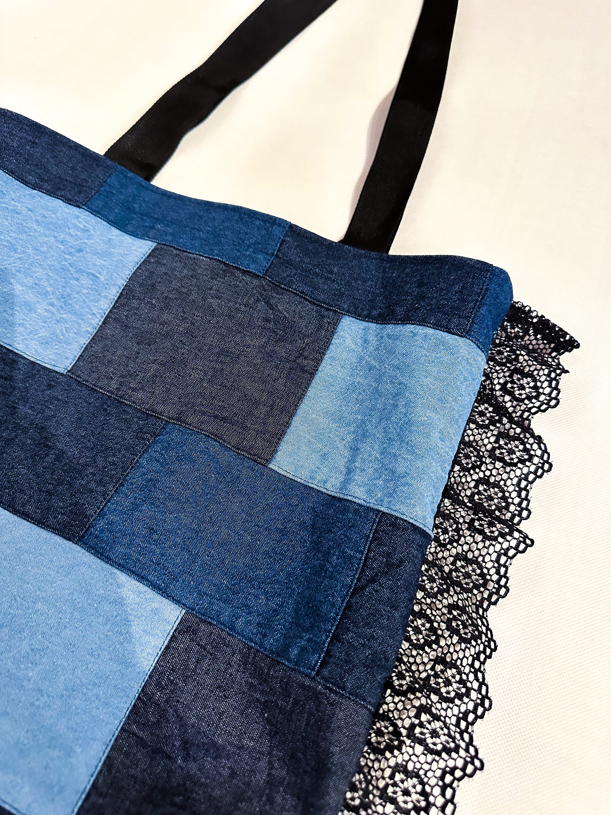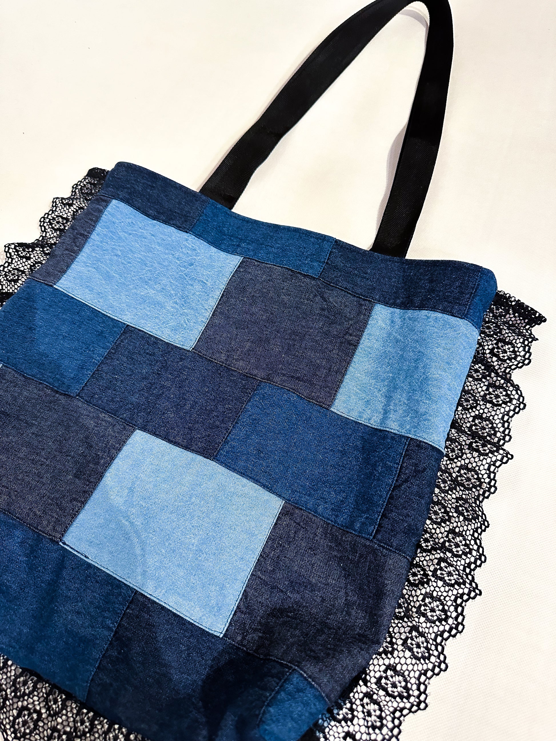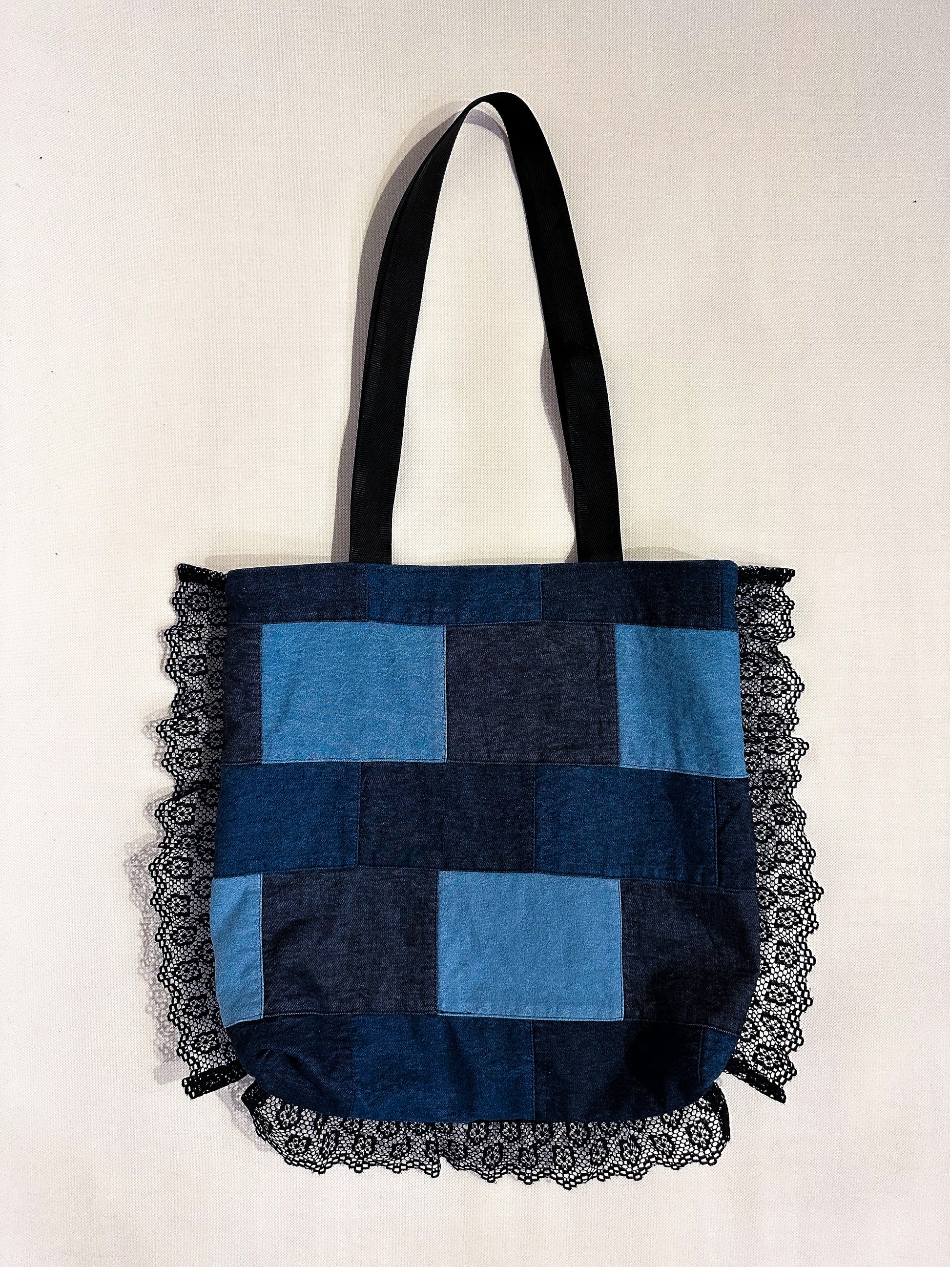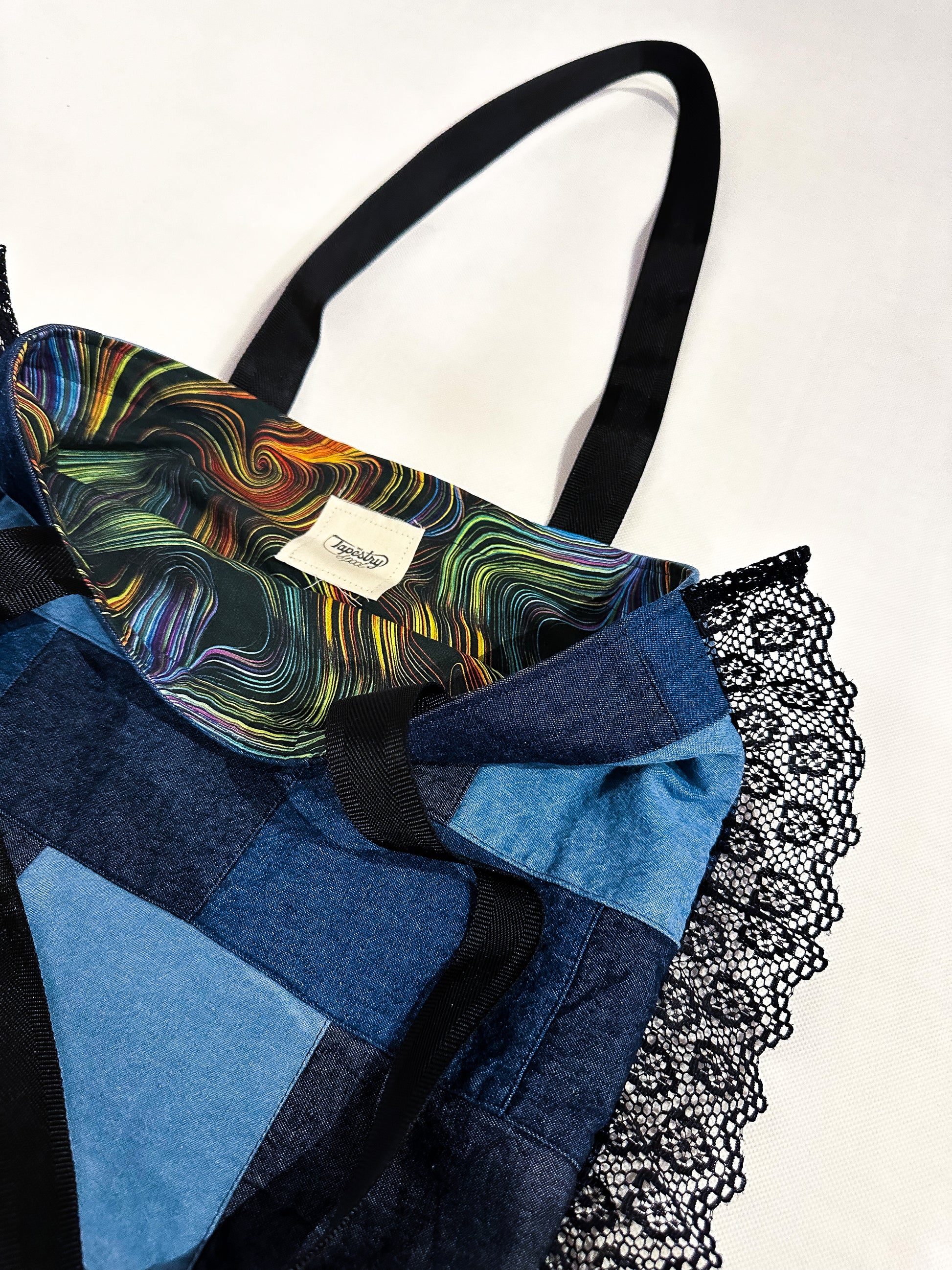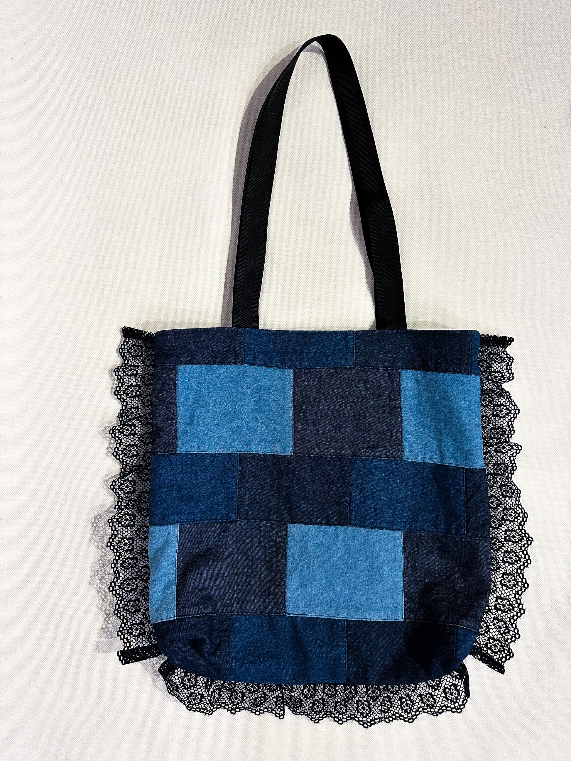 This Denim Bag is one-of-a-kind, with lace trim and upcycled denim patch fabric for a playful take on a classic. Perfectly fits a laptop, books and so much more.Make a statement without saying a word!