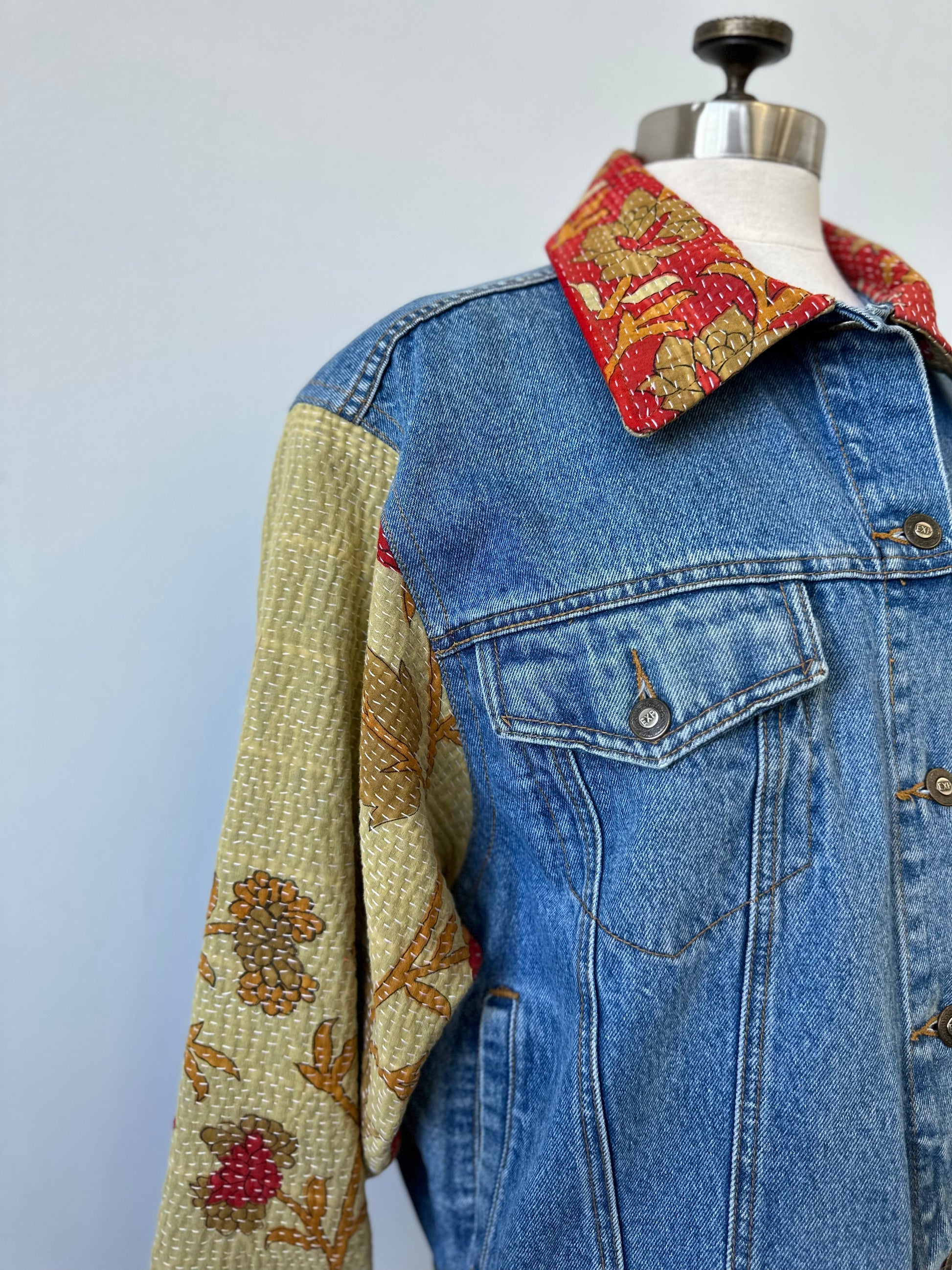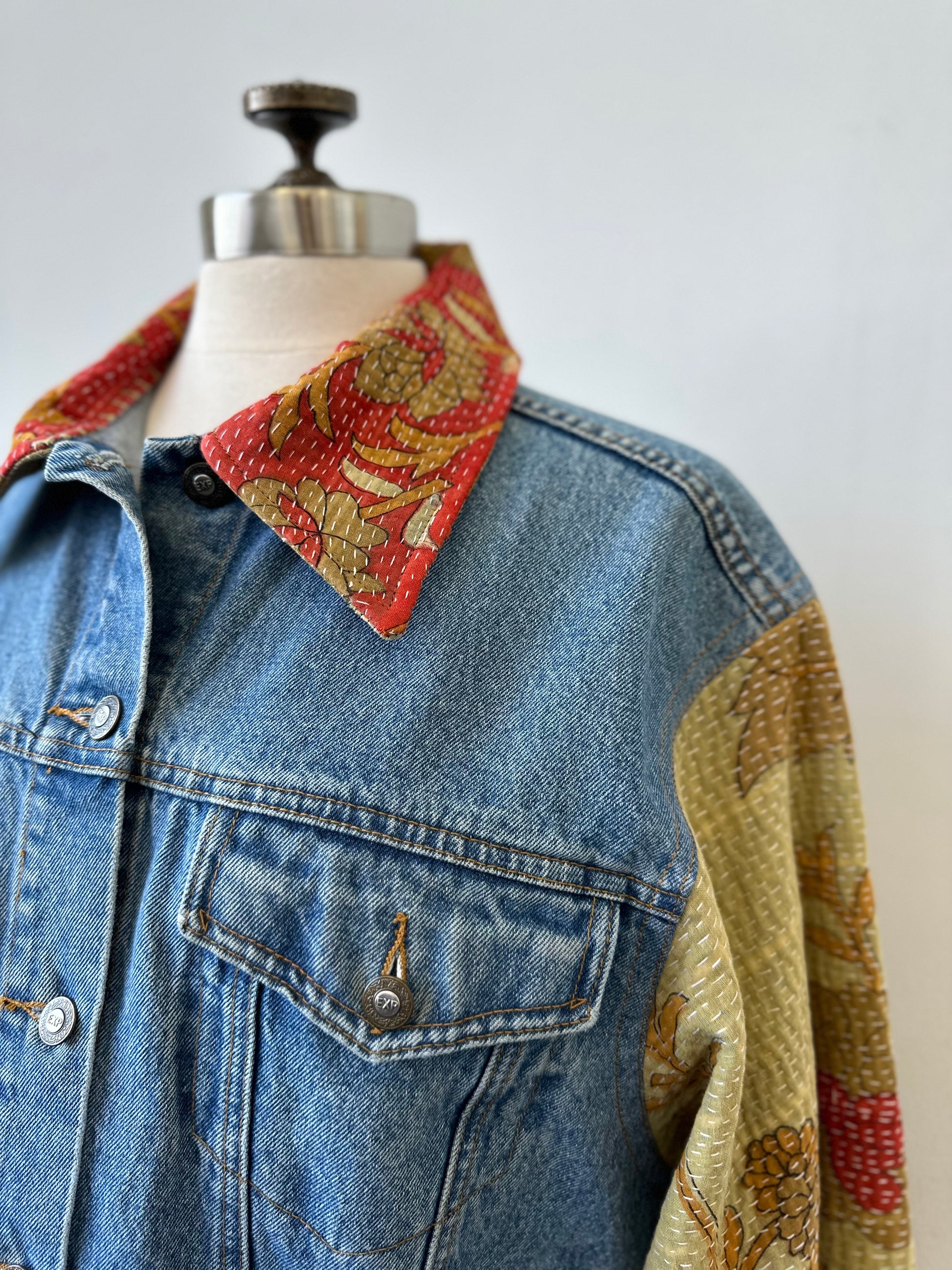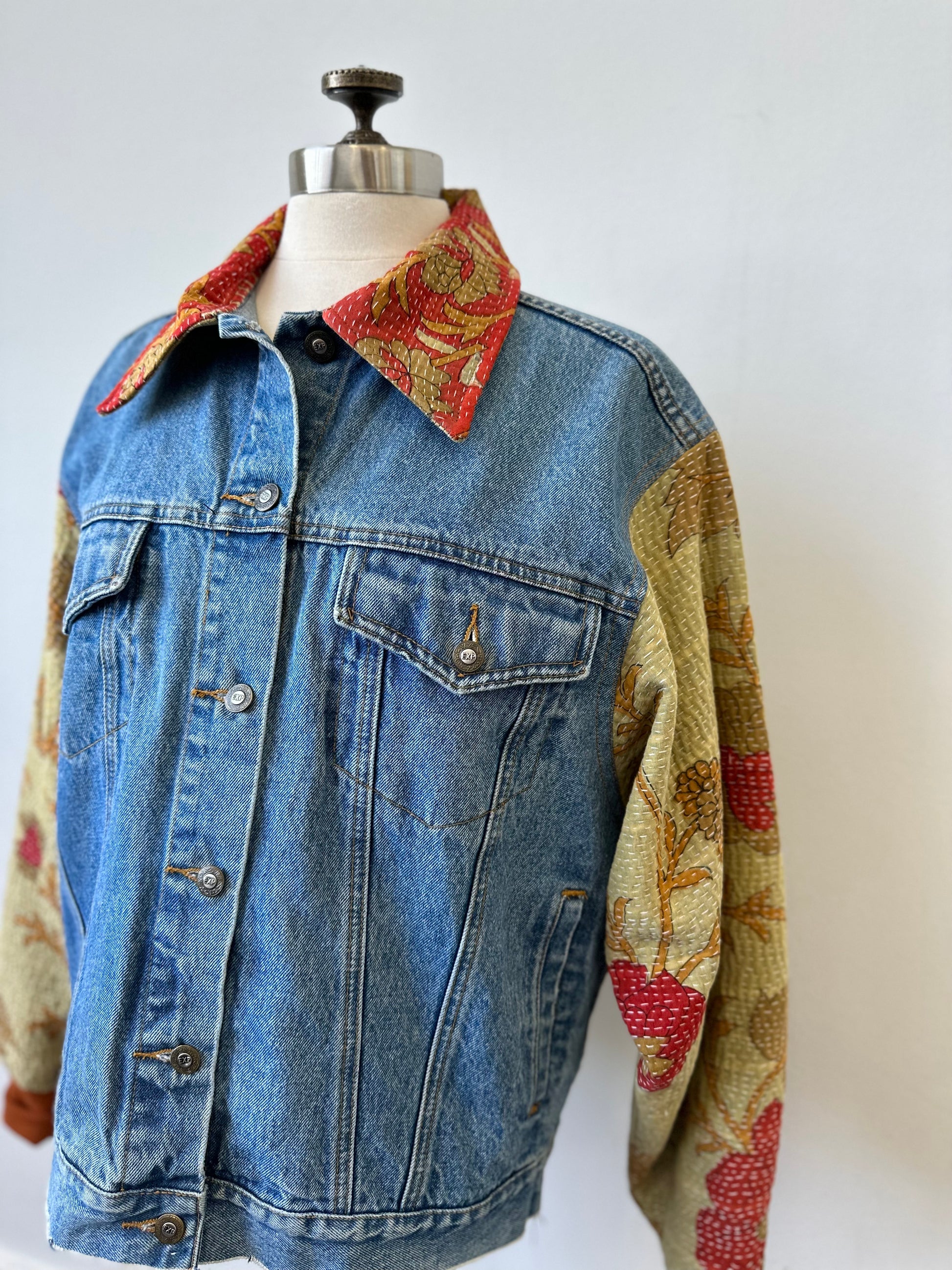 This stylish denim jacket takes upcycling to a whole new level with its unique quilted accents on the sleeves and collar. Stand out from the crowd with this one-of-a-kind piece, crafted from contrasting fabrics and perfect for the fashion-forward!