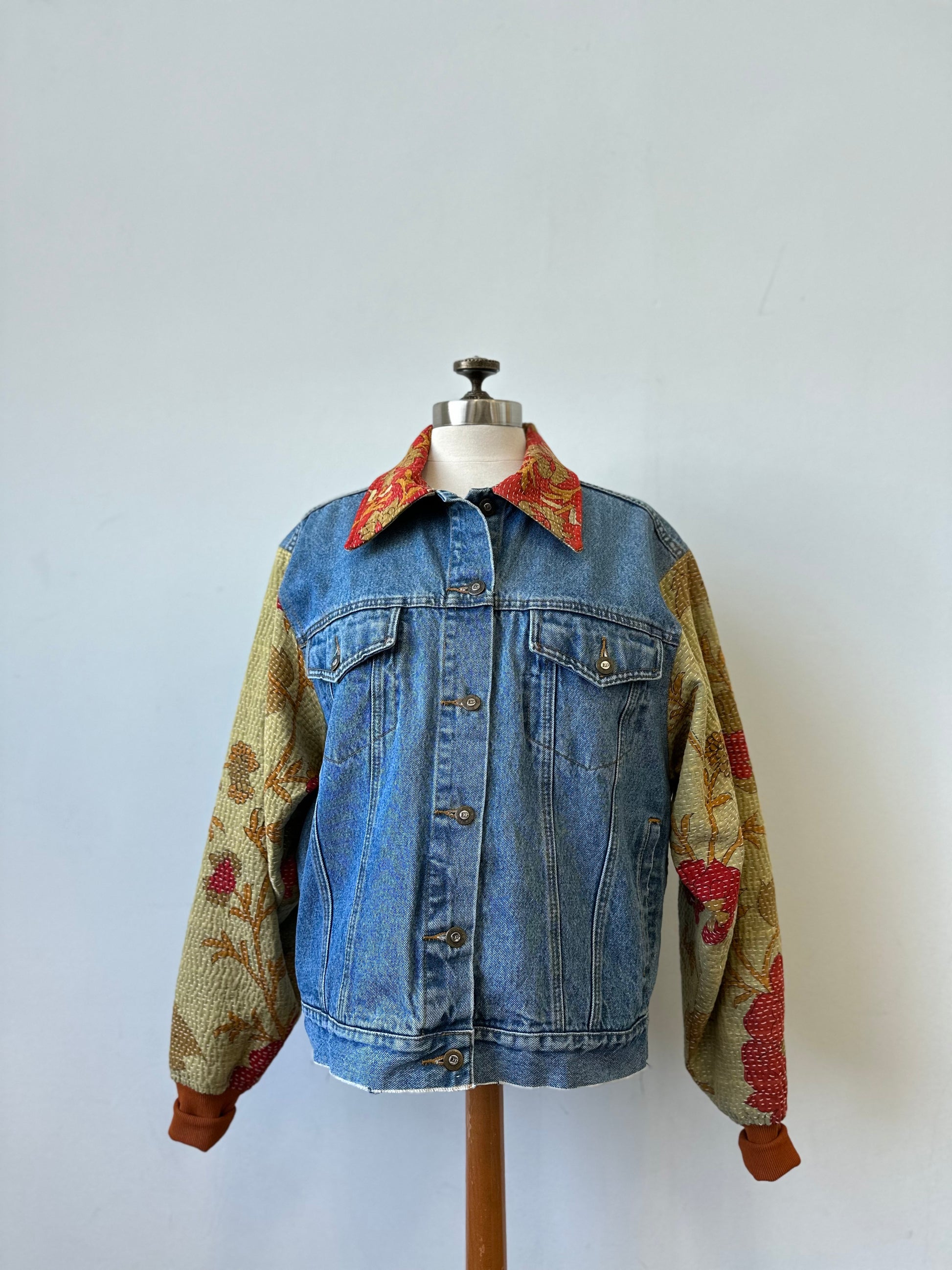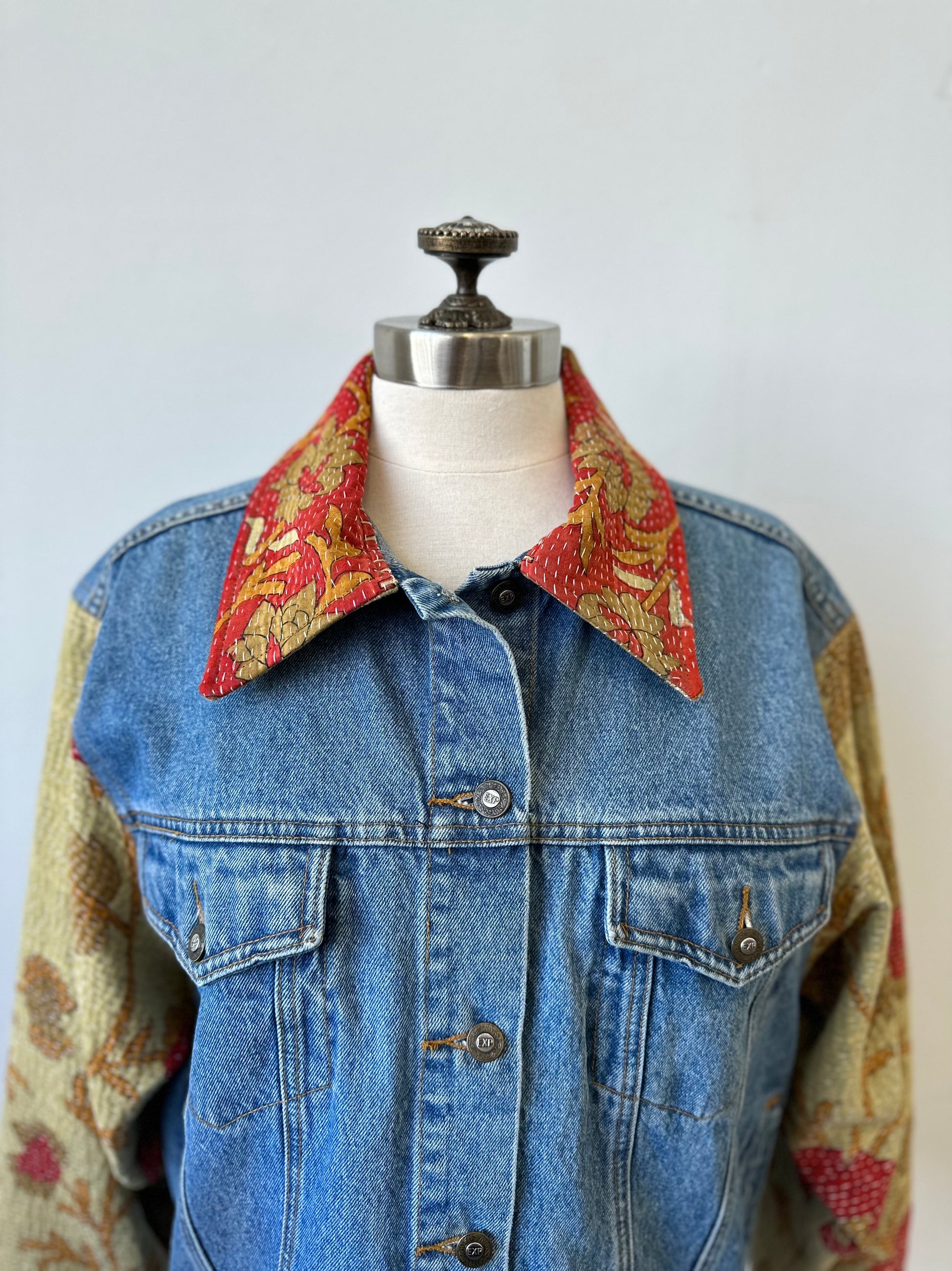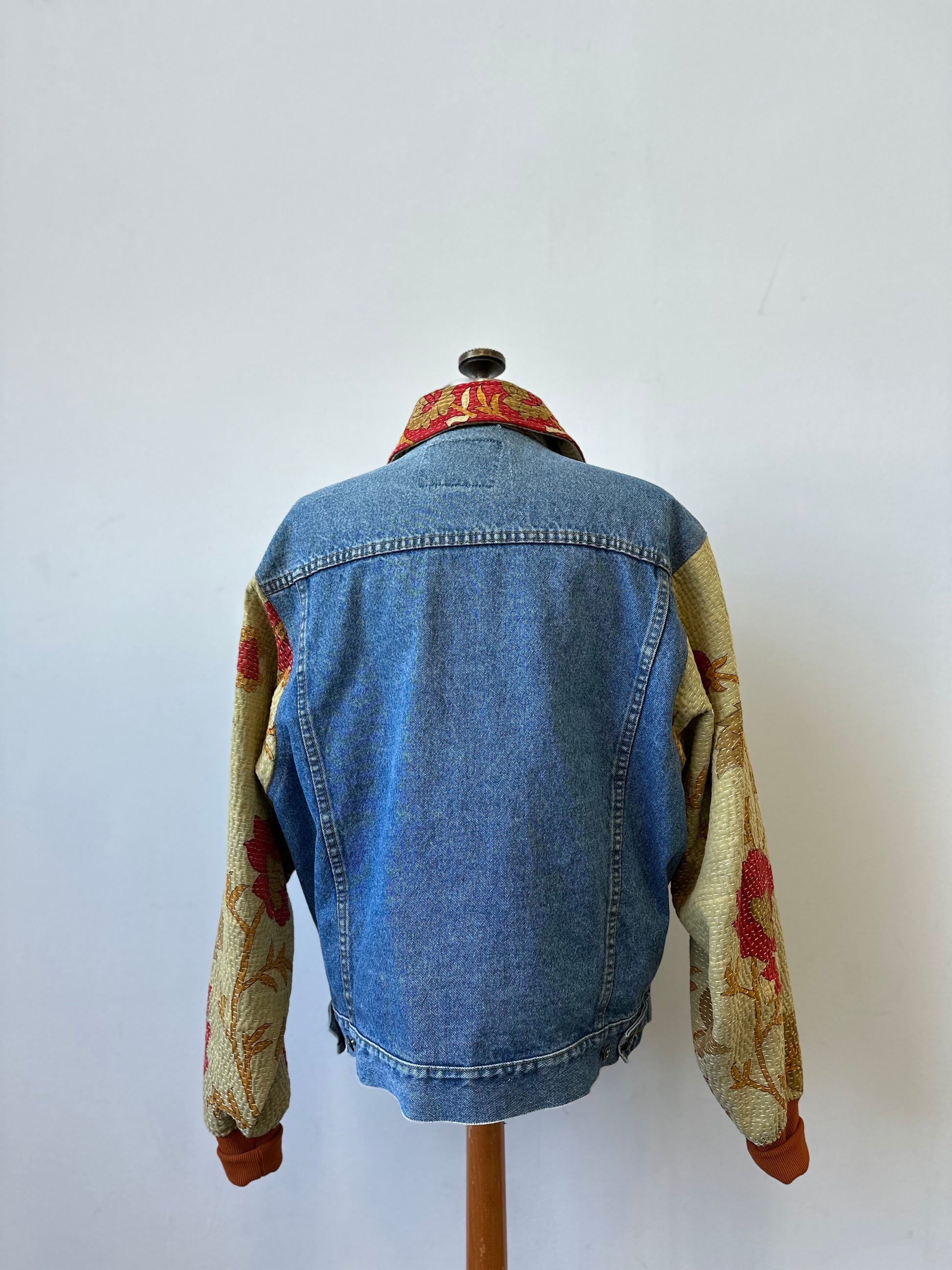 This stylish denim jacket takes upcycling to a whole new level with its unique quilted accents on the sleeves and collar. Stand out from the crowd with this one-of-a-kind piece, crafted from contrasting fabrics and perfect for the fashion-forward!