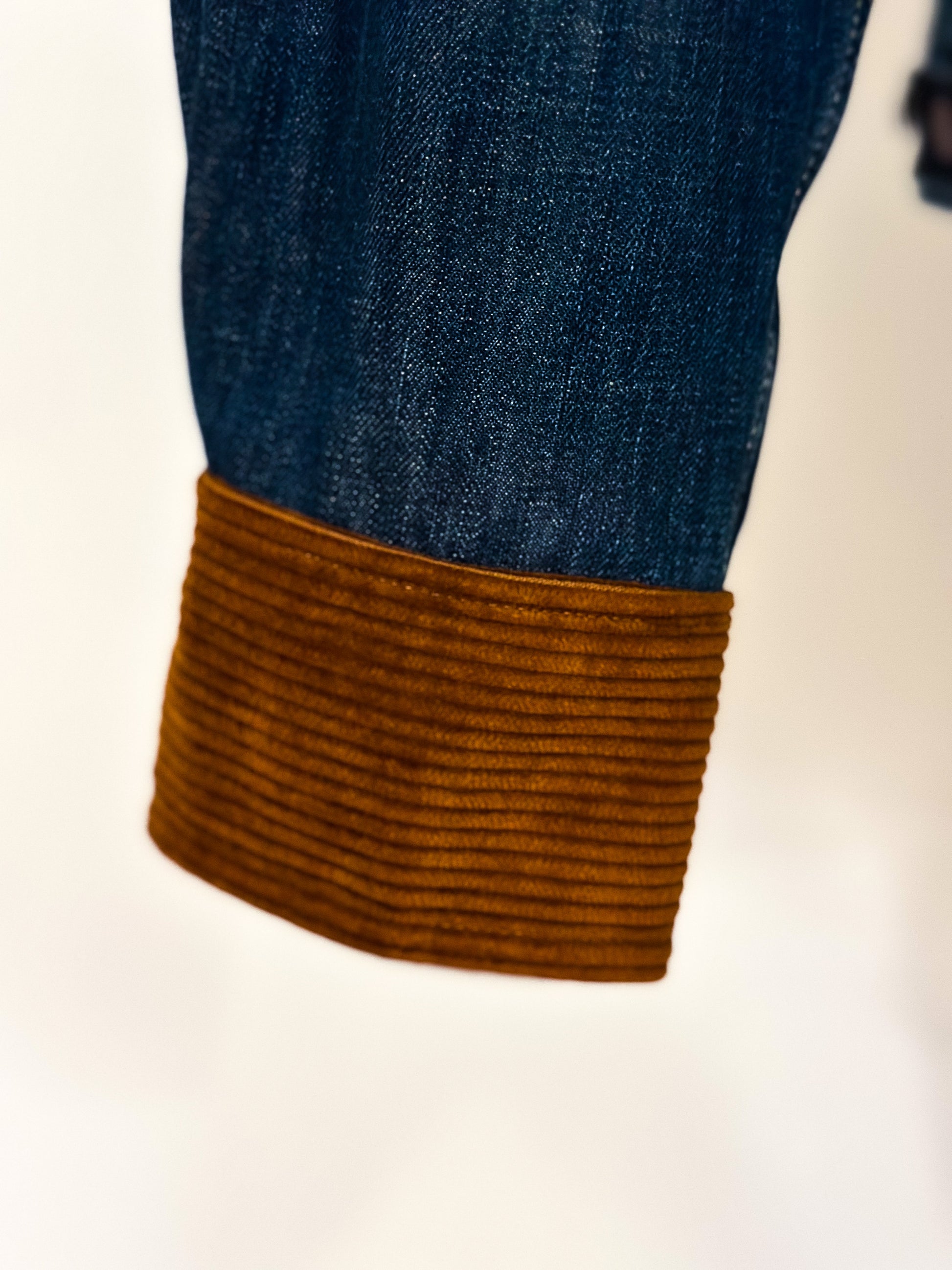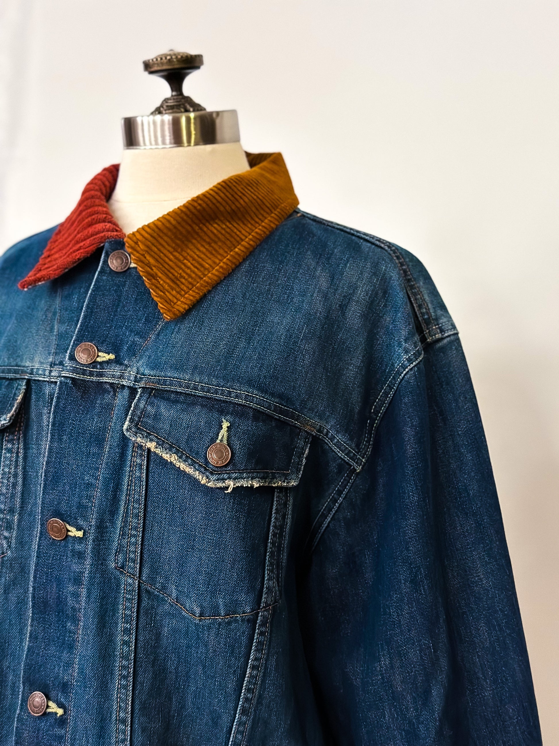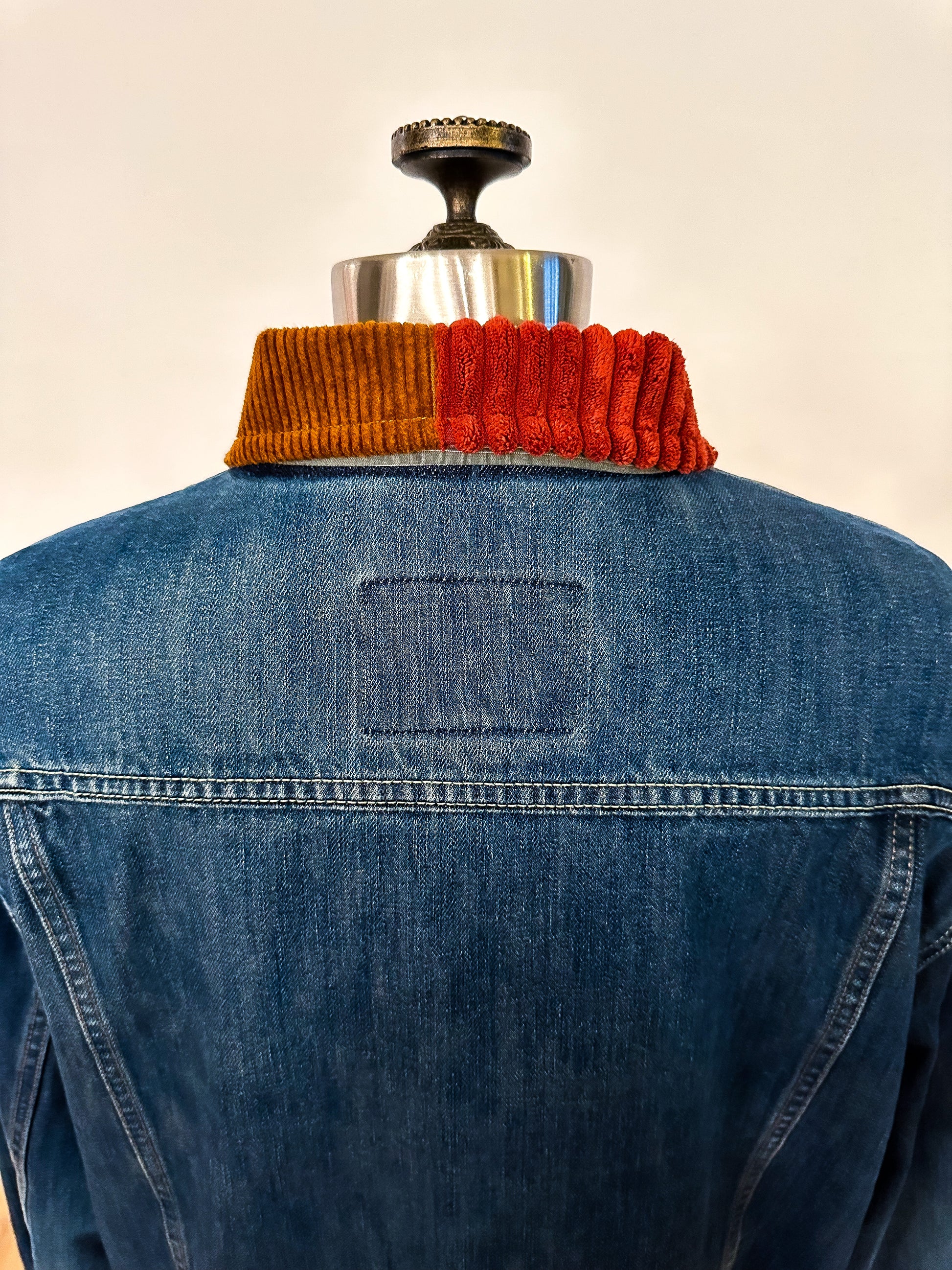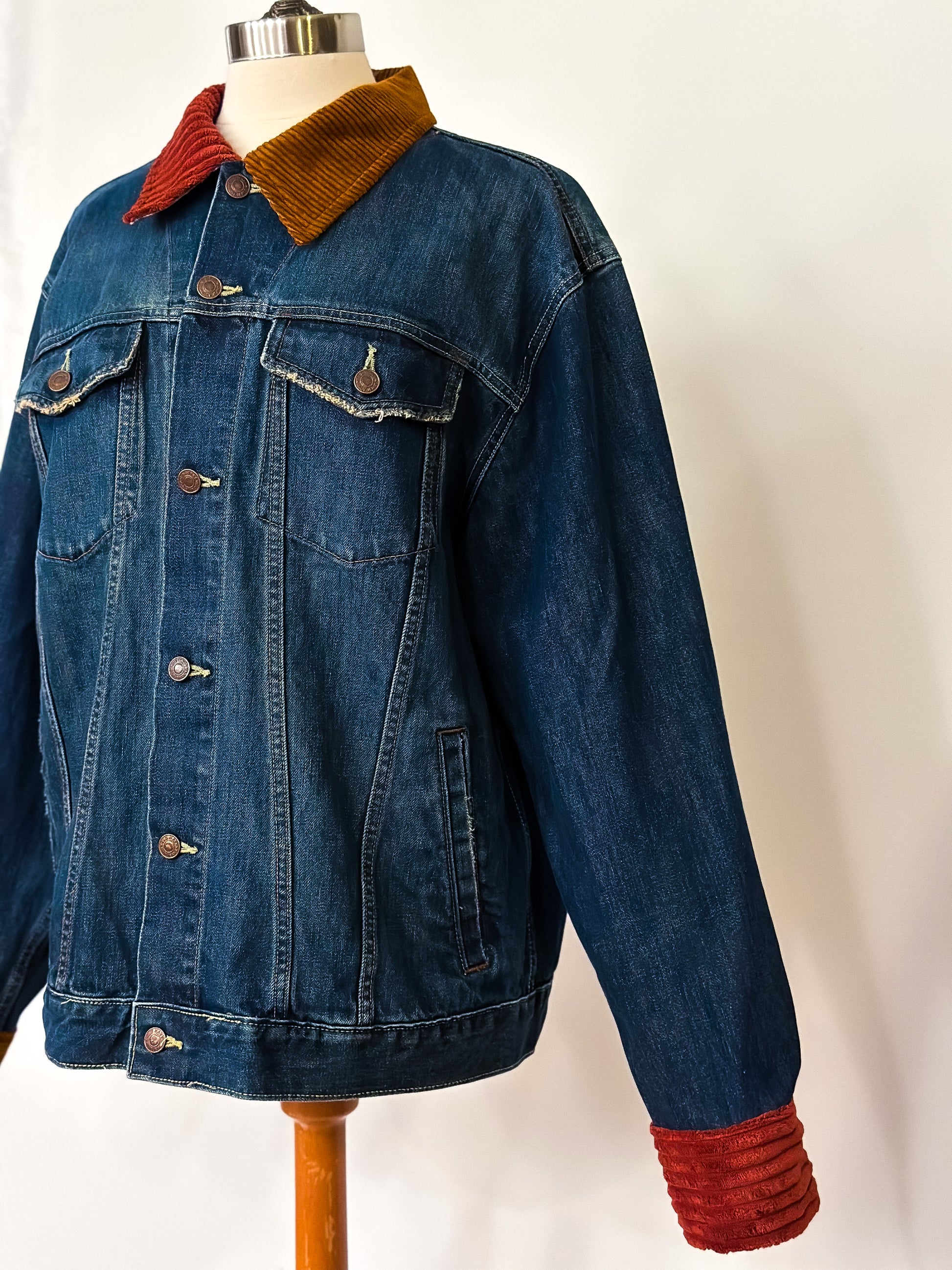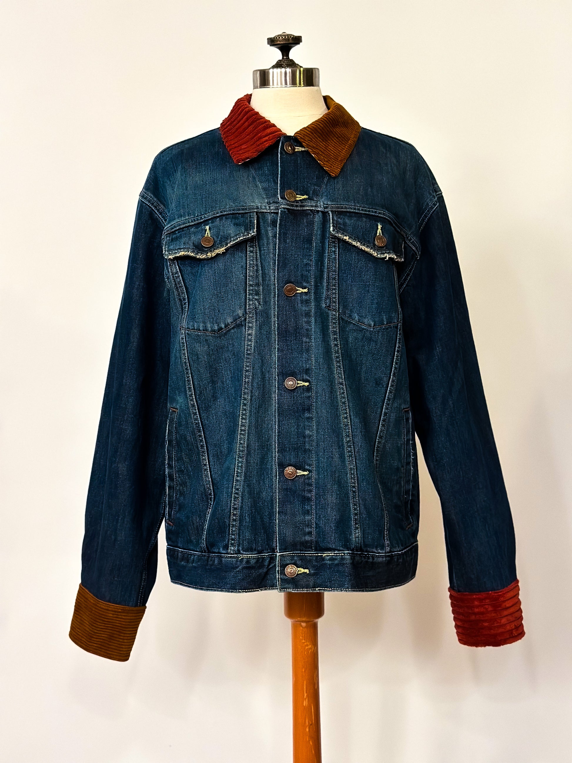 Be fashion-forward in this upcycled classic denim jacket featuring a two-toned corduroy collar and sleeve cuffs. This unique piece will elevate your wardrobe all year round!