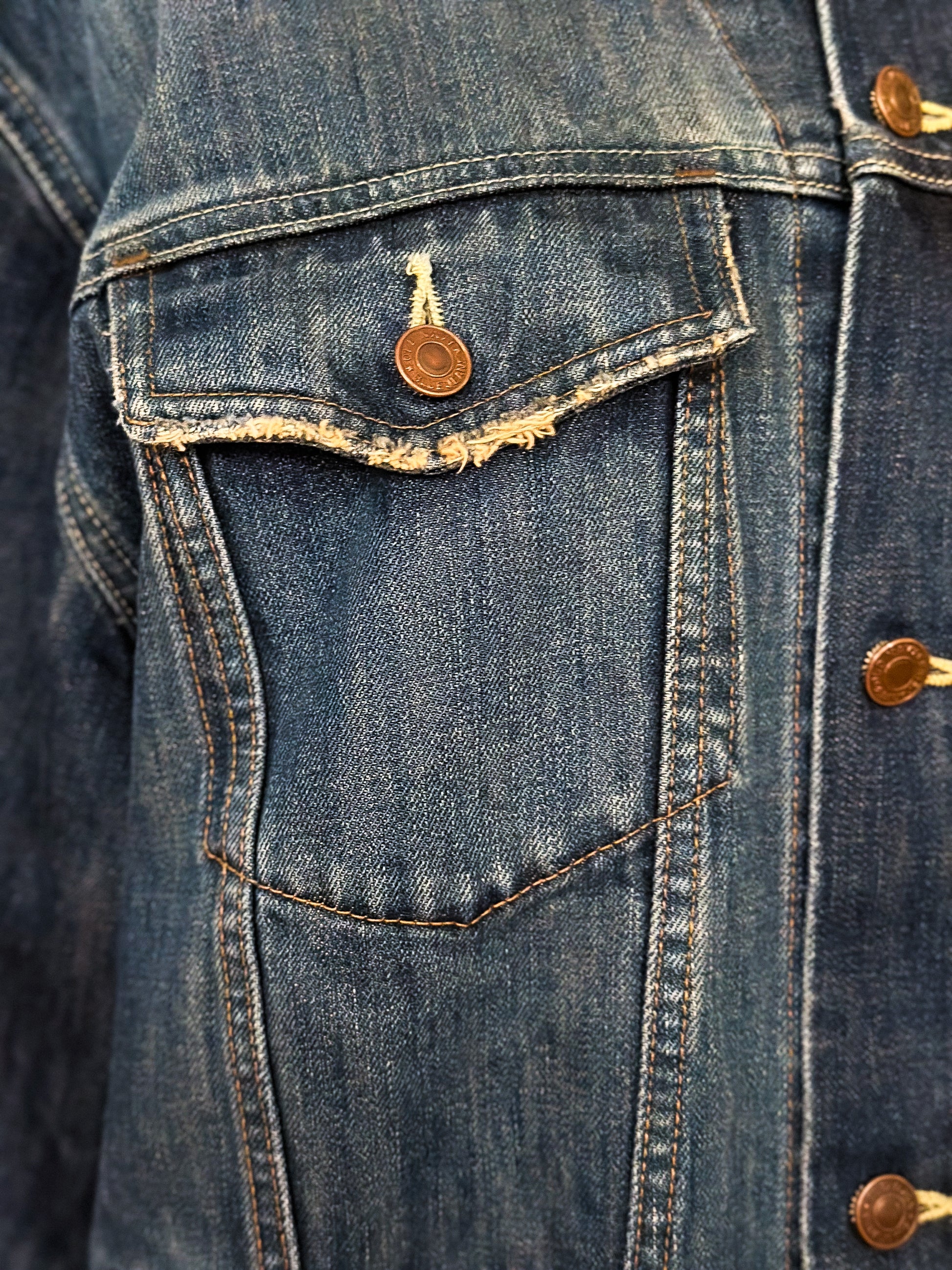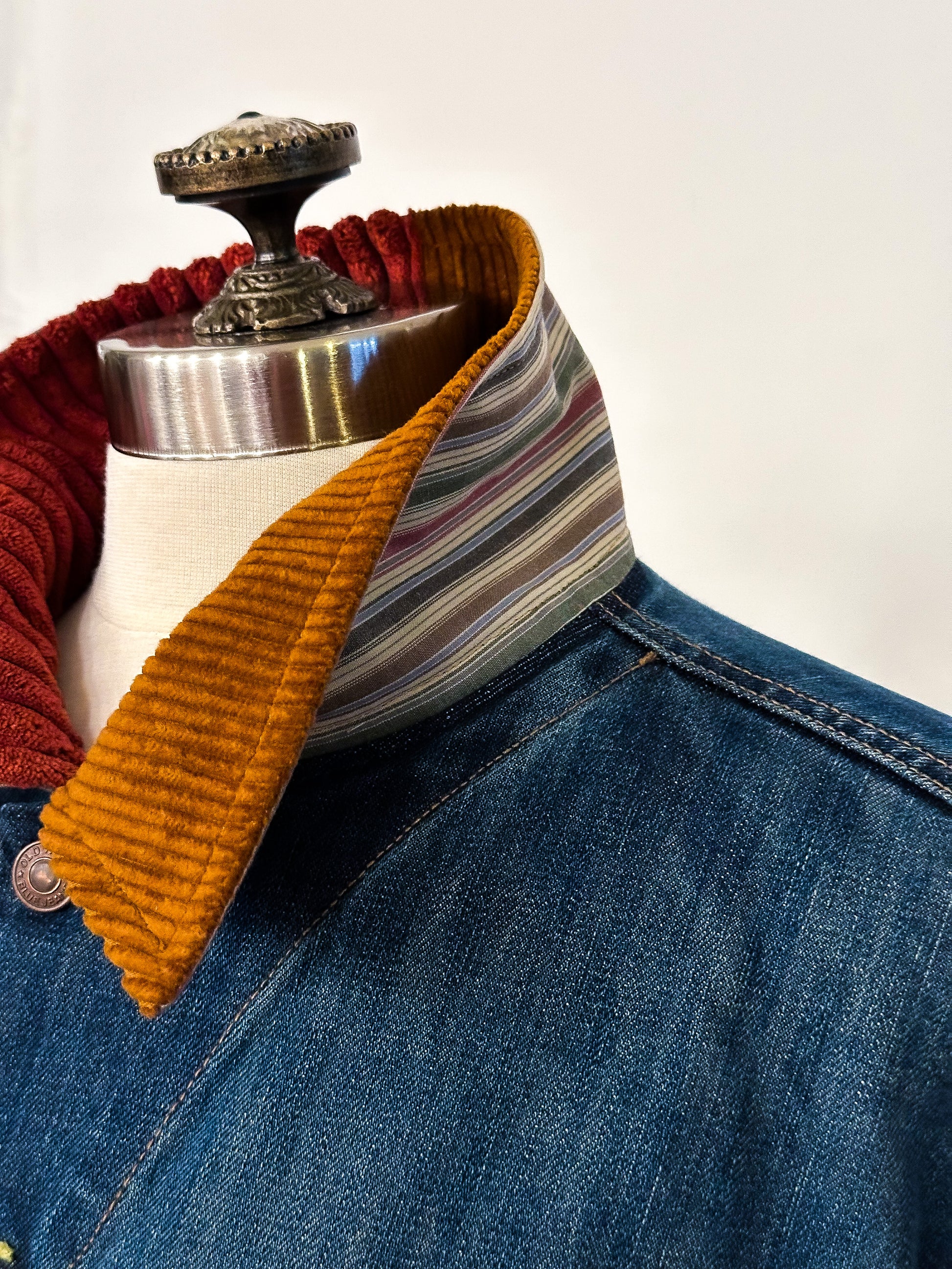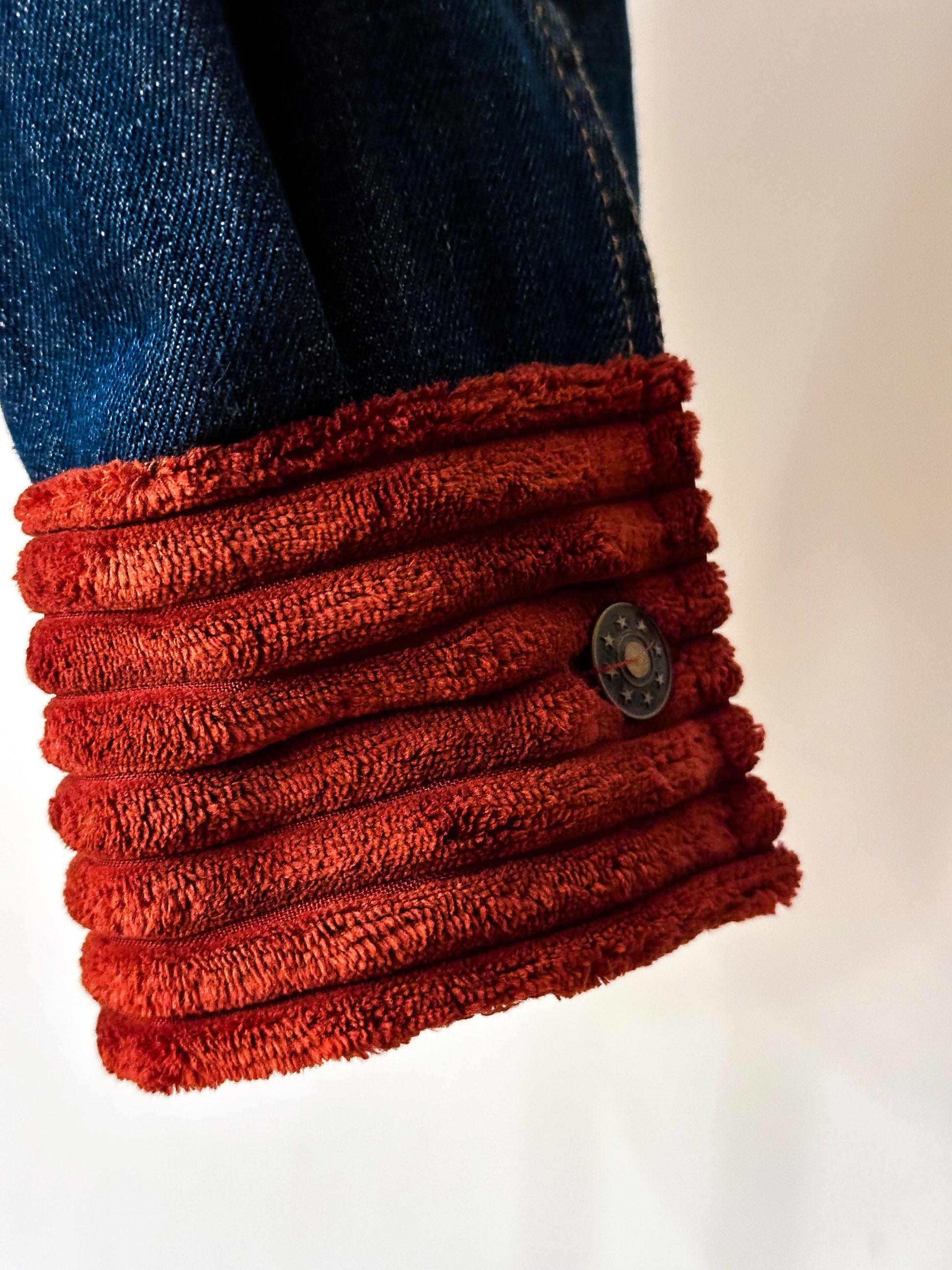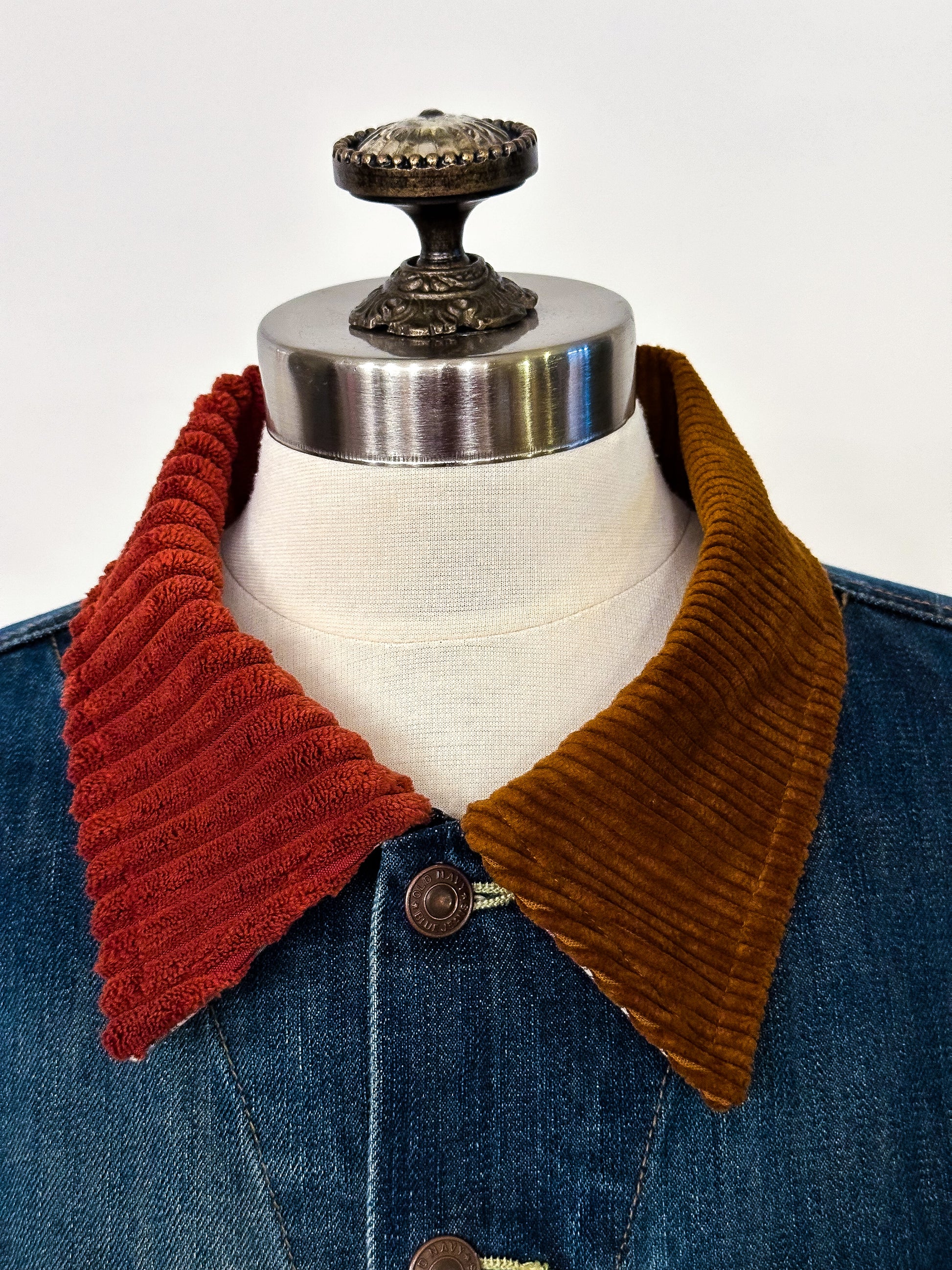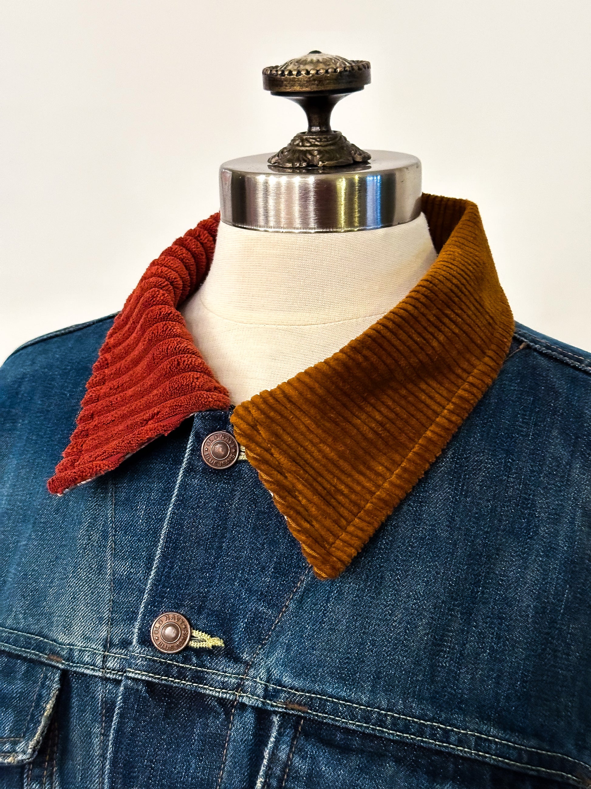 Be fashion-forward in this upcycled classic denim jacket featuring a two-toned corduroy collar and sleeve cuffs. This unique piece will elevate your wardrobe all year round!