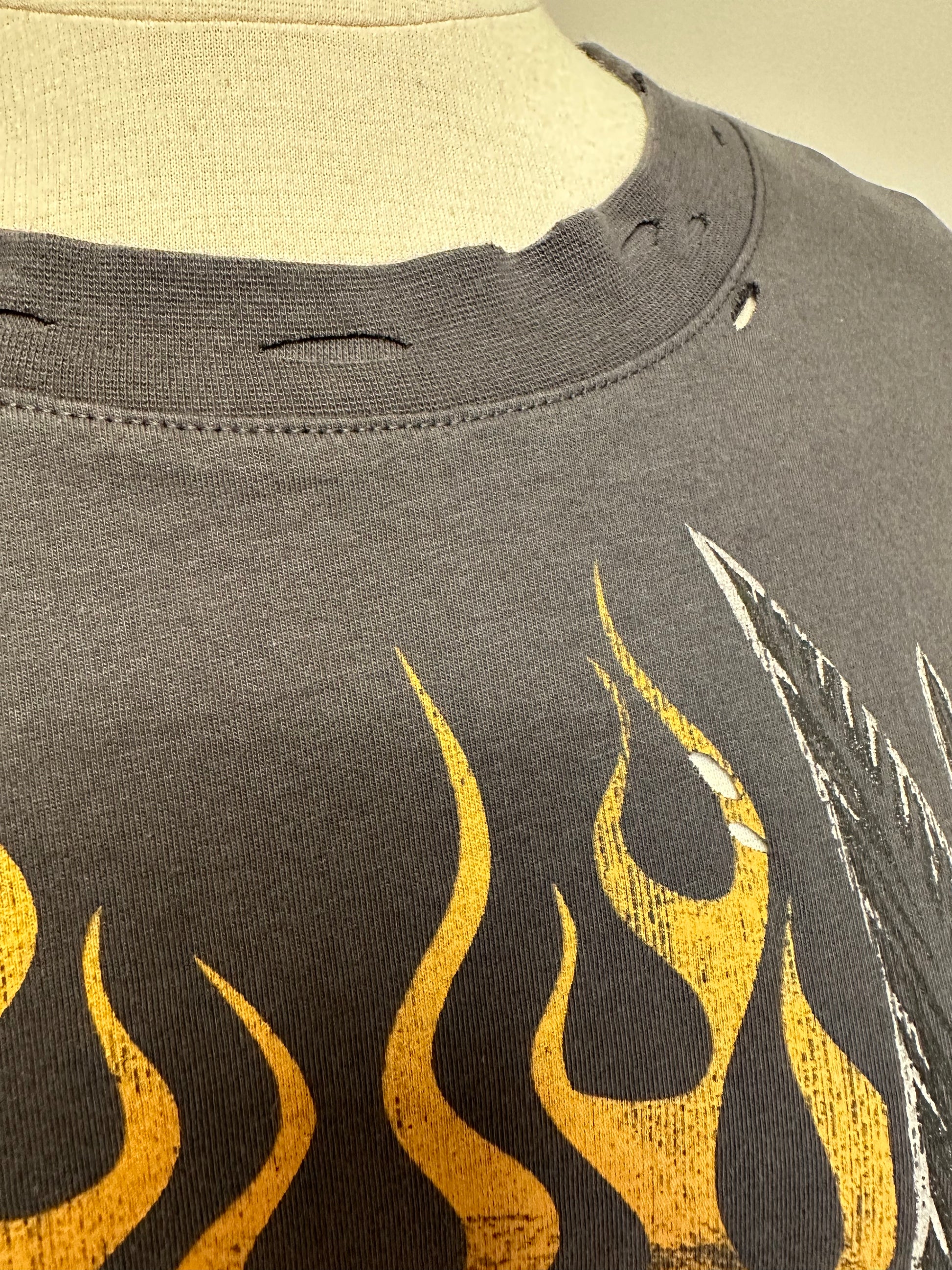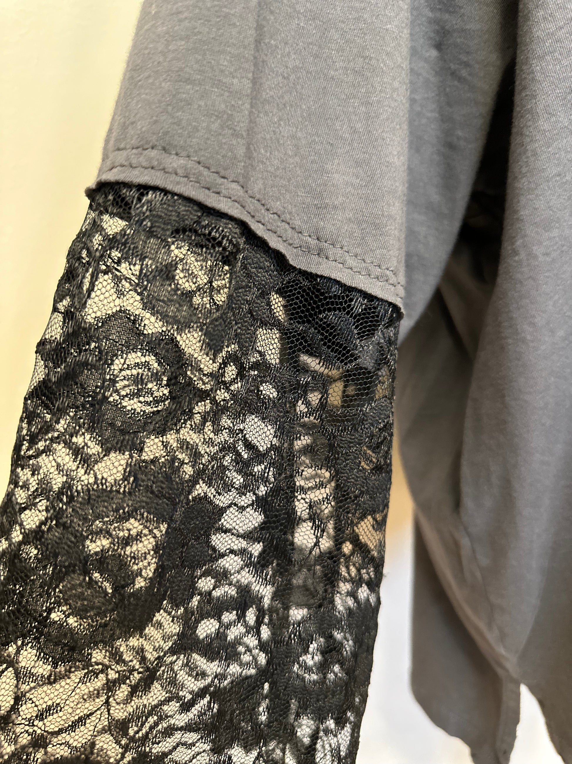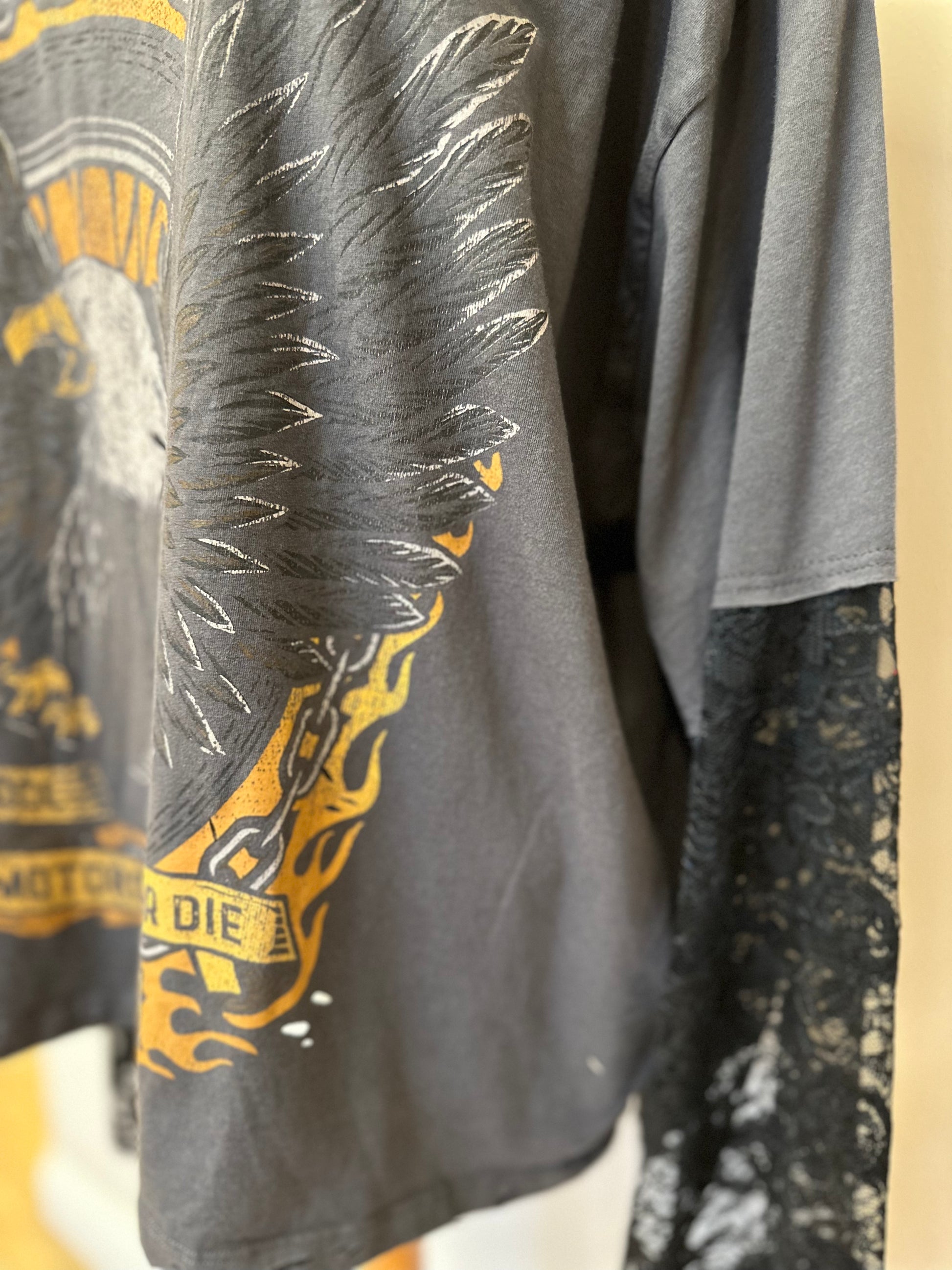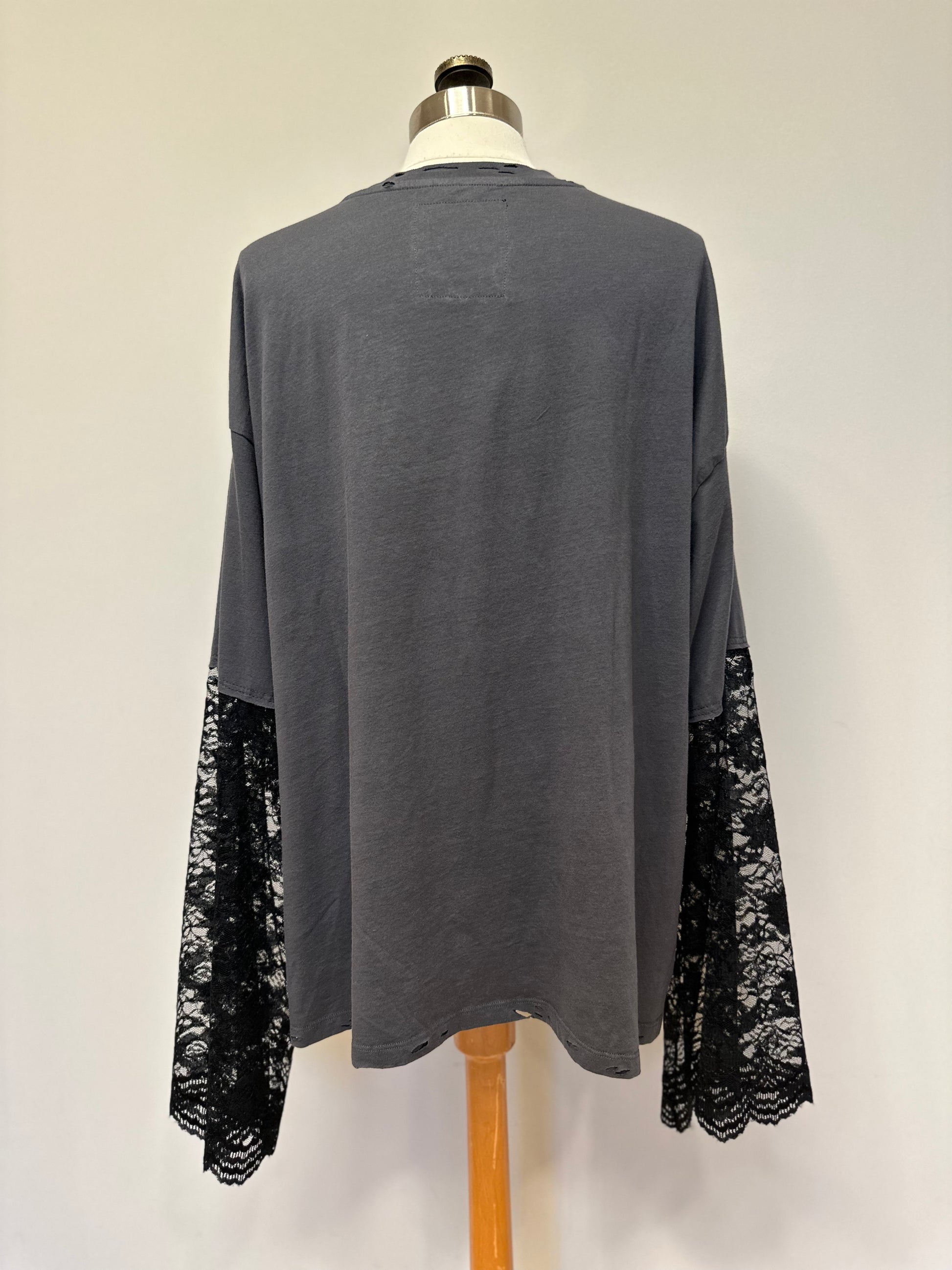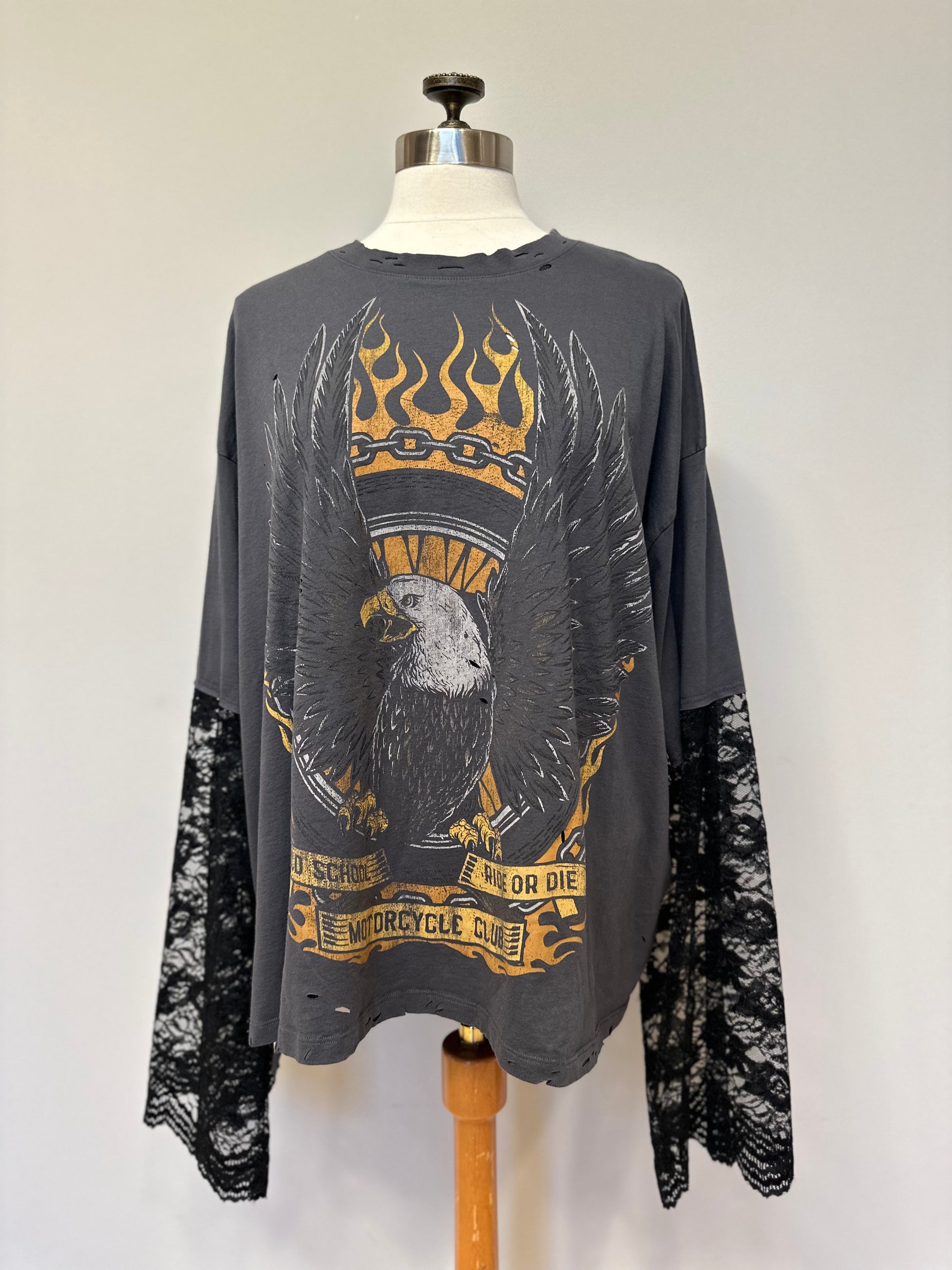 Super Oversized Tee with a cool moto graphic on the front. Featuring an attached lace sleeve, designed to be extra long for an edgy vibe. Slight distressing throughout. Fabric is medium weight, super soft and hangs really well.