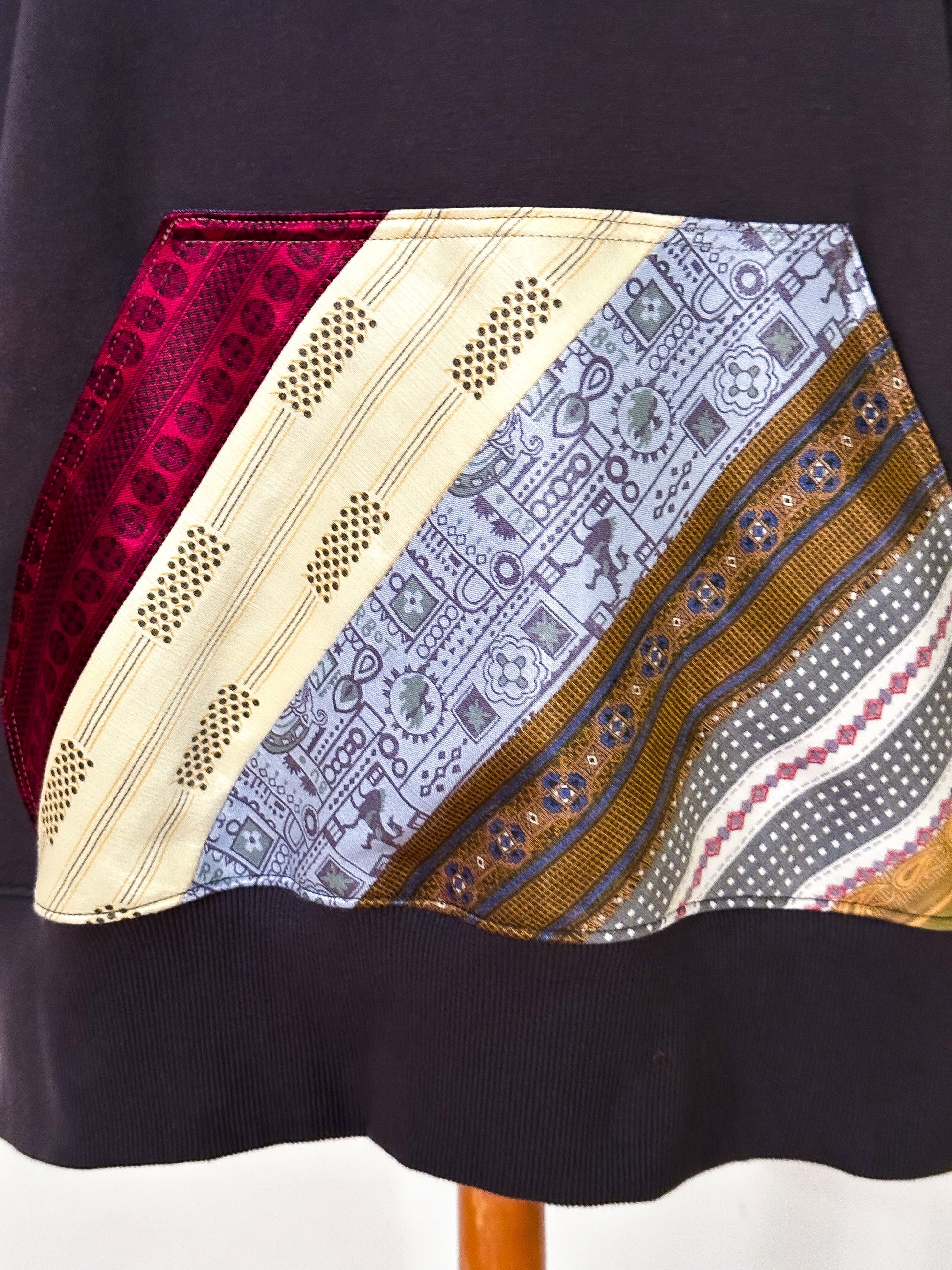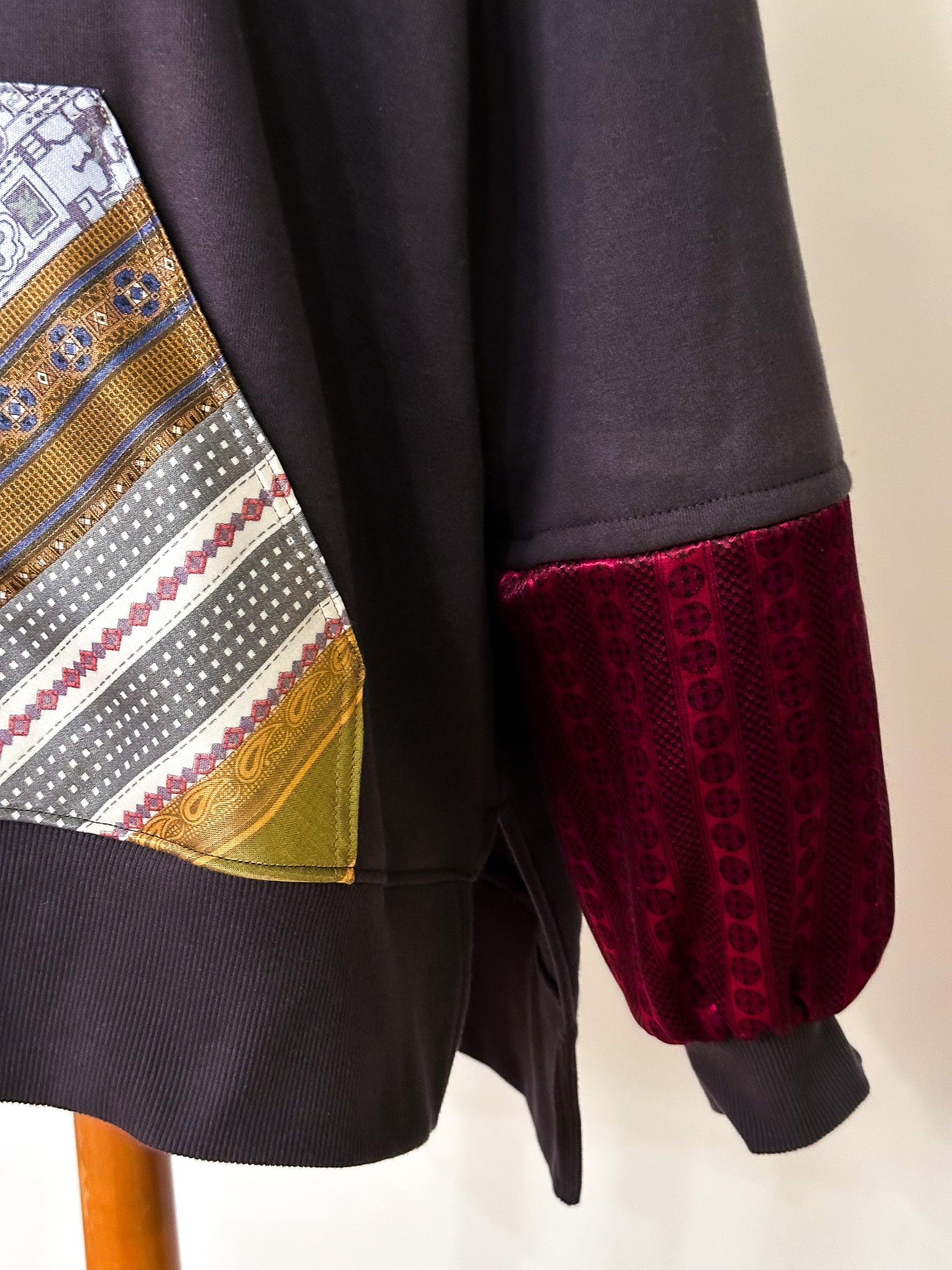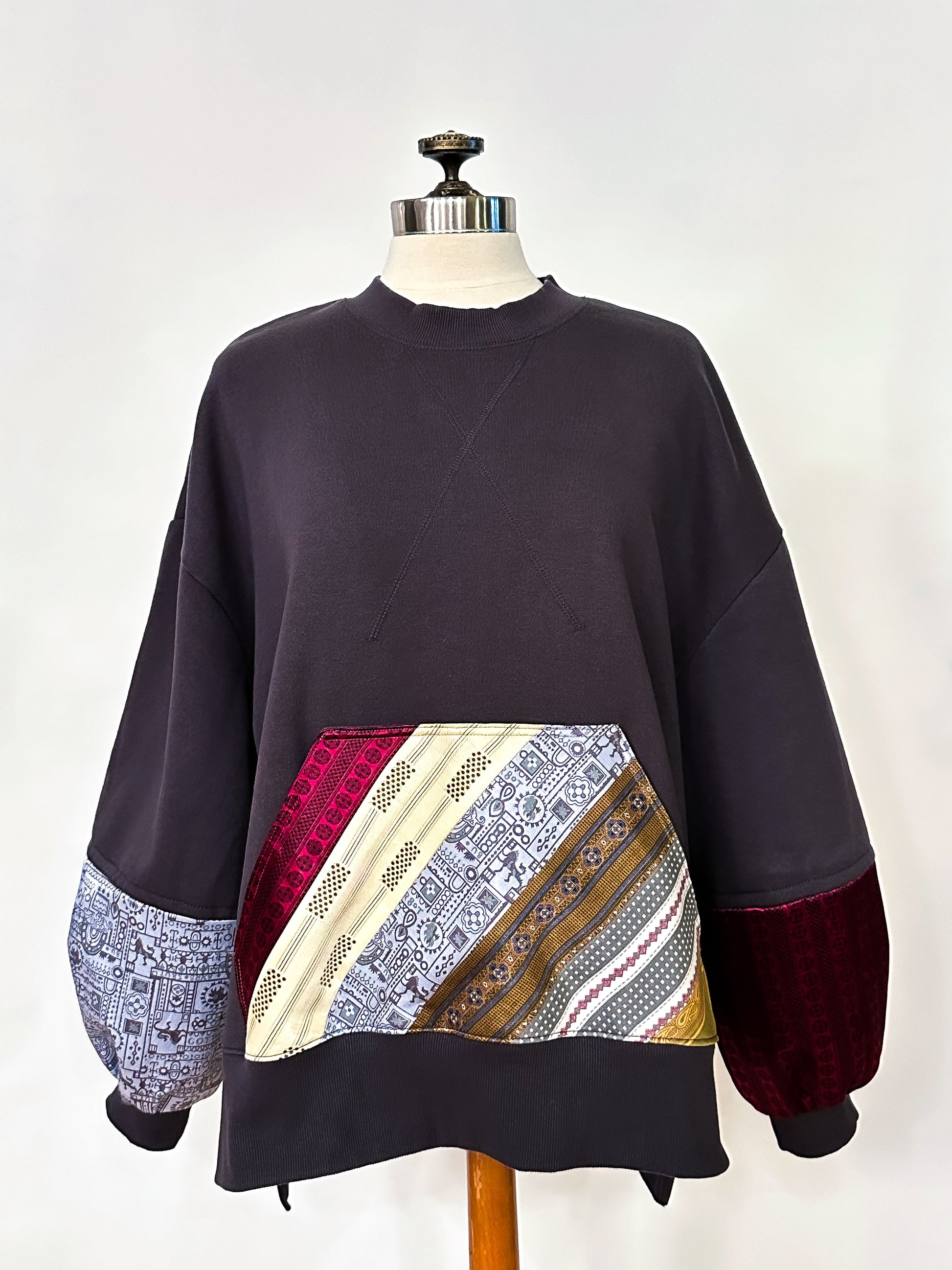Stay warm and look sharp with this upcycled fleece crewneck. Featuring a front pocket and sleeves constructed from vintage pajamas (a fan favorite from The Camo Collection). The perfect way to stay cozy and look great; throw it on and face the day in fashion!