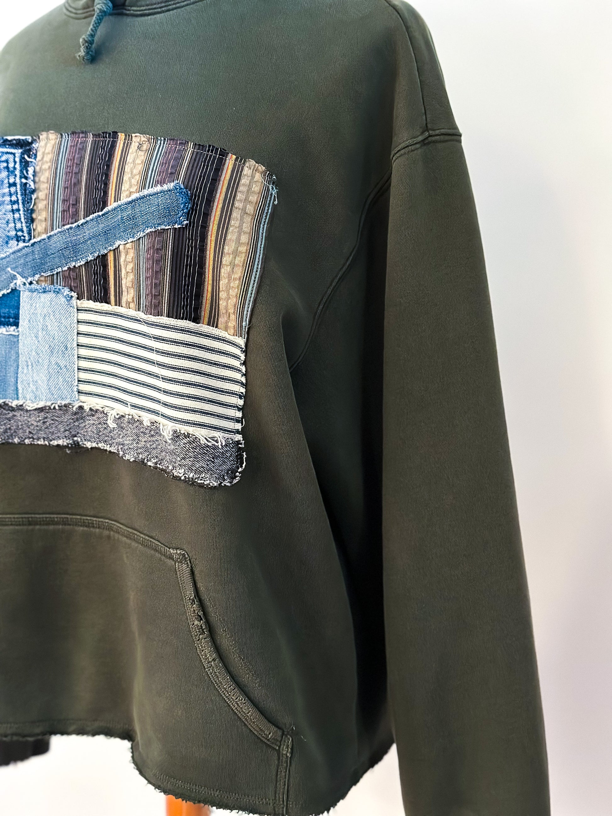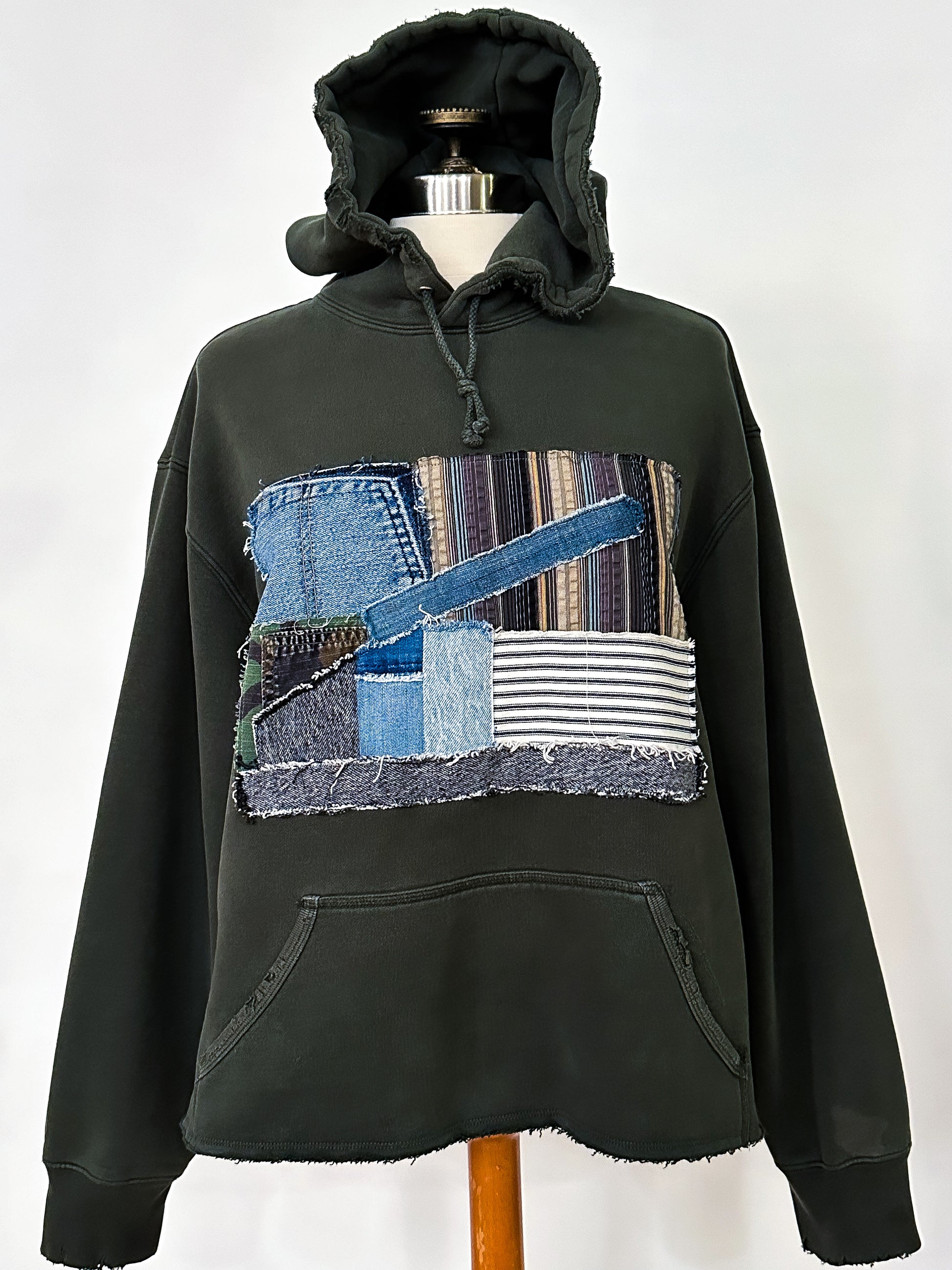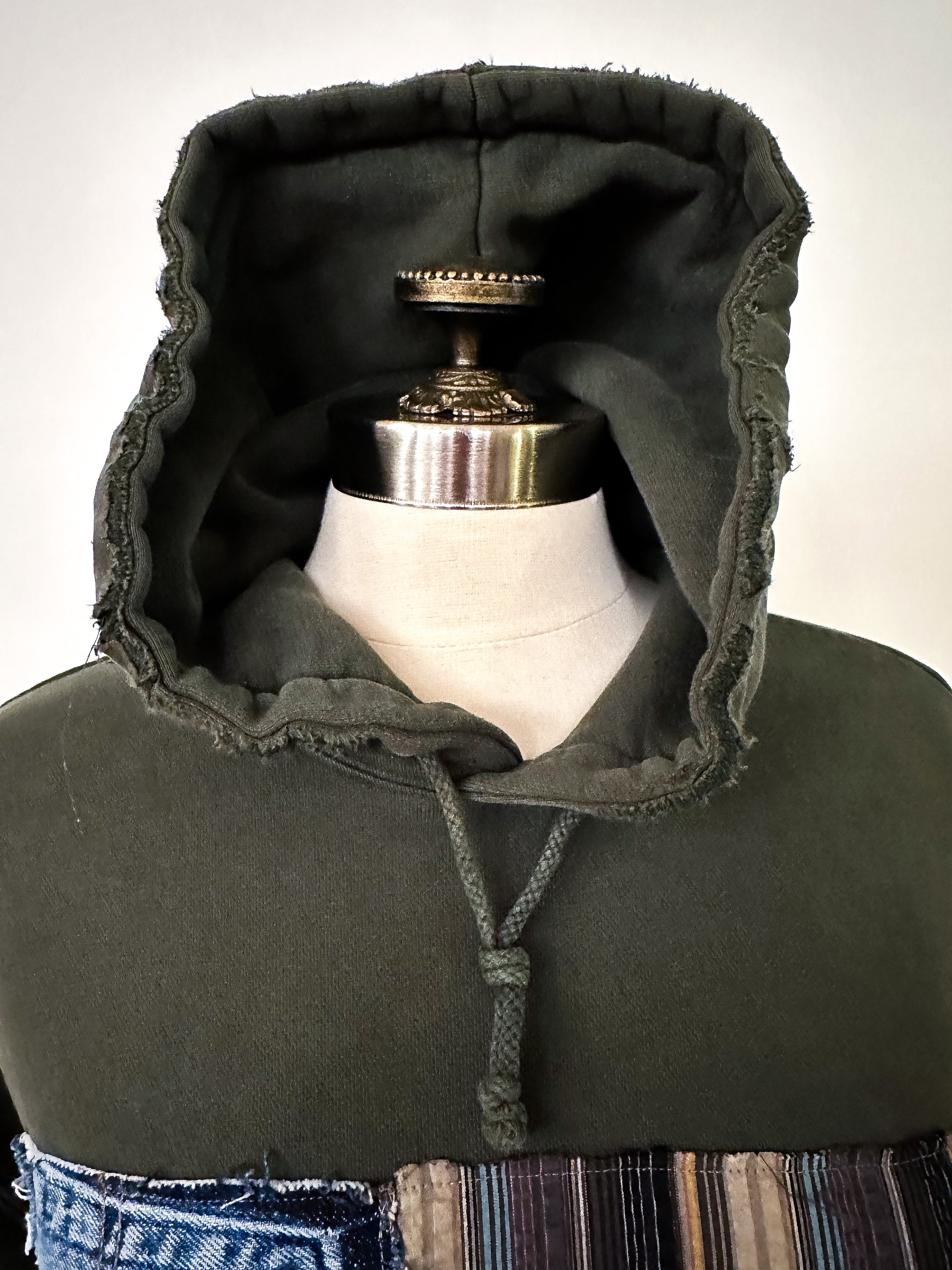 Stay cozy and look cool with this unique upcycled hoodie! Army green fabric is artfully patched with denim for a style that stands out from the crowd. Distressed throughout in a heavyweight knit and raw edge hemline. Whether you're lounging at home or hitting the town, you'll be turning heads!