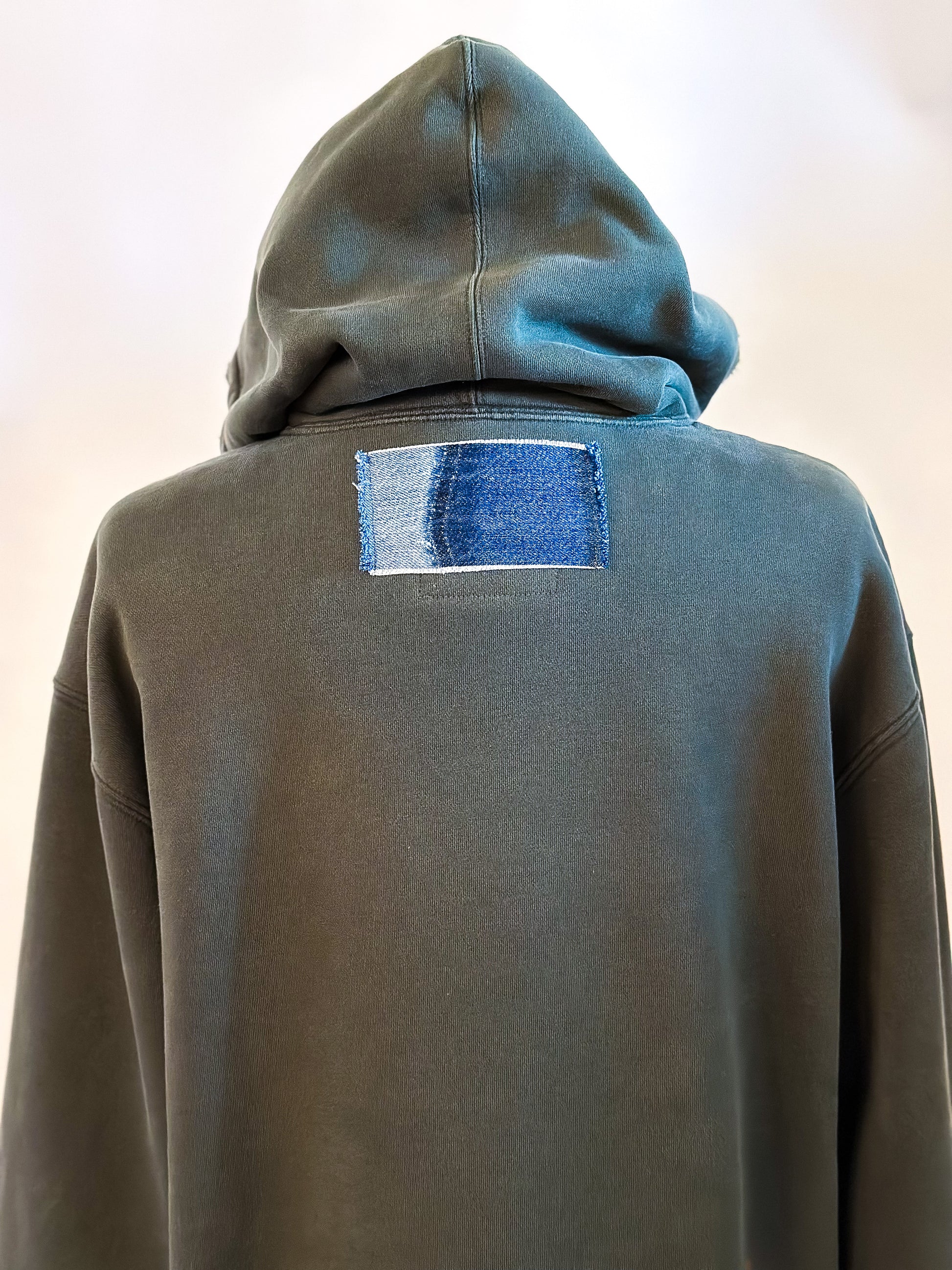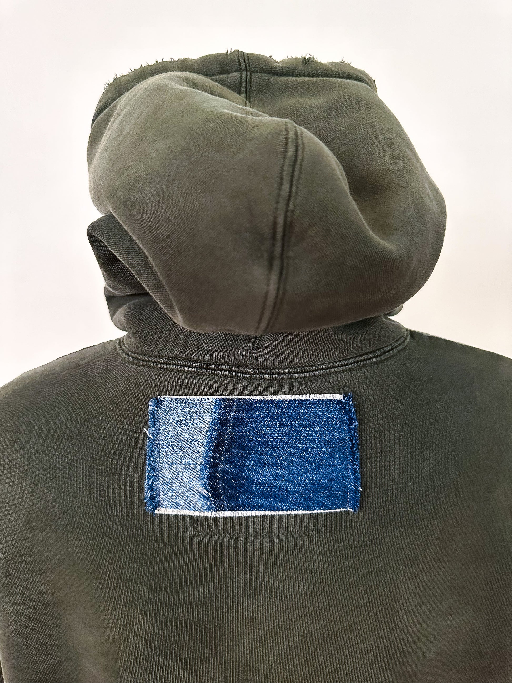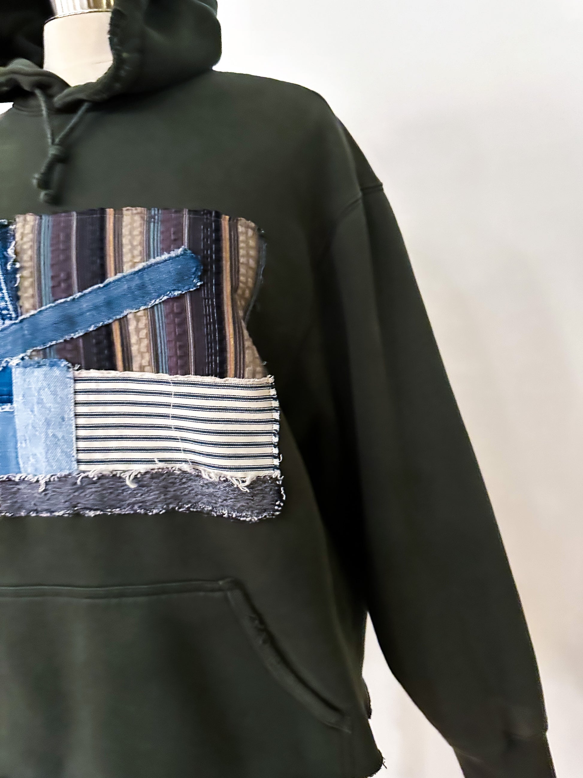 Stay cozy and look cool with this unique upcycled hoodie! Army green fabric is artfully patched with denim for a style that stands out from the crowd. Distressed throughout in a heavyweight knit and raw edge hemline. Whether you're lounging at home or hitting the town, you'll be turning heads!