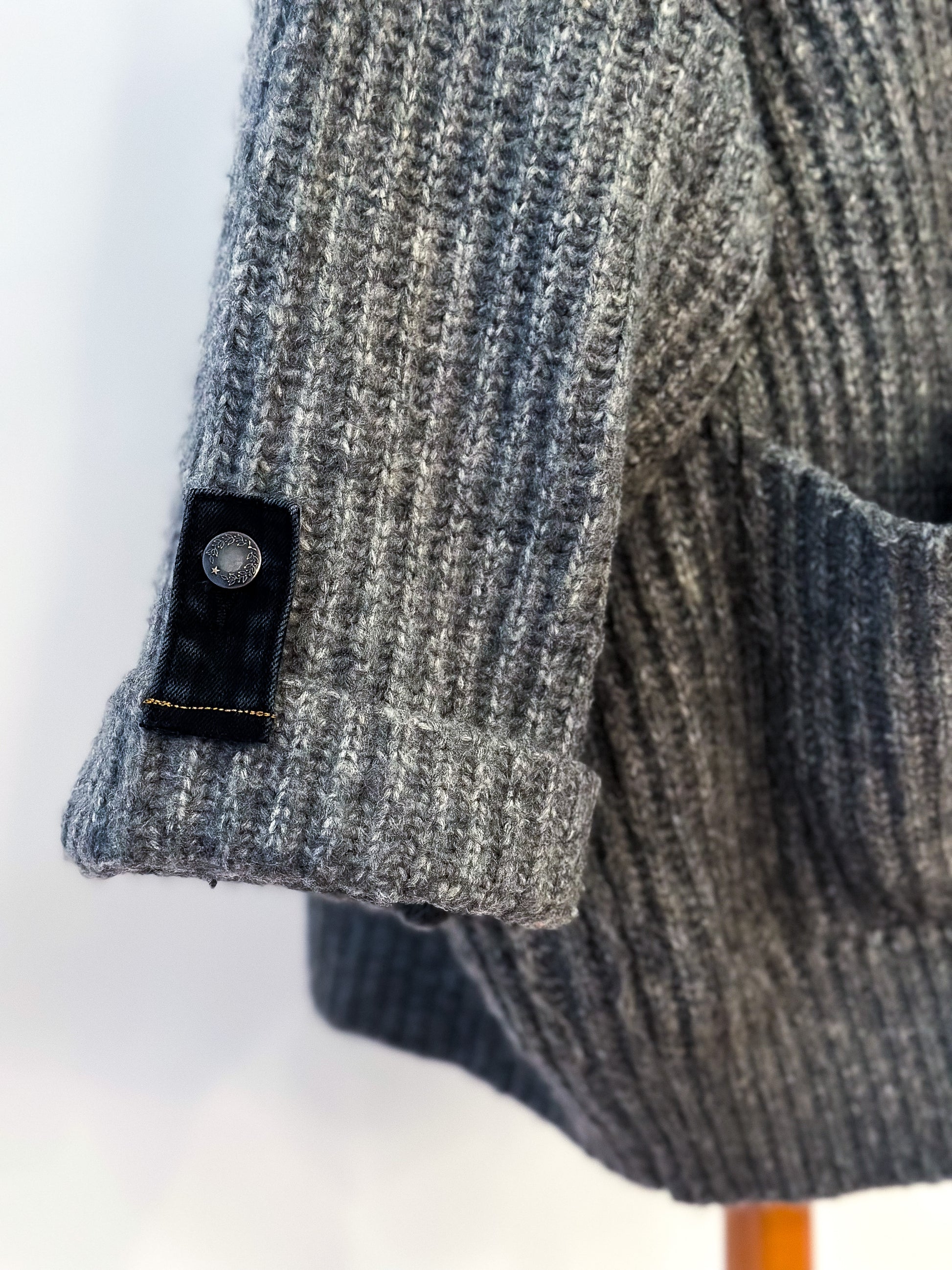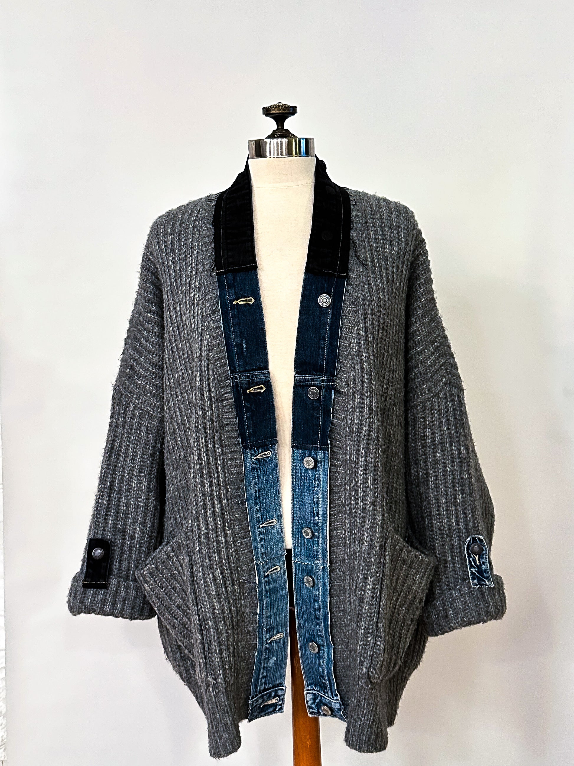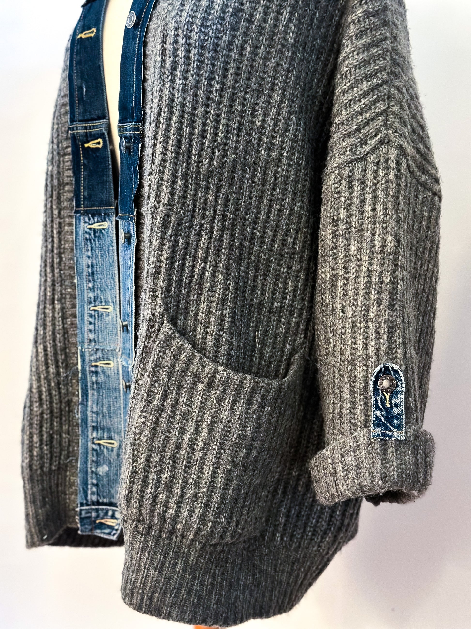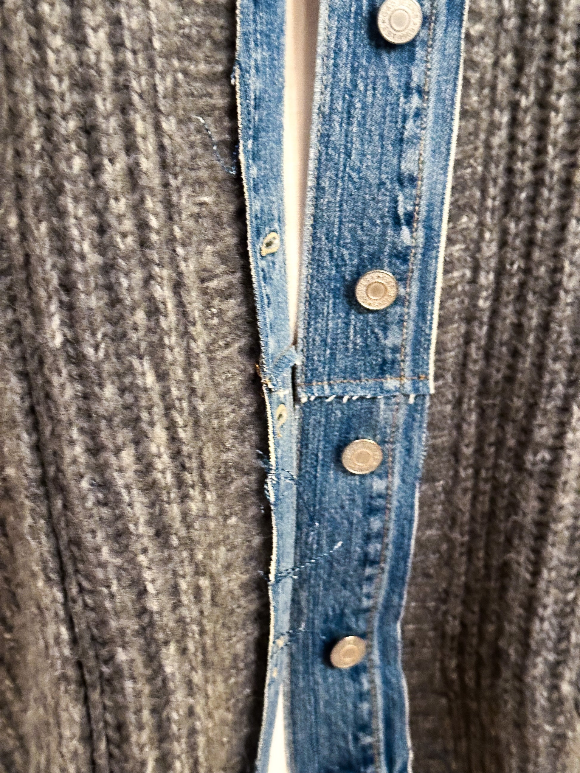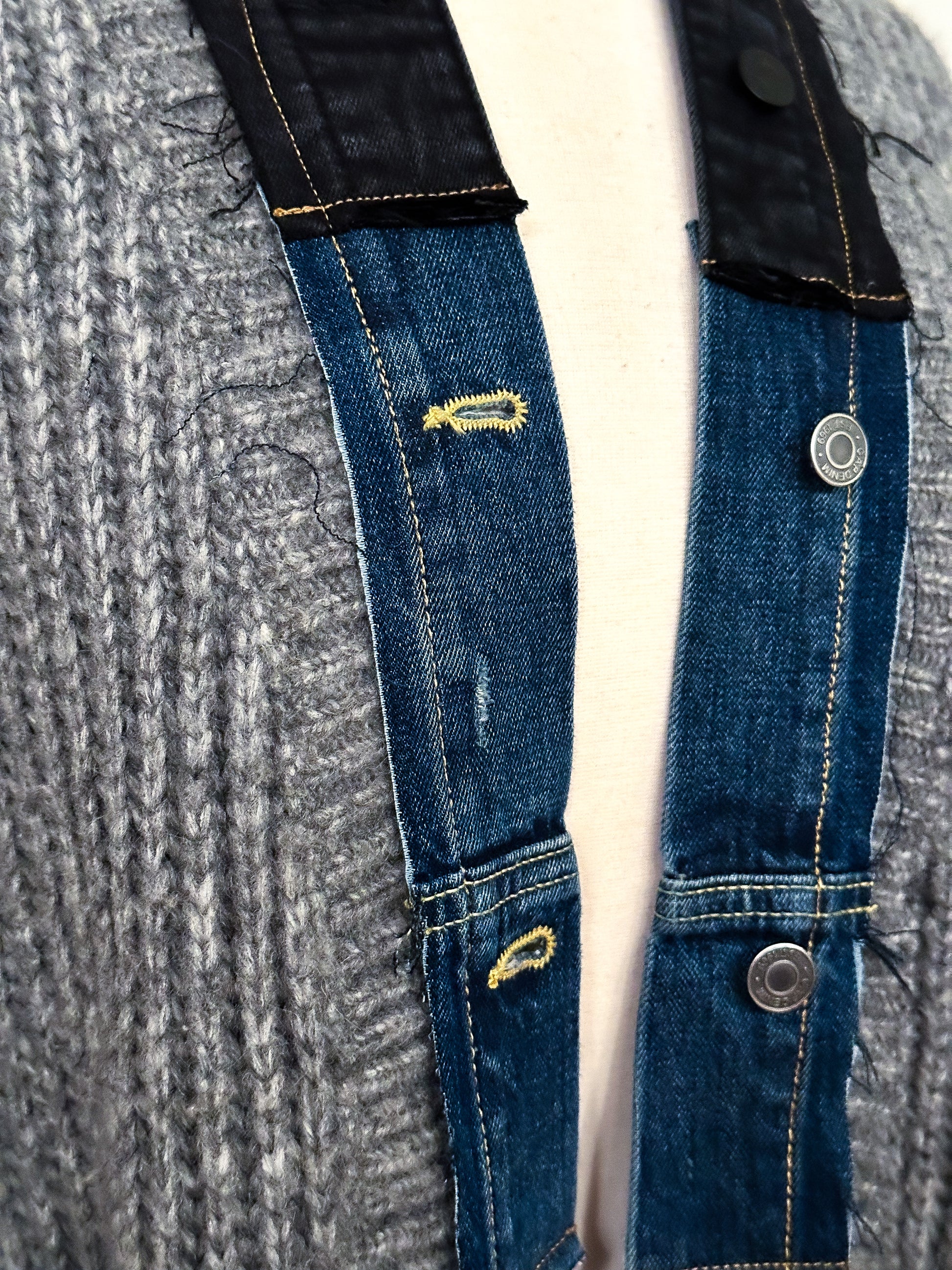 This unique piece features an oversized grey sweater and collar constructed from multiple denim jackets. Stand out from the crowd while still staying cozy and warm. Elevate your style with this one-of-a-kind look!