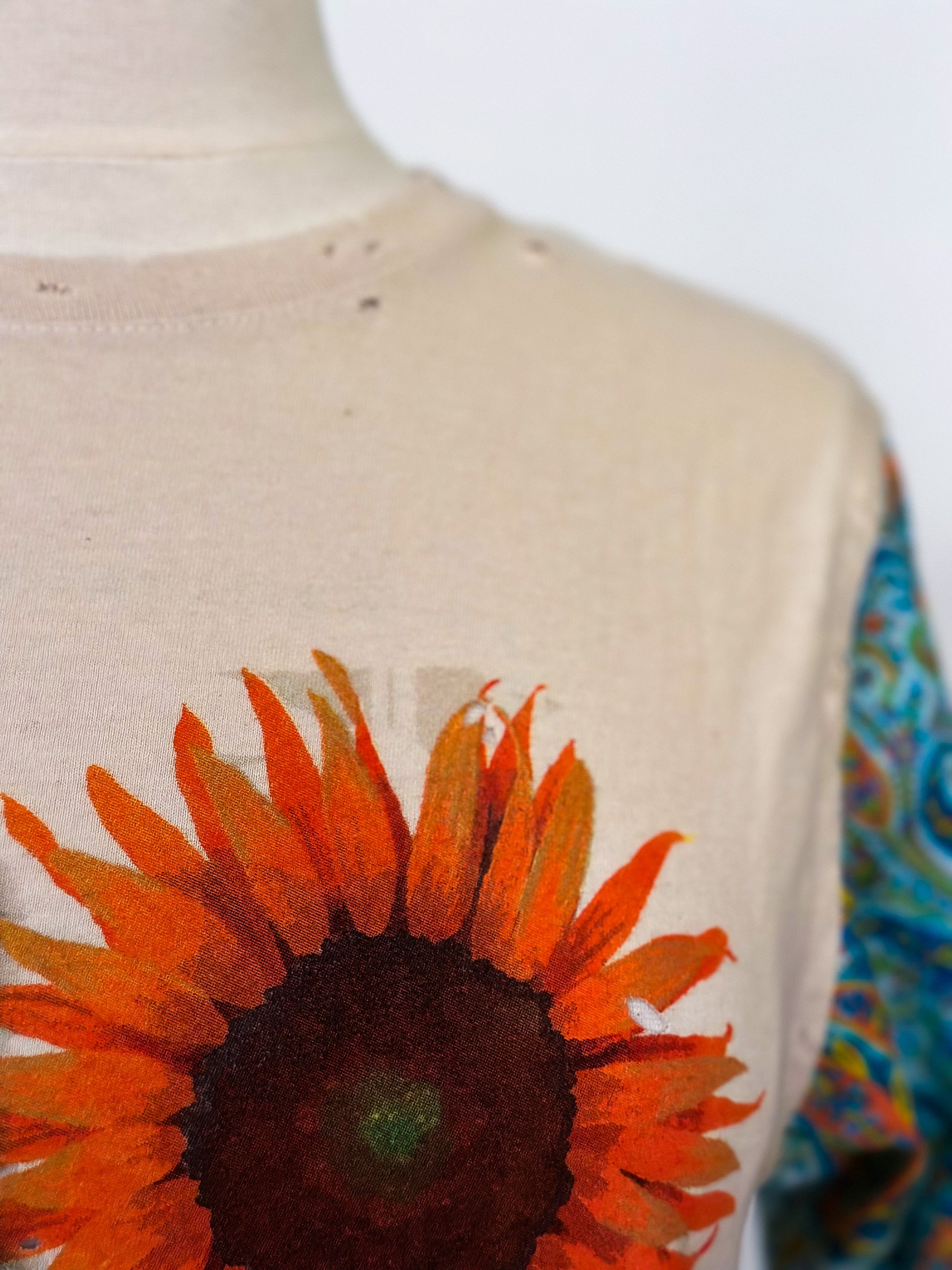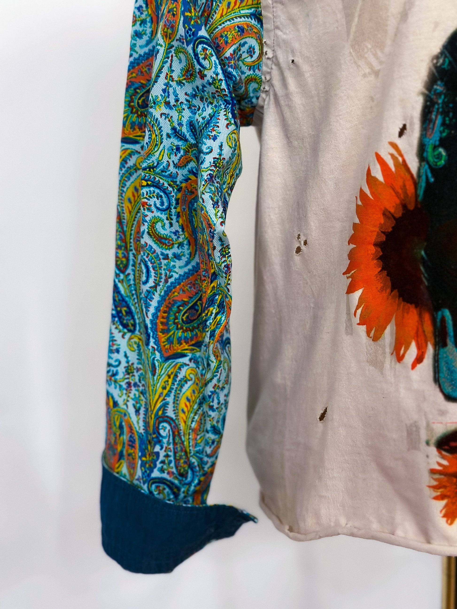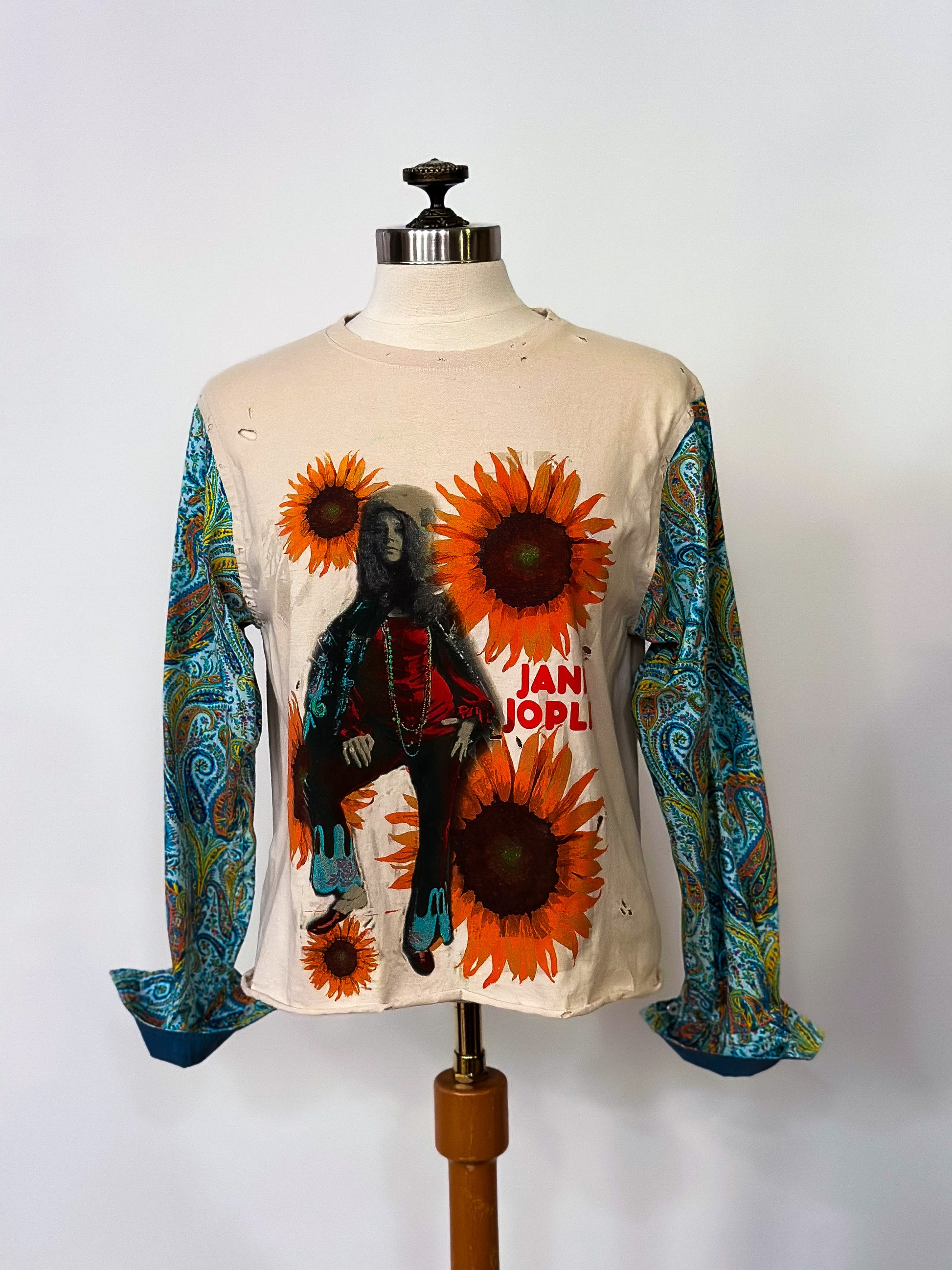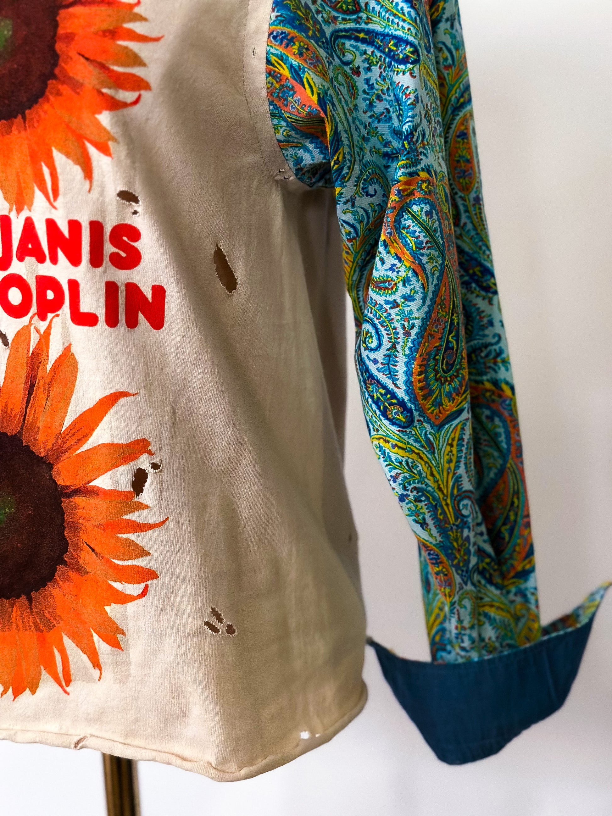 Reminiscent of the 70s, The Janis is a timeless classic constructed from an upcycled tee. A colorful paisley sleeve was added for a pretty cool contrast. Make a statement and upgrade your wardrobe with this unique piece!