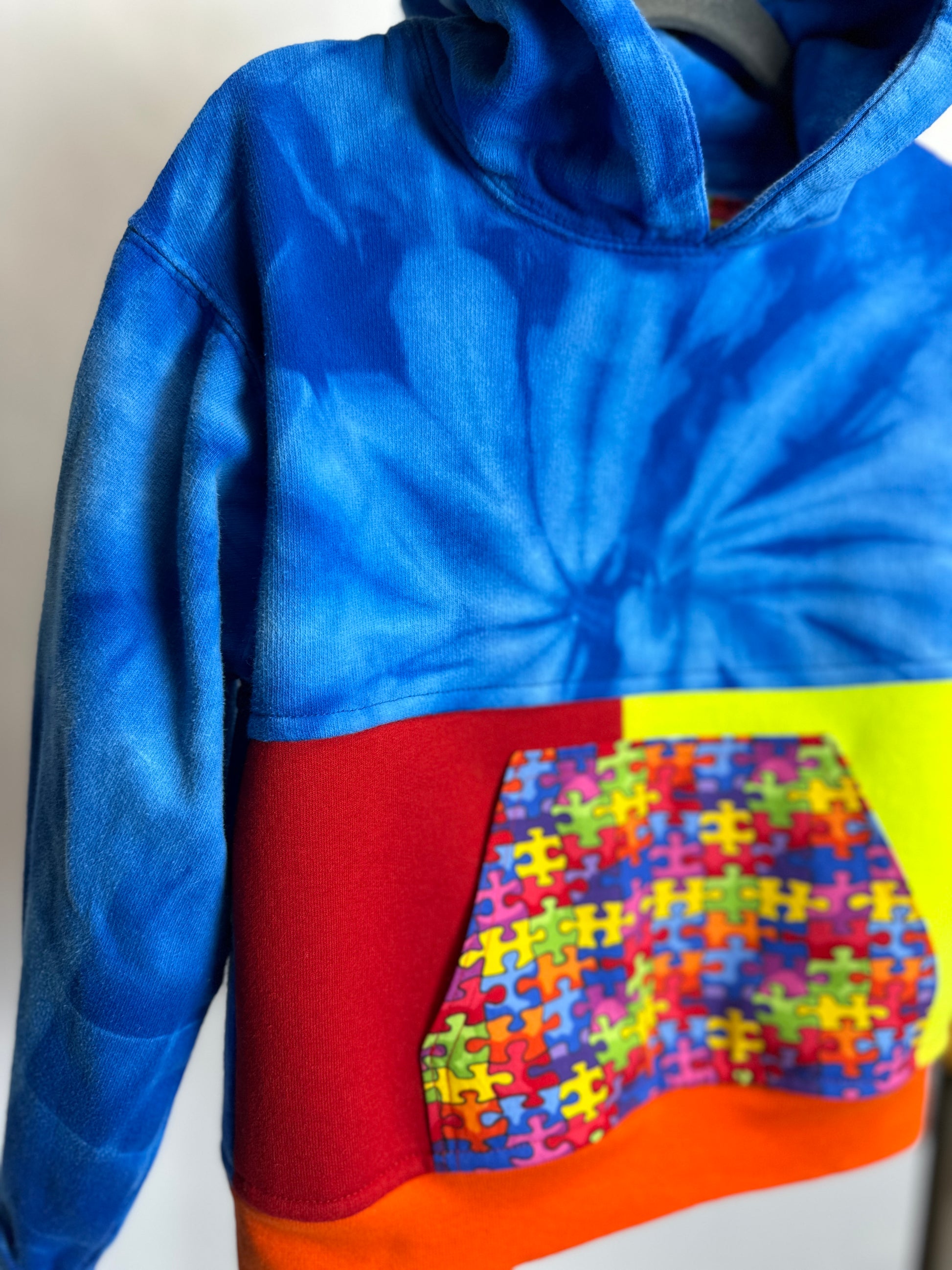 Get your little one cozy and cool with our hoodie made from upcycled materials. This tie dye hoodie features a unique color block design and a playful puzzle piece kanga pocket. Perfect for fun and imaginative playtime!