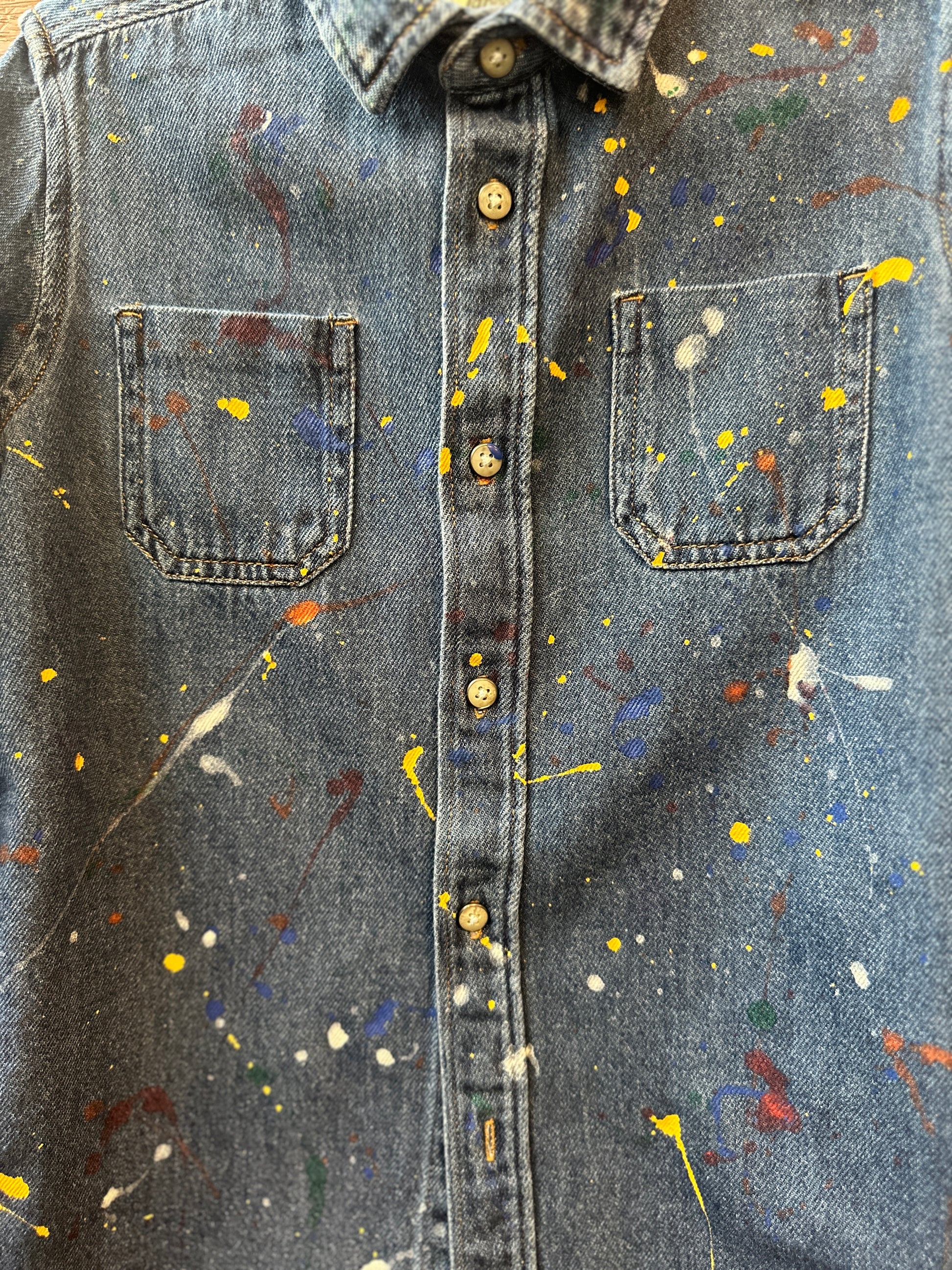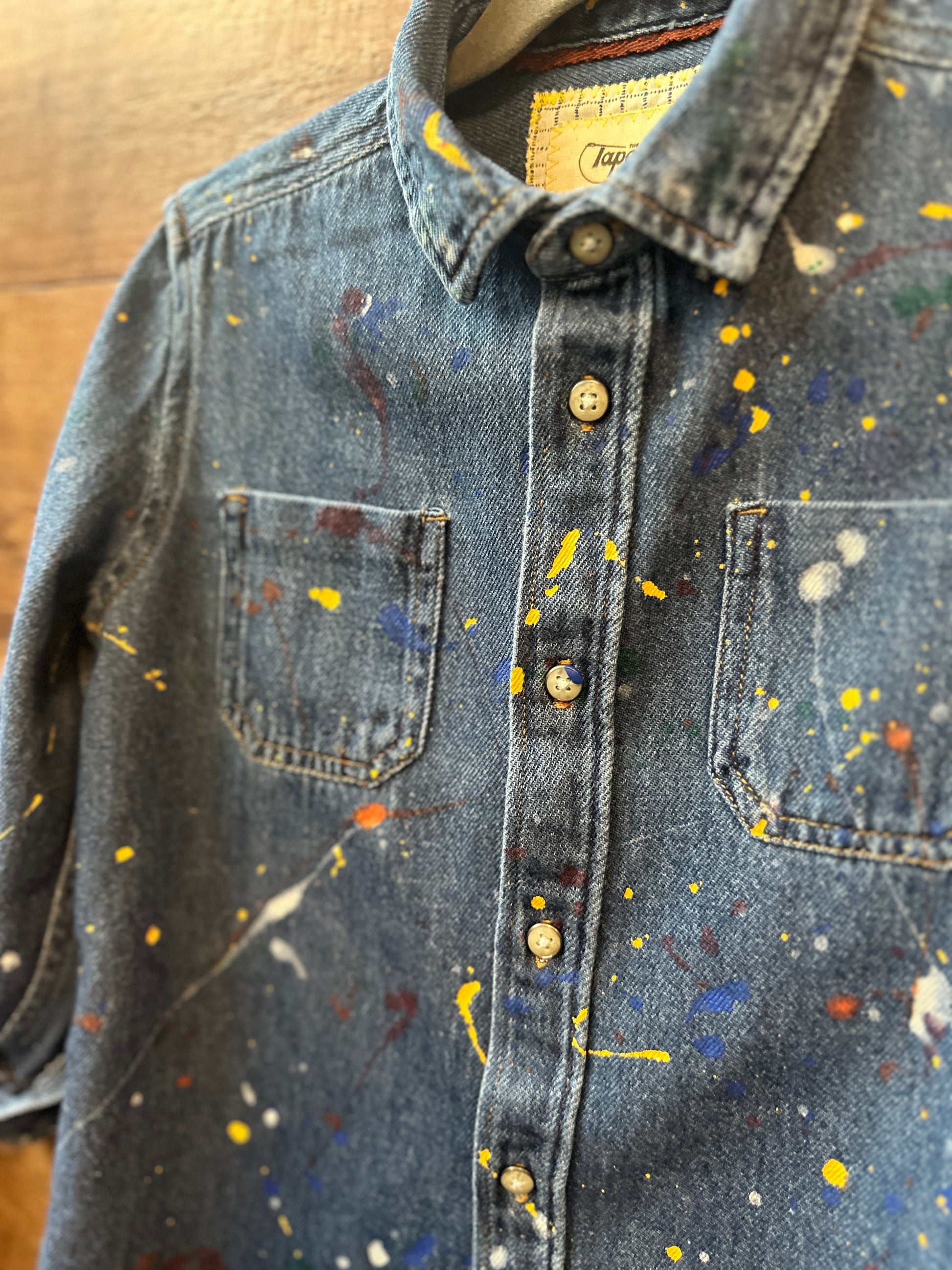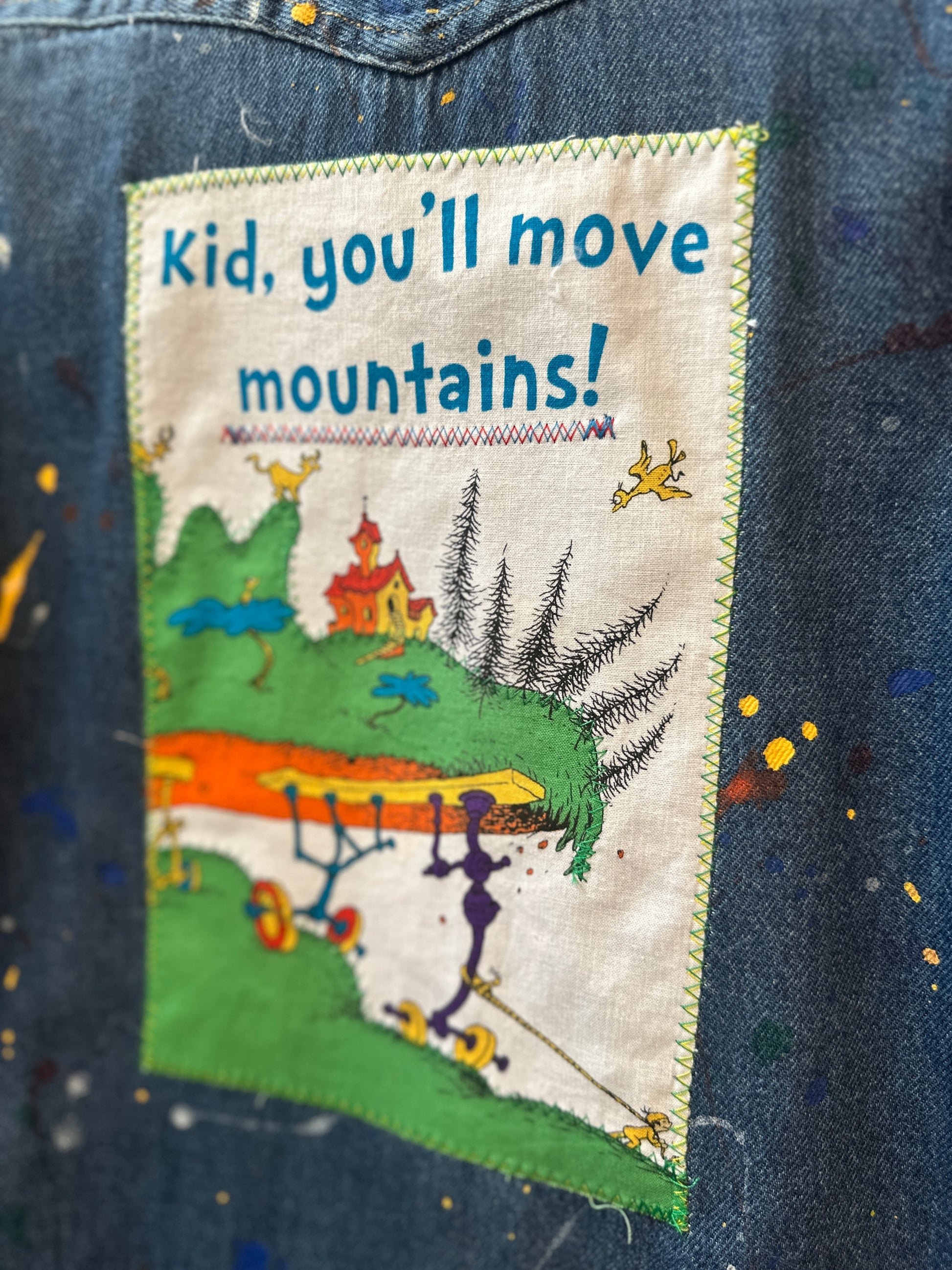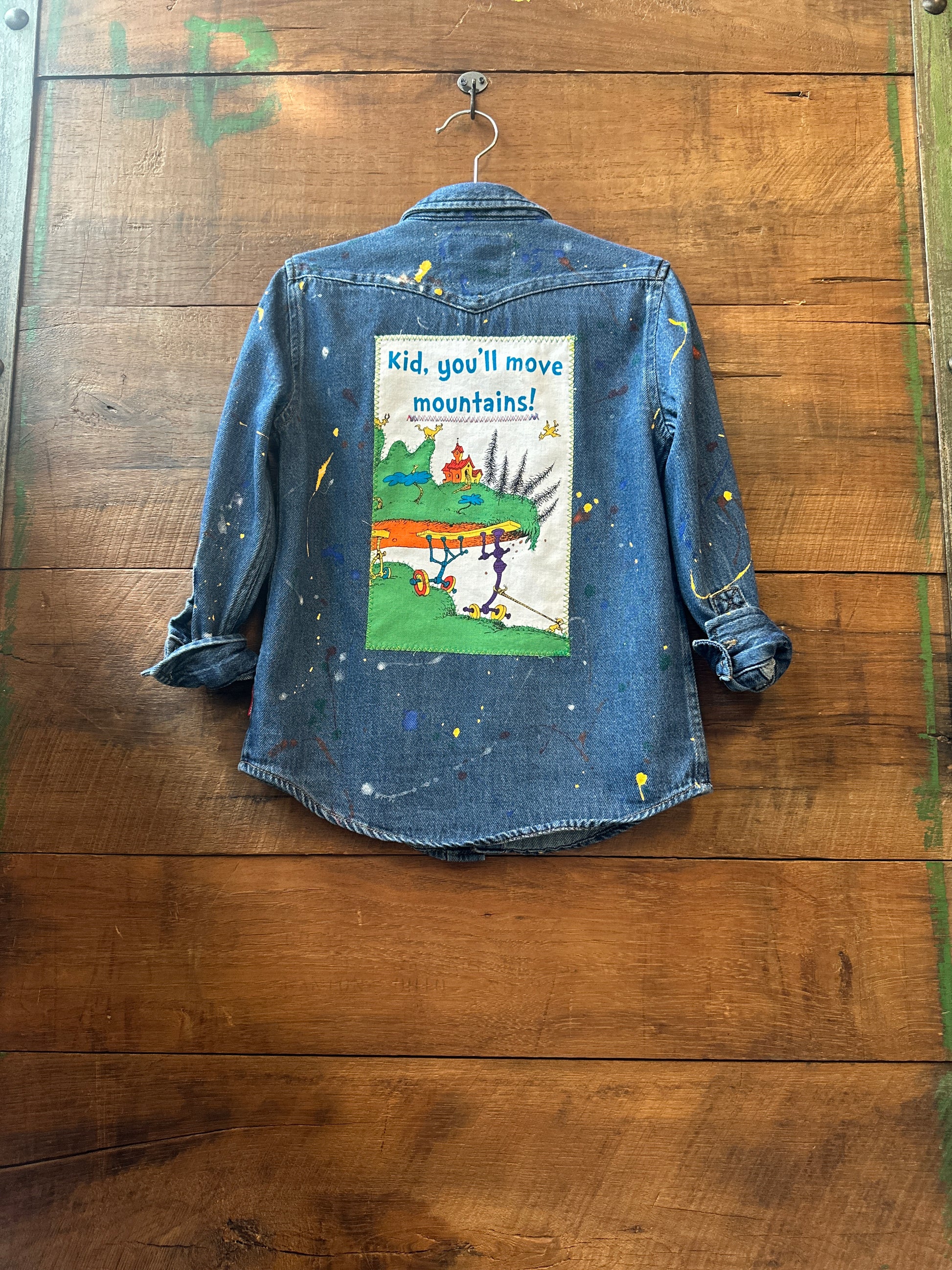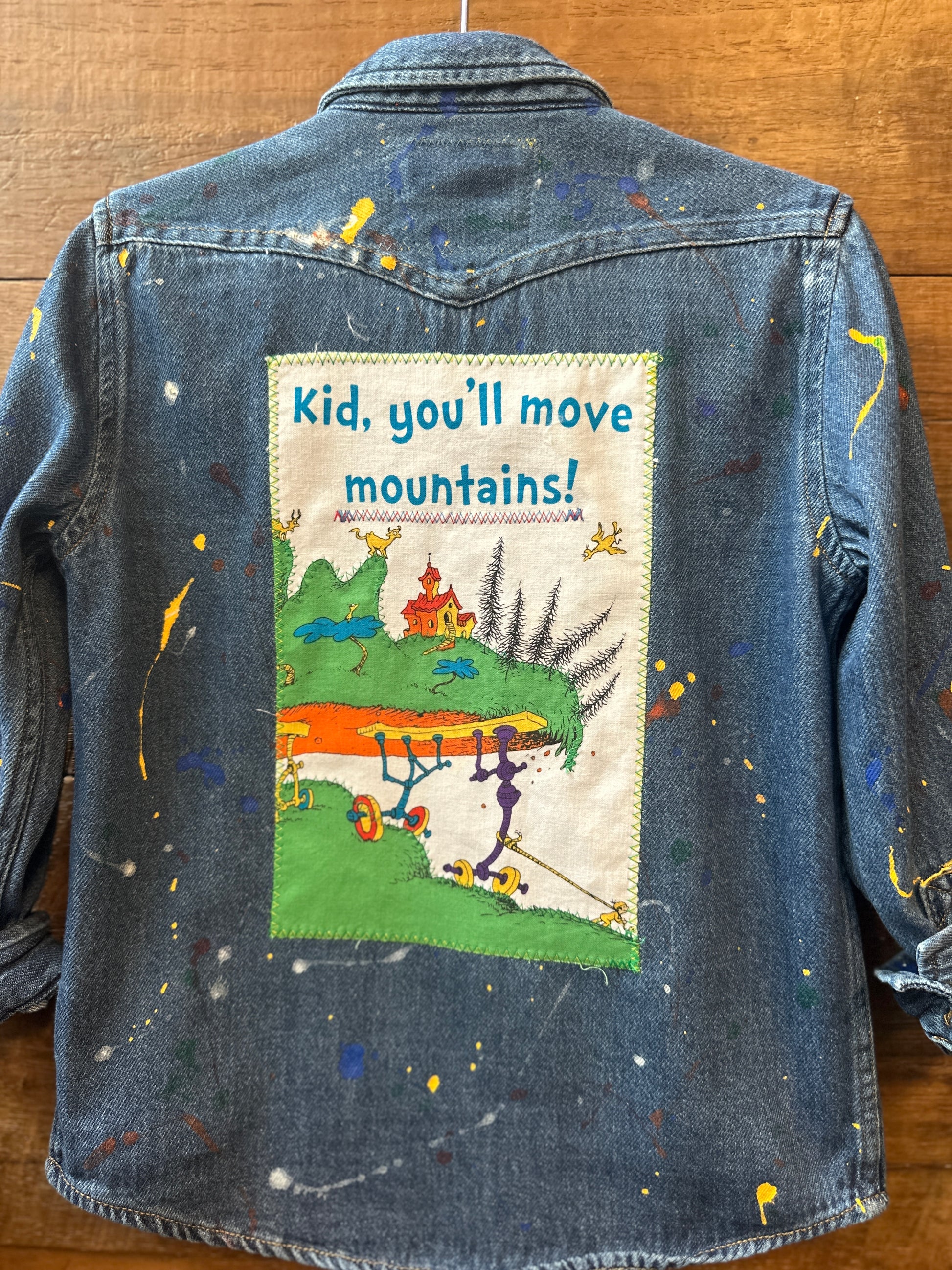 This playful upcycled denim shirt bursts with colorful splatter paint, making every piece uniquely vibrant. The standout feature is a stitched Dr. Seuss "You'll Move Mountains" graphic on the back, sparking imagination and fun. Perfect for little adventurers who love style with a creative twist.