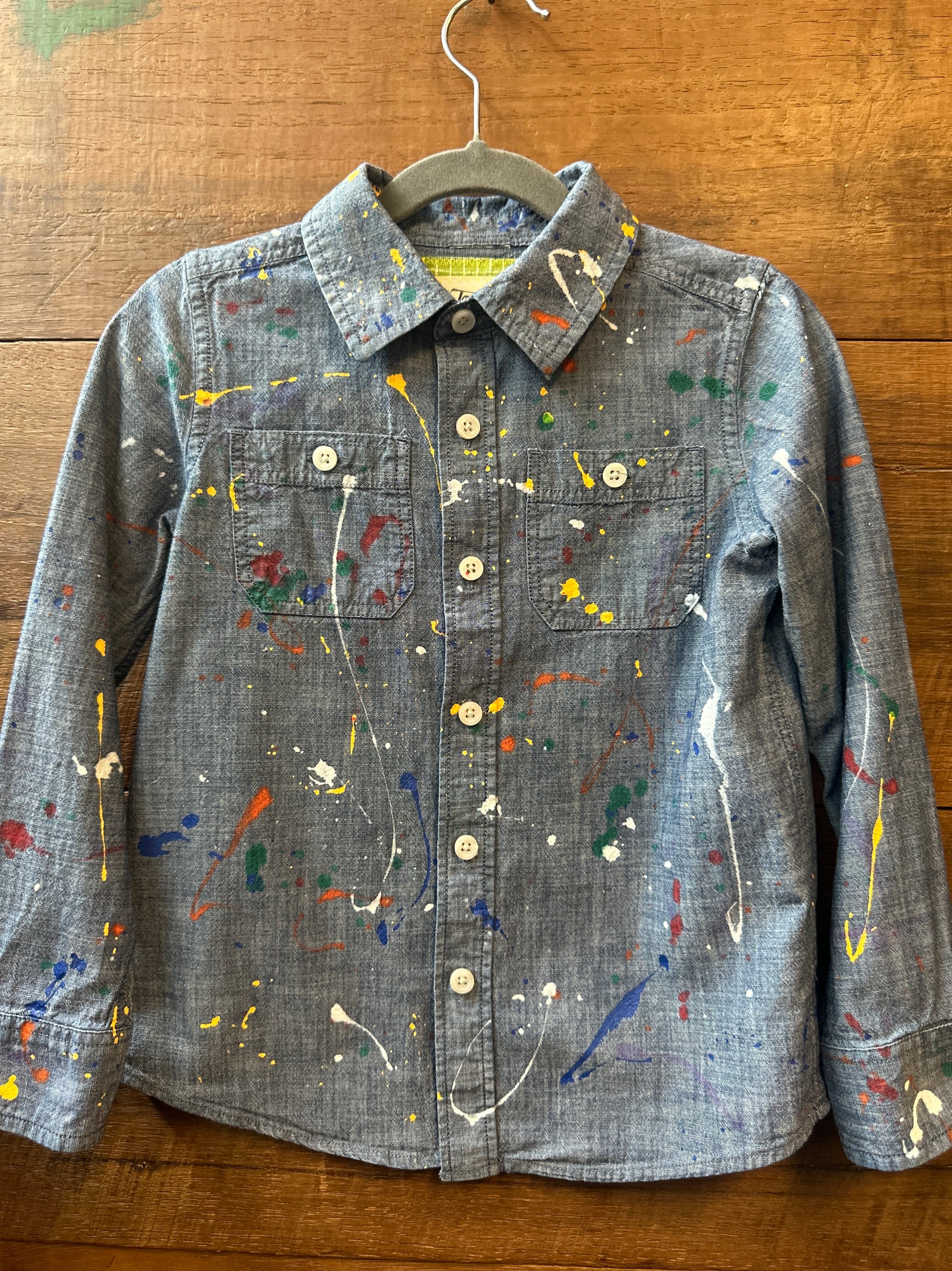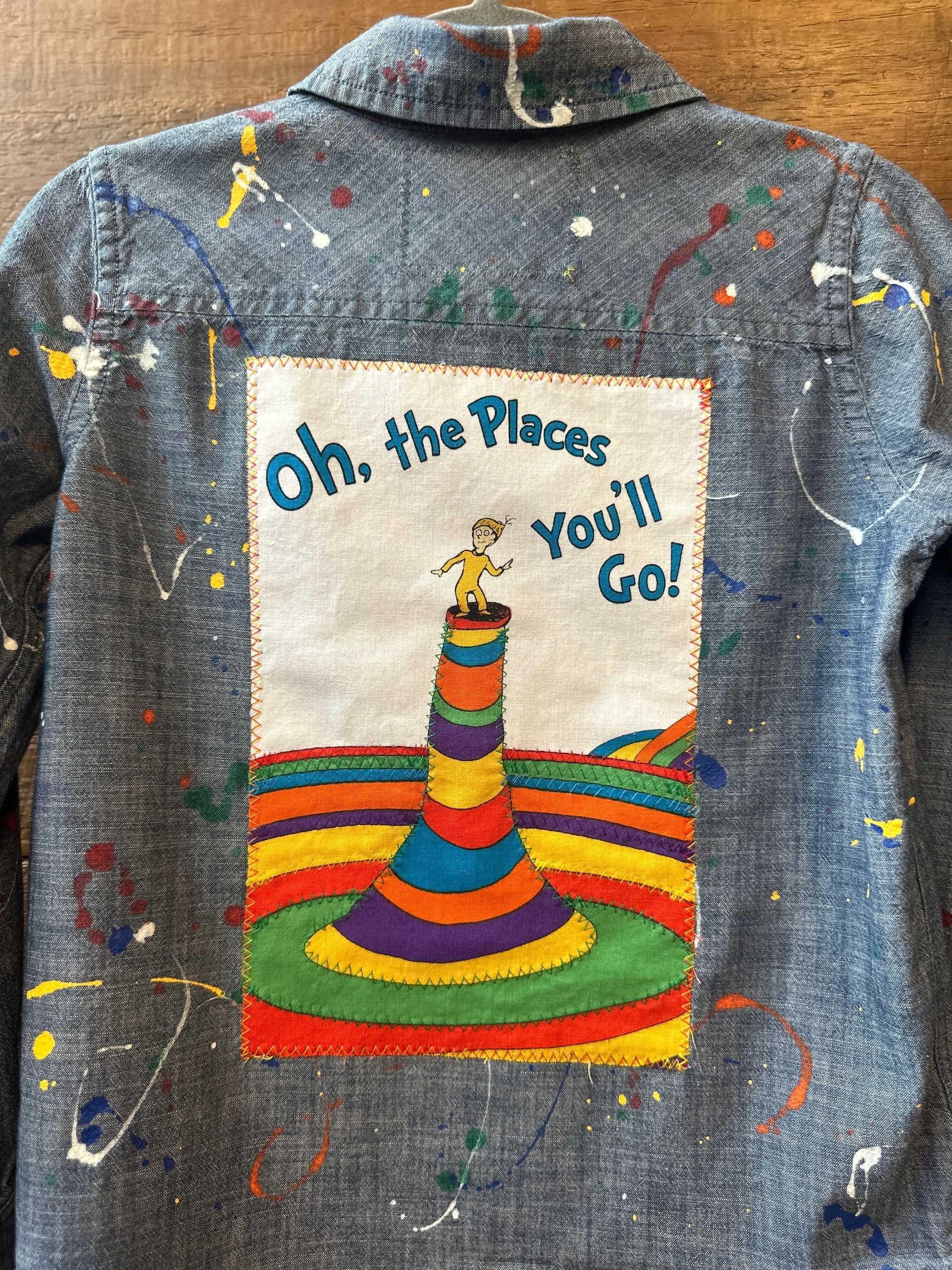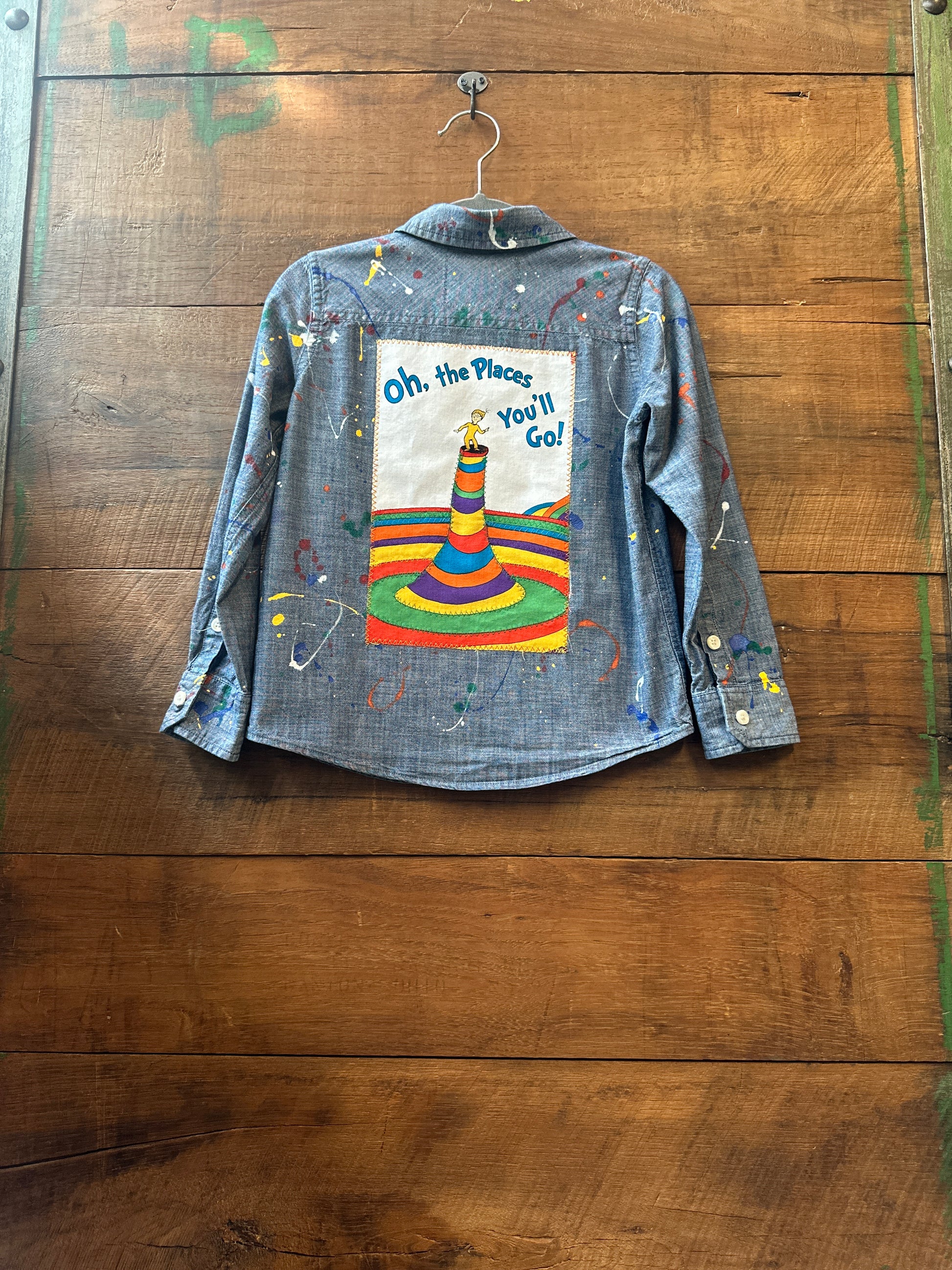 This playful upcycled denim shirt for kids brings fun to every outfit with colorful splatter paint all over and a charming Dr. Seuss "Oh the Places You'll Go" graphic stitched on the back. Perfect for little adventurers, it adds a splash of creativity and imagination to any day. Durable, unique, and sized just right for your little explorer.