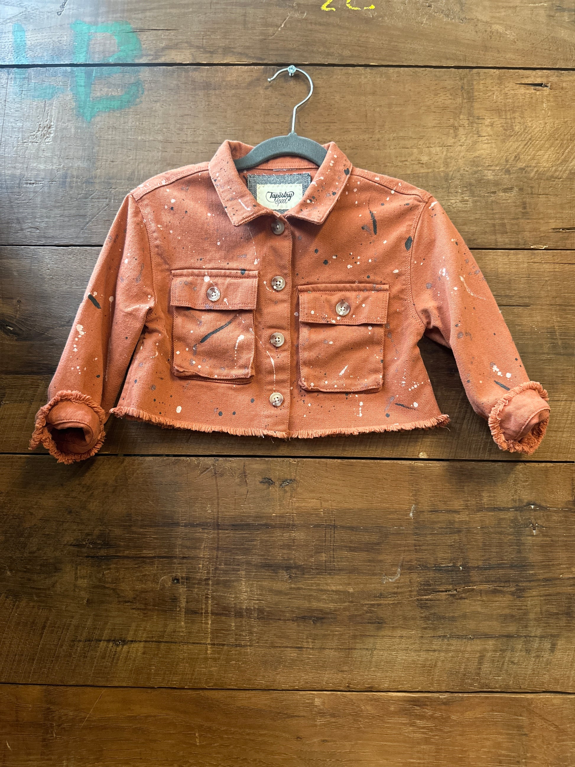 Upcycled jacket in a lightweight cotton featuring paint splatters throughout. Raw edges and large pockets give this one such an edgy style!