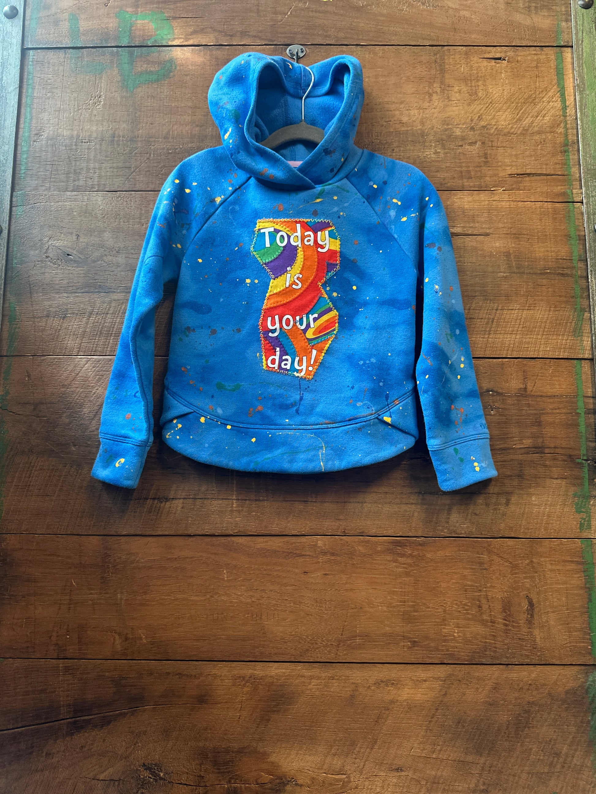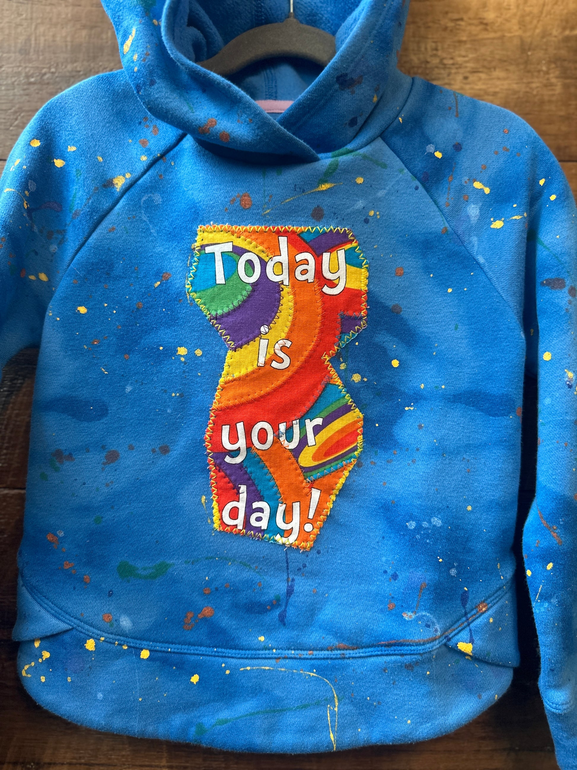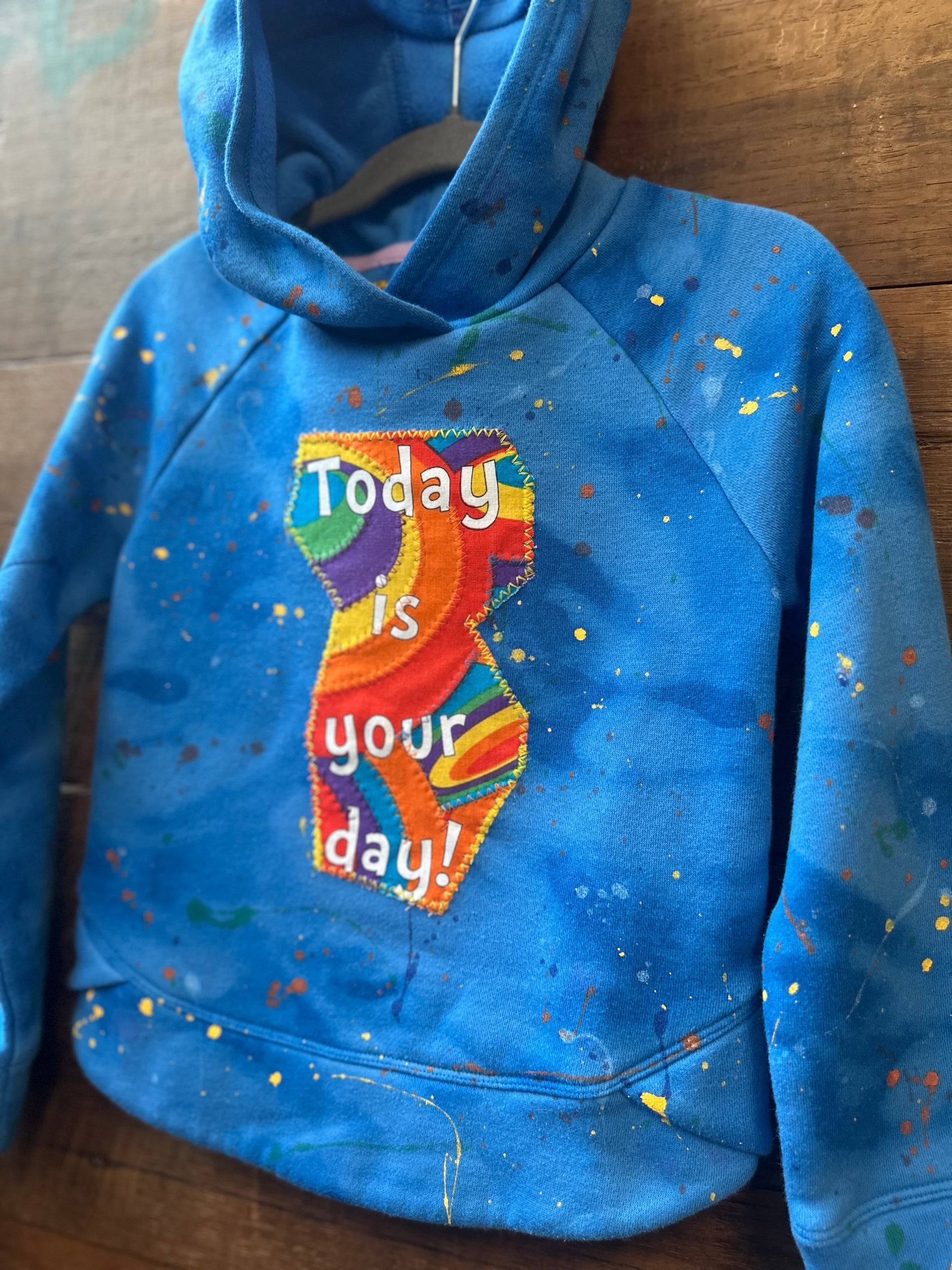 Brighten your little one’s day with this upcycled kid’s hoodie, splashed with colorful paint for a fun, unique look. Featuring a cheerful “Today is your day” graphic stitched on the front, it’s perfect for inspiring confidence and creativity every time it’s worn. Soft, cozy, and one-of-a-kind, this hoodie turns everyday wear into a joyful celebration.