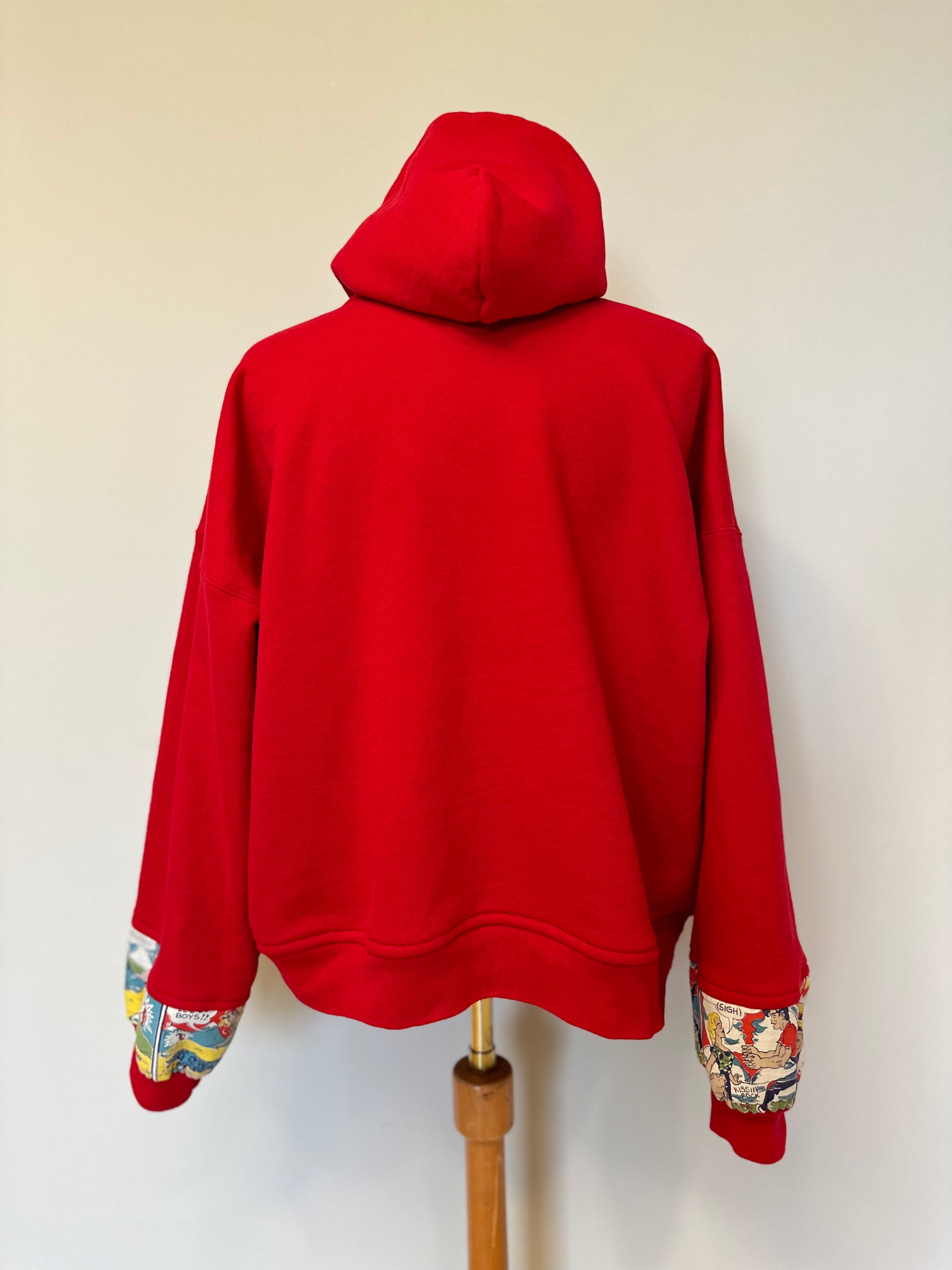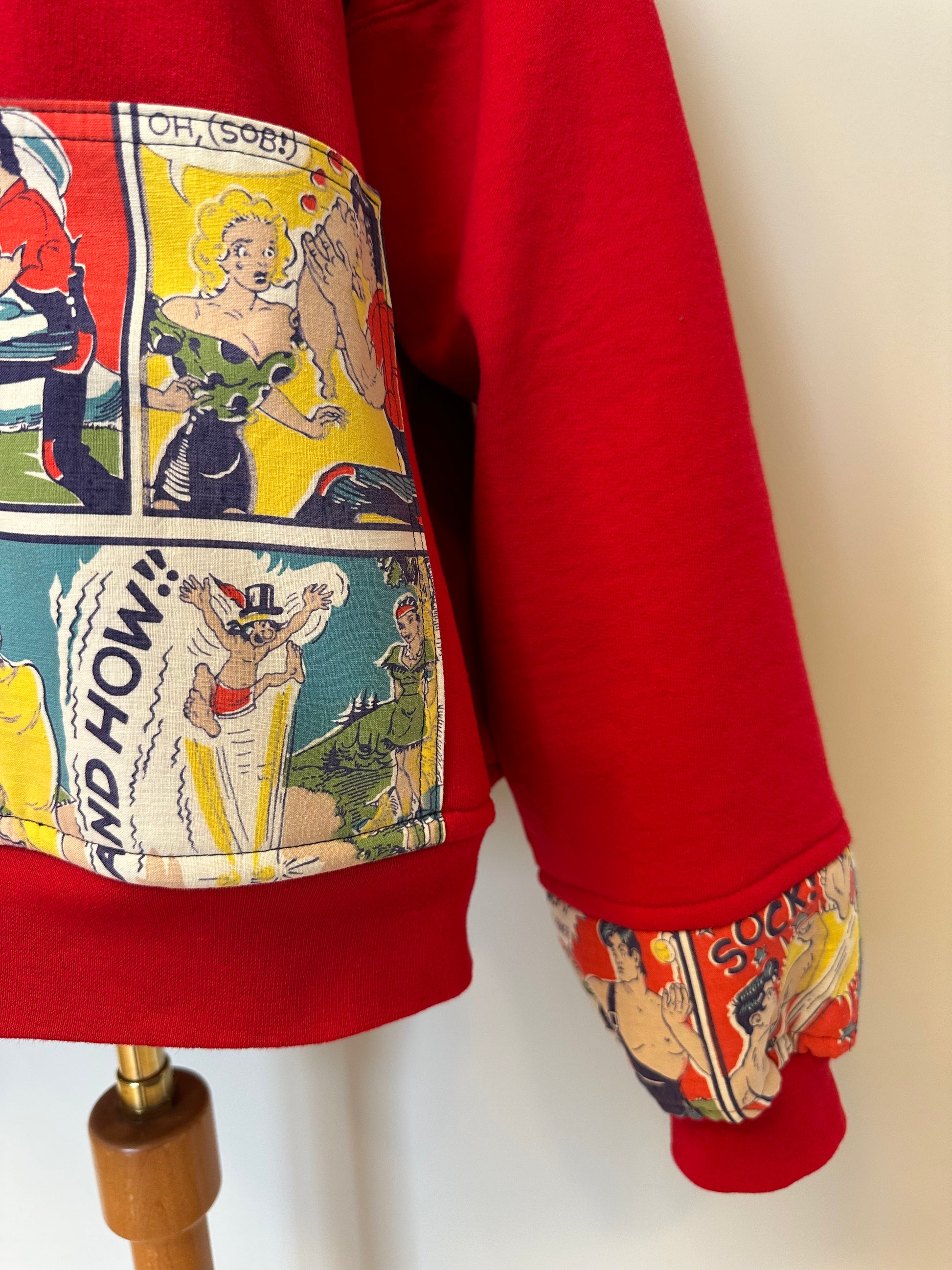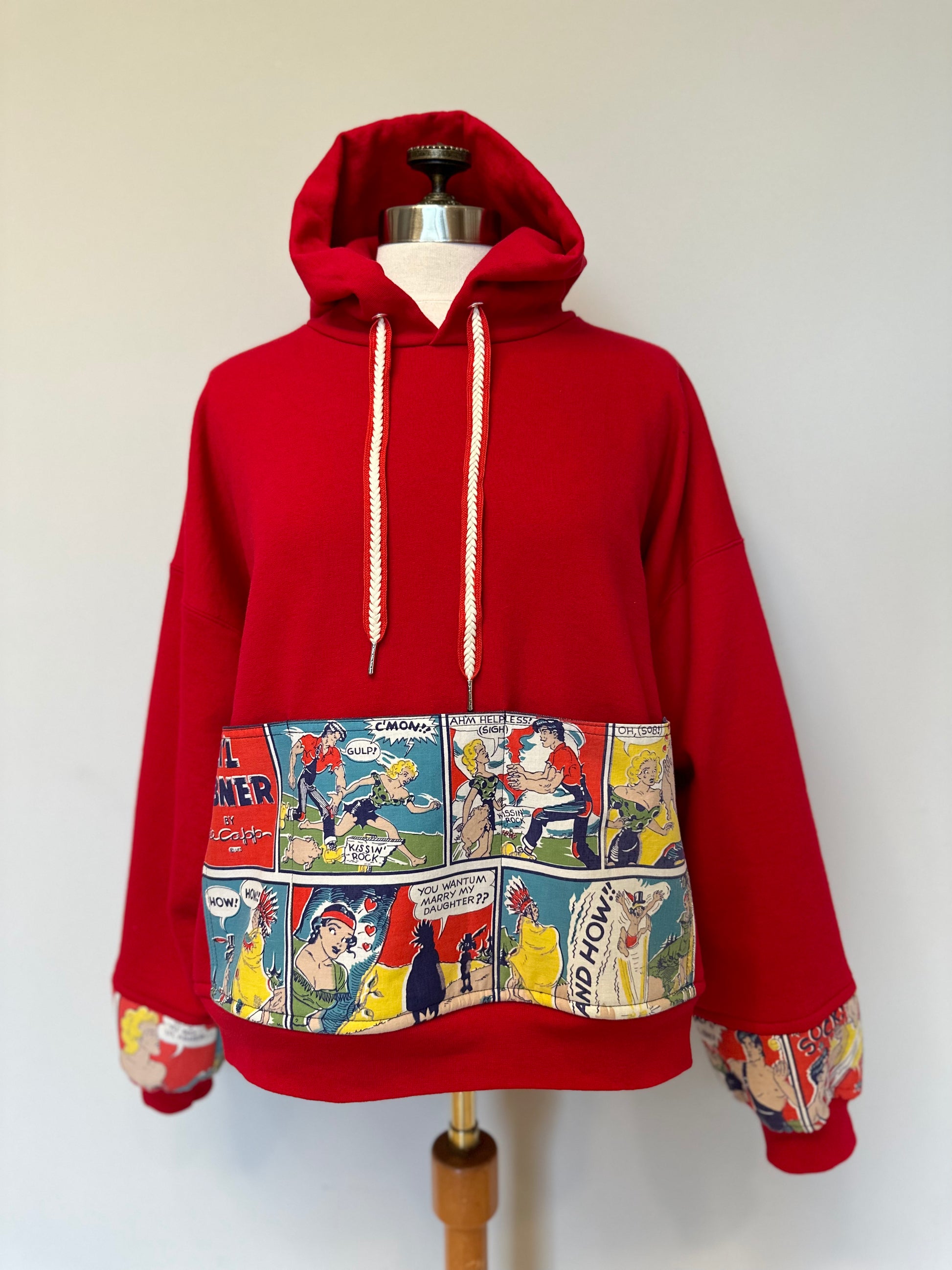 Oversized sweatshirt in a medium weight with a double layer hoodie and contrasting drawstring. Featuring a vintage pocket and sleeve trim in a fun Lil Abner comic strip. This one has been a family favorite!