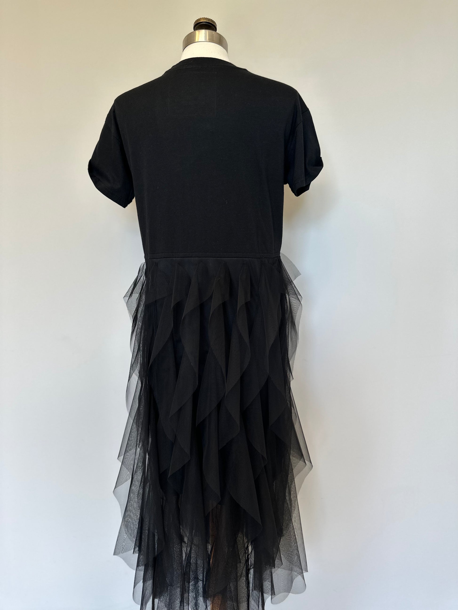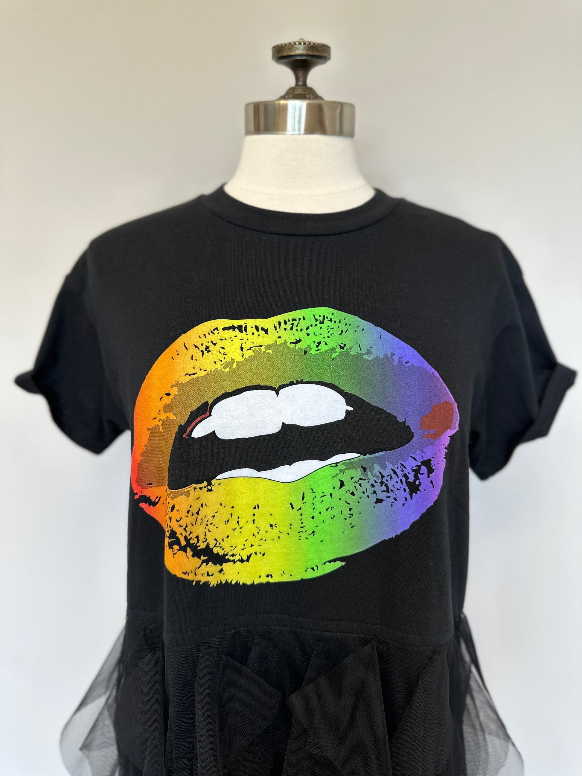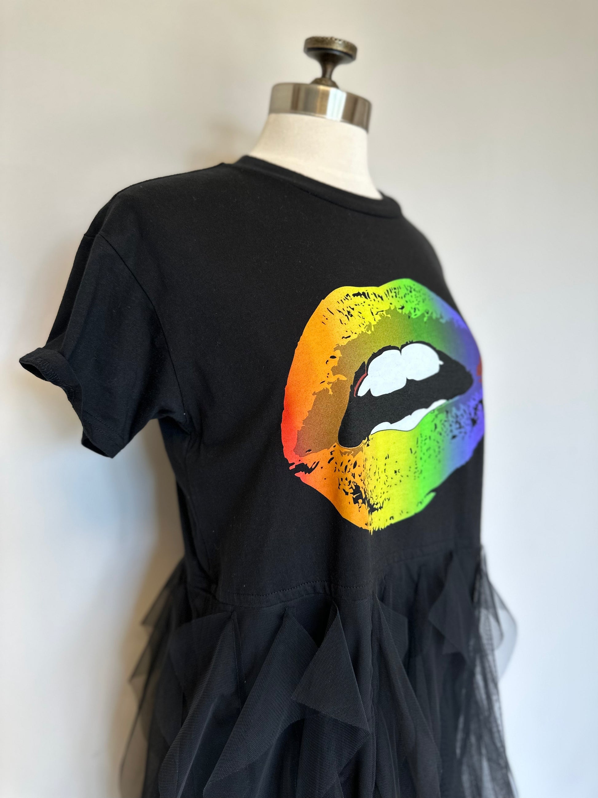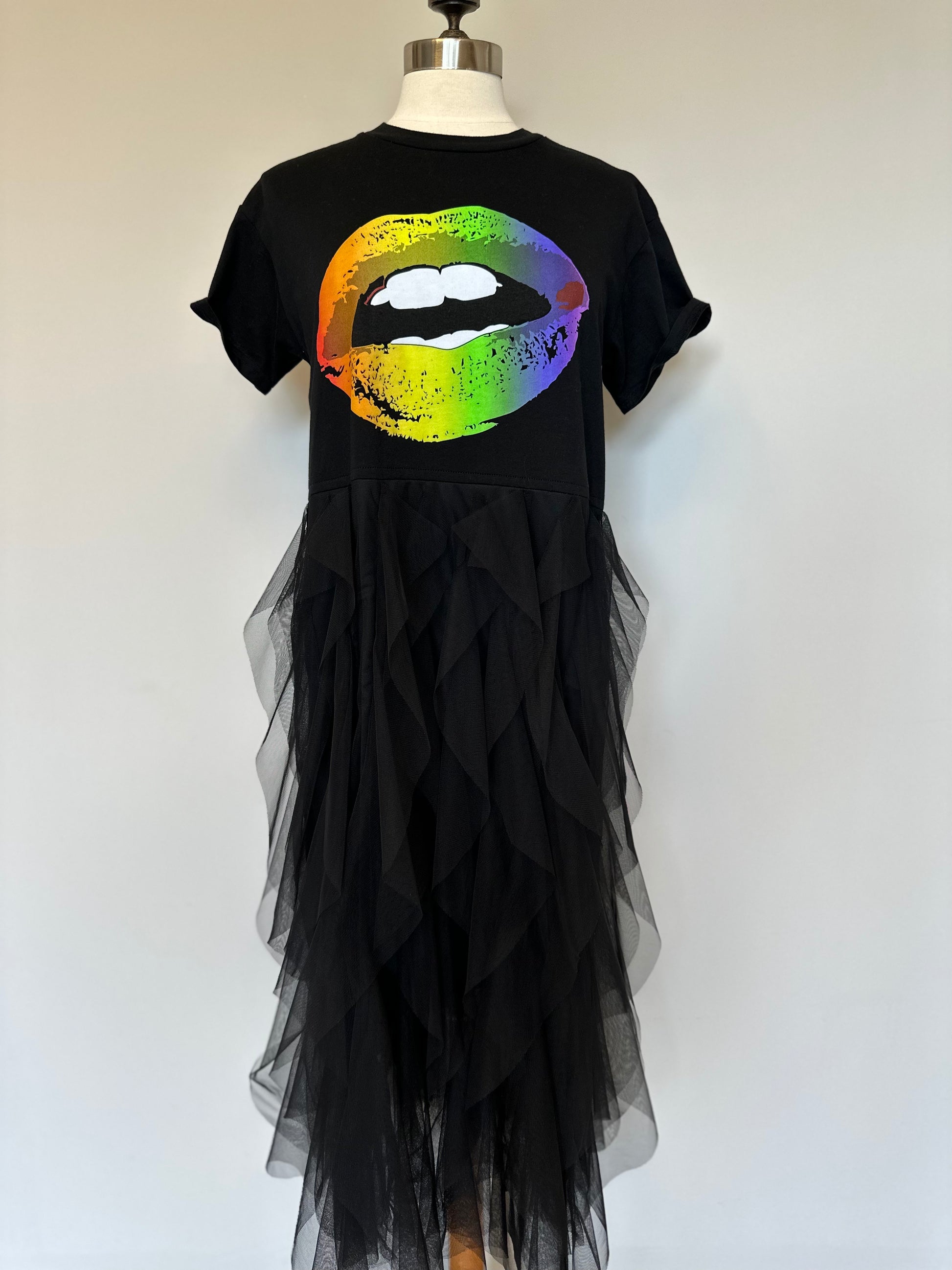 One of three dresses in The Aster Collection with tulle, this is super cool! Features a slightly fitted, cropped tee with a colorful mouth graphic and an attached tulle skirt with flowy layers. Layers run up and down,so it is not super poofy, but is great for twirling. Underskirt falls about half way down, so this can be worn as a dress or with something underneath.