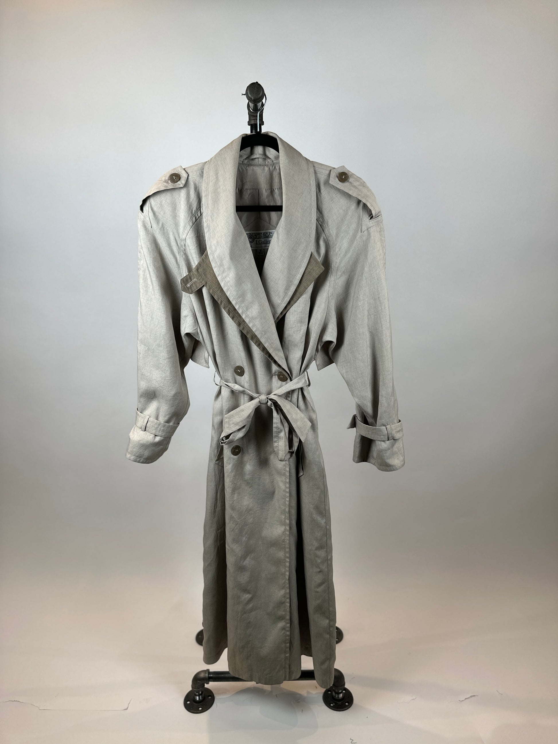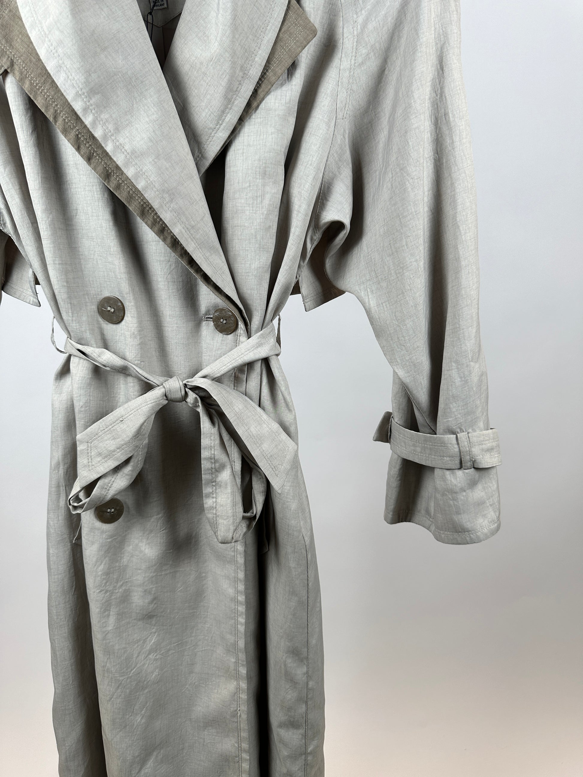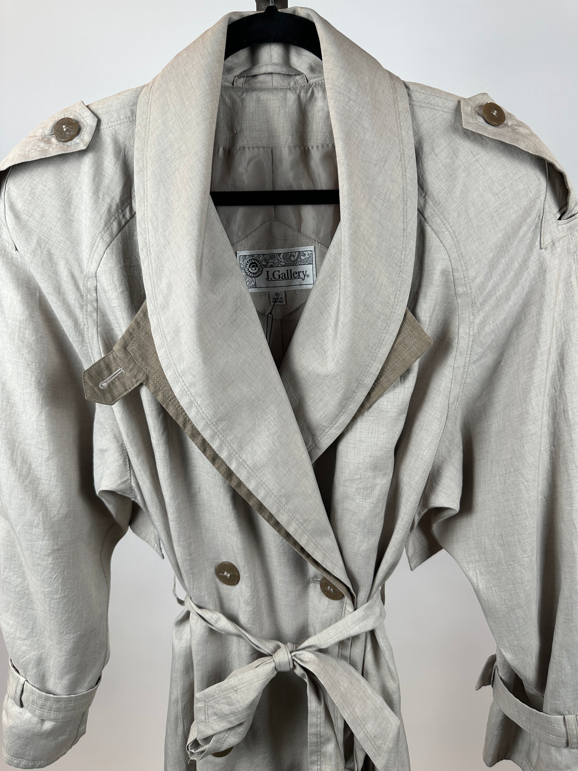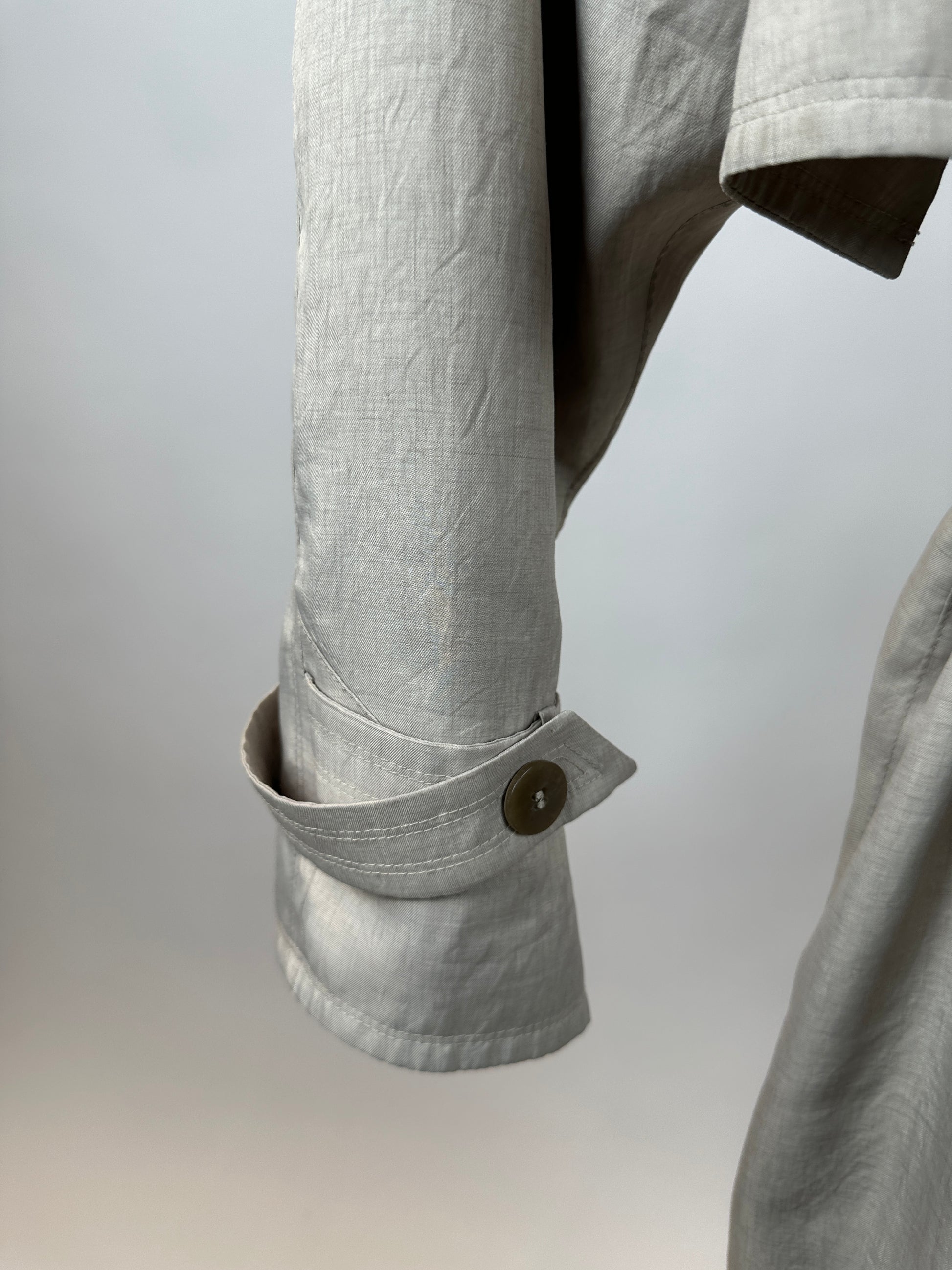 Loose fitting, long trench coat in a two-toned lightweight nylon. Double breasted, tie at waist with pockets at sides. Machine washable, beautiful shade of beige and tan.