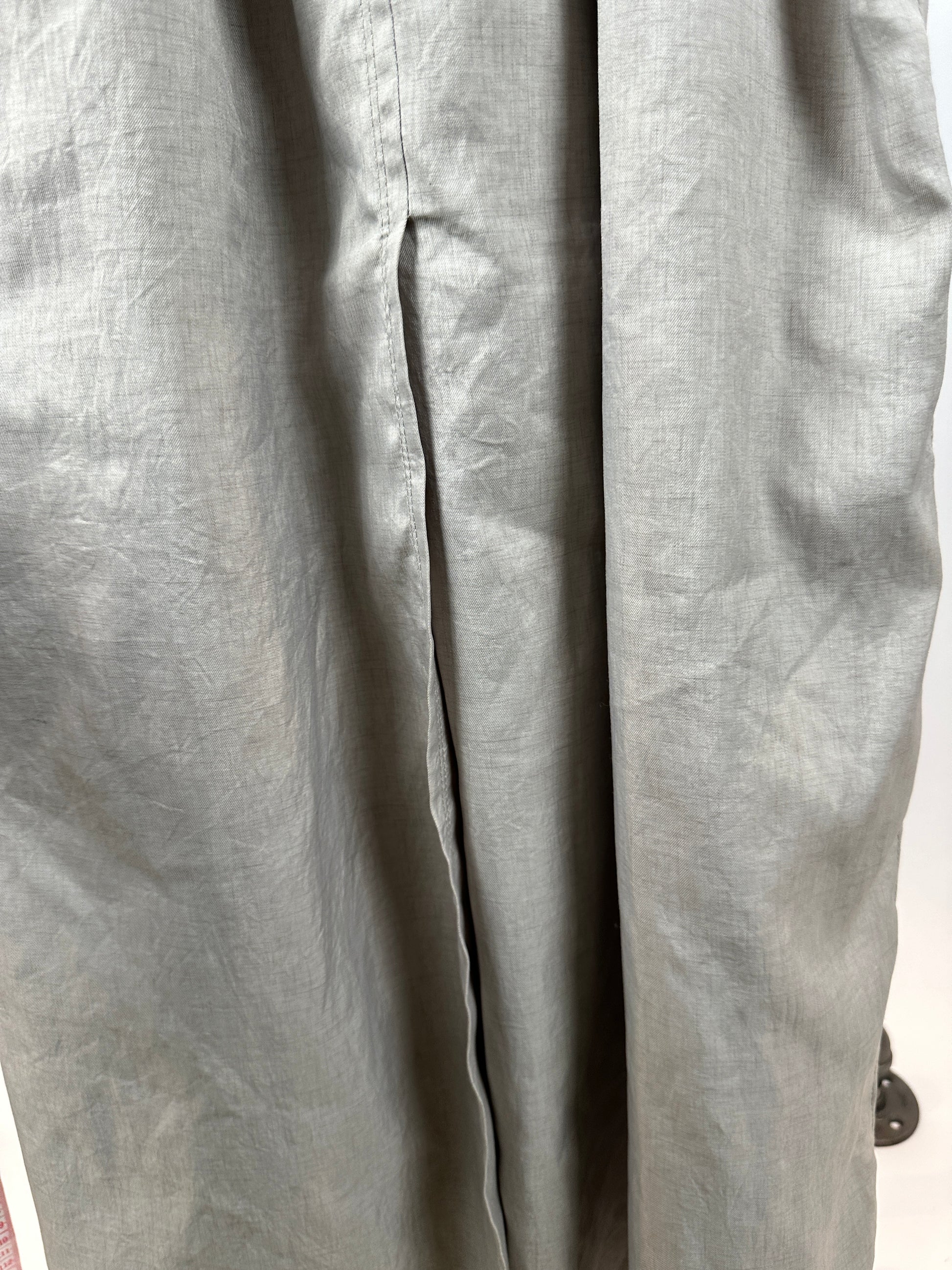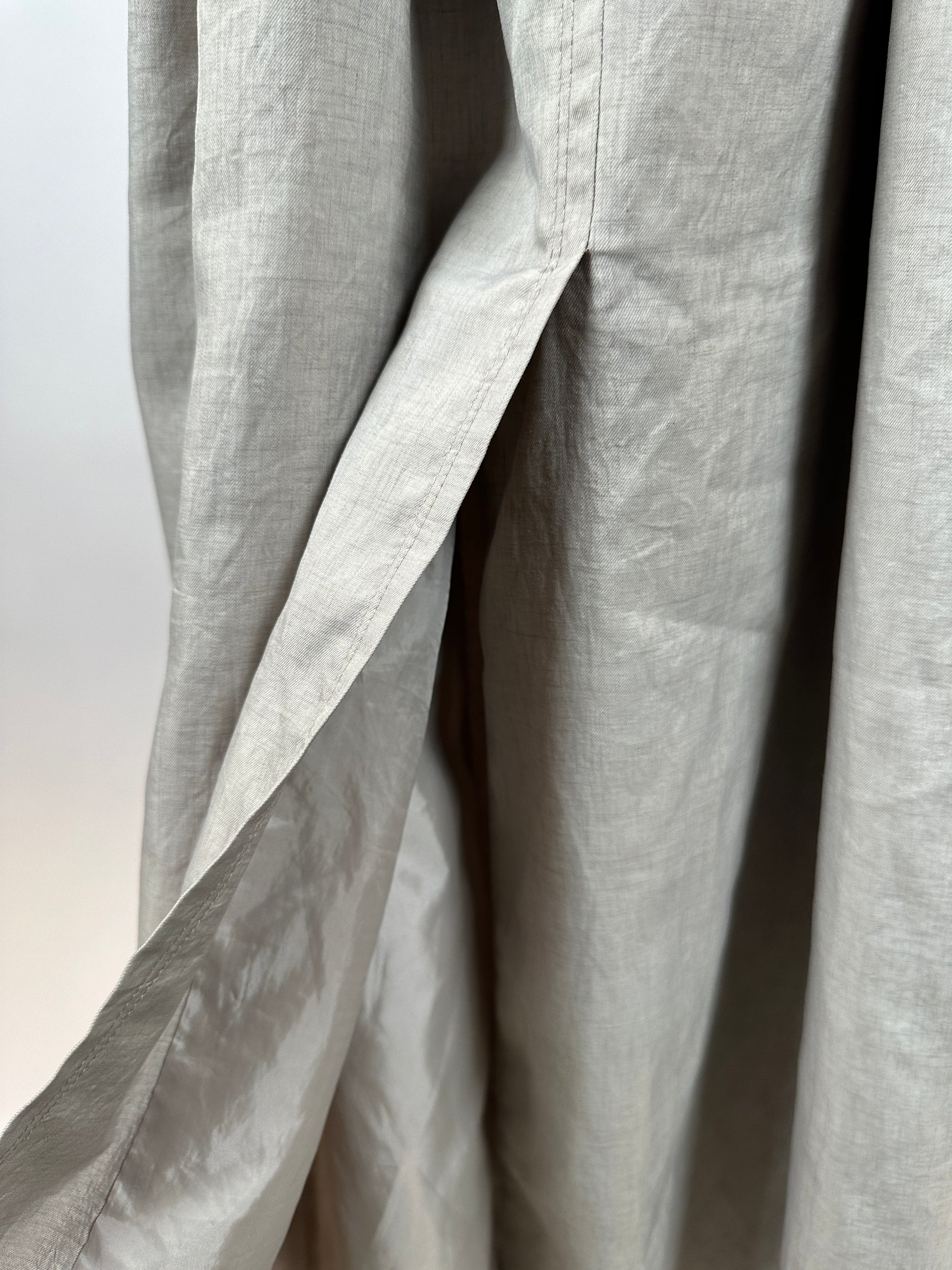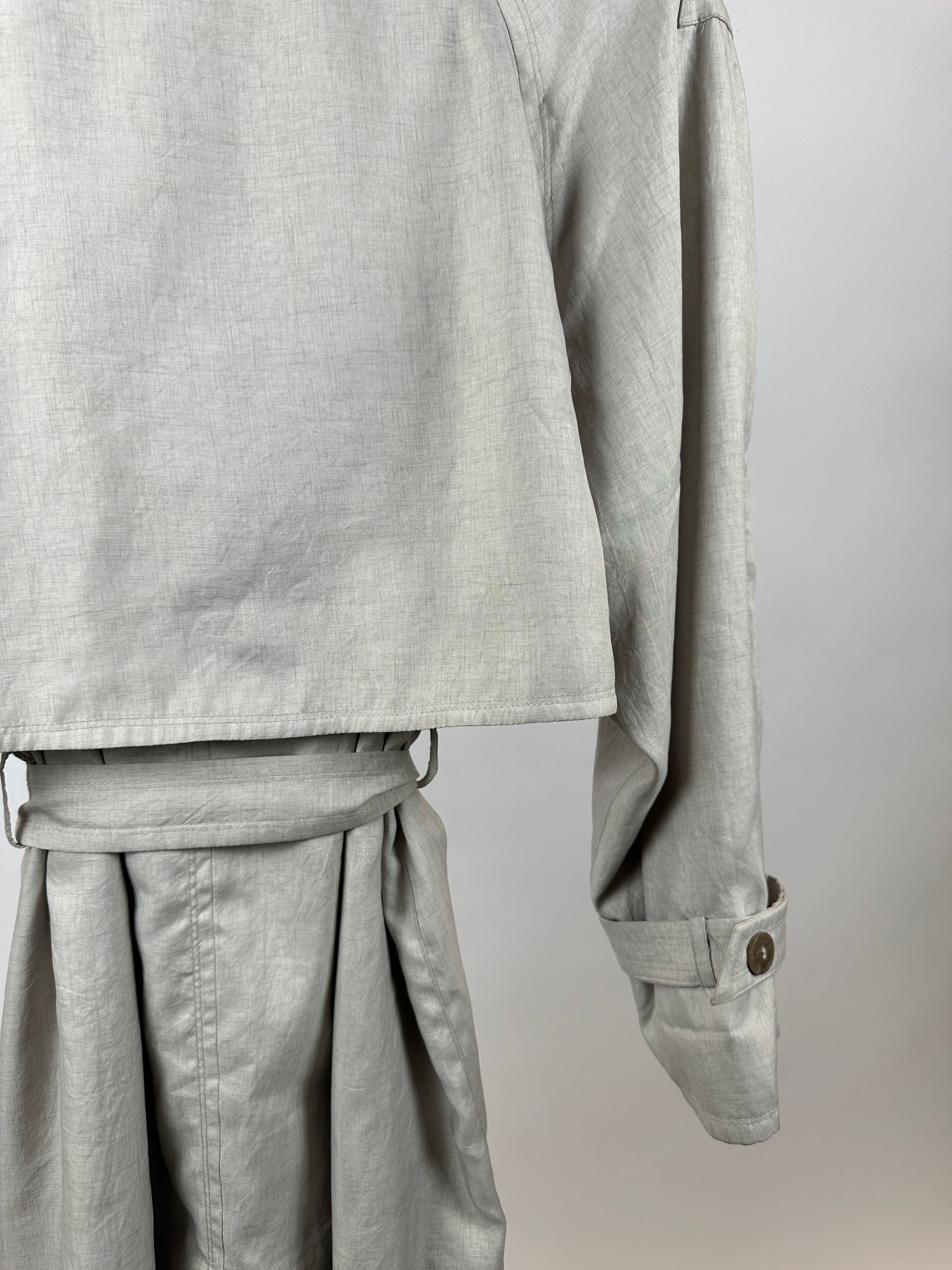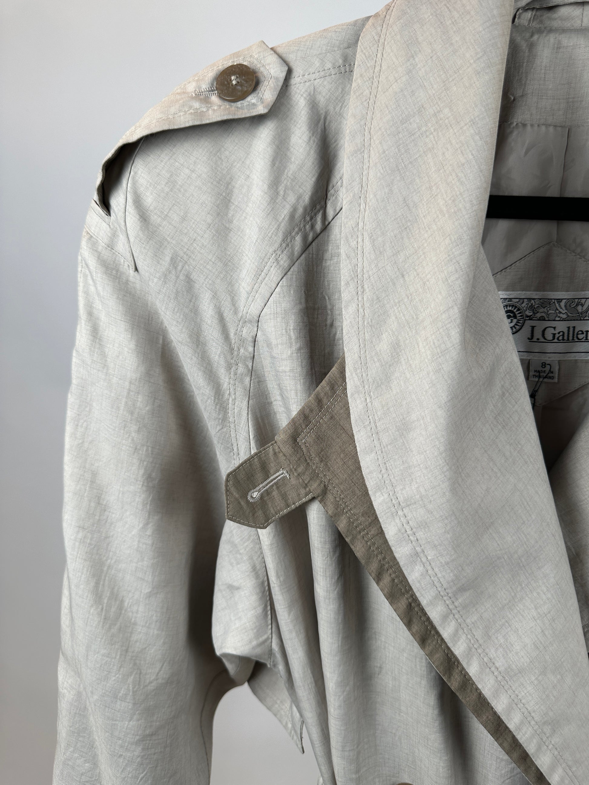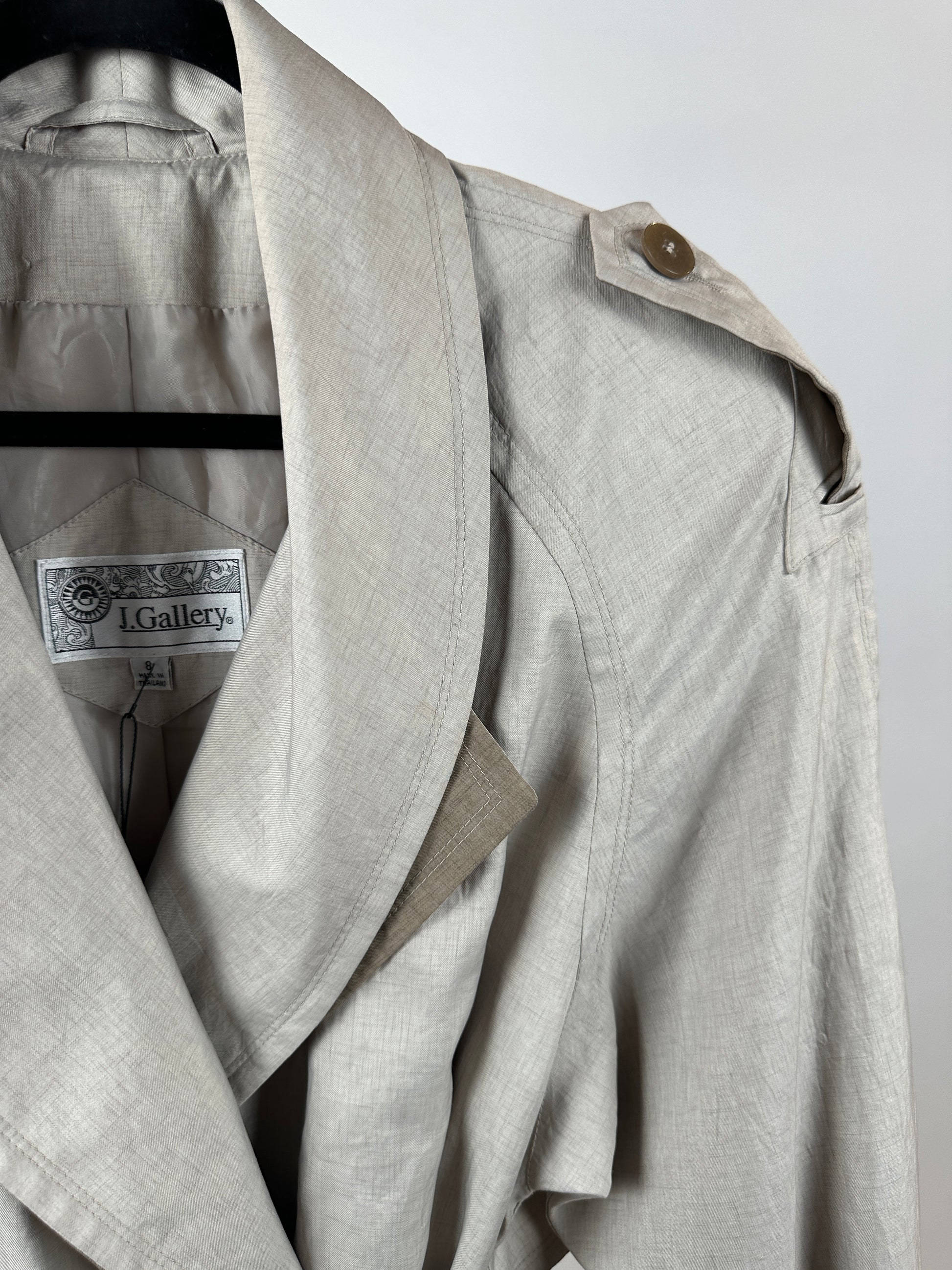 Loose fitting, long trench coat in a two-toned lightweight nylon. Double breasted, tie at waist with pockets at sides. Machine washable, beautiful shade of beige and tan.