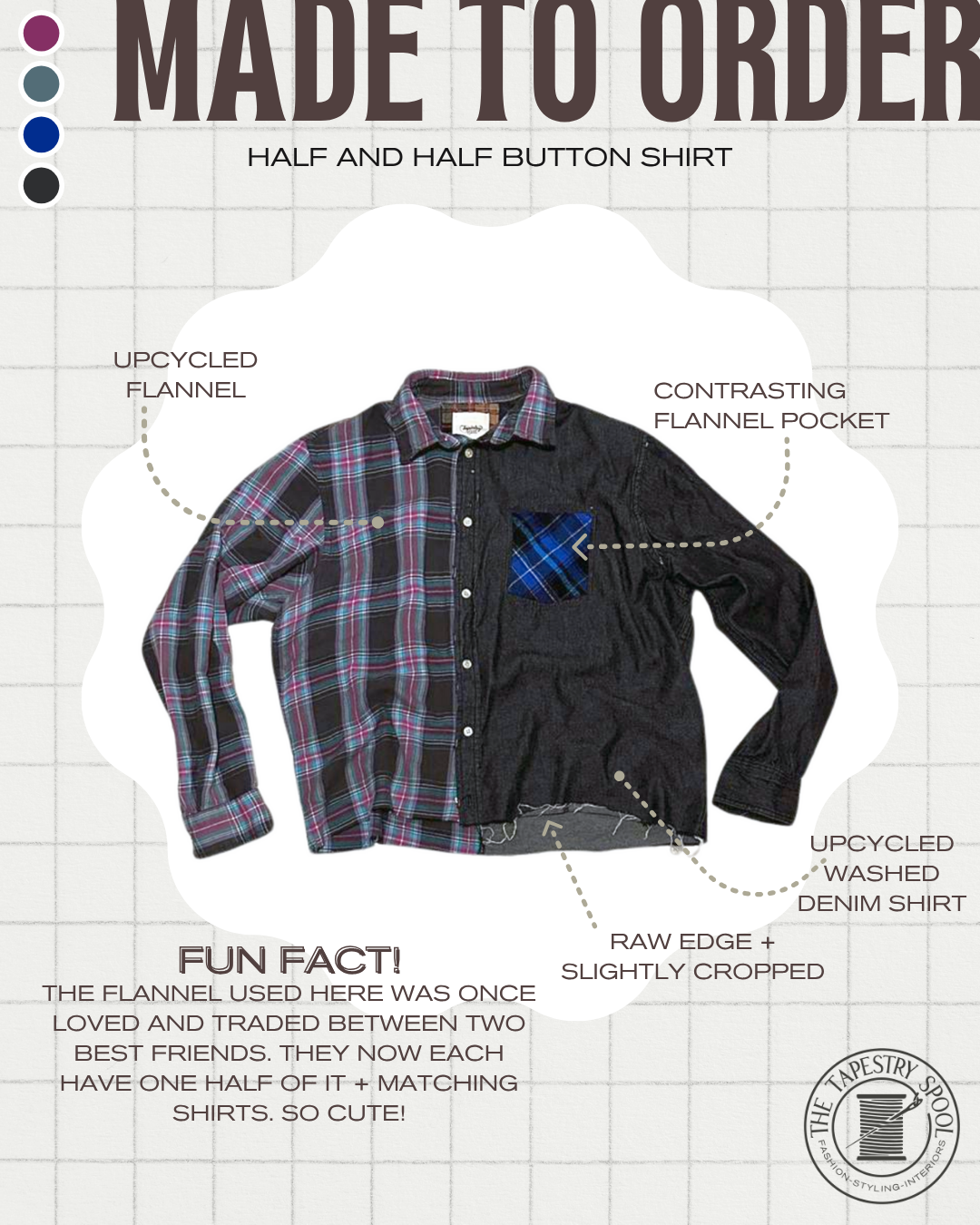 Shirts - Customizable from upcycled textiles. Wovens can be a 1/2 and 1/2 design created from upcycled flannels, denim or twill. Or choose the base and opt for a contrasting pocket or unique sashiko stitching. Band tees can be transformed with woven sleeves or splatter paint detail. So many options!