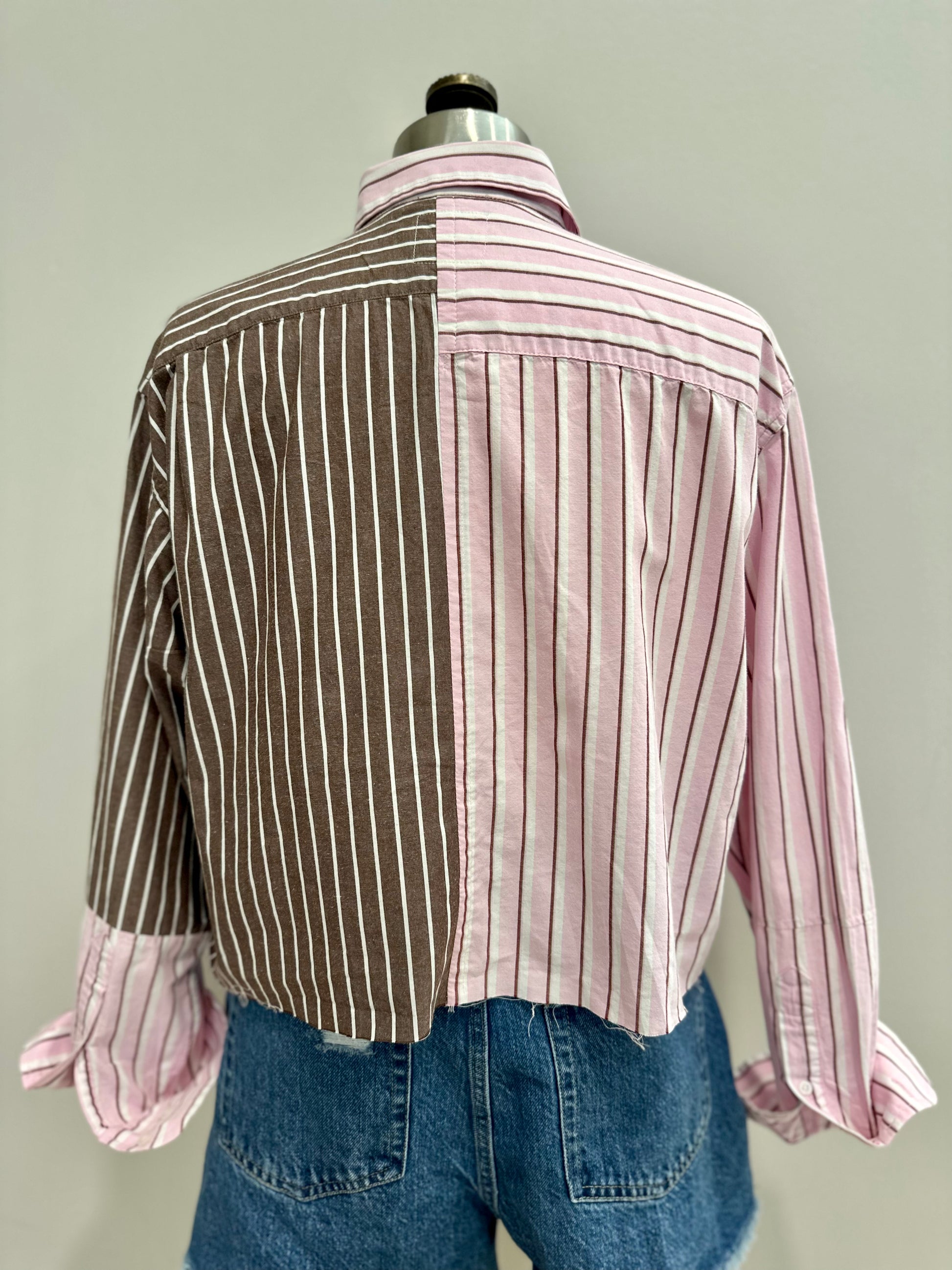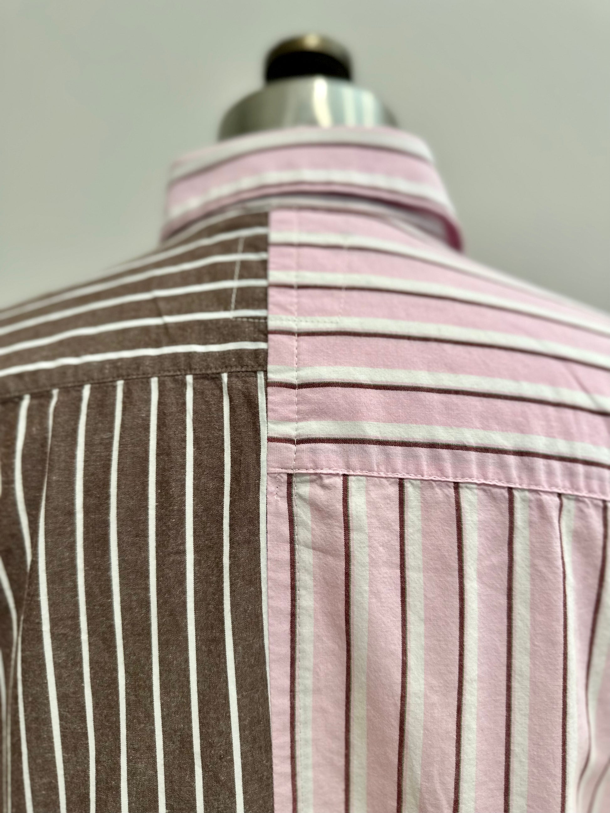 Sneak peak into our next capsule collection, coming soon! This one features 2 different woven shirts (for anyone who remembers Steve & Barry's and Aeropostale, these are recycled/thrifted from there!), contrasting pocket and sleeve details. Slightly cropped, loose fitting silhouette with a raw edge detail.