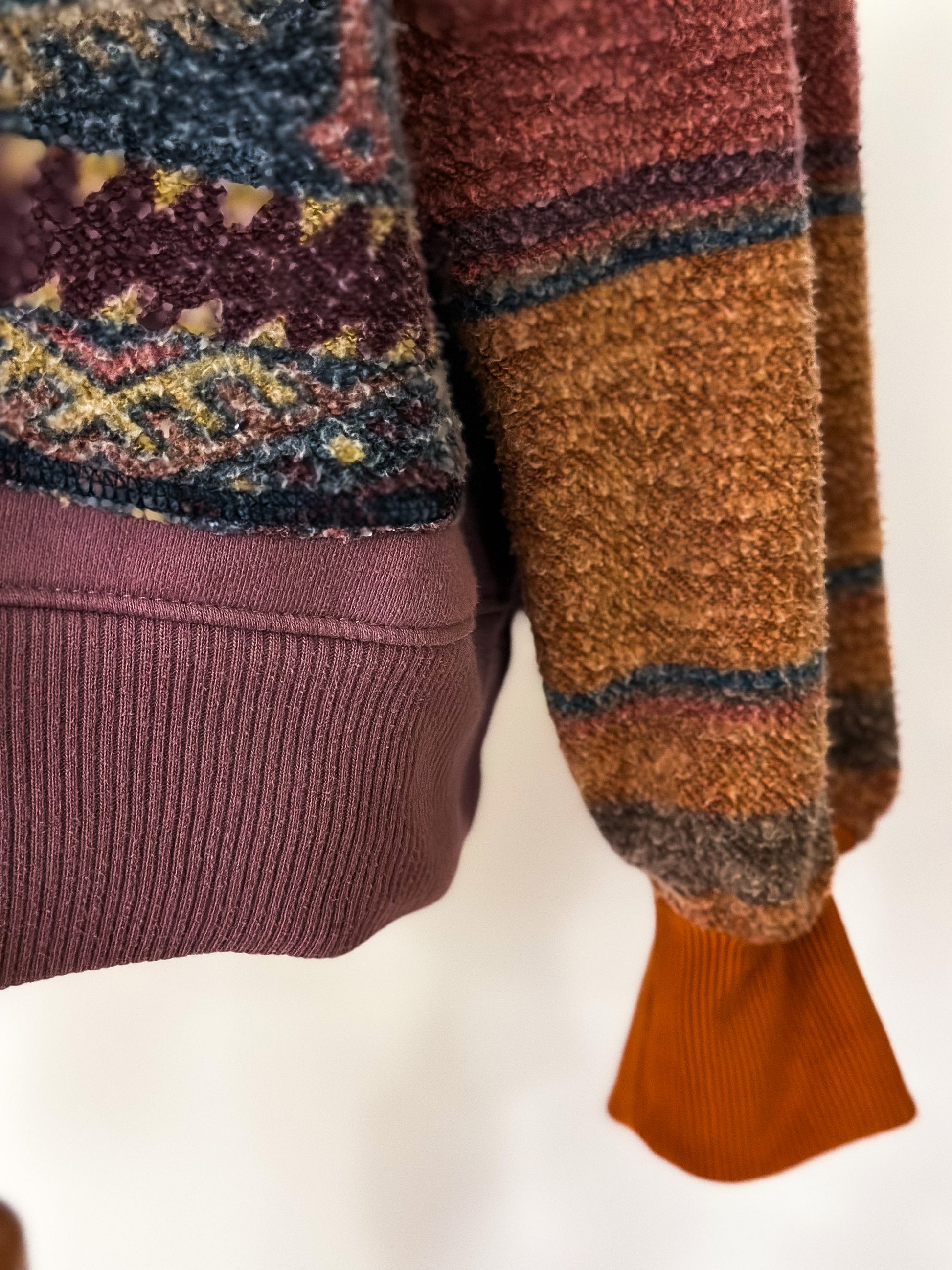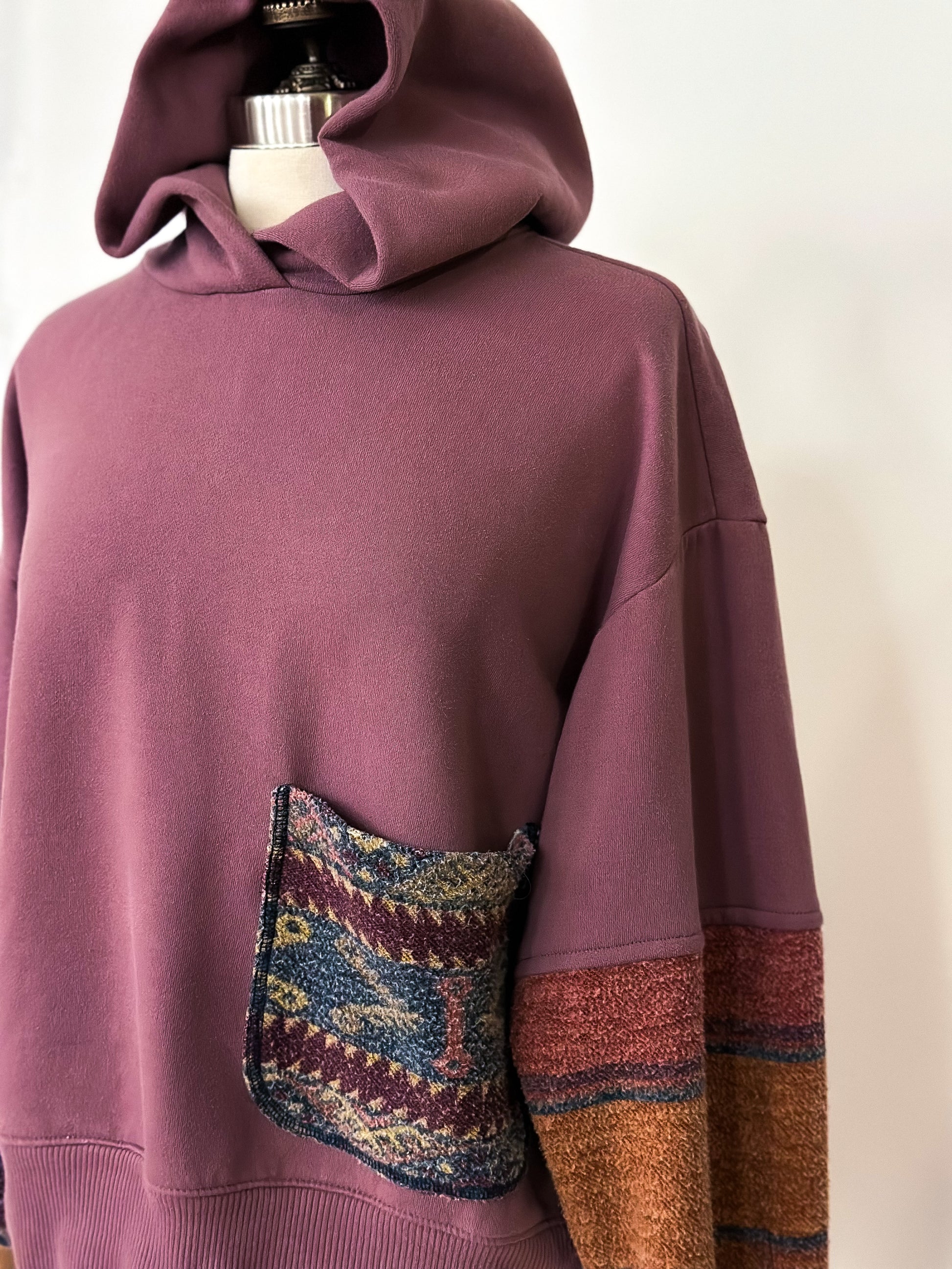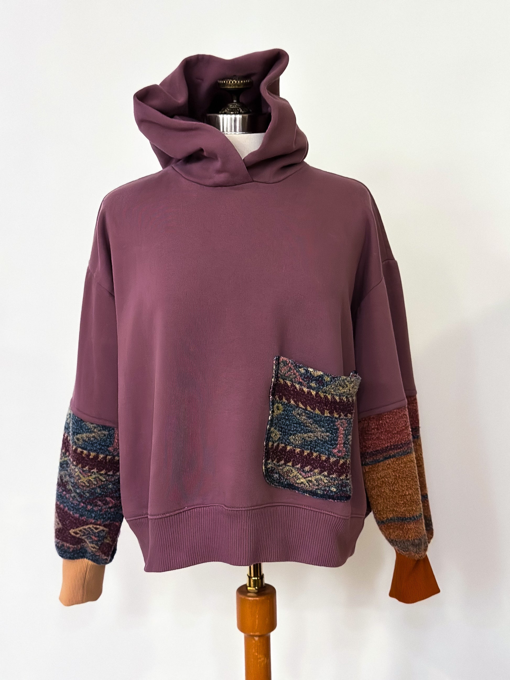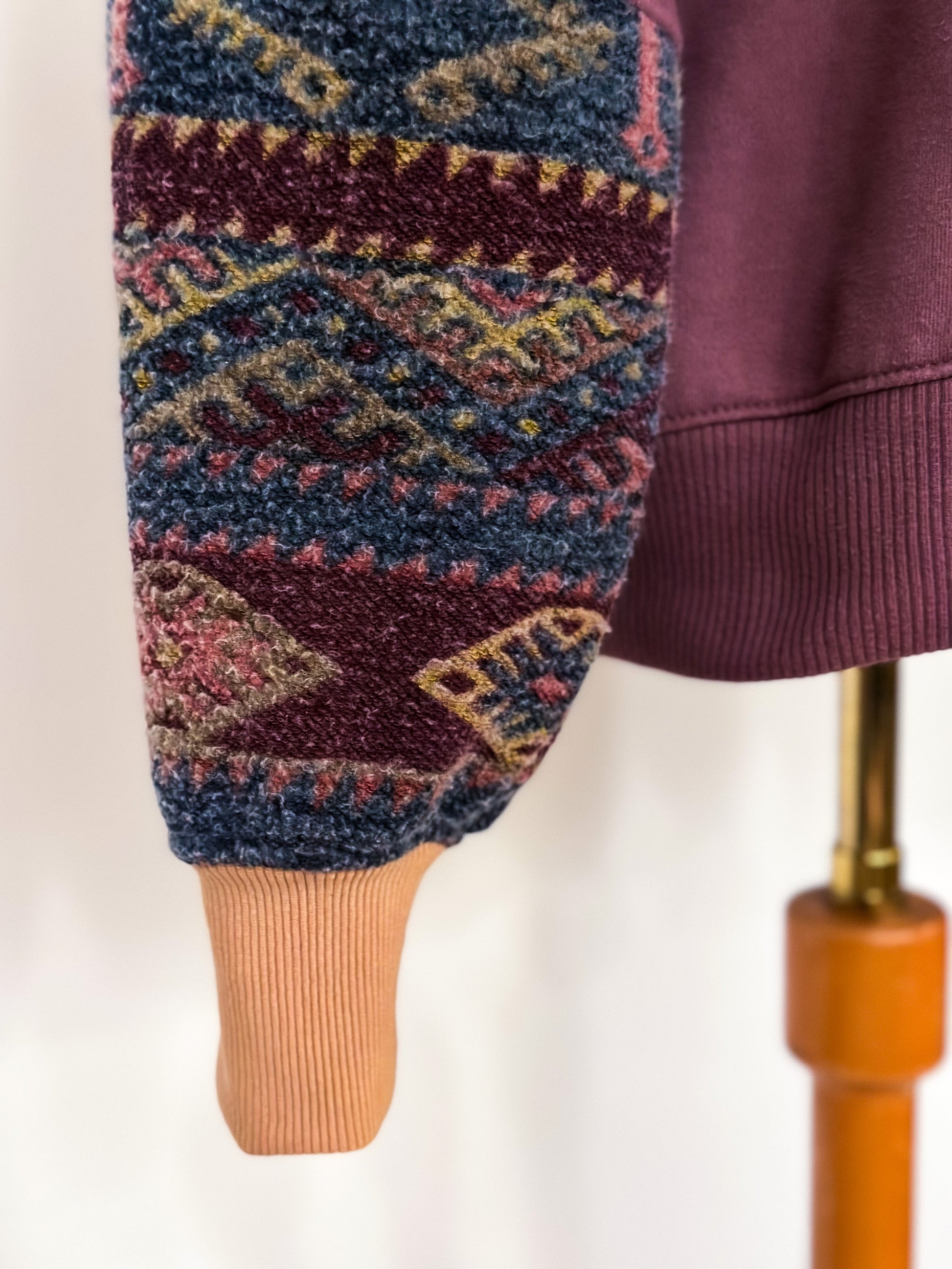 This maroon hoodie is sure to keep you warm and comfy! Crafted from upcycled materials, the aztec color blocking gives it an extra touch of style. The contrasting colors on the sleeves and pockets really sets this one apart from the others!