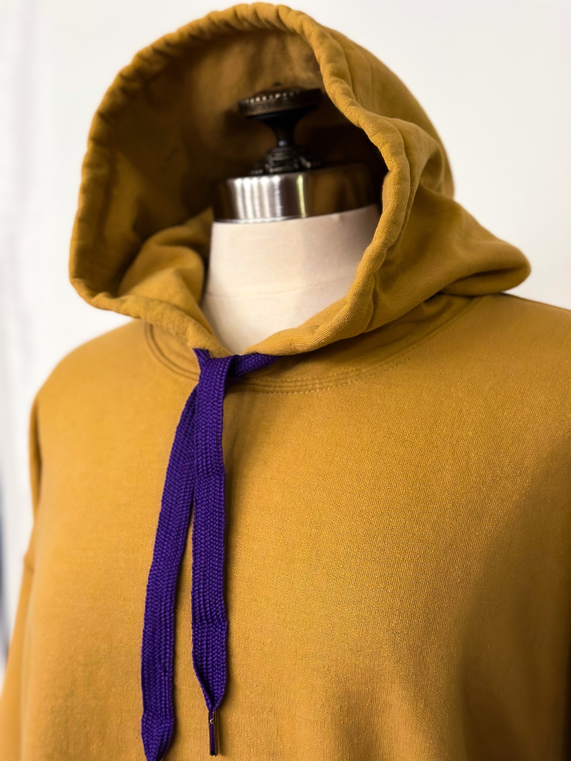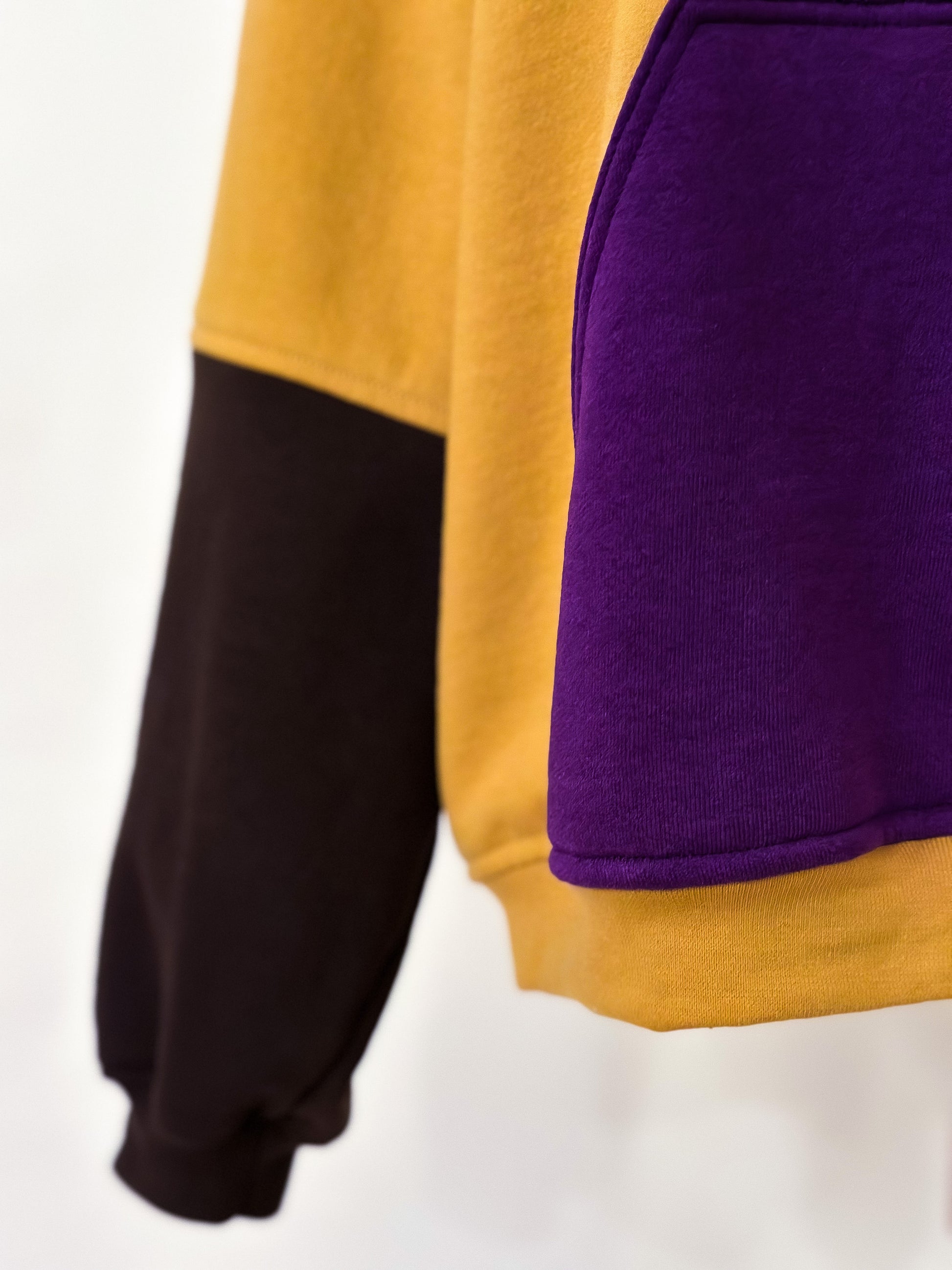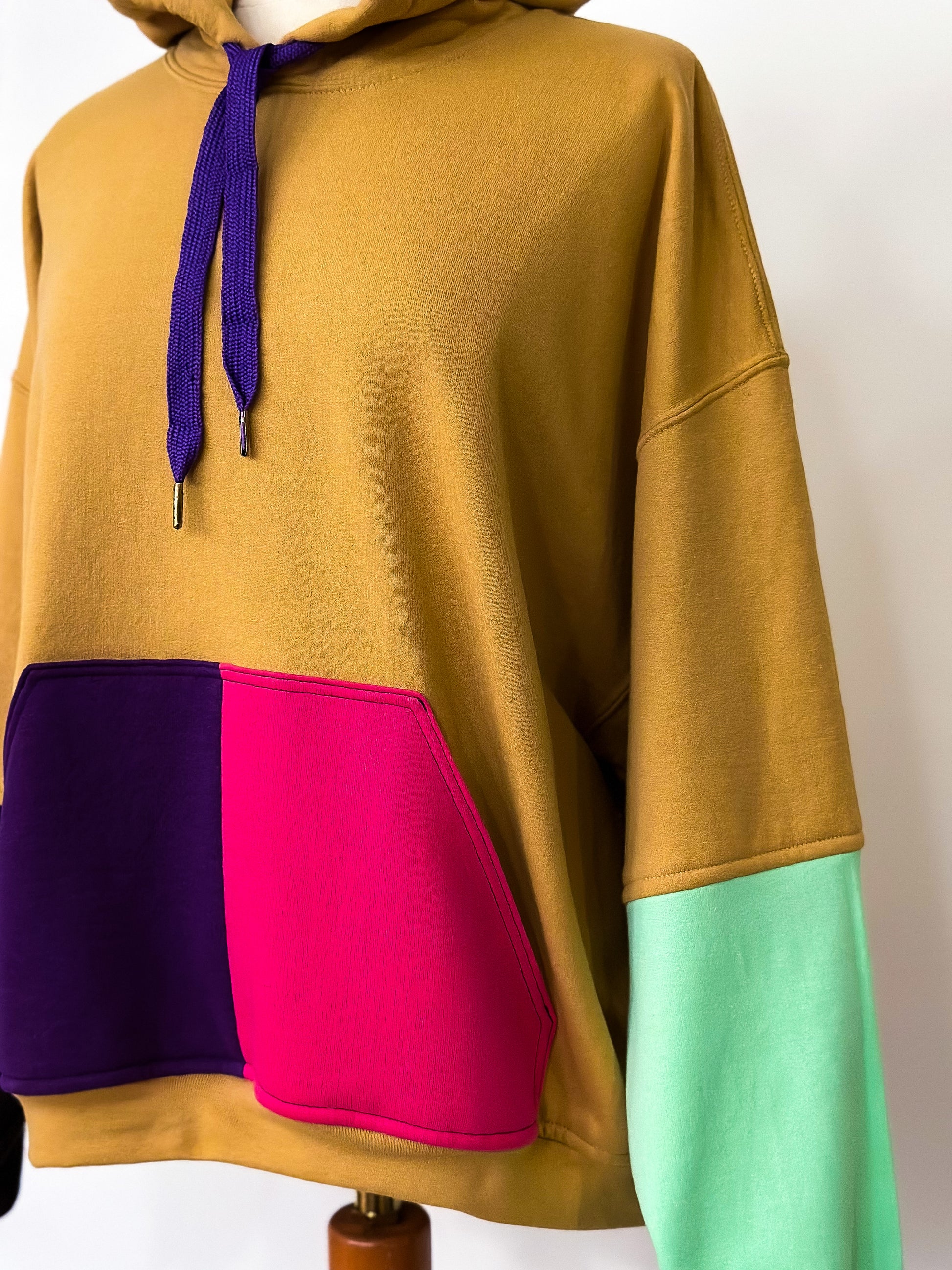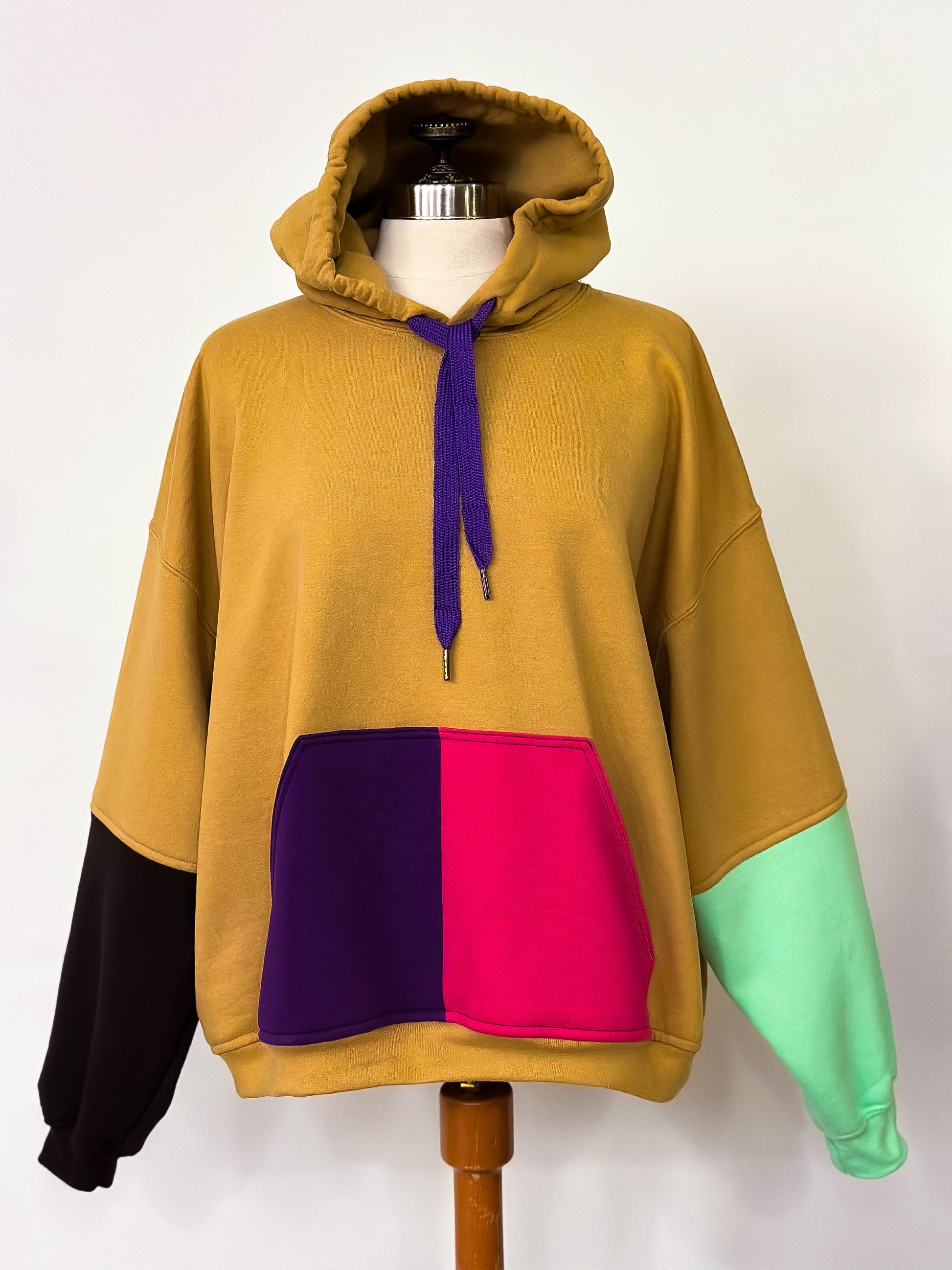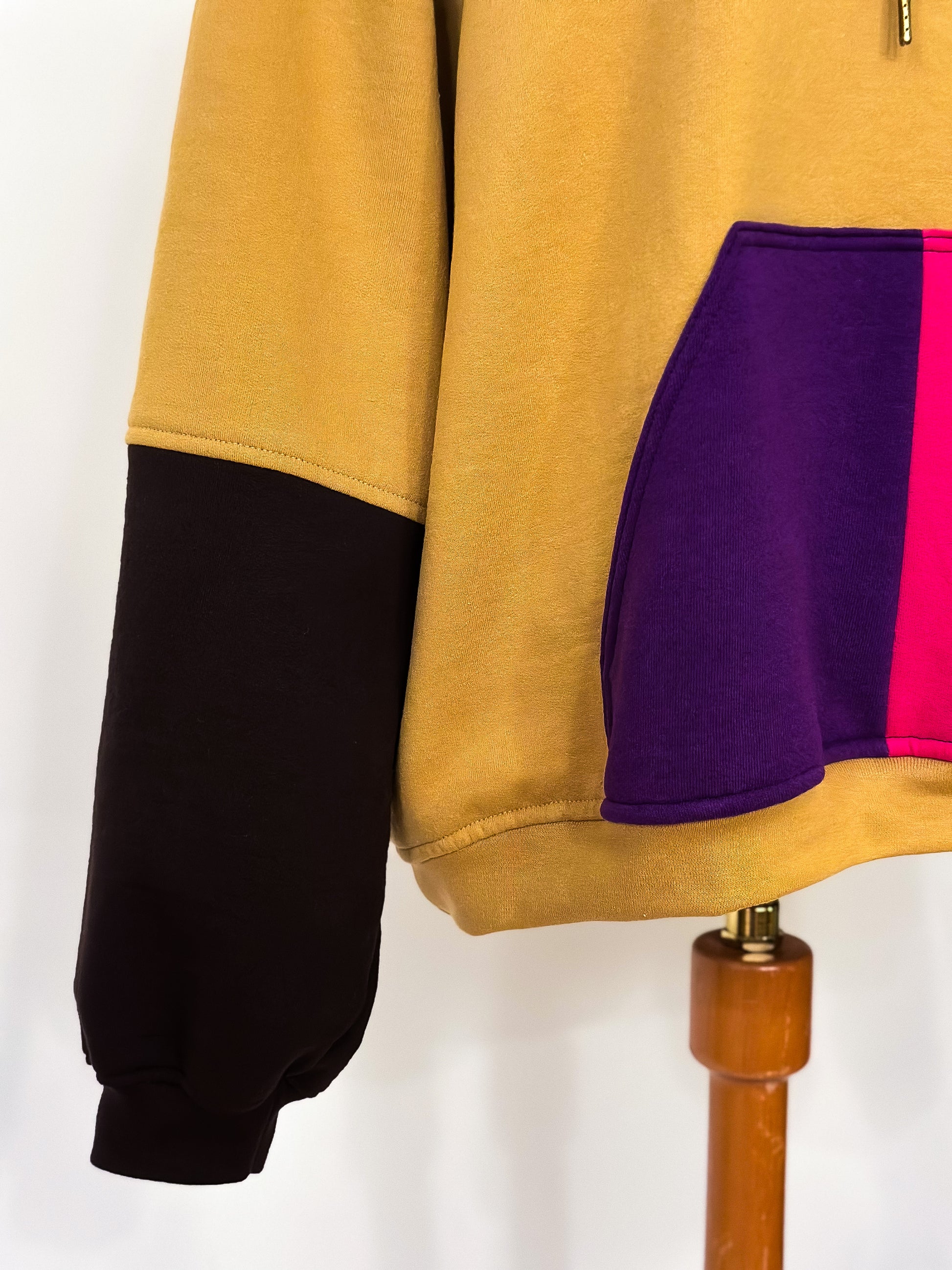 Stay warm and stylish with this unique upcycled hoodie. A bright mustard color is complemented with eye-catching pink and purple pocket, and two-tone green and brown sleeves.
