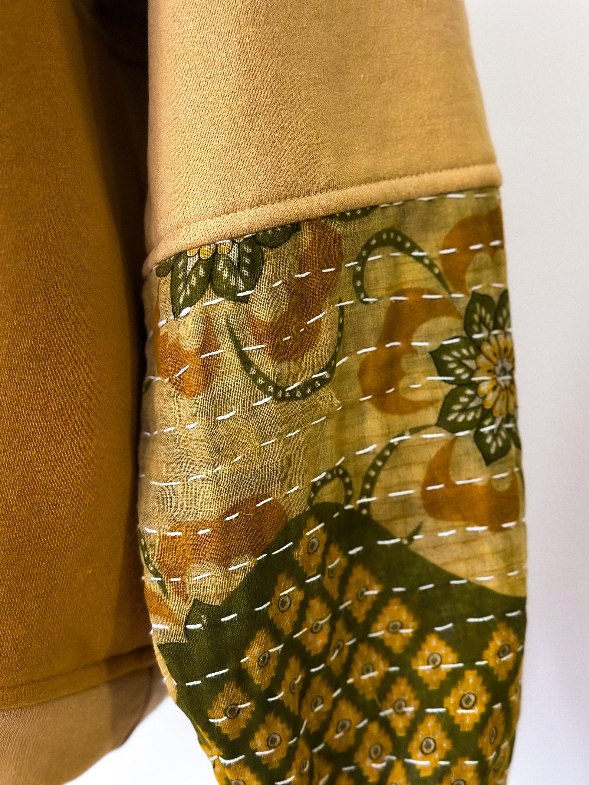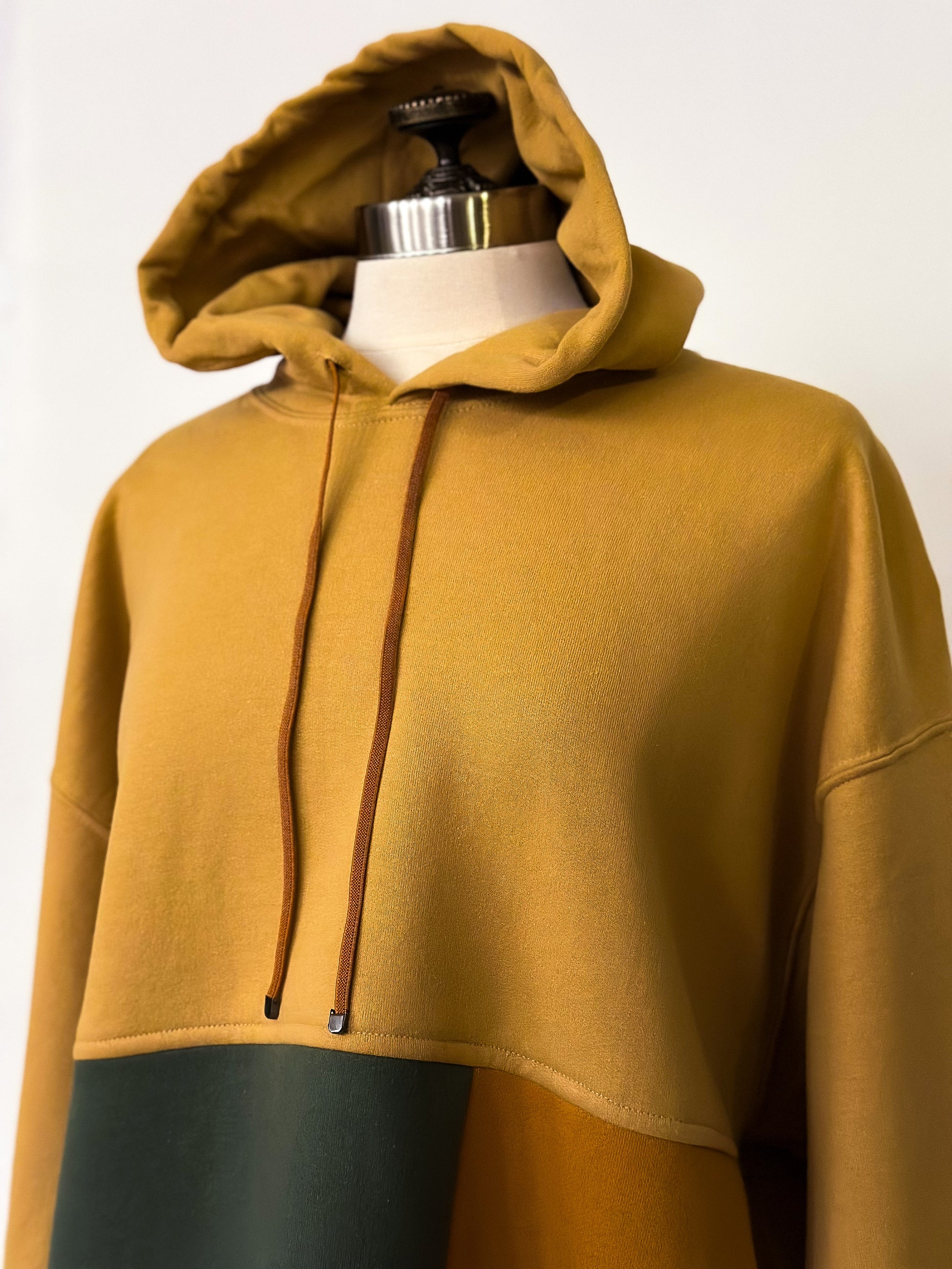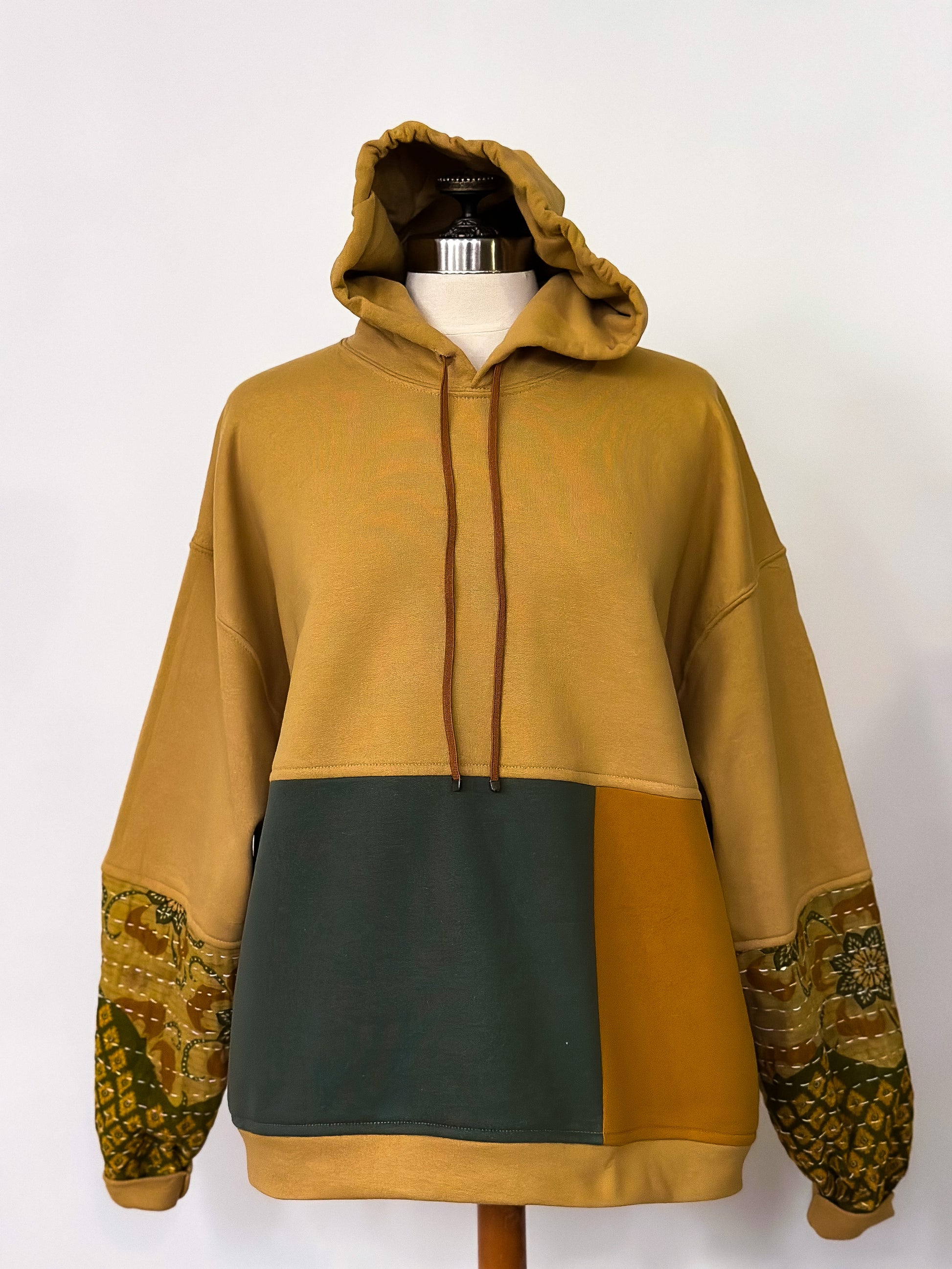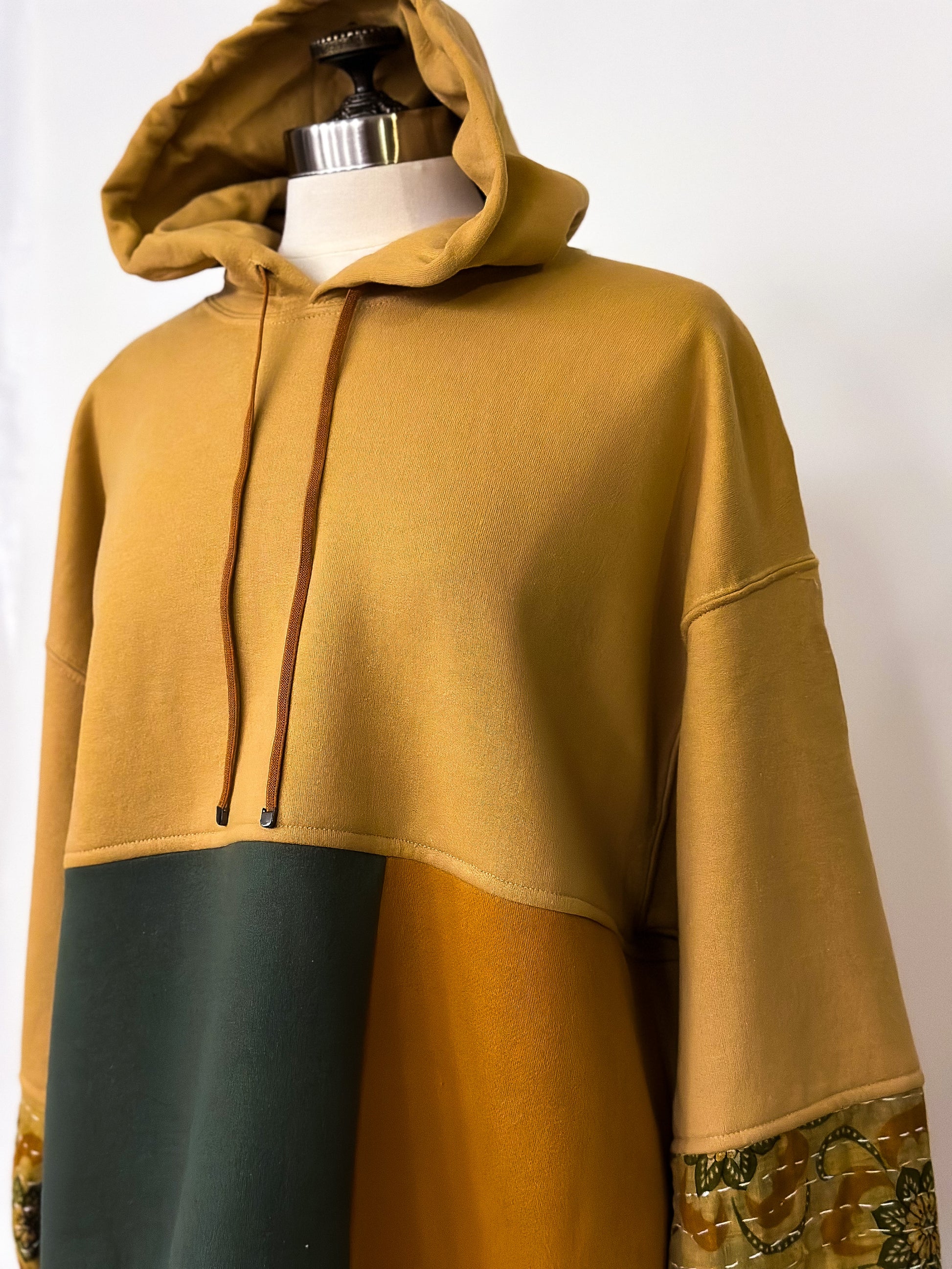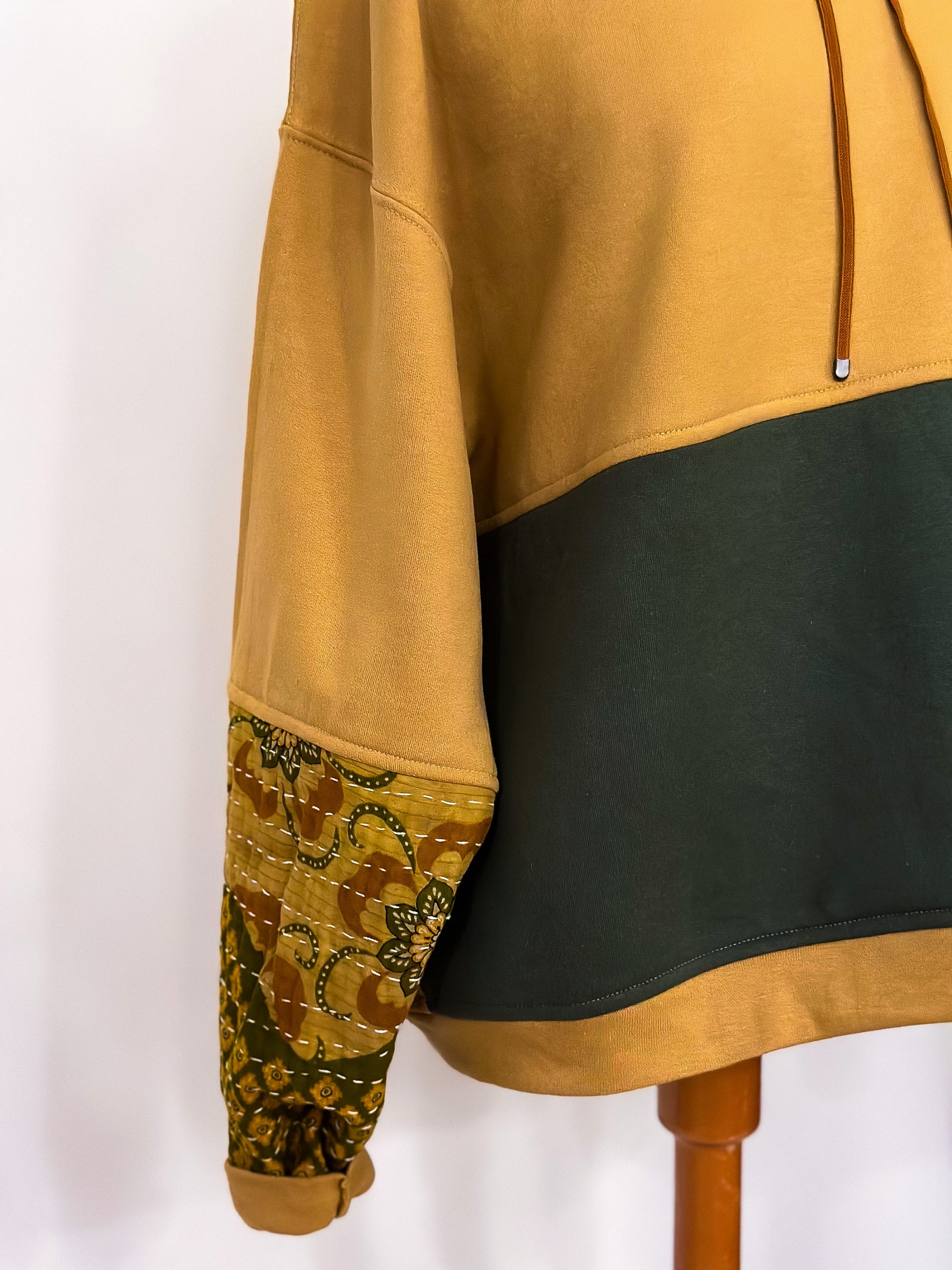 A pop of mustardy goodness! Upcycle your wardrobe with this chic hoodie featuring a color block design and quilted sleeve detail. It's the perfect punch of style and warmth to spice up any day!