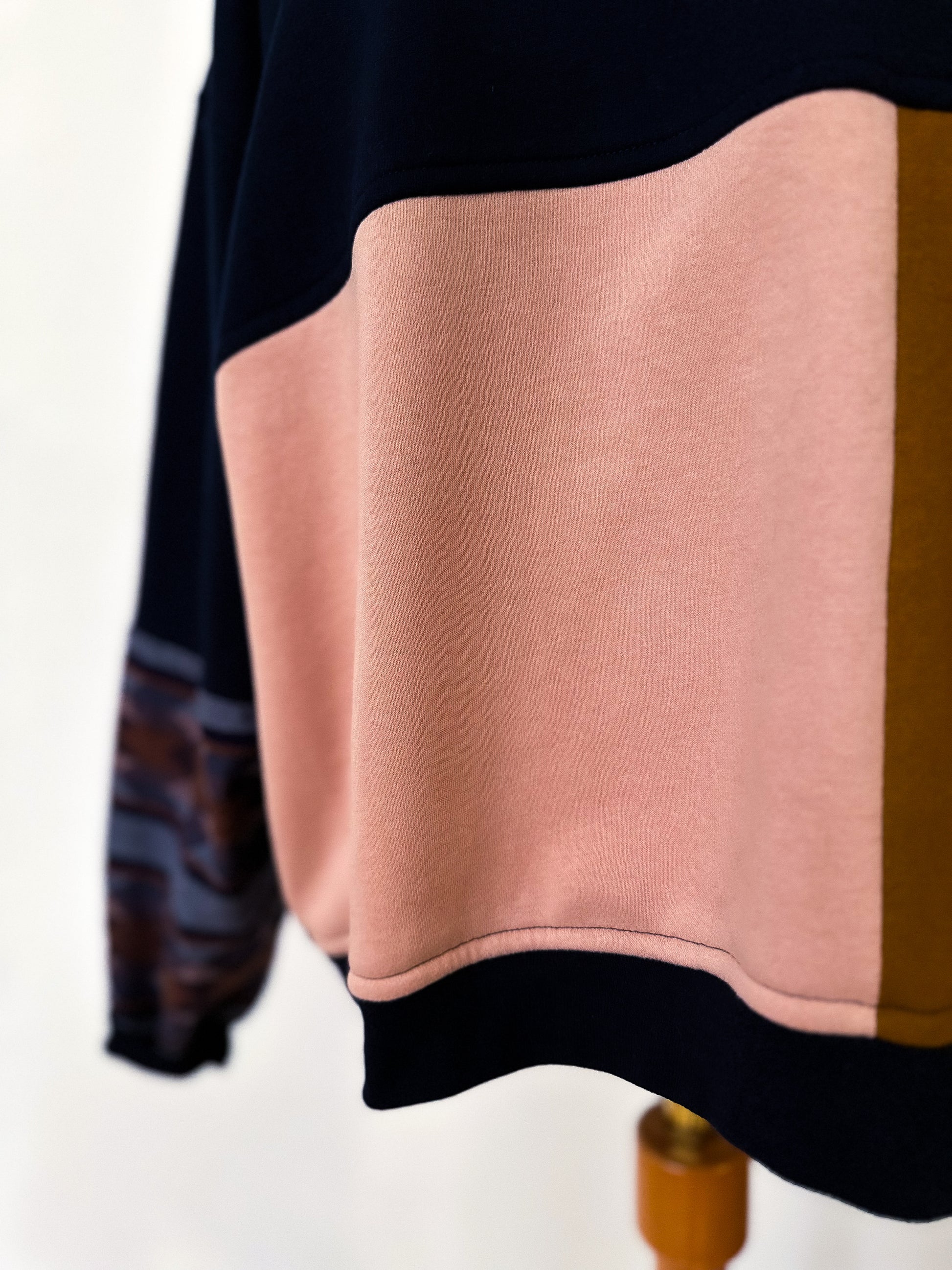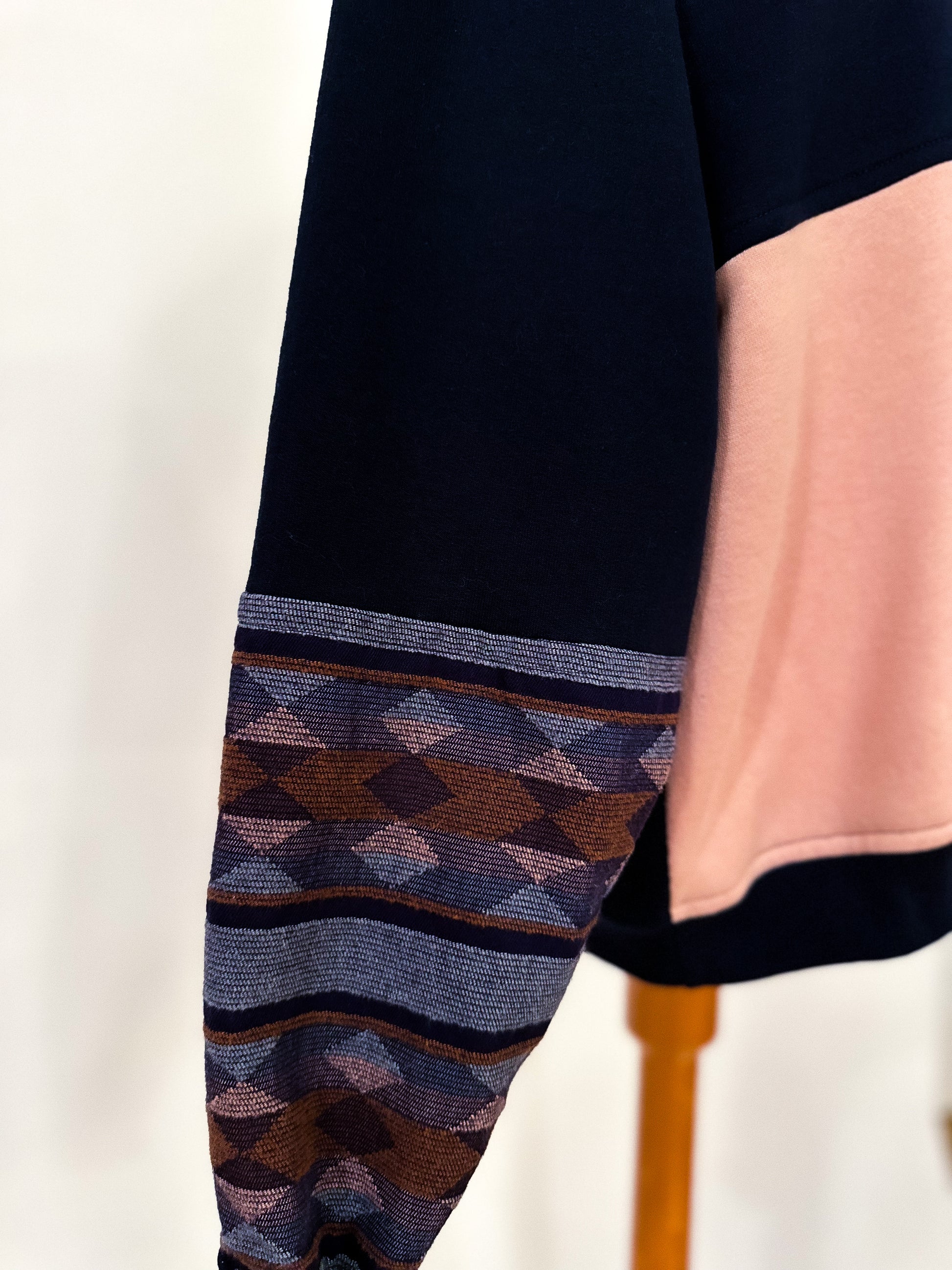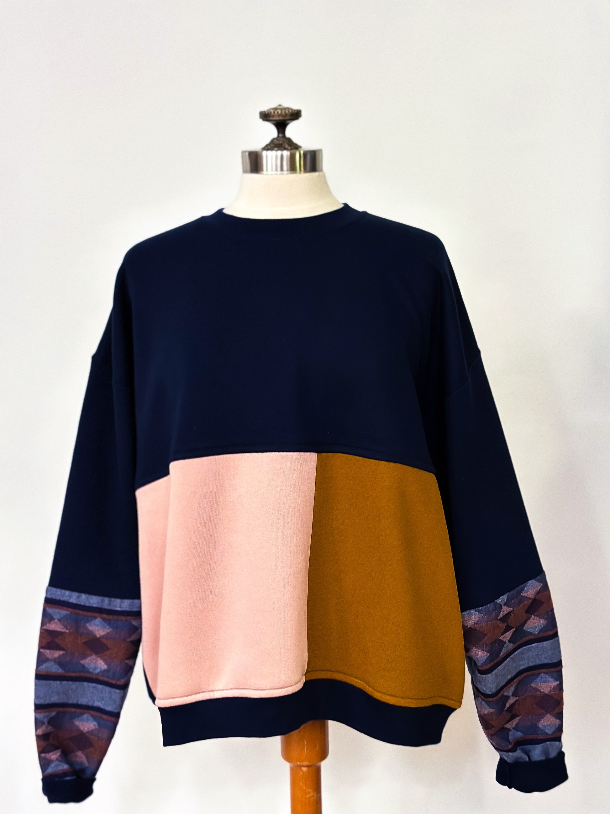 Stay warm, look cool with this upcycled crewneck. Featuring a colorblocked front and unique aztec pattern sleeve detail, your friends will be green with envy. Feel comfy and look your best with this one-of-a-kind style!