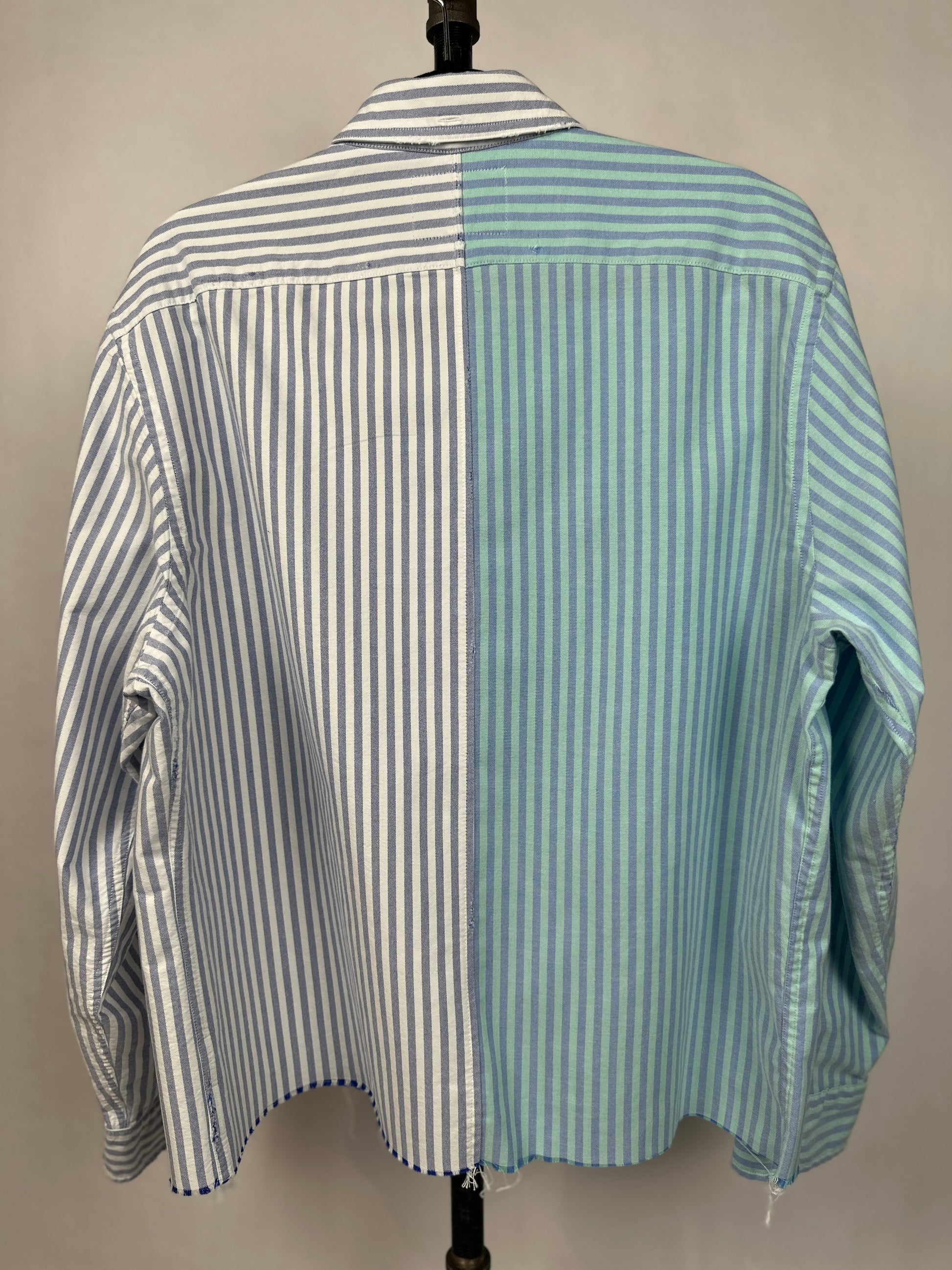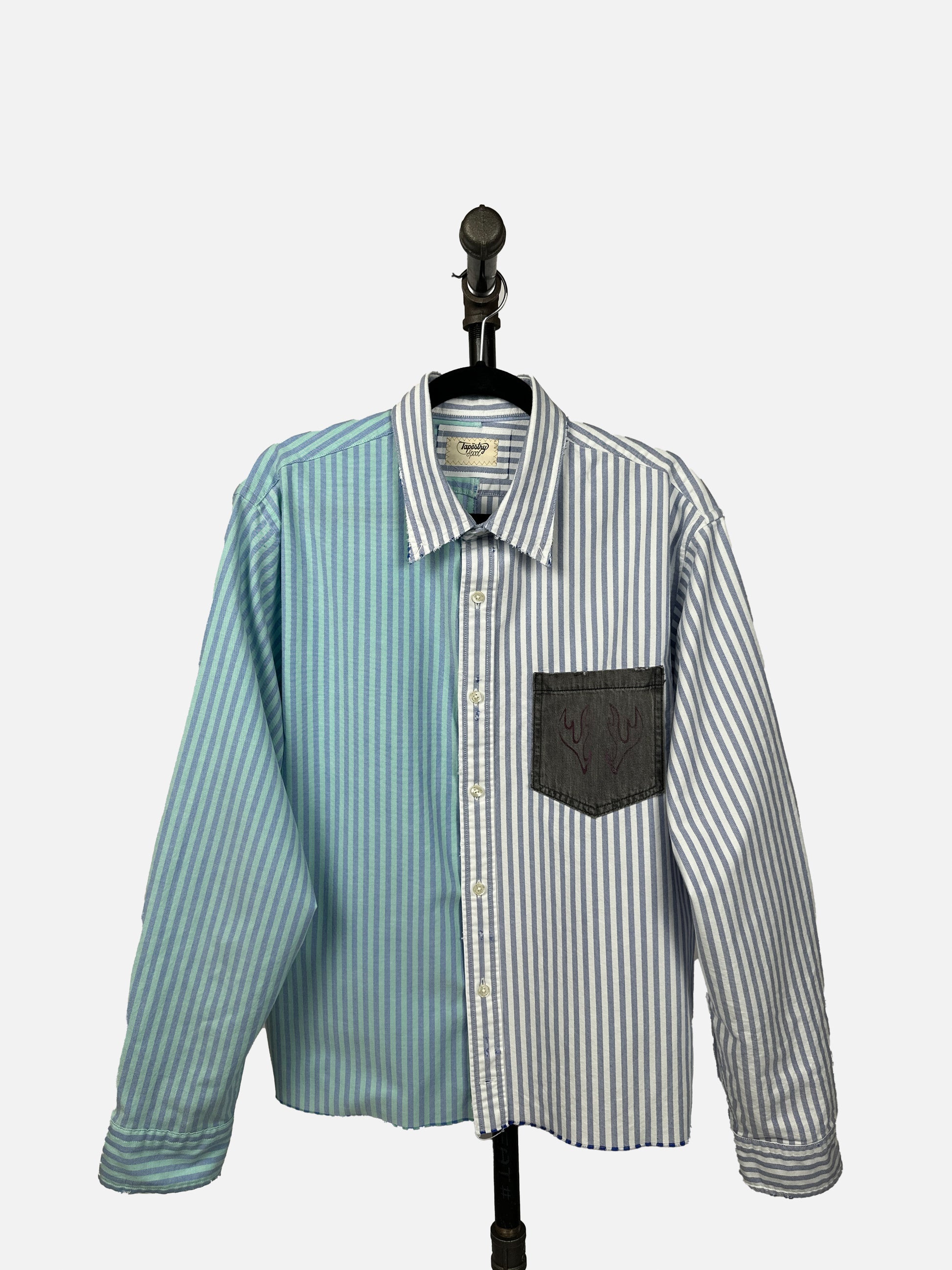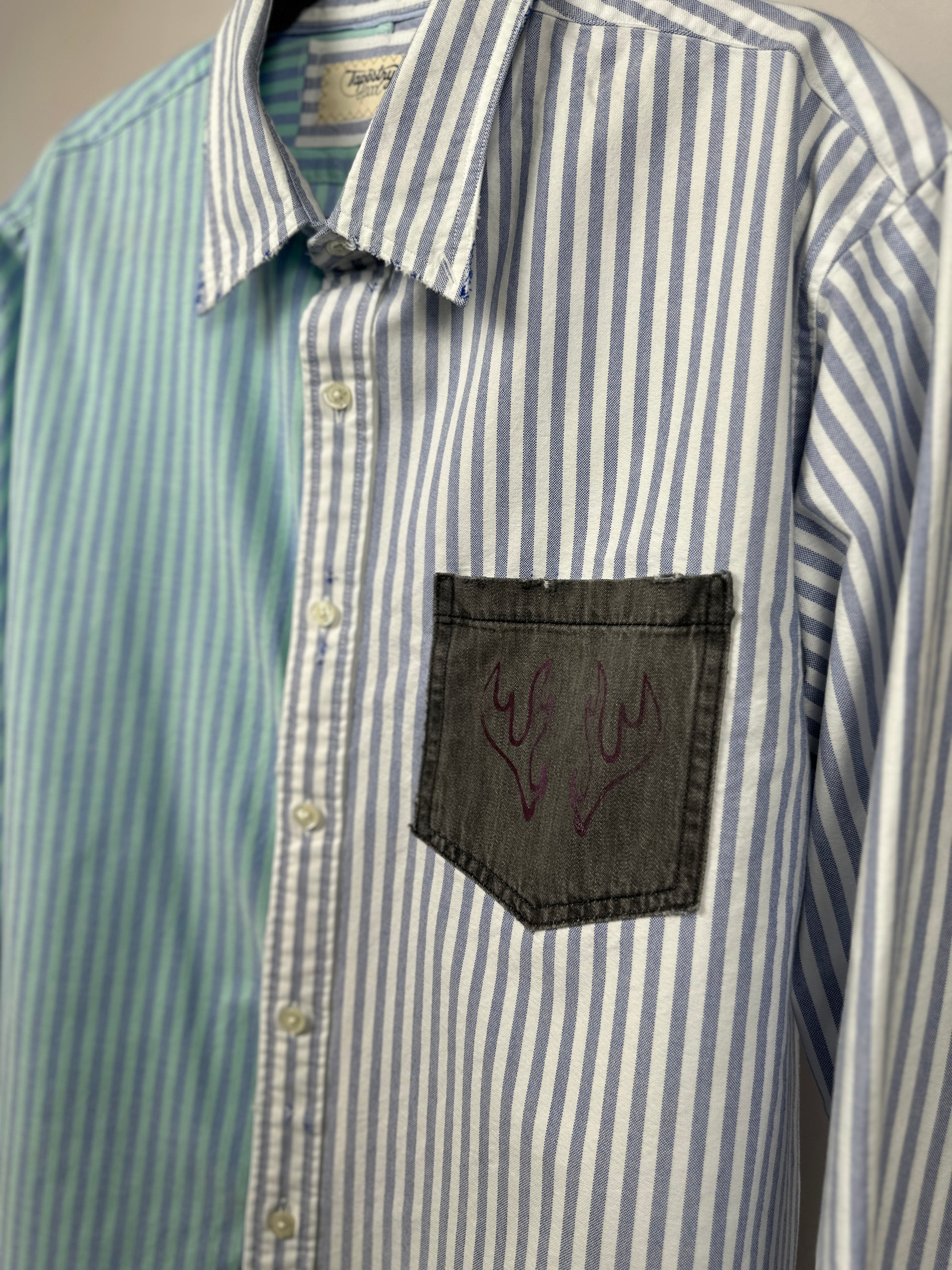 Introducing The Bobby - the playful style statement of upcycled striped shirt with a unique half-and-half design. Features a contrasting pocket for an added touch of quirkiness. Express your fun and eco-friendly side with The Bobby!