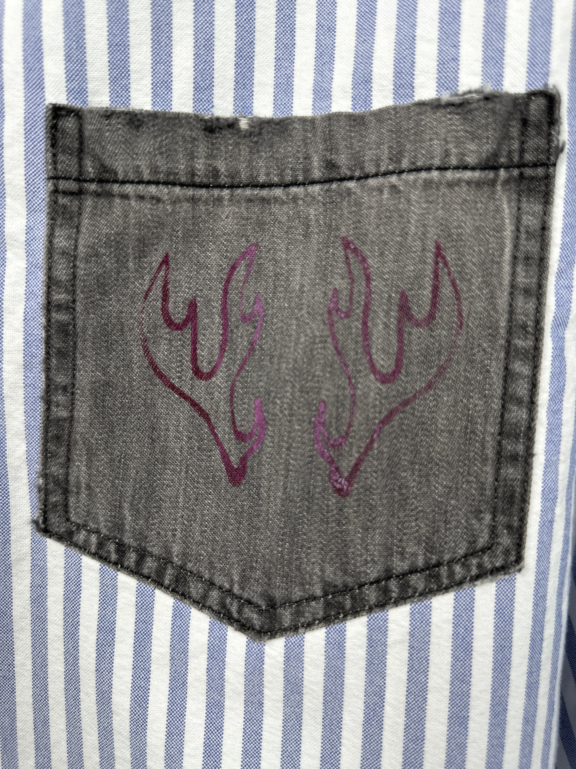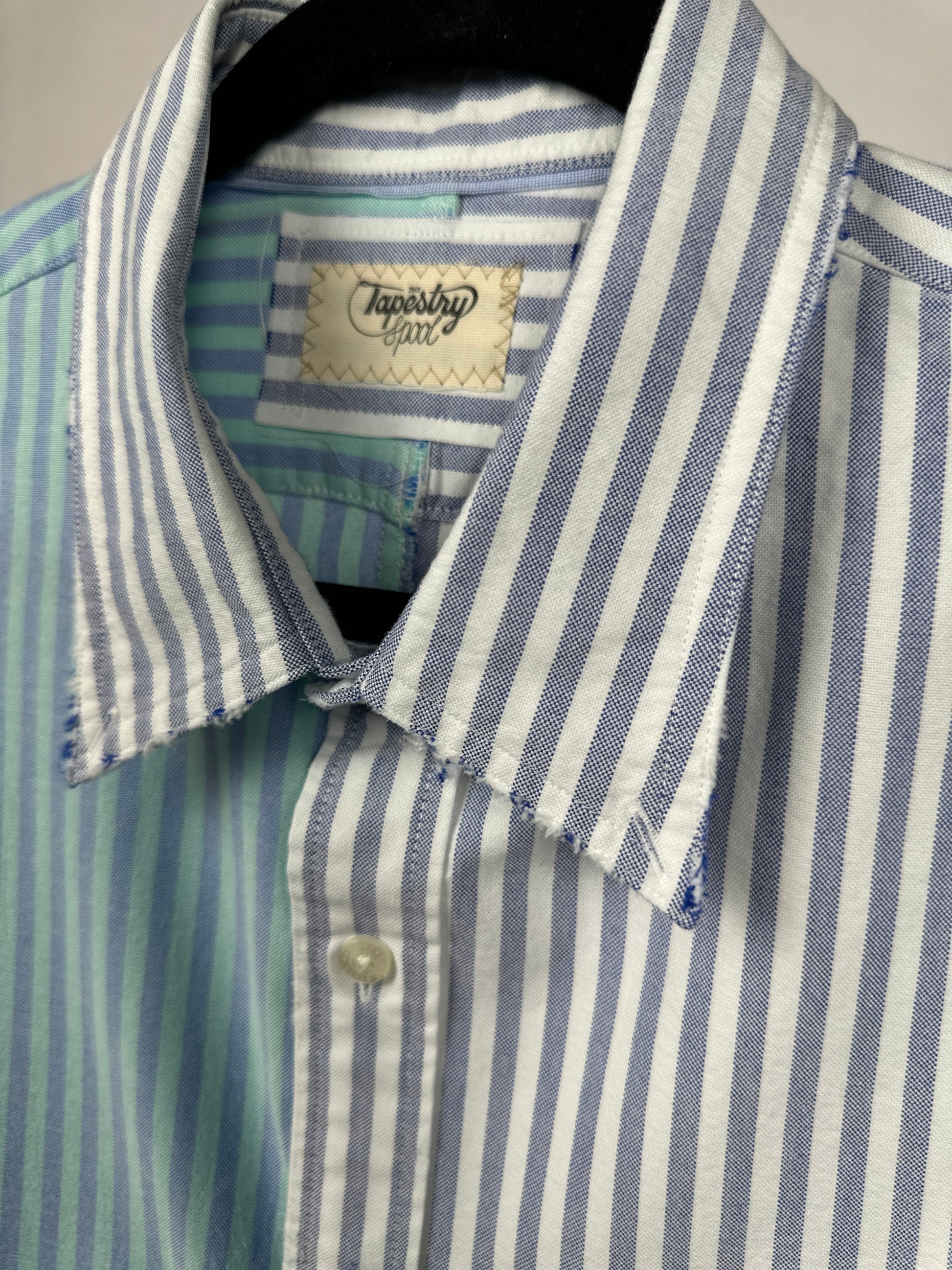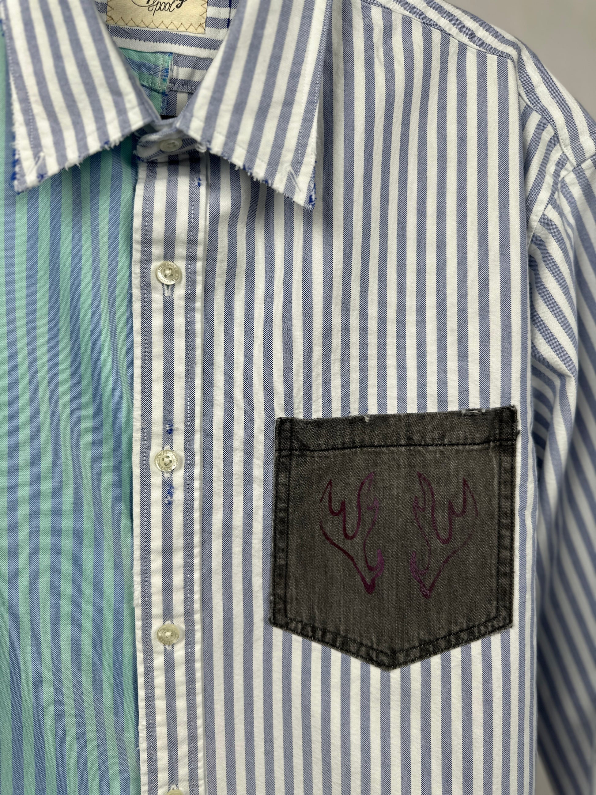 Introducing The Bobby - the playful style statement of upcycled striped shirt with a unique half-and-half design. Features a contrasting pocket for an added touch of quirkiness. Express your fun and eco-friendly side with The Bobby!
