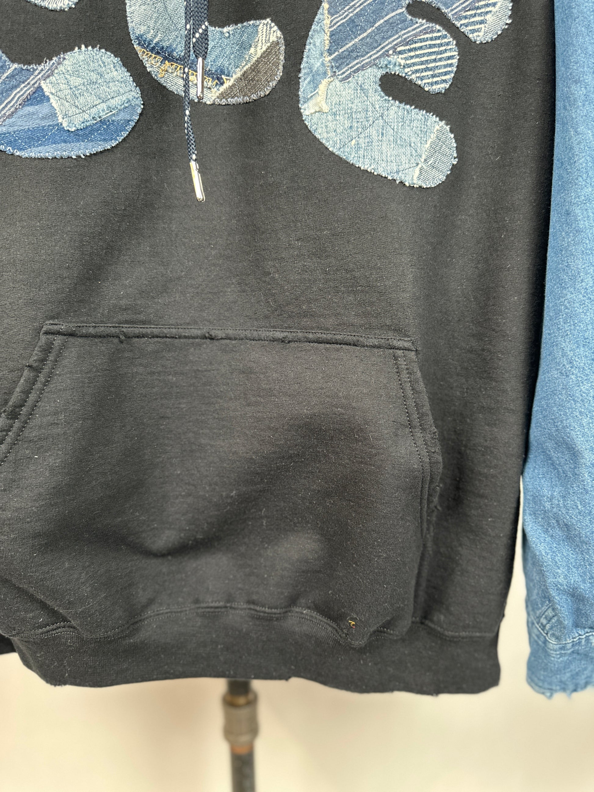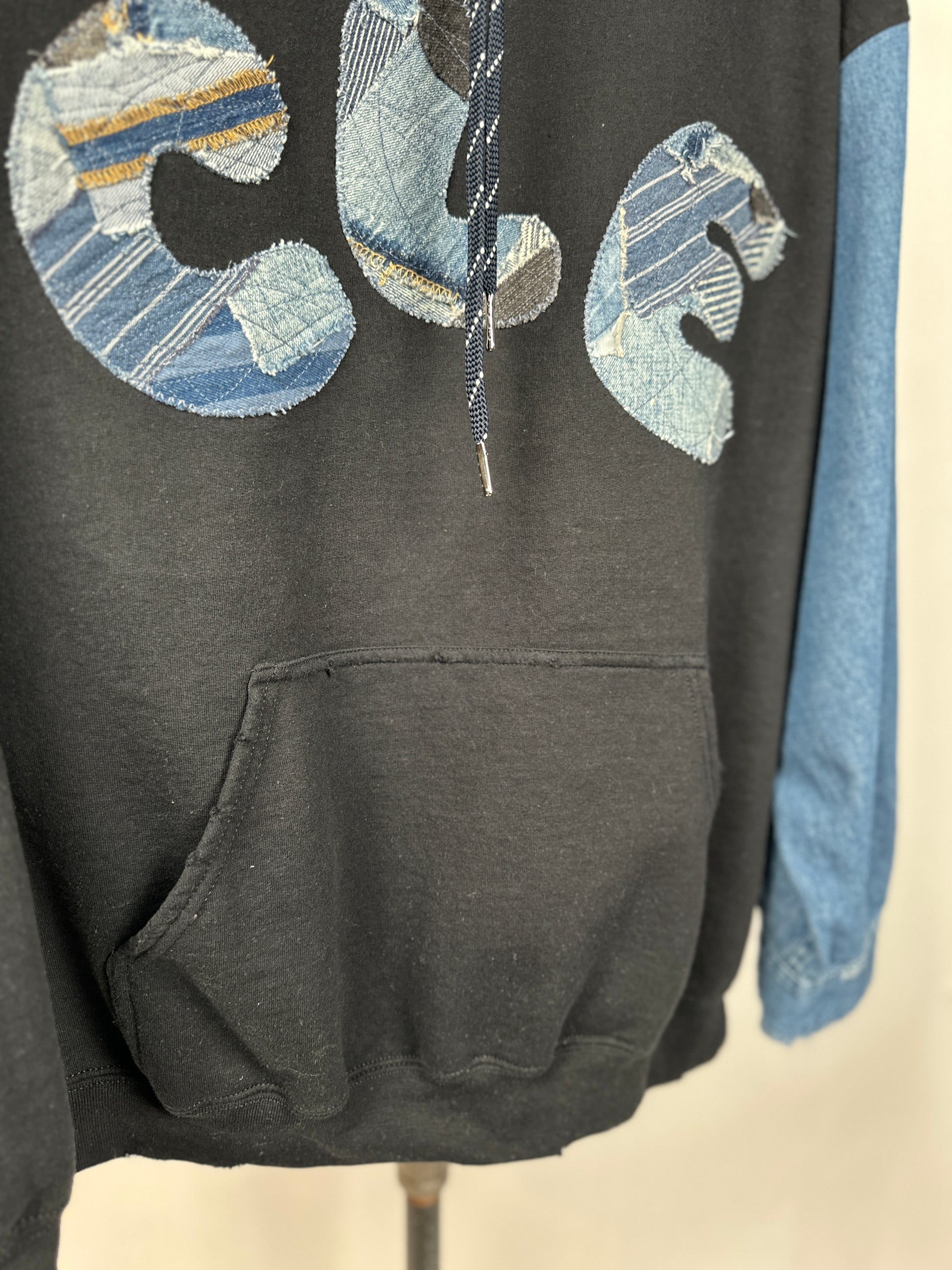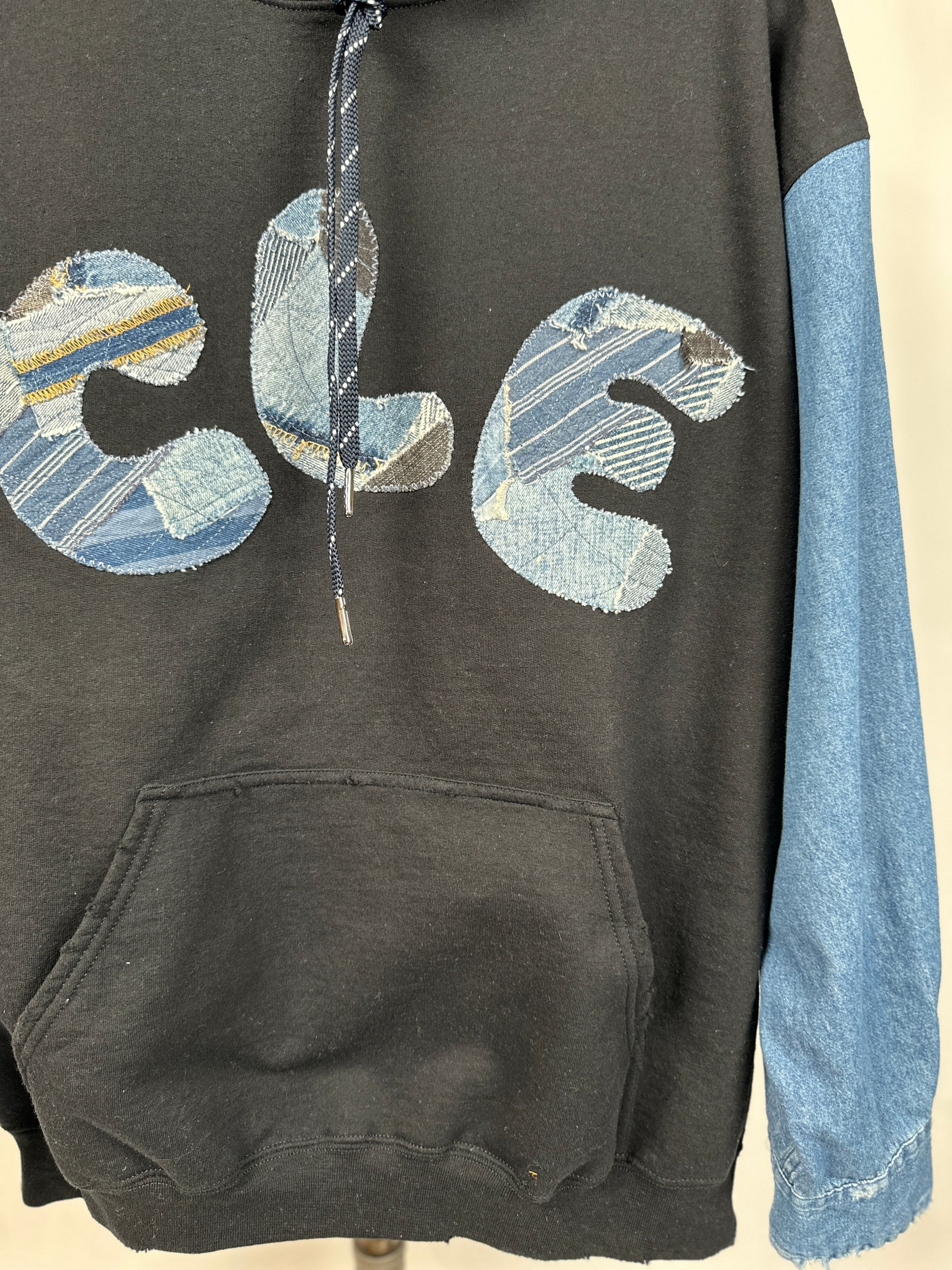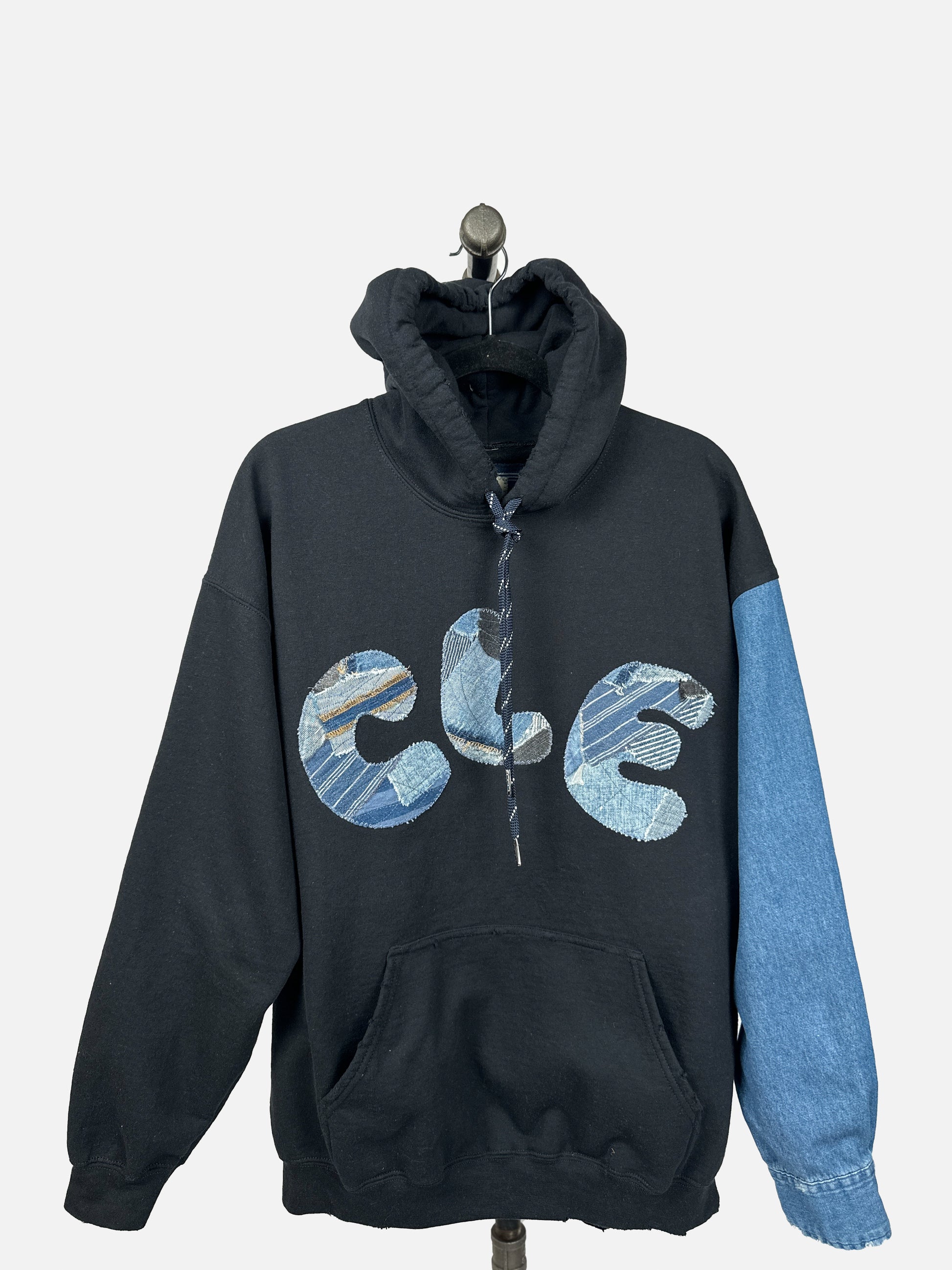 Wear your eco-consciousness on your sleeve (literally) with The CLE, our trendy upcycled hoodie. Stand out with bold CLE patched letters and unique contrasting denim sleeve, complete with edgy distressed edges.