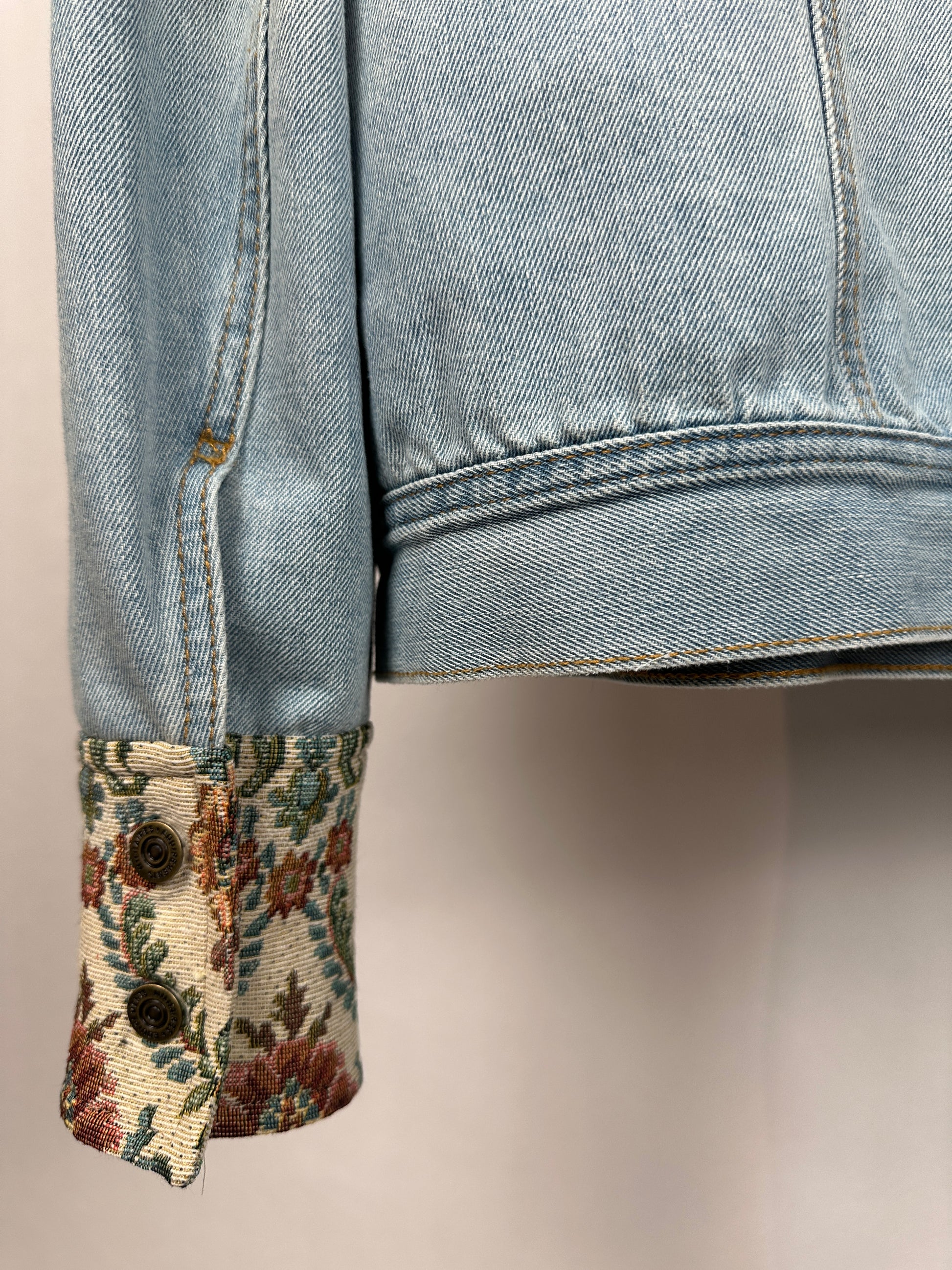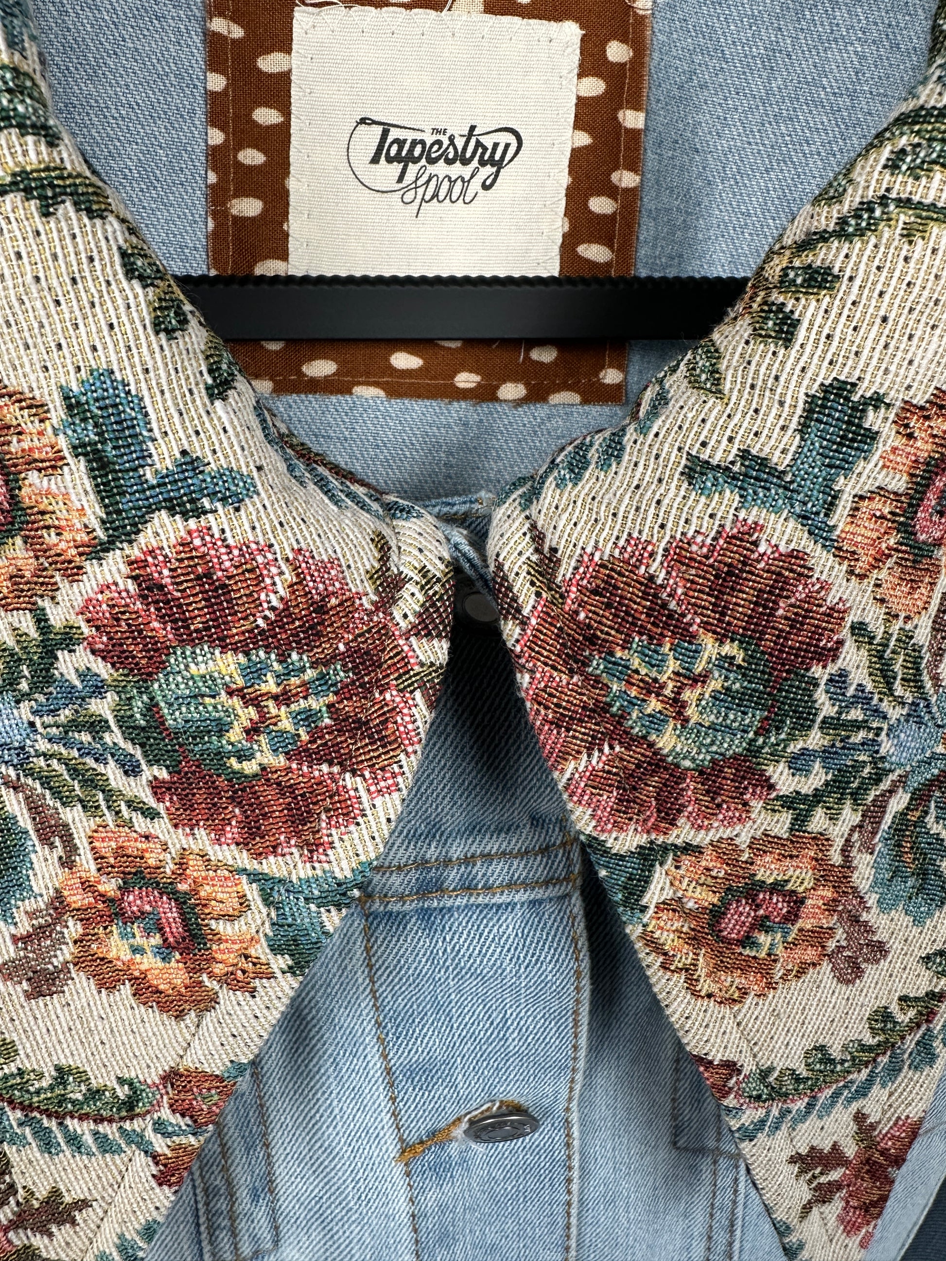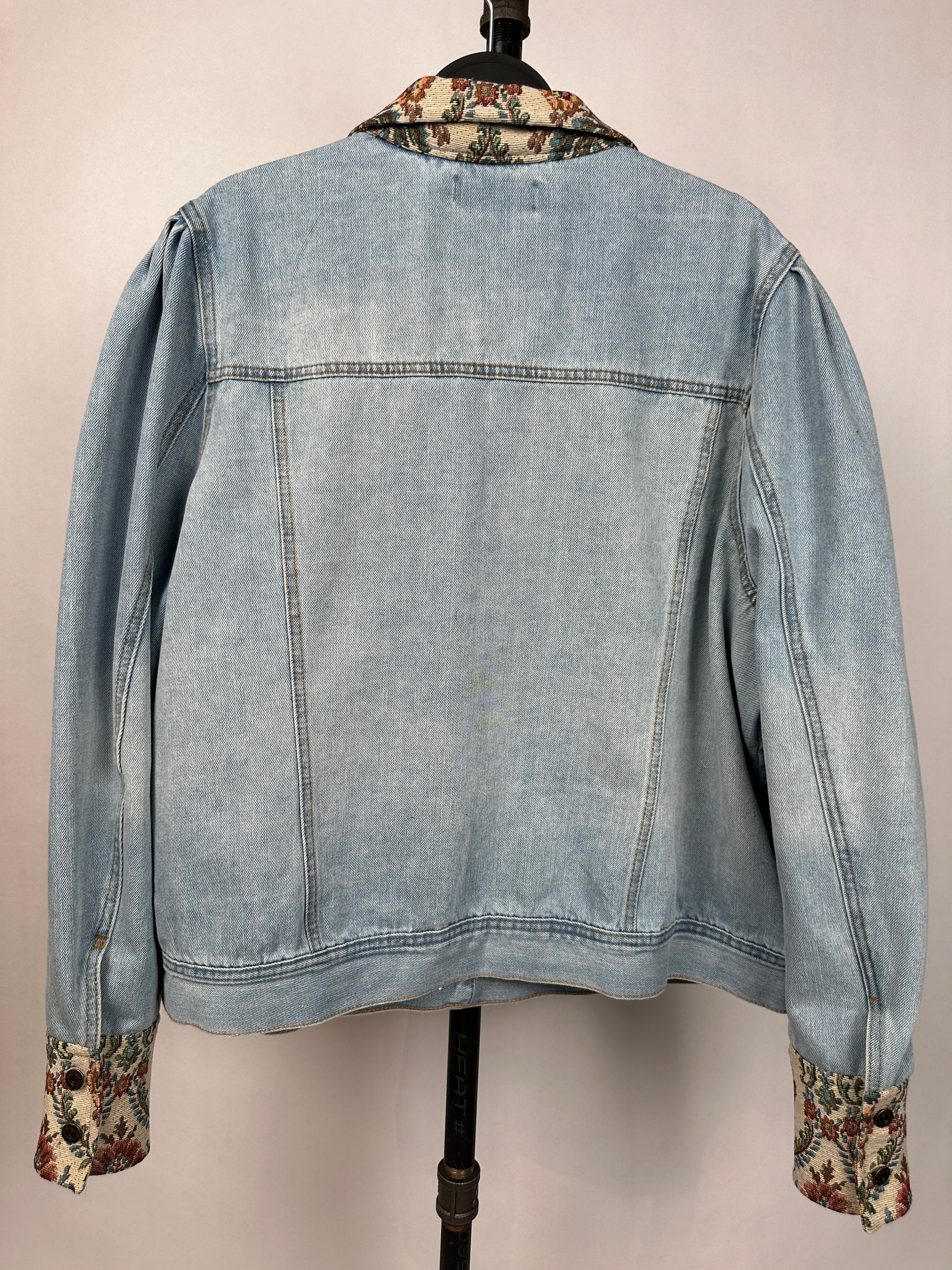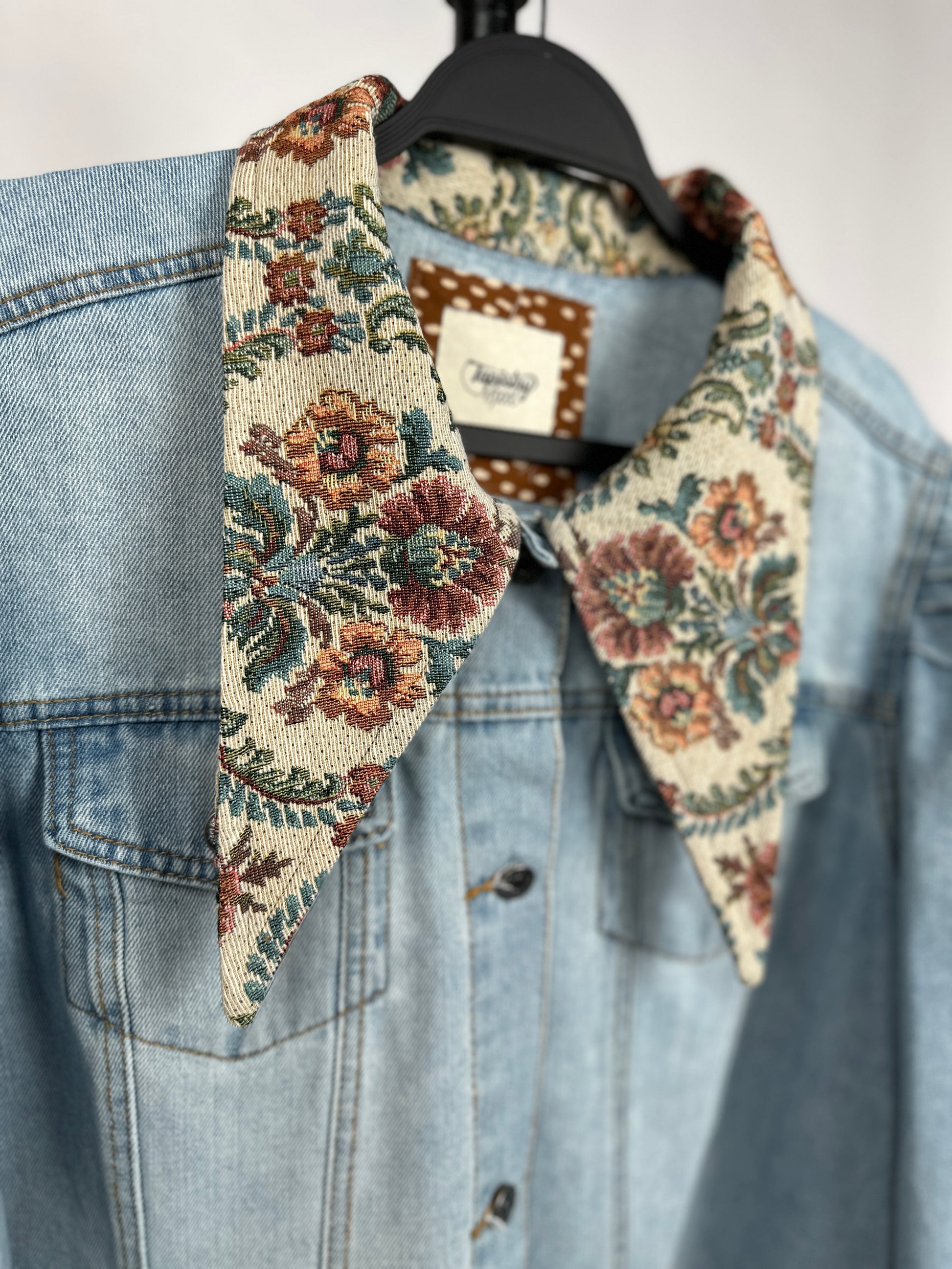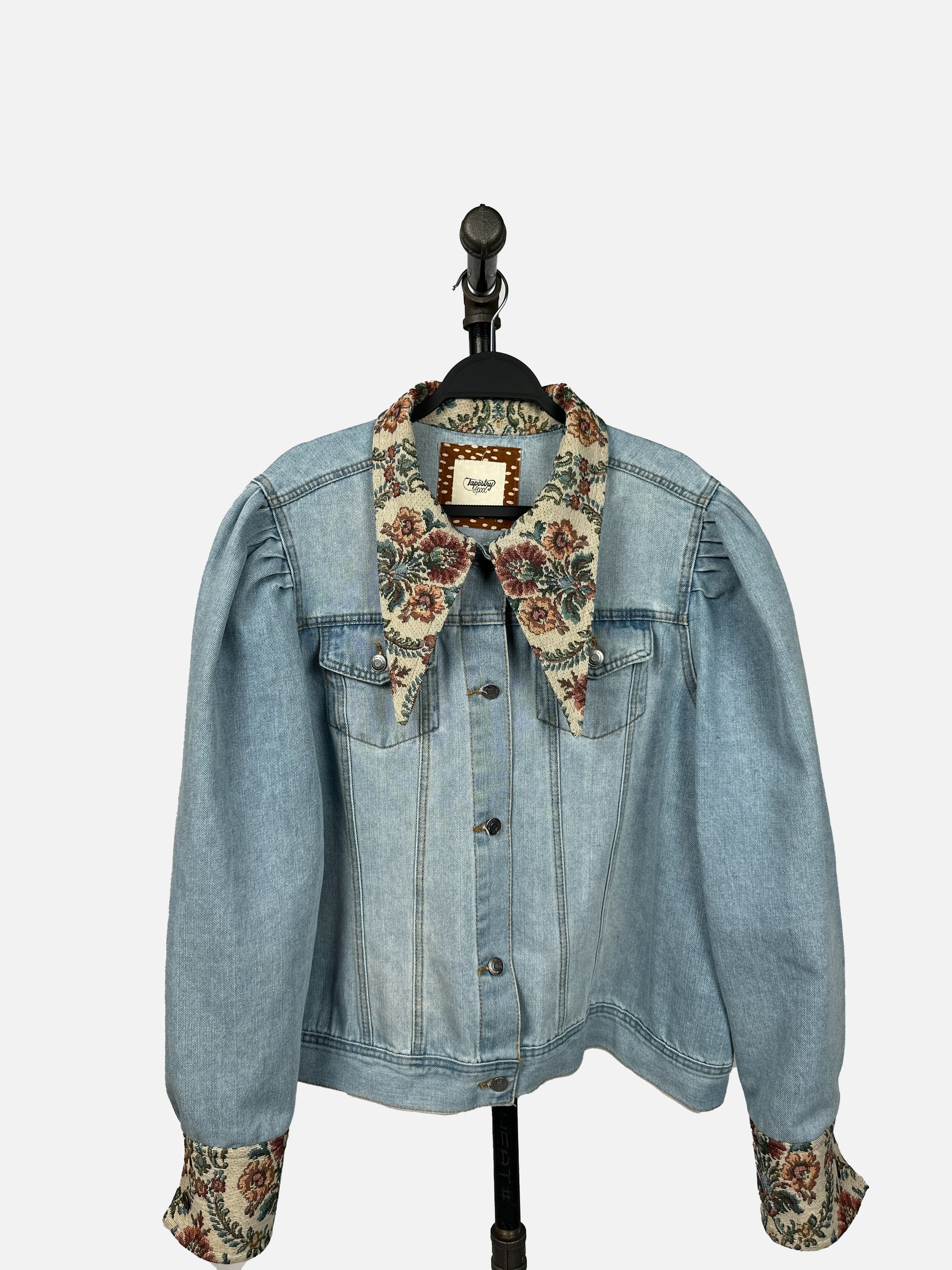 Be bold and eco-friendly with The Bentley! This upcycled denim jacket features an exaggerated collar and cuffs in a unique tapestry fabric. The oversized fit and pleated sleeve/shoulder detail add edgy flair to your wardrobe. Perfect to wear alone or as a layer, easy to dress up or down!