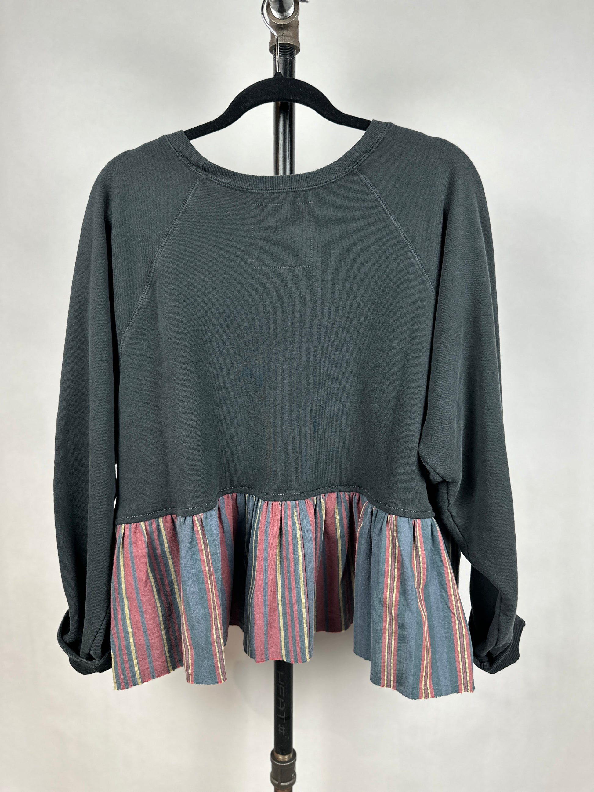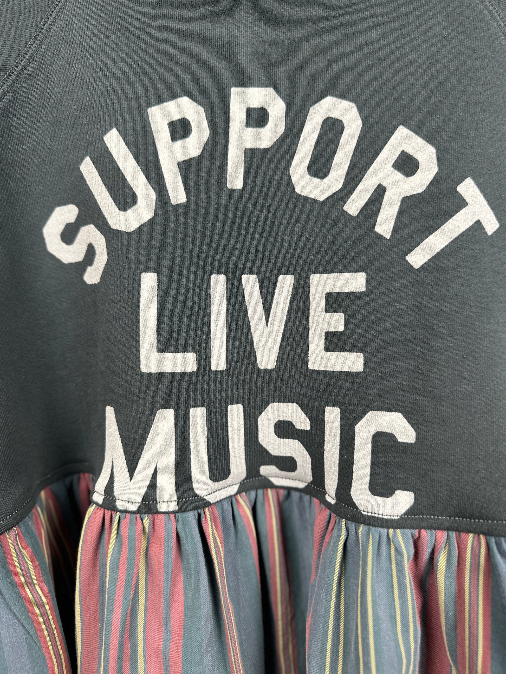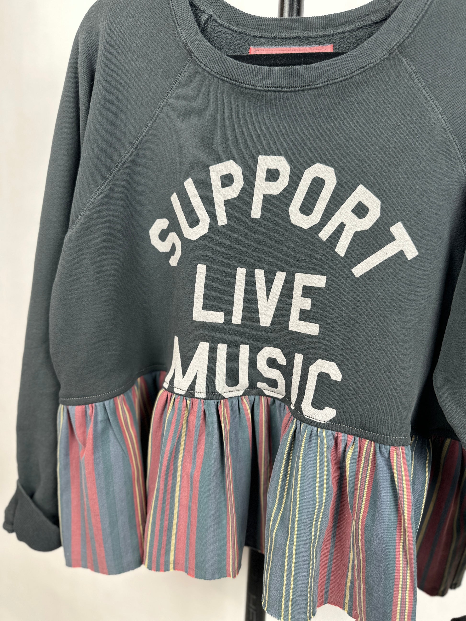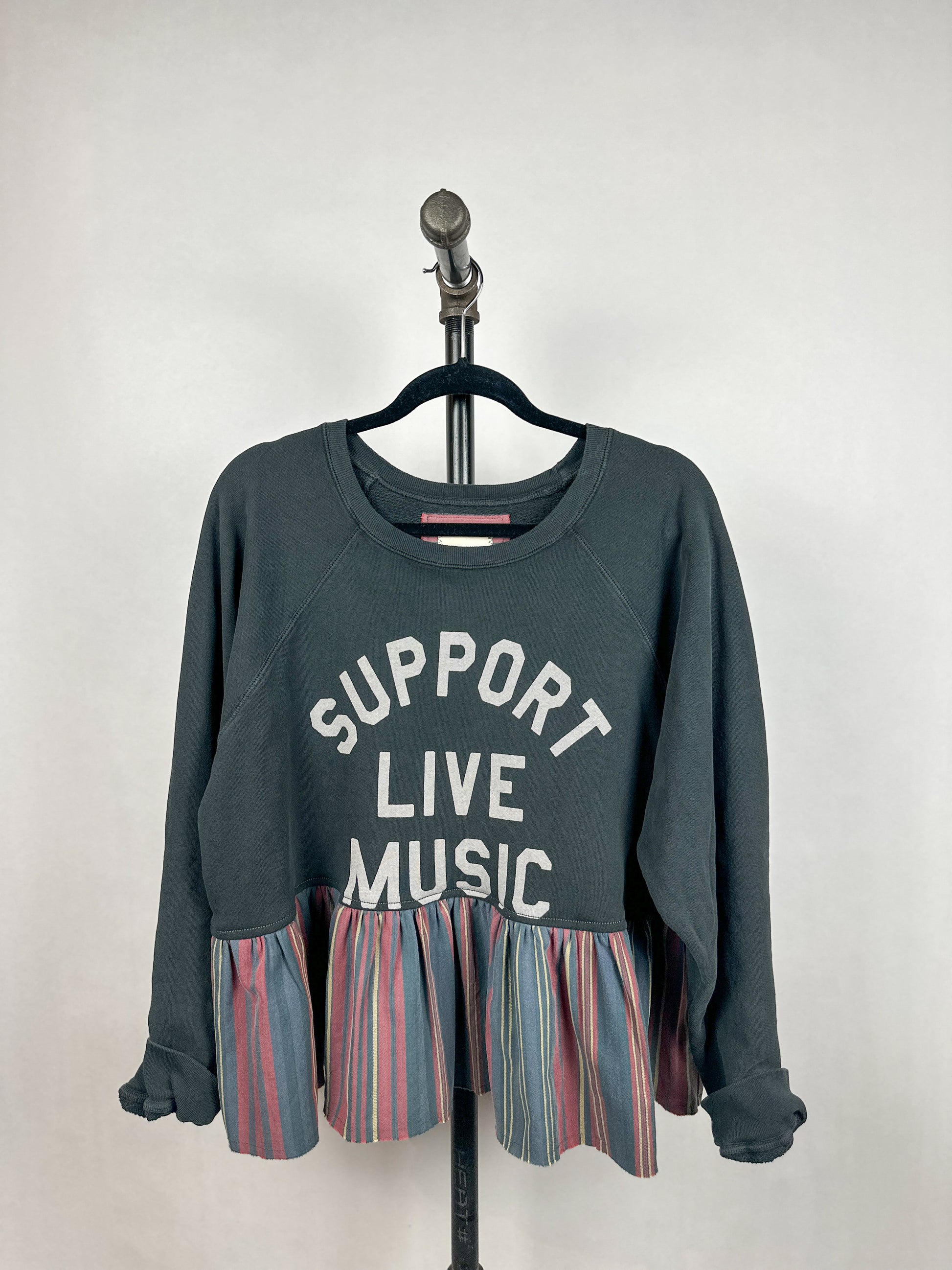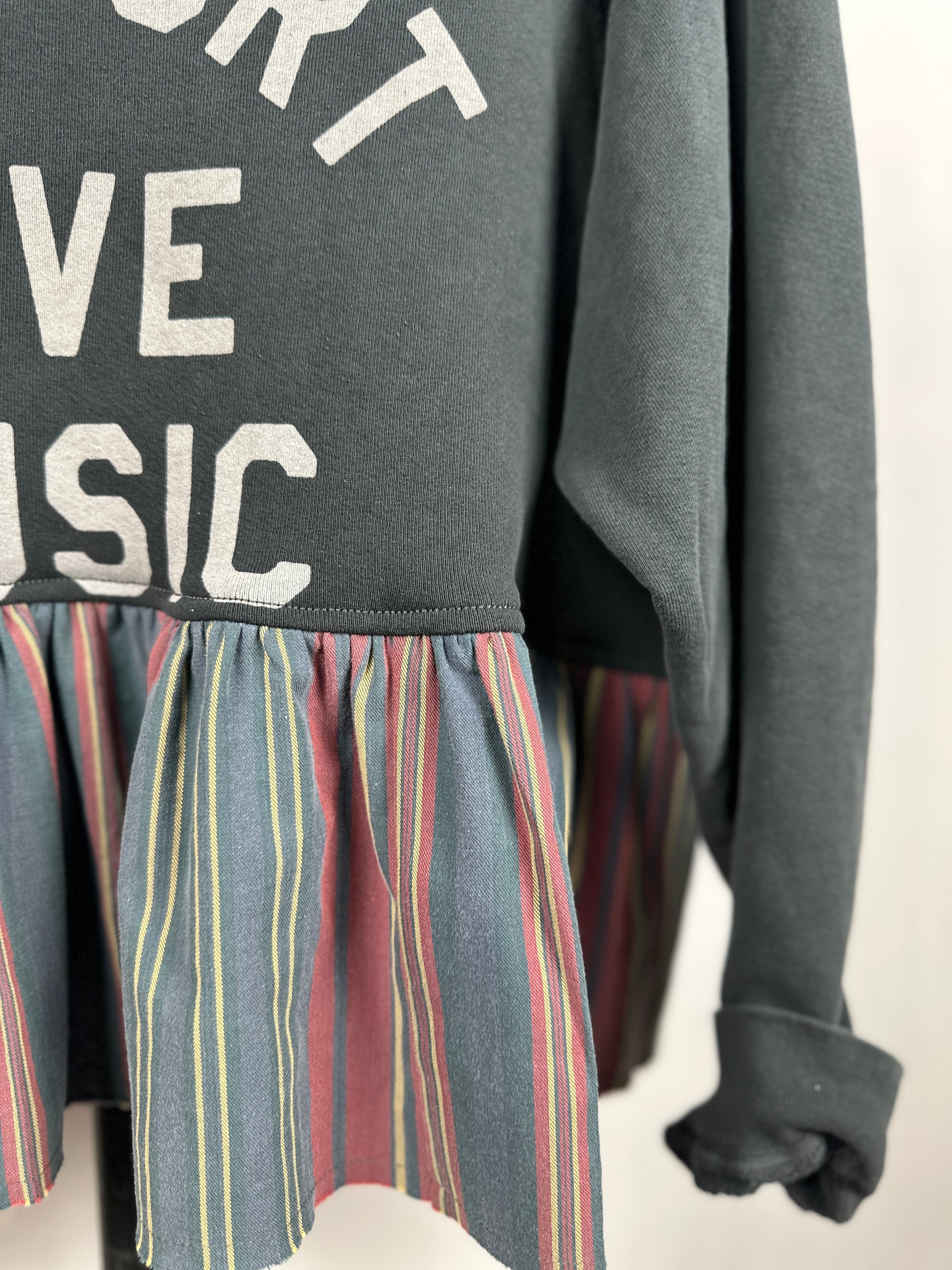 Rock out in The Livvy, an upcycled sweatshirt with a twist. Show your love for live music with a graphic on the front and an empire waist gathered peplum from vintage striped shirt fabric (super soft and worn in). Get ready to make a statement with this oversized, one-of-a-kind piece.