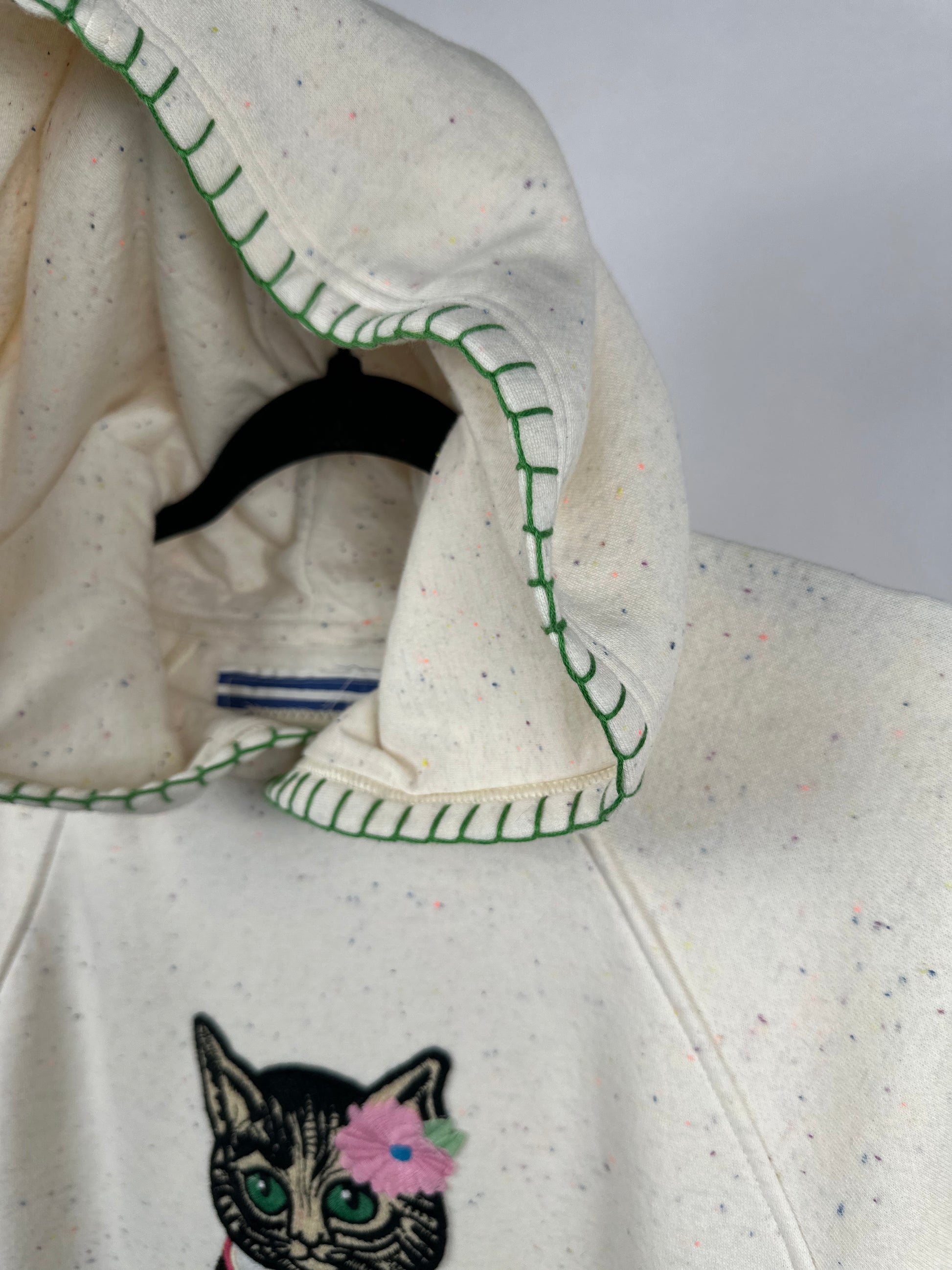 Indulge in cozy comfort with The Cat Lady hoodie, made from upcycled materials for a unique twist. Featuring a large cat patch and embroidered stitching around the hood, this super soft hoodie is perfect for any cat lover looking to stay stylish and playful.