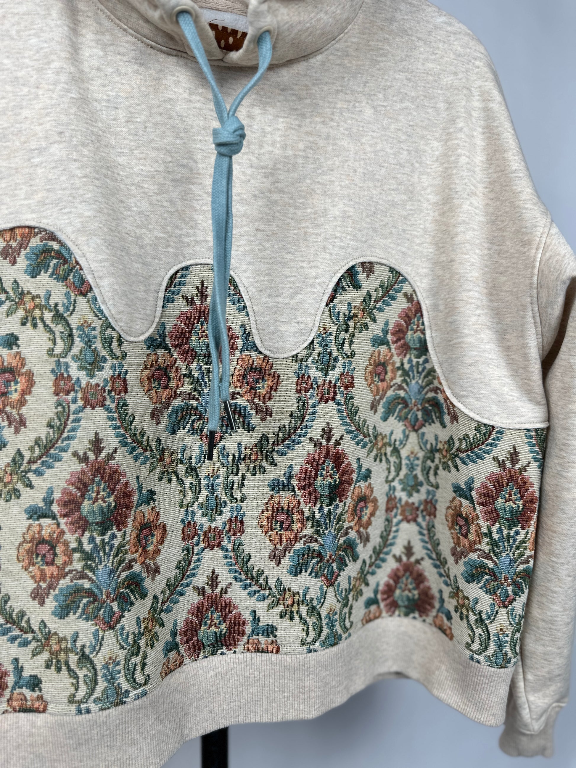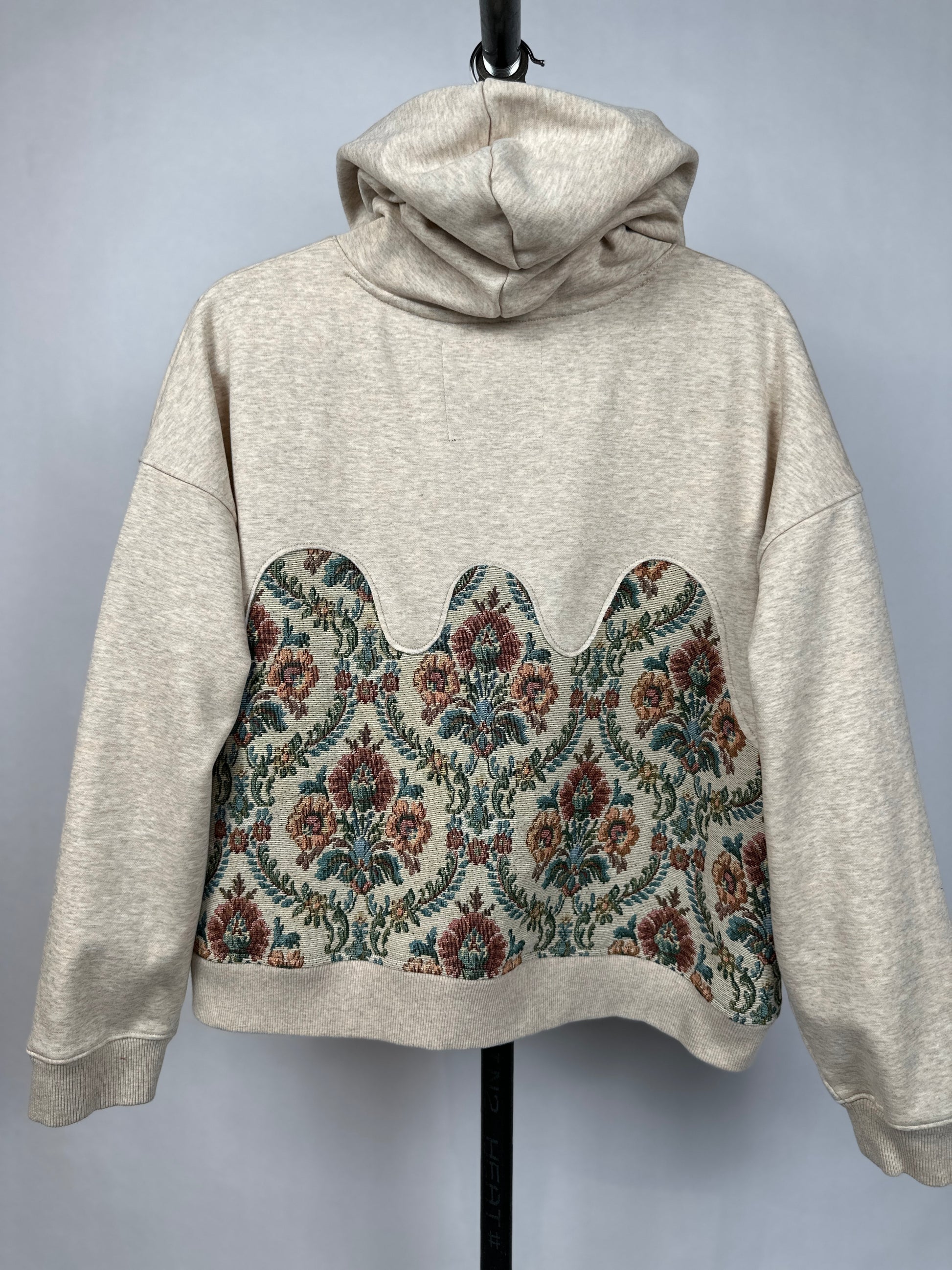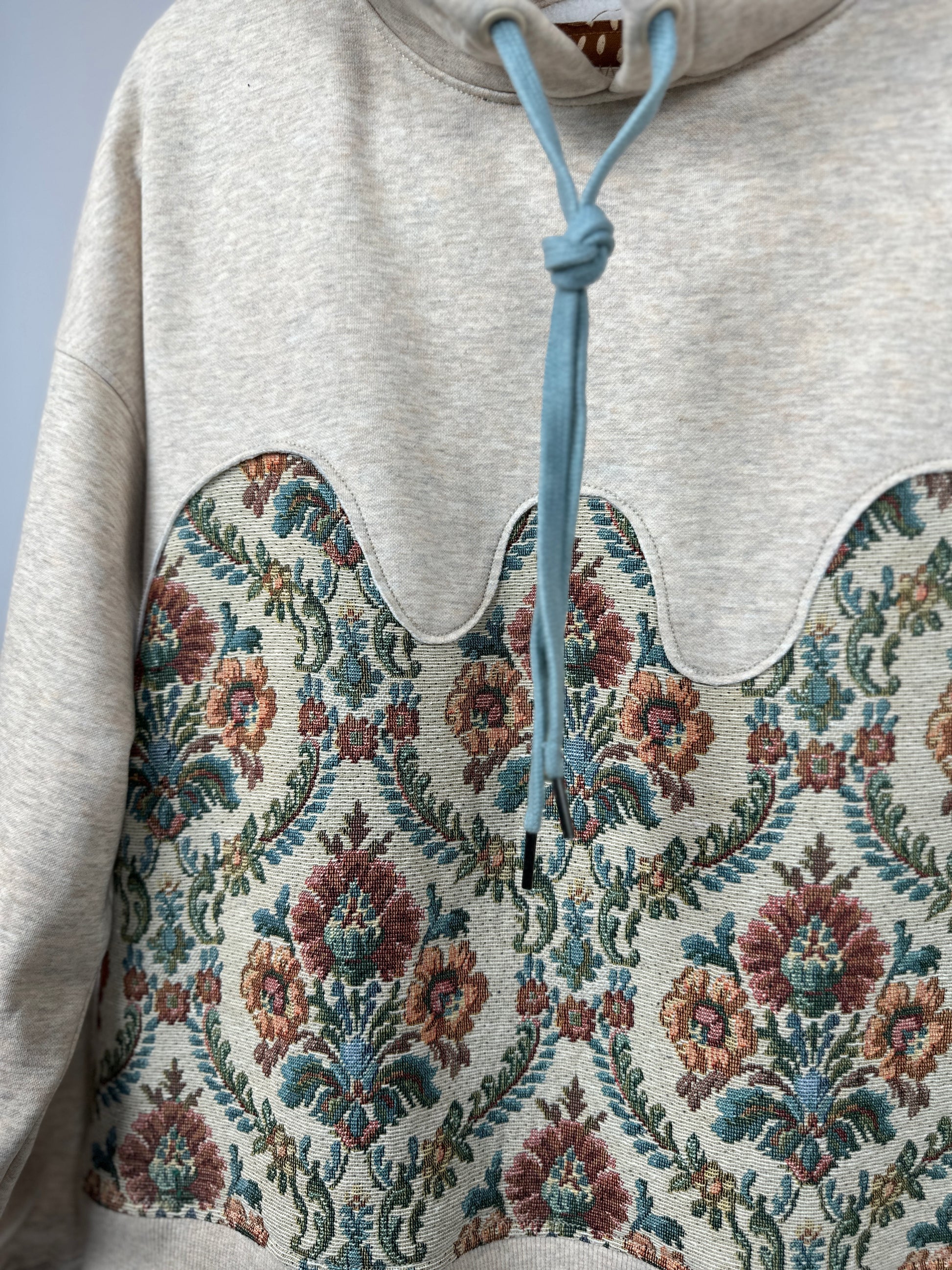Introducing The Bellamy - the ultimate in eco-chic fashion! This upcycled hooded sweatshirt features a tapestry cut out design for a truly unique and one-of-a-kind look. The tapestry fabric has no stretch, so sizing this one as a medium!