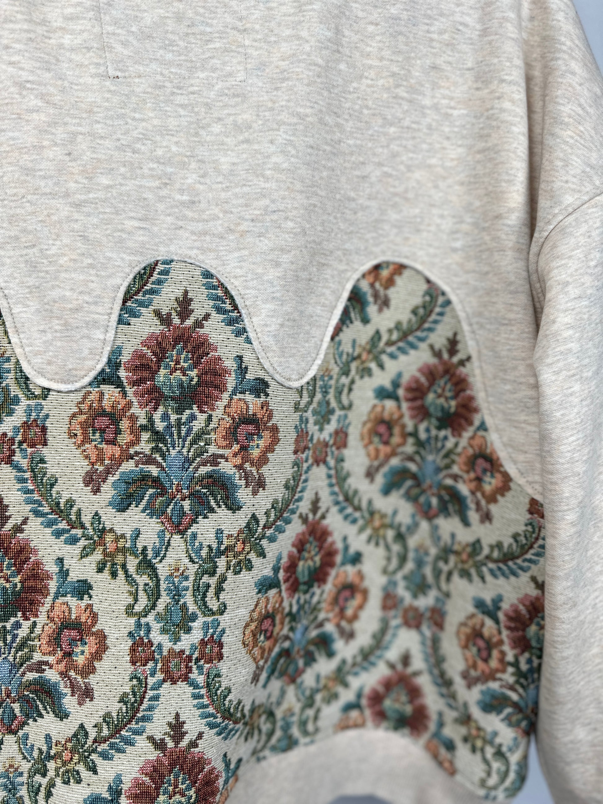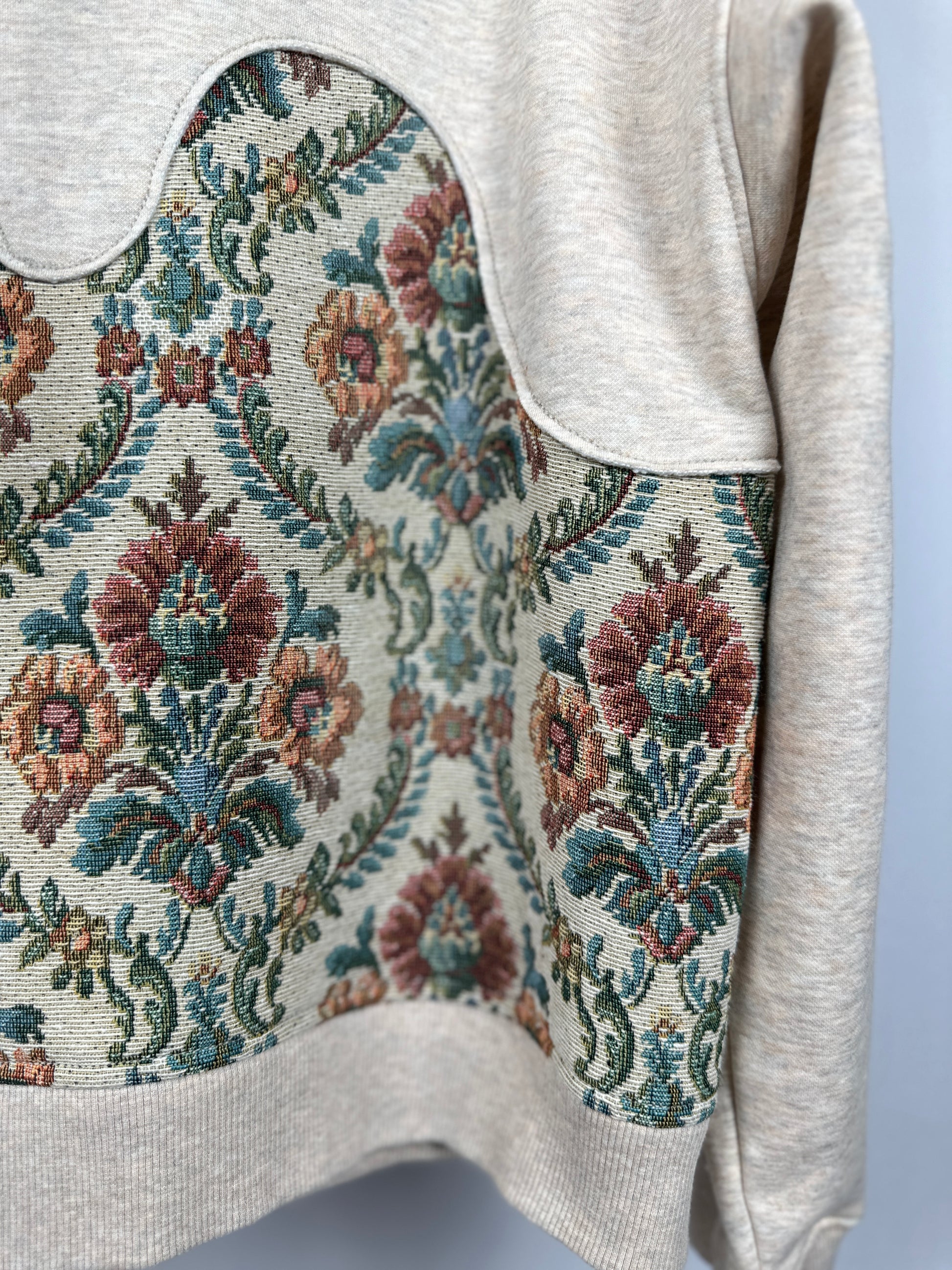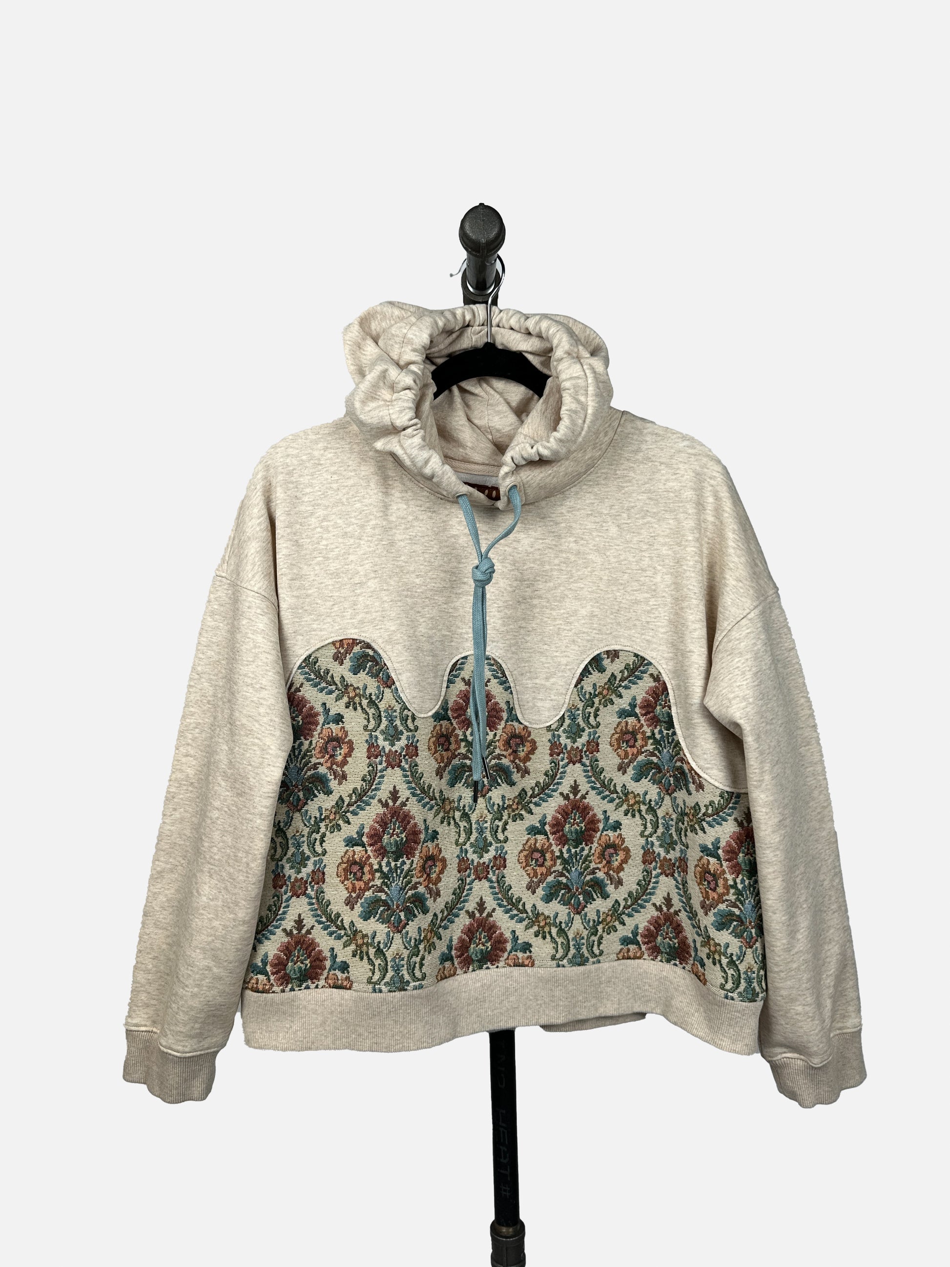 Introducing The Bellamy - the ultimate in eco-chic fashion! This upcycled hooded sweatshirt features a tapestry cut out design for a truly unique and one-of-a-kind look. The tapestry fabric has no stretch, so sizing this one as a medium!