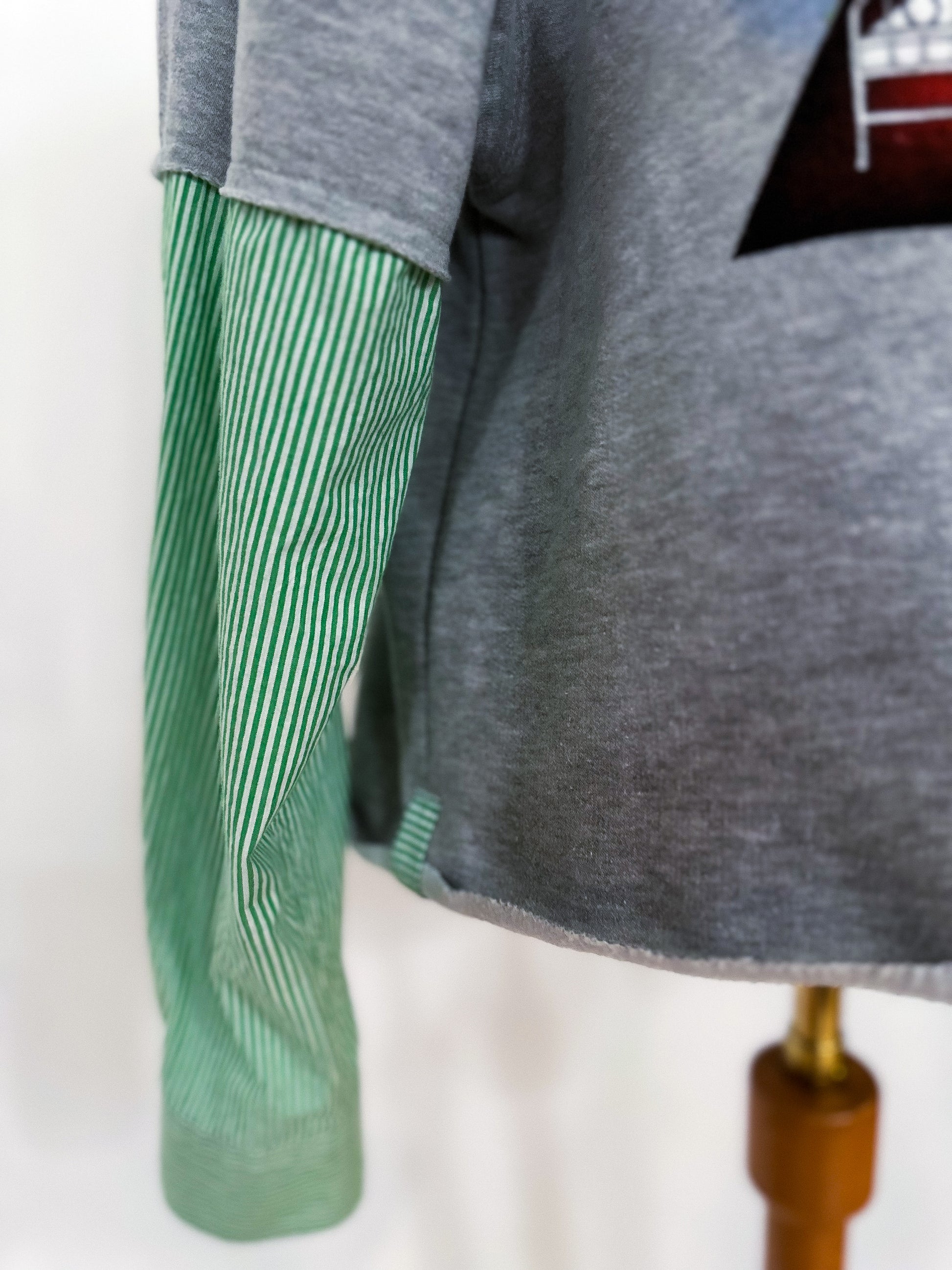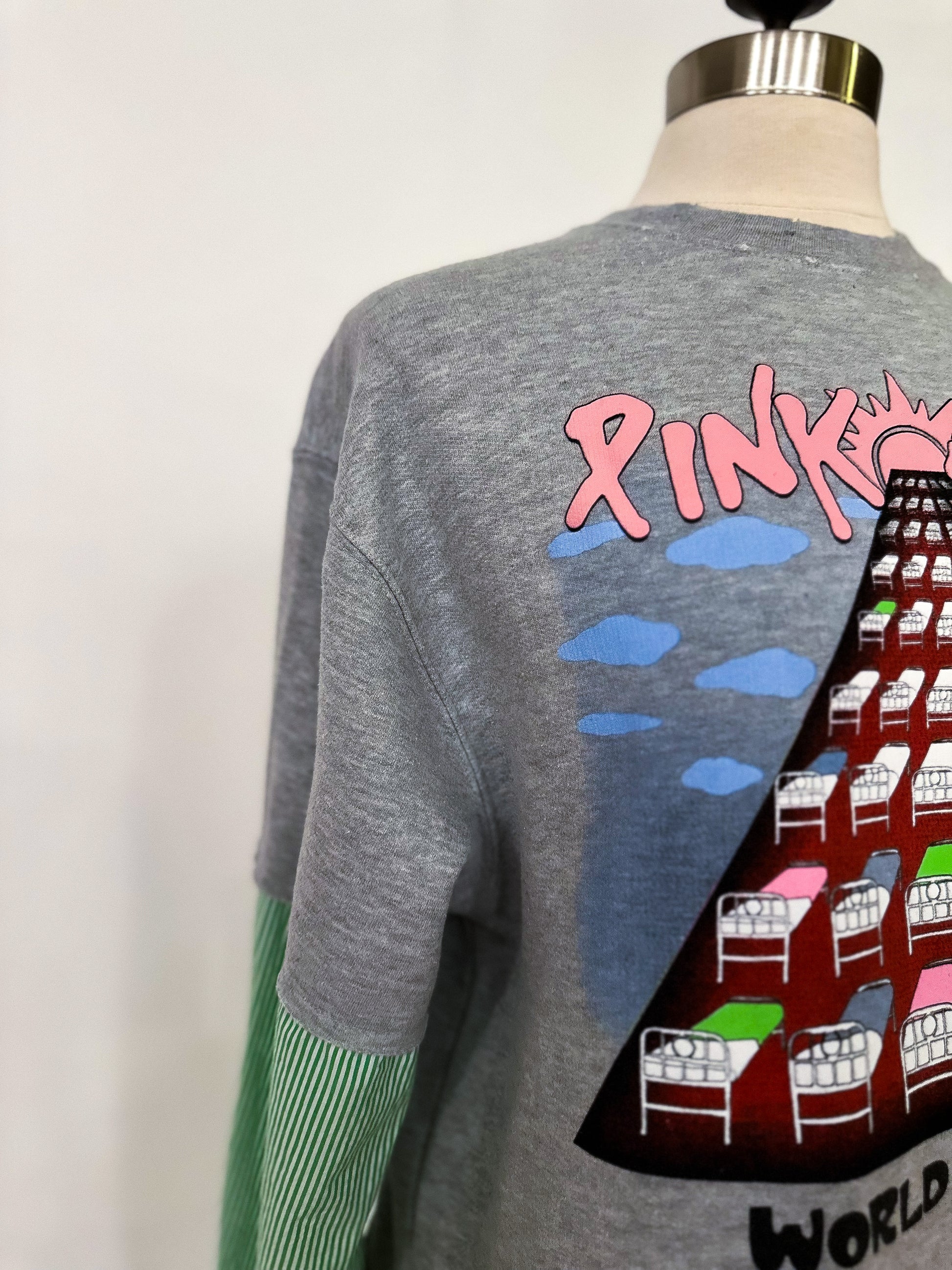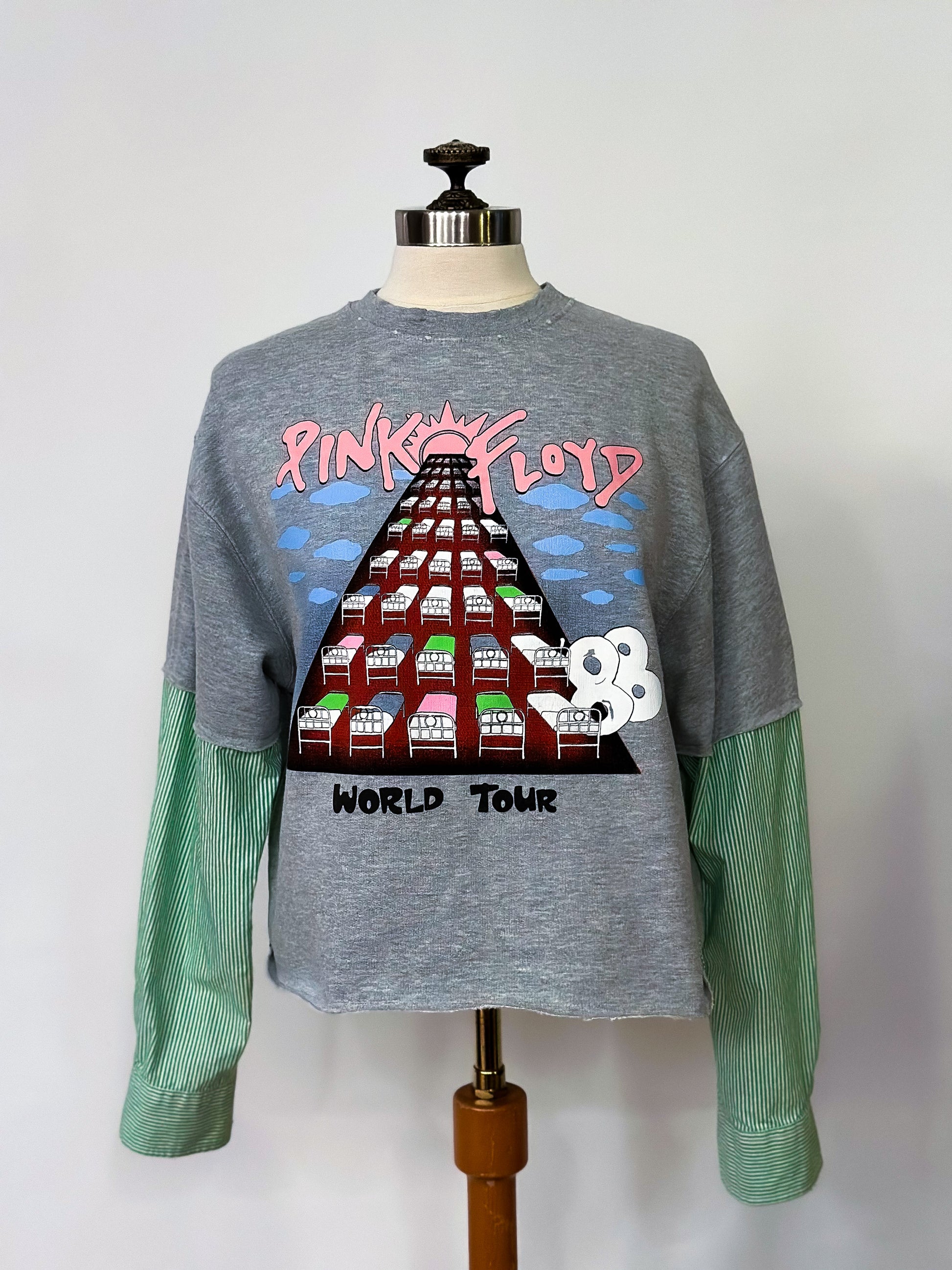 Cozy up in this upcycled crew fleece! Crafted from a world tour crew, the sweatshirt is complete with striped cotton sleeves and added distressing throughout. Super soft, relaxed fit, sure to be a favorite!