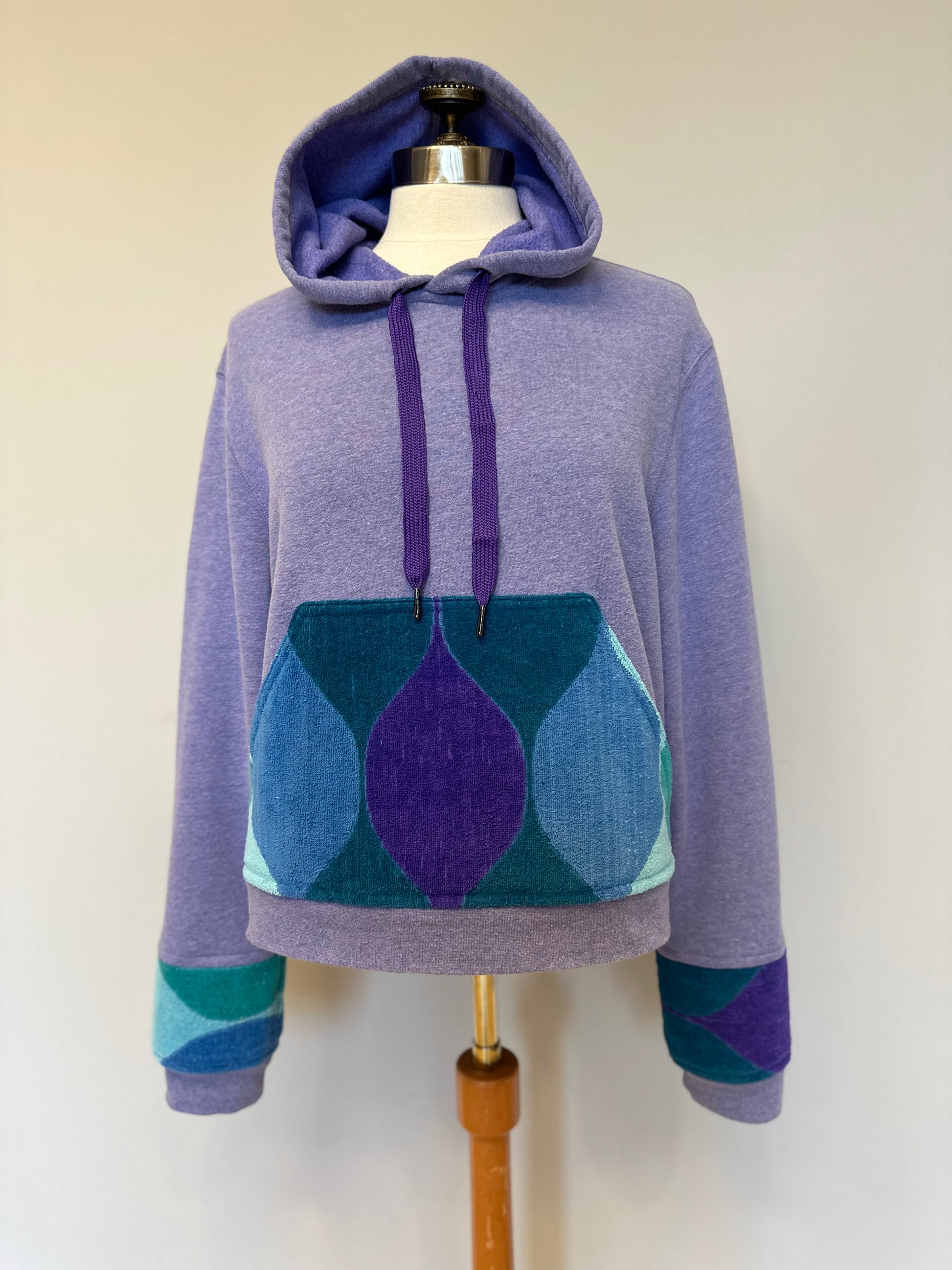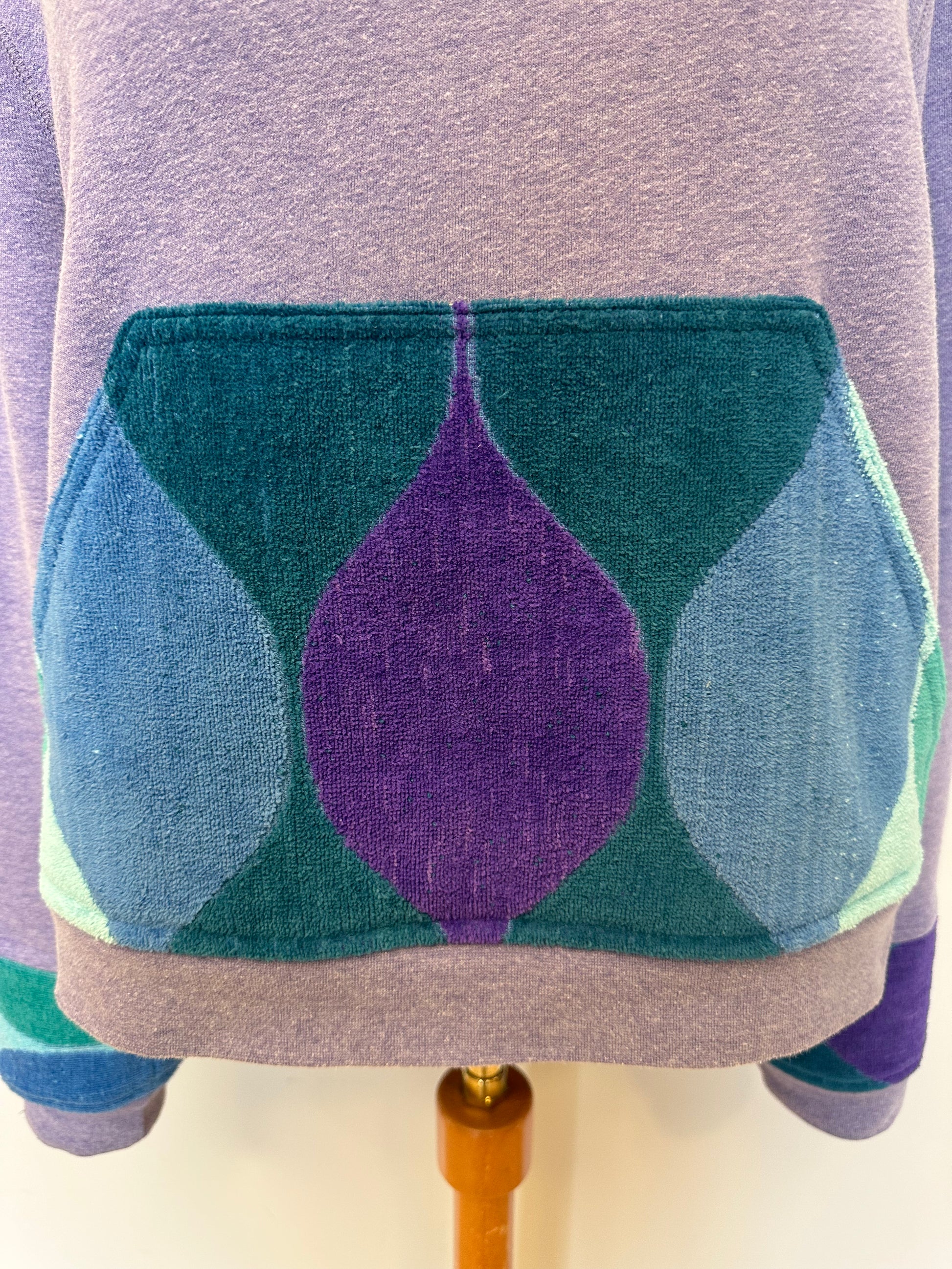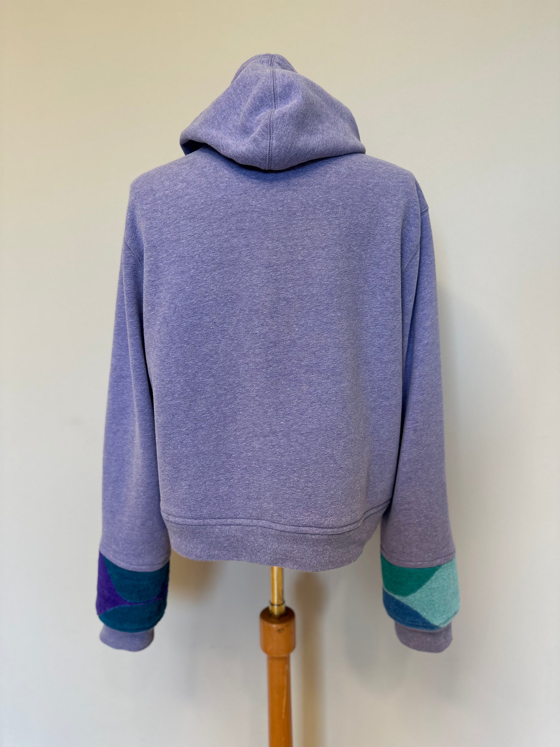 Lightweight and soft, this hoodie is a beautiful shade of light purple - perfectly worn in and comfortable with a relaxed fit. Pocket and sleeve detail was constructed out of vintage towels, in a retro pattern with a gorgeous color mix. Pocket and sleeves are lined with a butterfly print, equally colorful and completes this beauty.