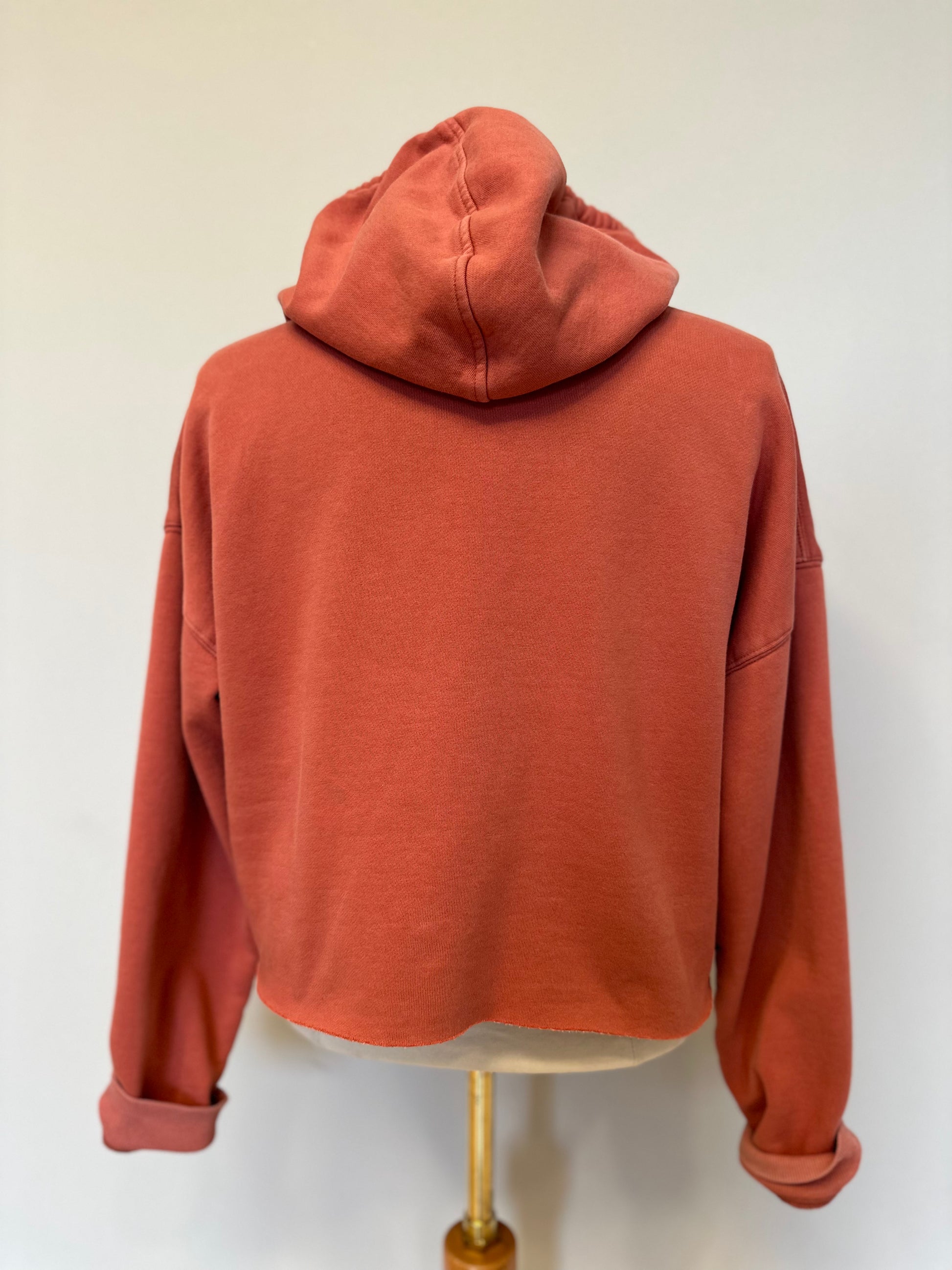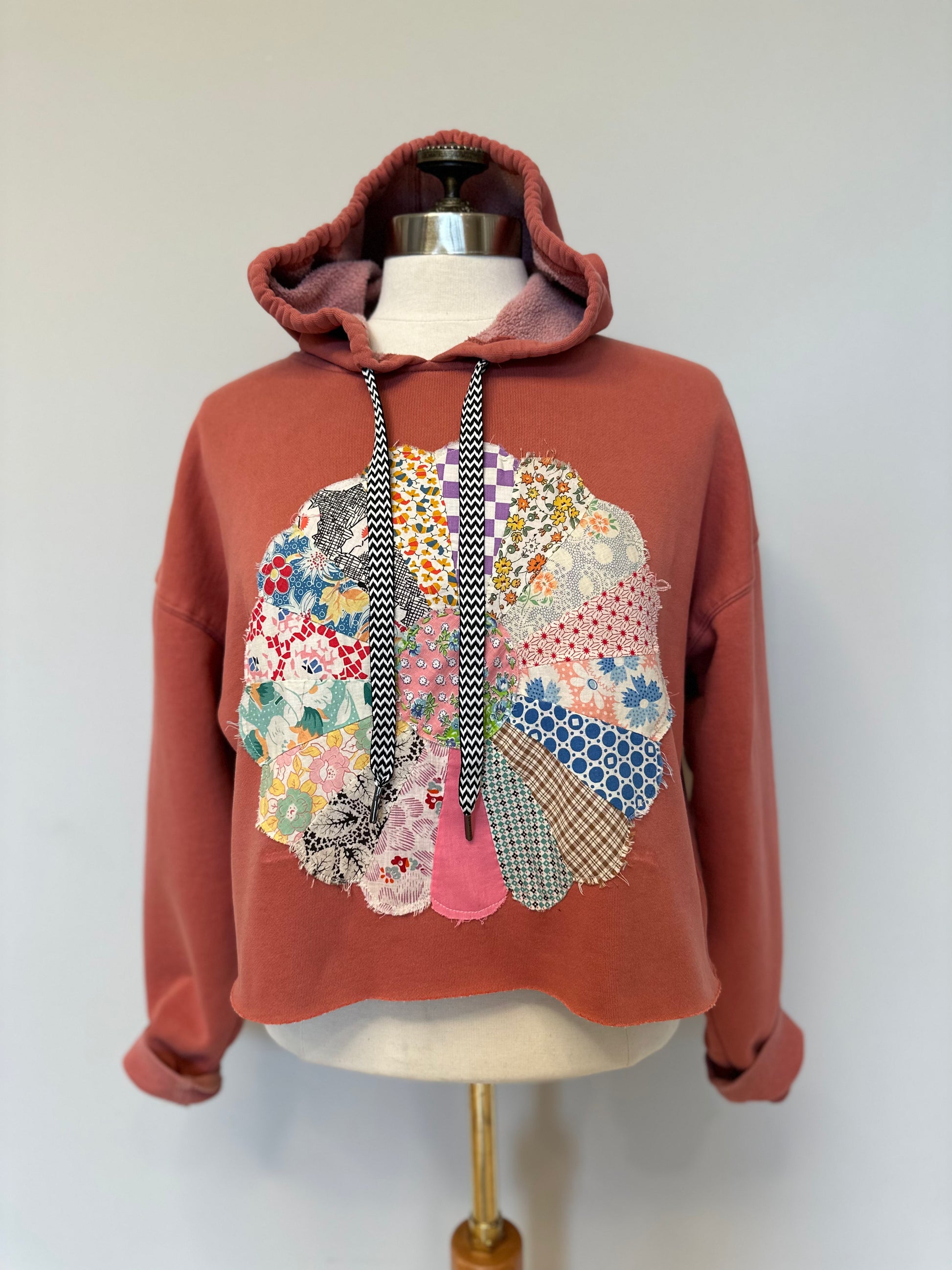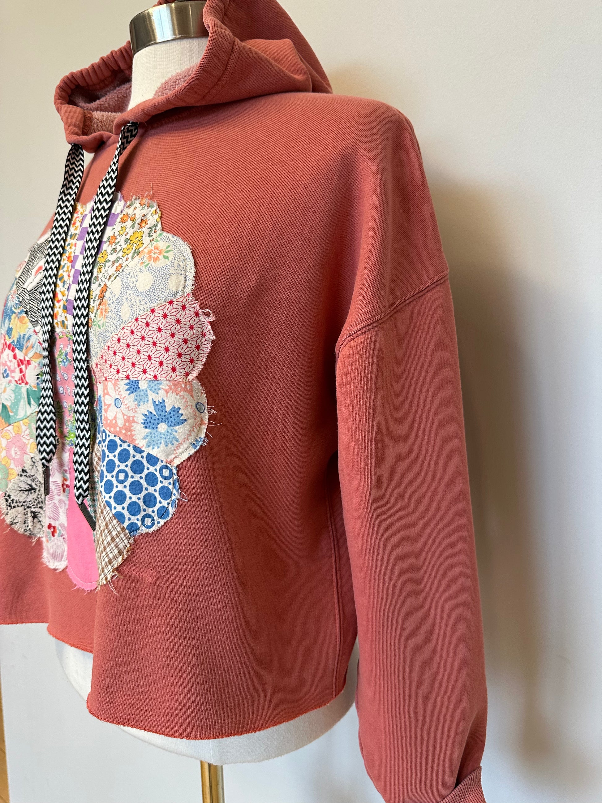 Loose fitting, cropped hoodie in a beautiful mauvey pink. Features a vintage quilt block in many different patterns, all hand stitched together to create the most beautiful circle. Contrasting drawstring adds some fun to the neckline, this one can be styled in many different ways!