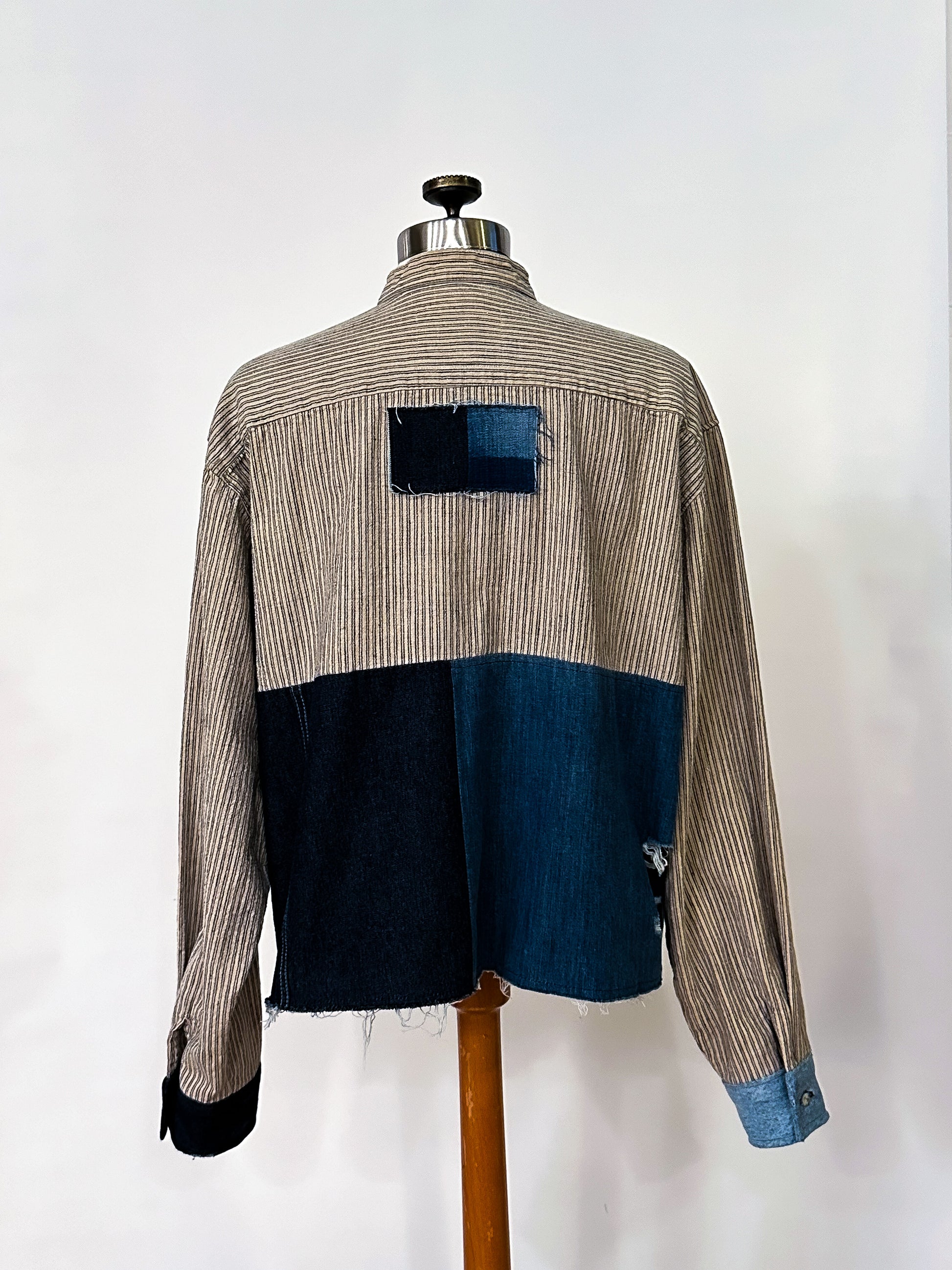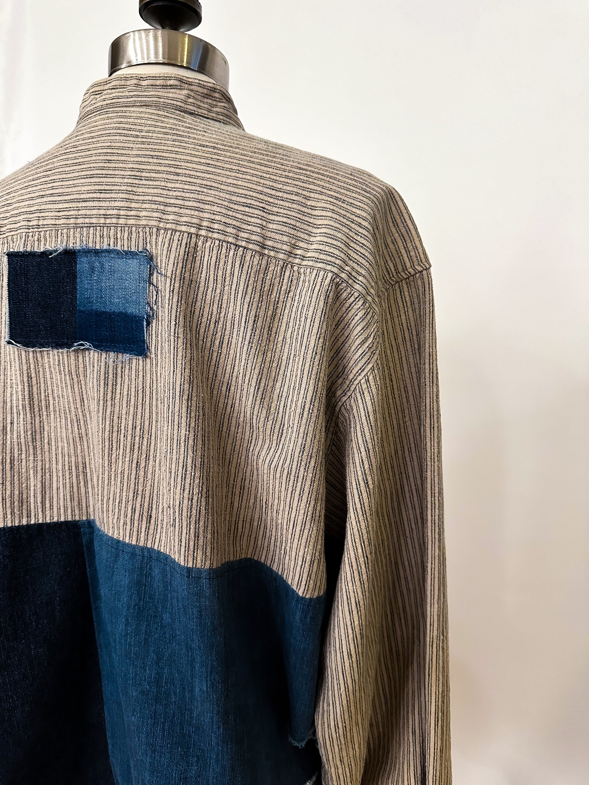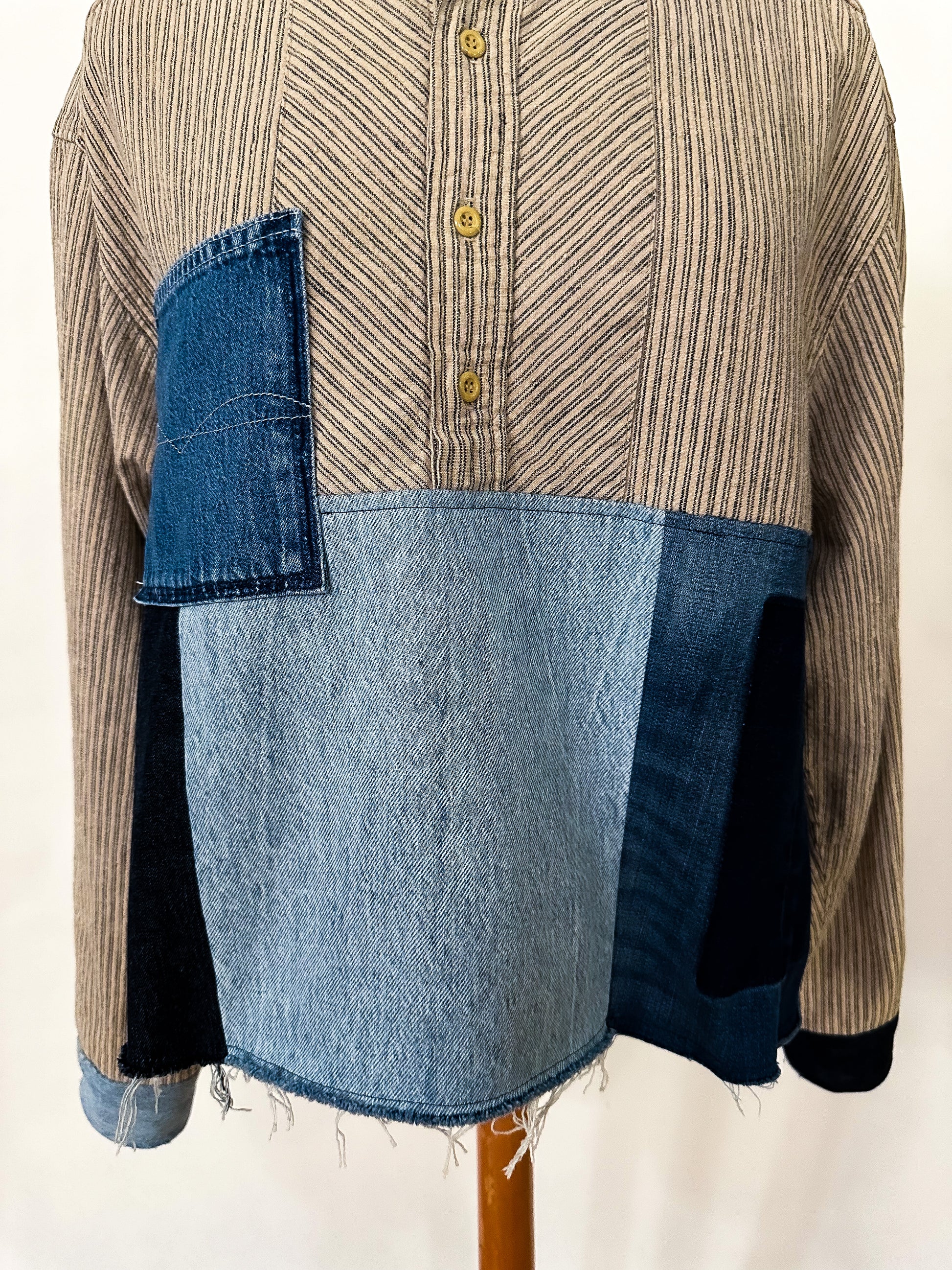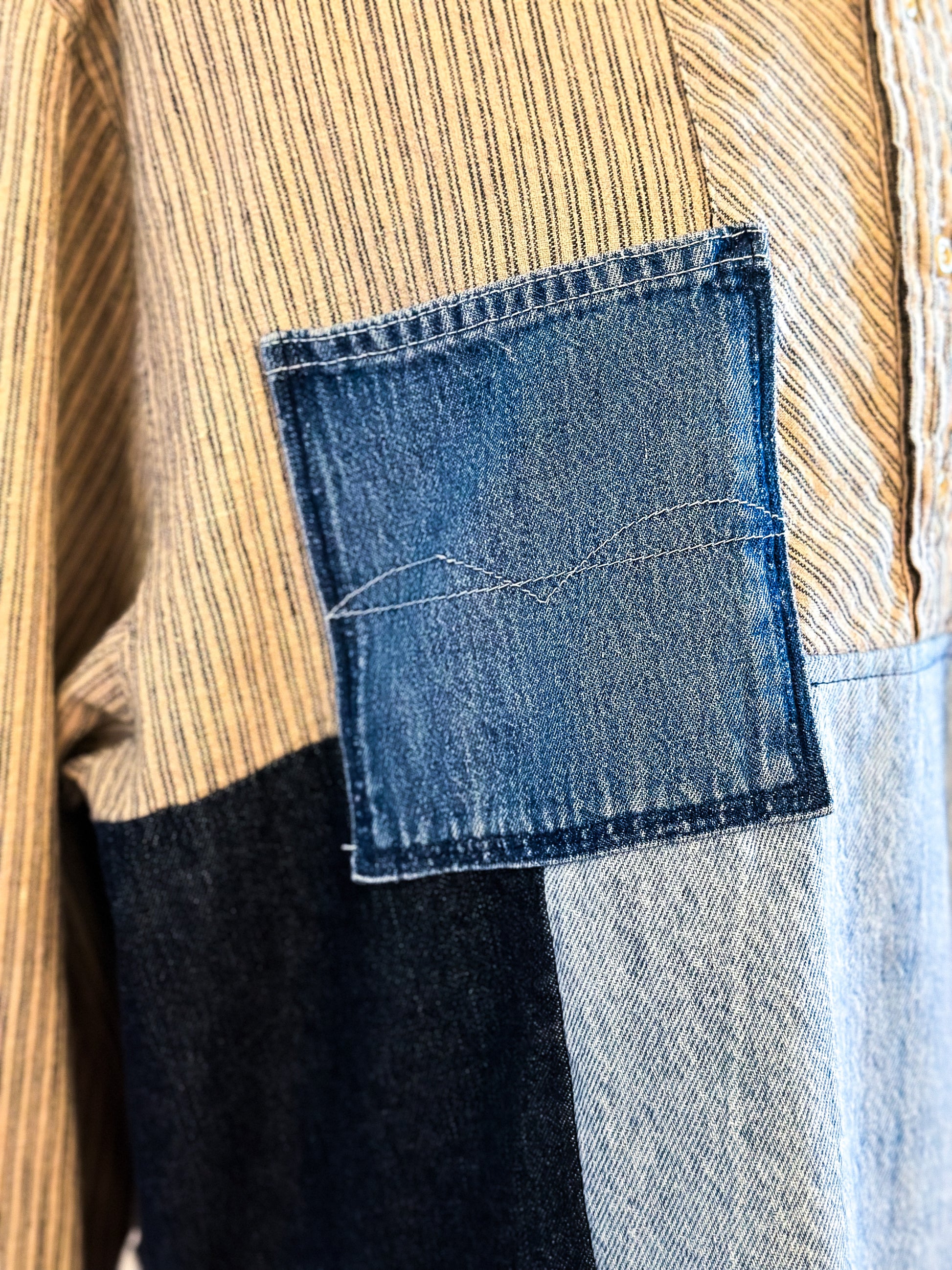 Stand out in the crowd with our unique take on a work shirt, featuring upcycled denim patches that add texture and unique style. Oversized fit with slight distressing, raw hemline and contrasting cuffs. Get creative and wear it your way!
