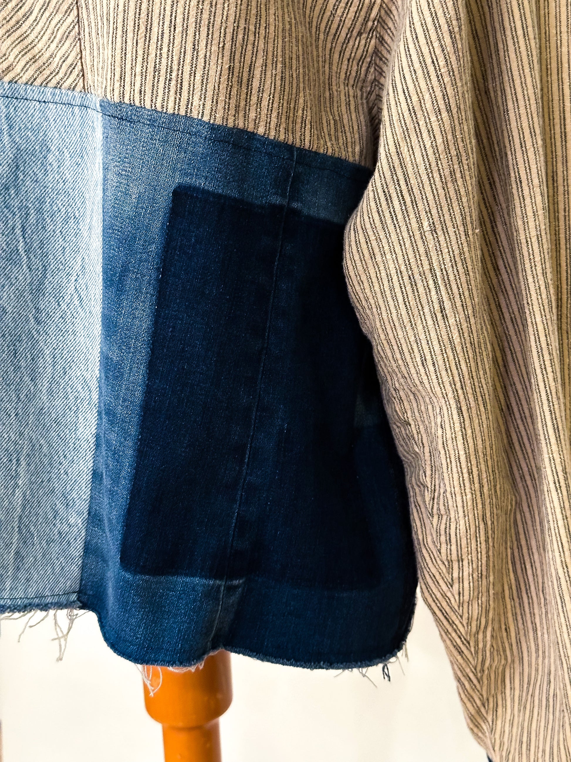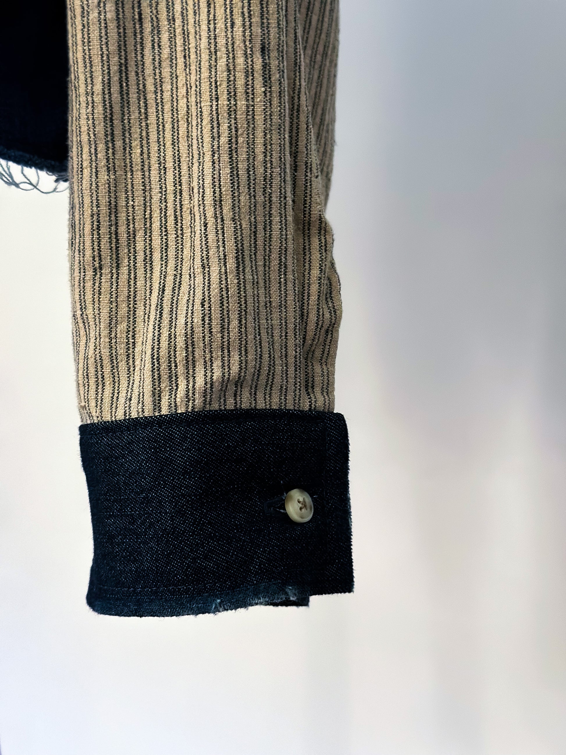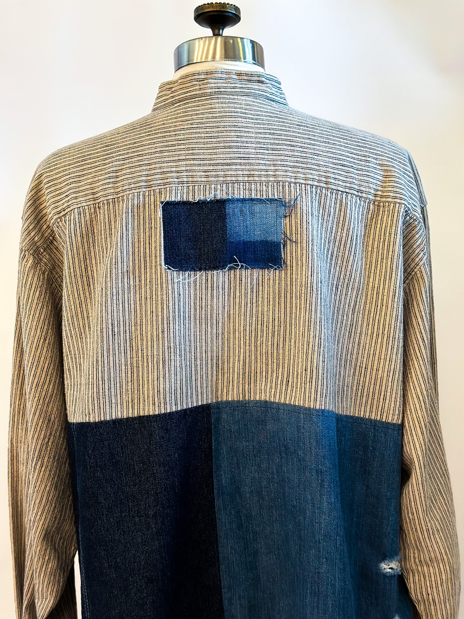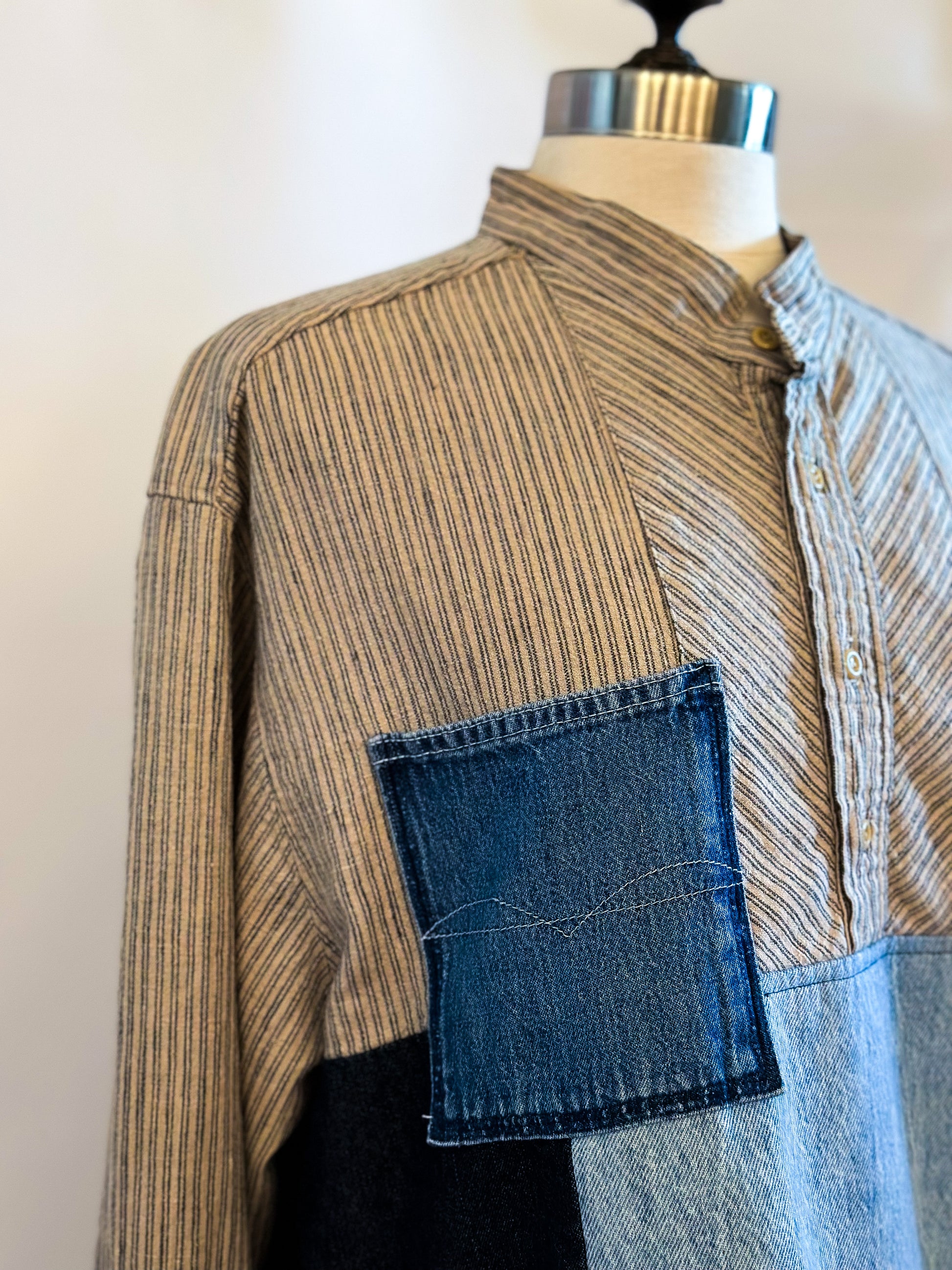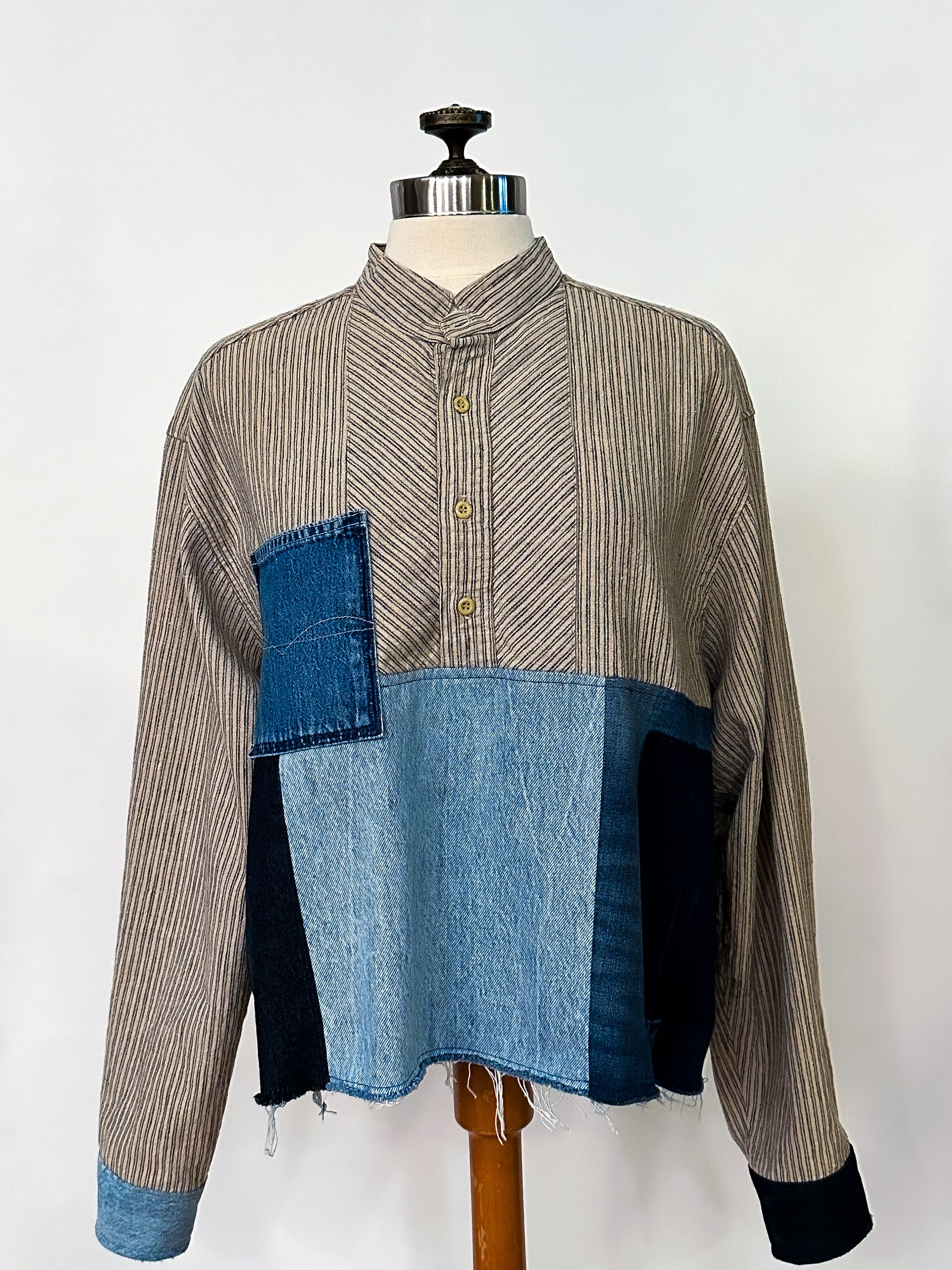 Stand out in the crowd with our unique take on a work shirt, featuring upcycled denim patches that add texture and unique style. Oversized fit with slight distressing, raw hemline and contrasting cuffs. Get creative and wear it your way!